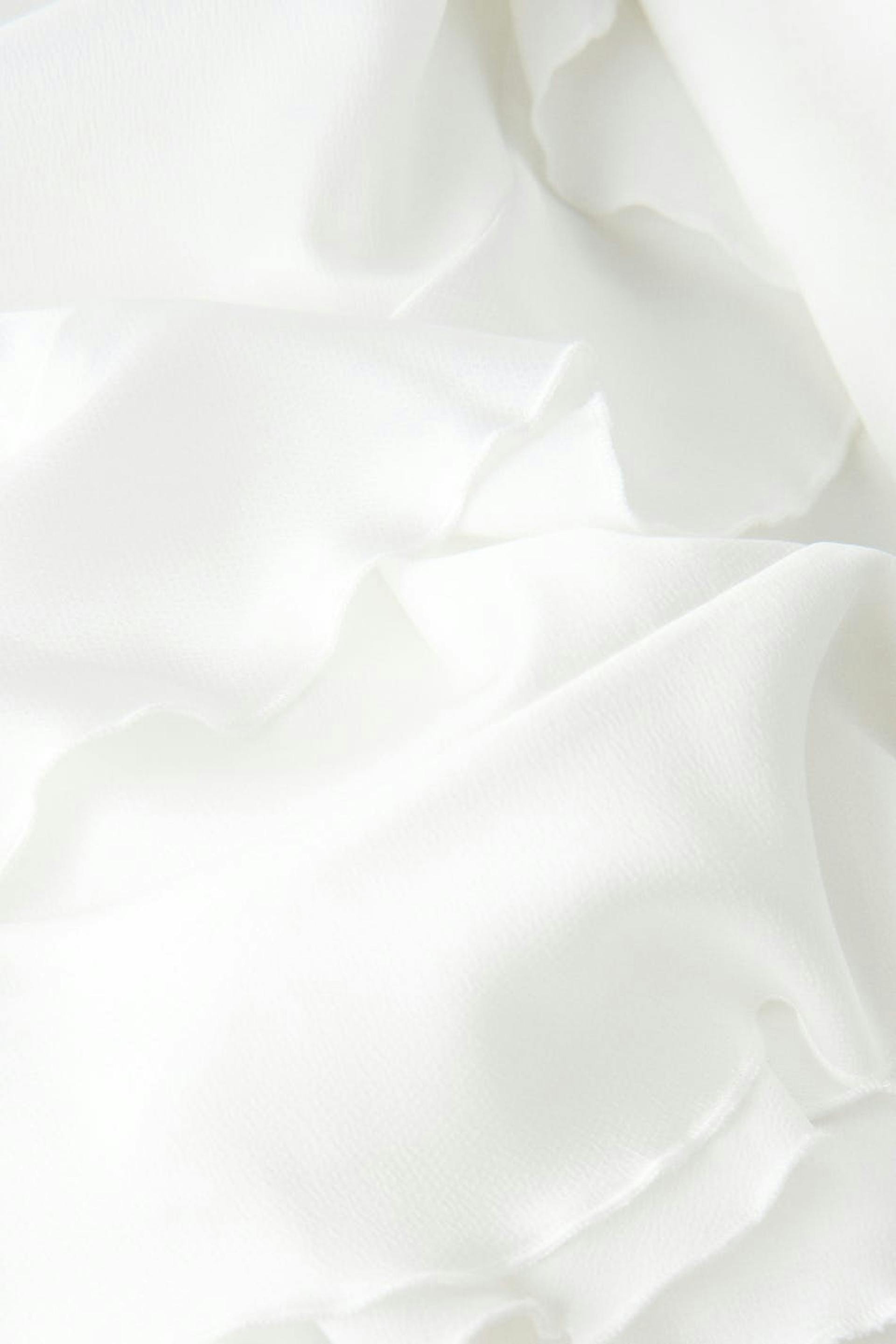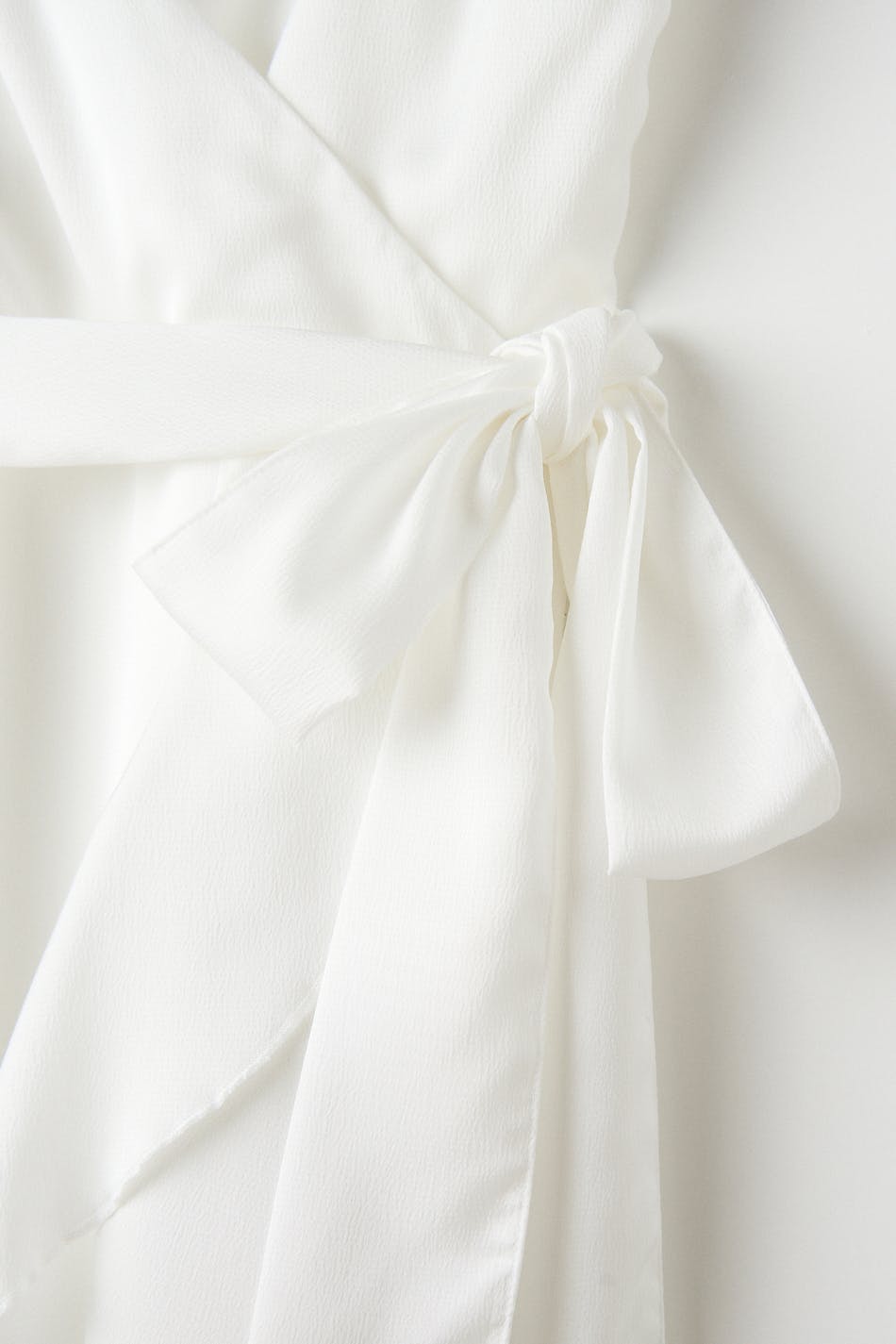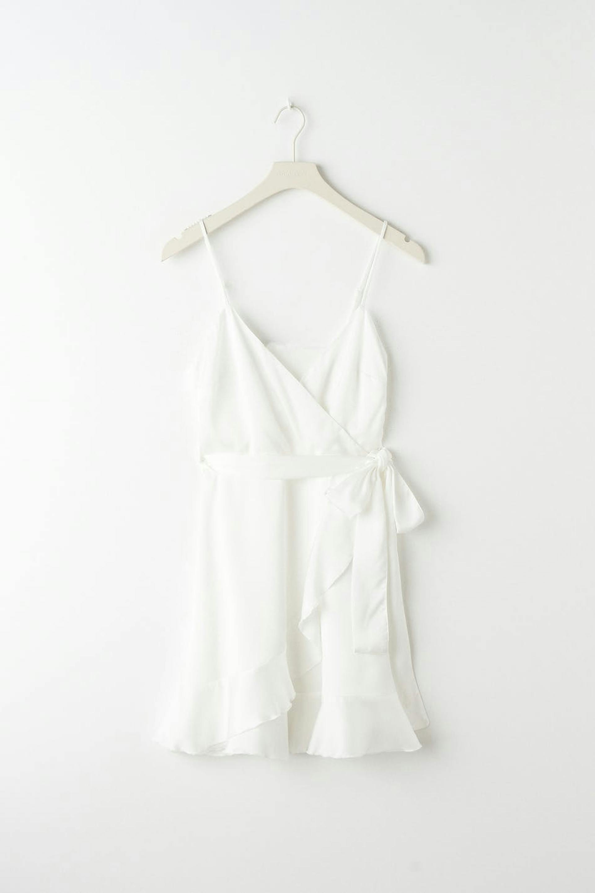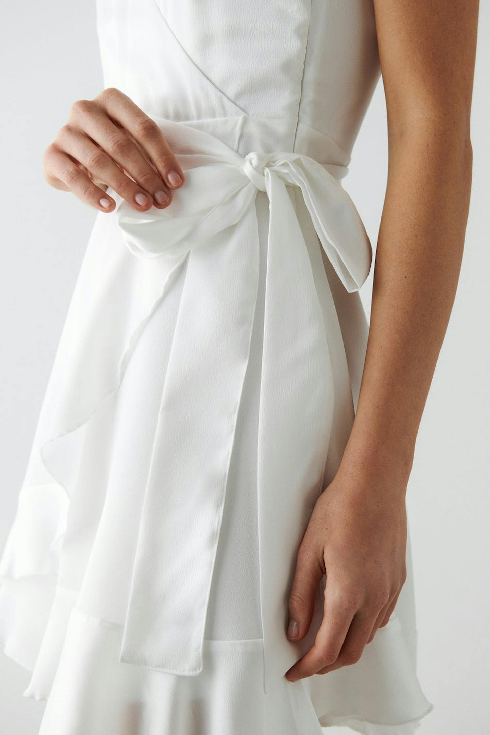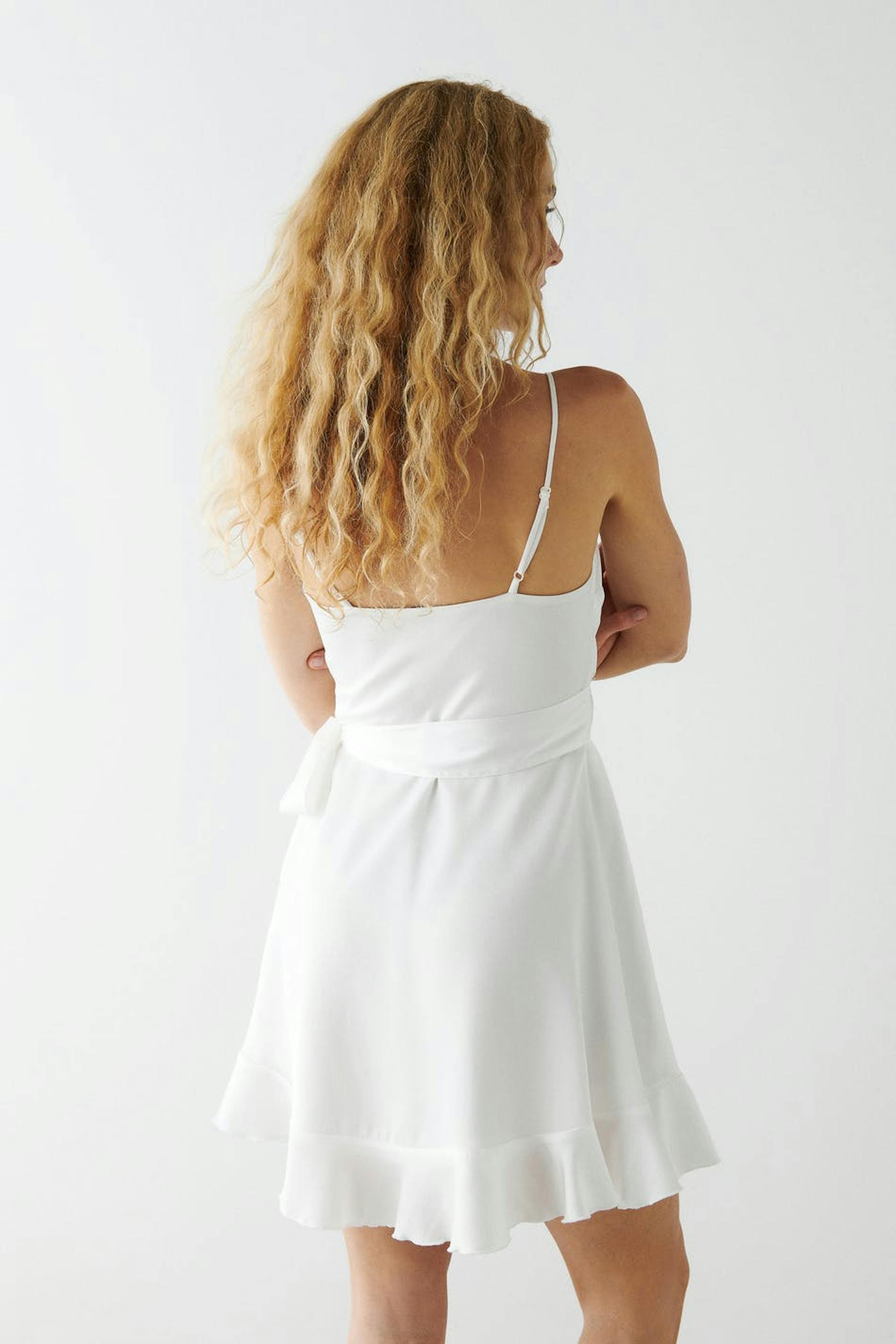 Short wrap front dress with tie strings at the waist. The dress is white and has ruffle details at the front. It has v-neck cut, fitted fit at the top, zip in the side seam and thin, adjustable shoulder straps.