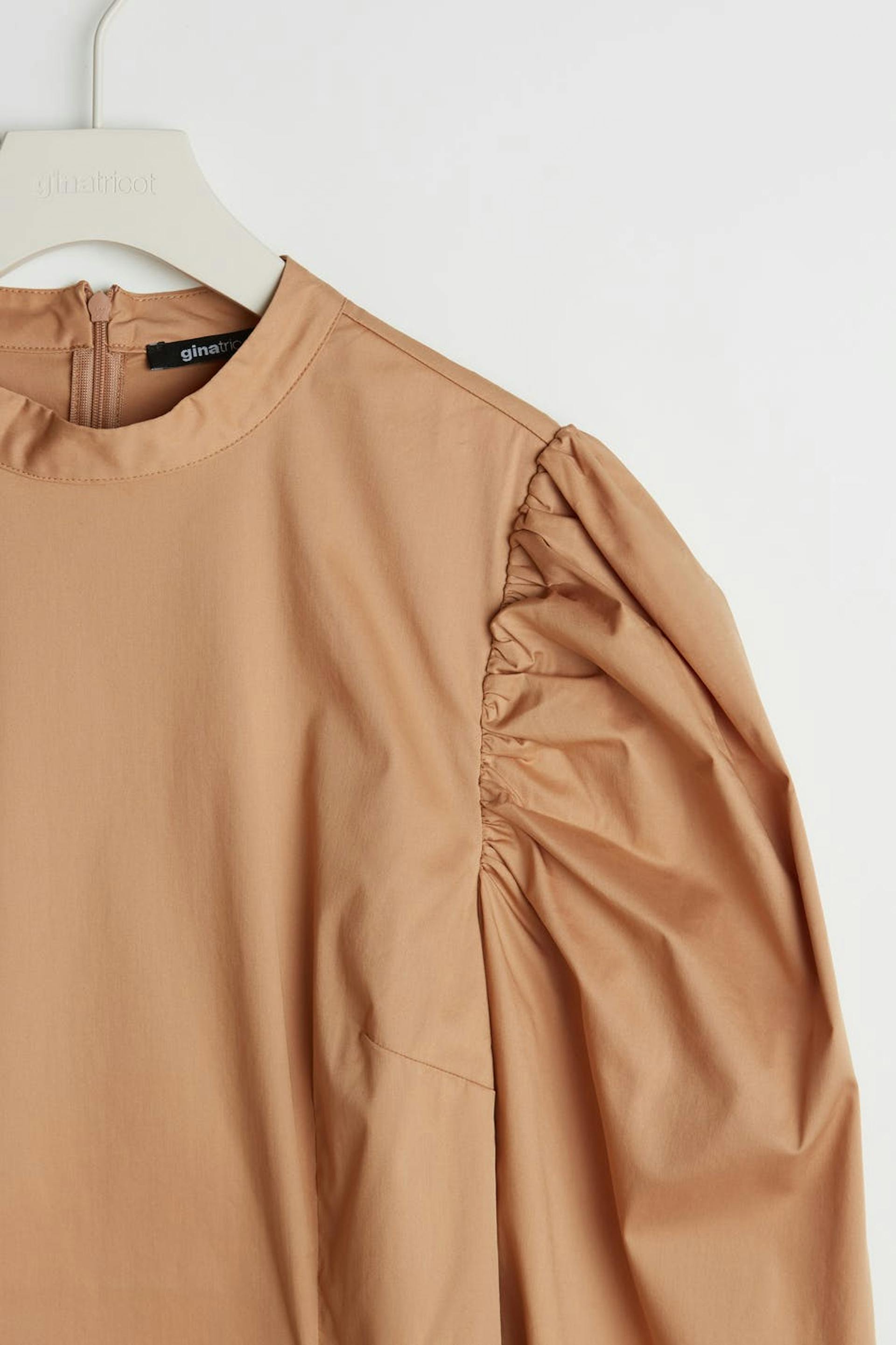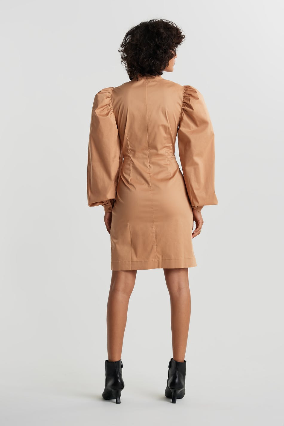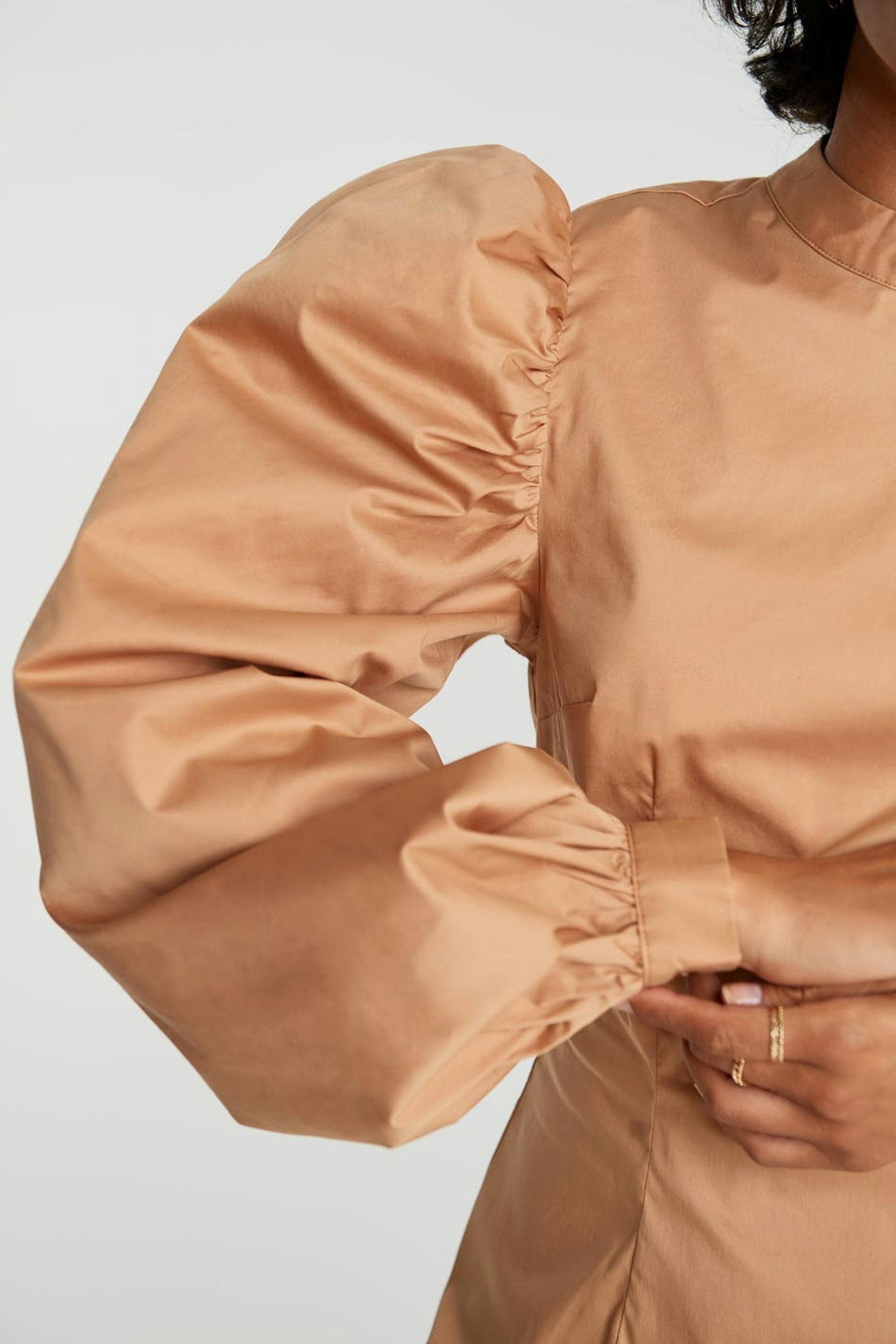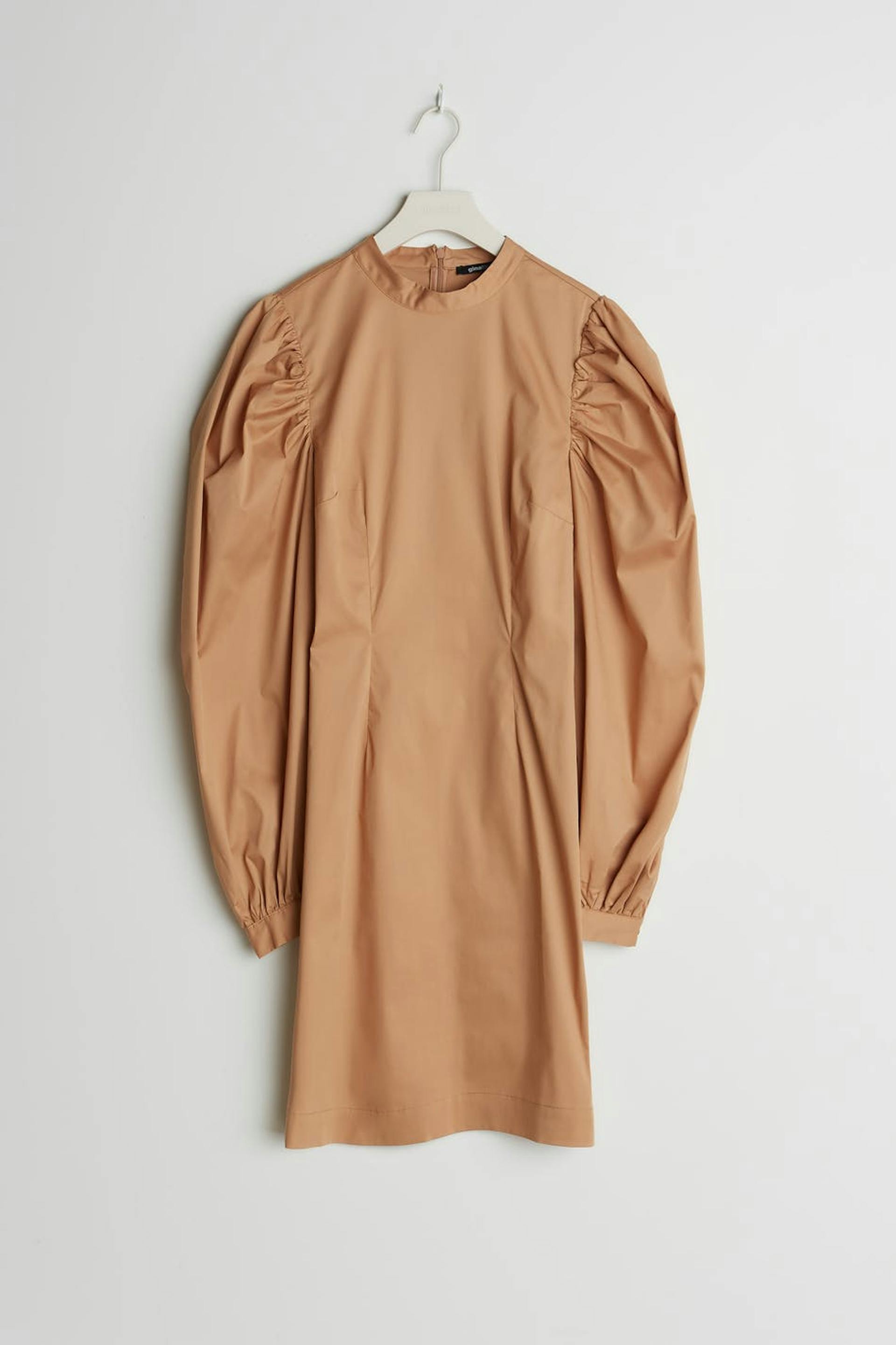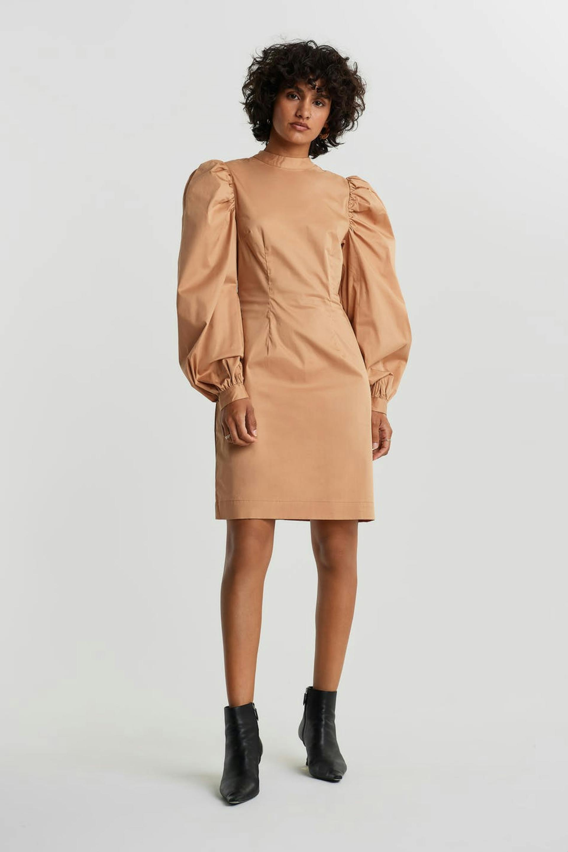 Dress with long, big puff sleeves. The dress is beige and has a high neckline. It has a zipper in the back.