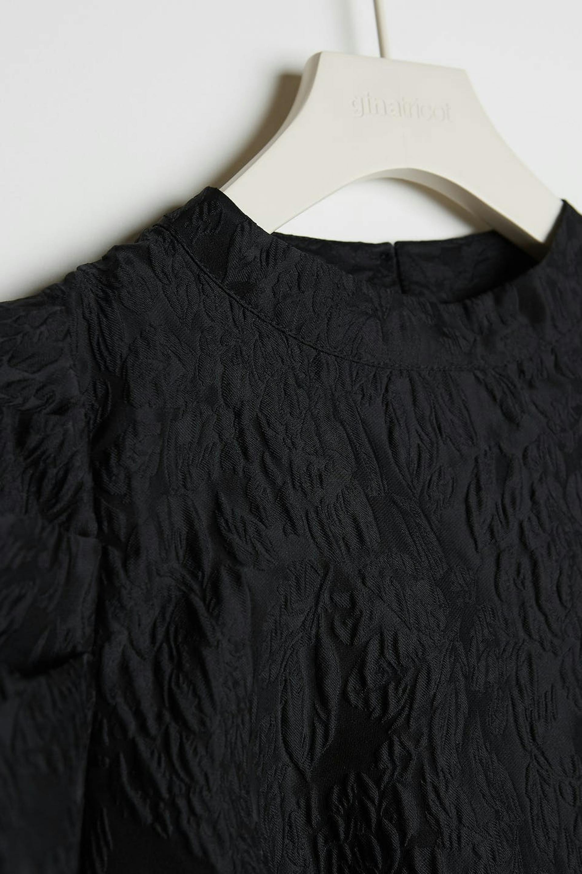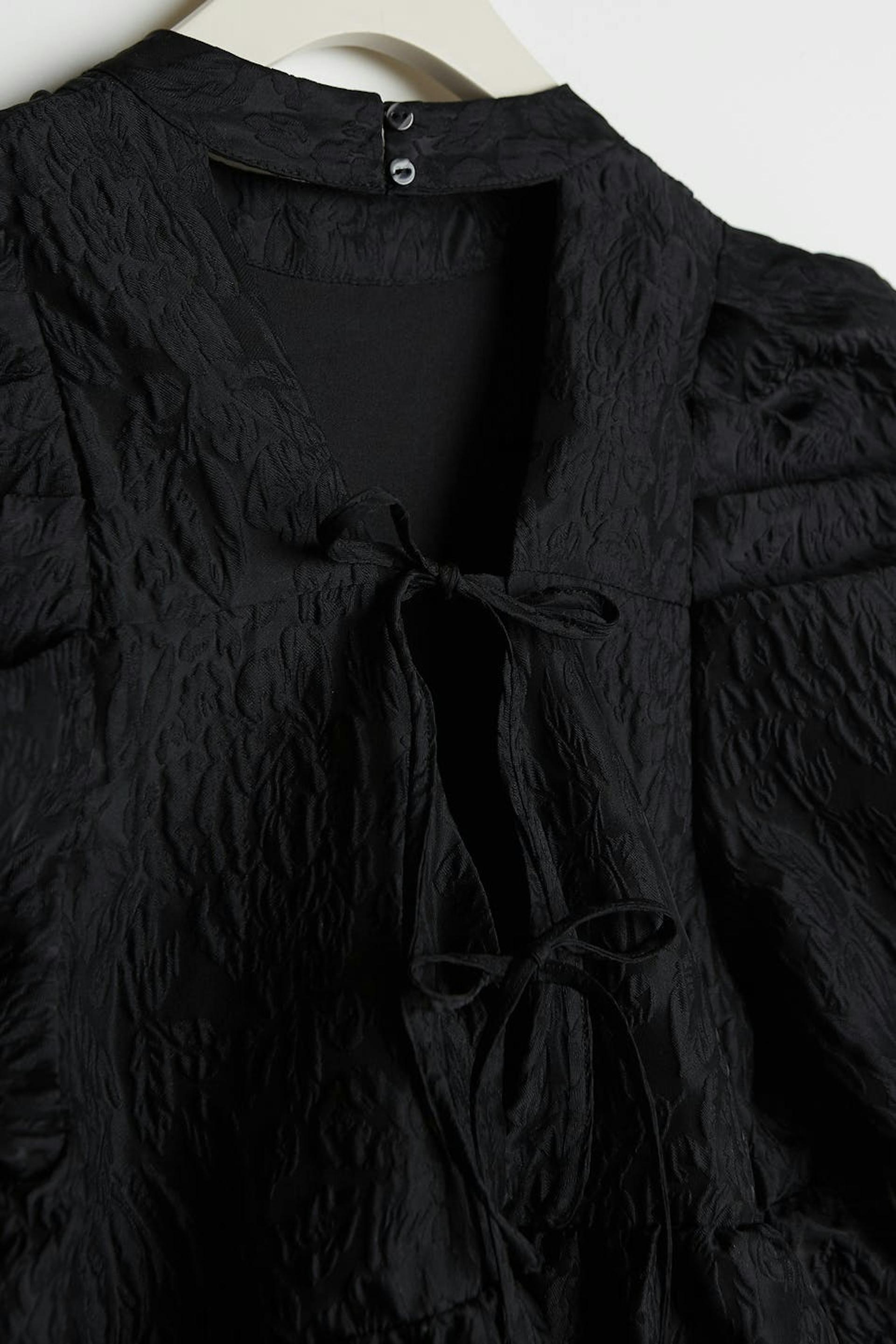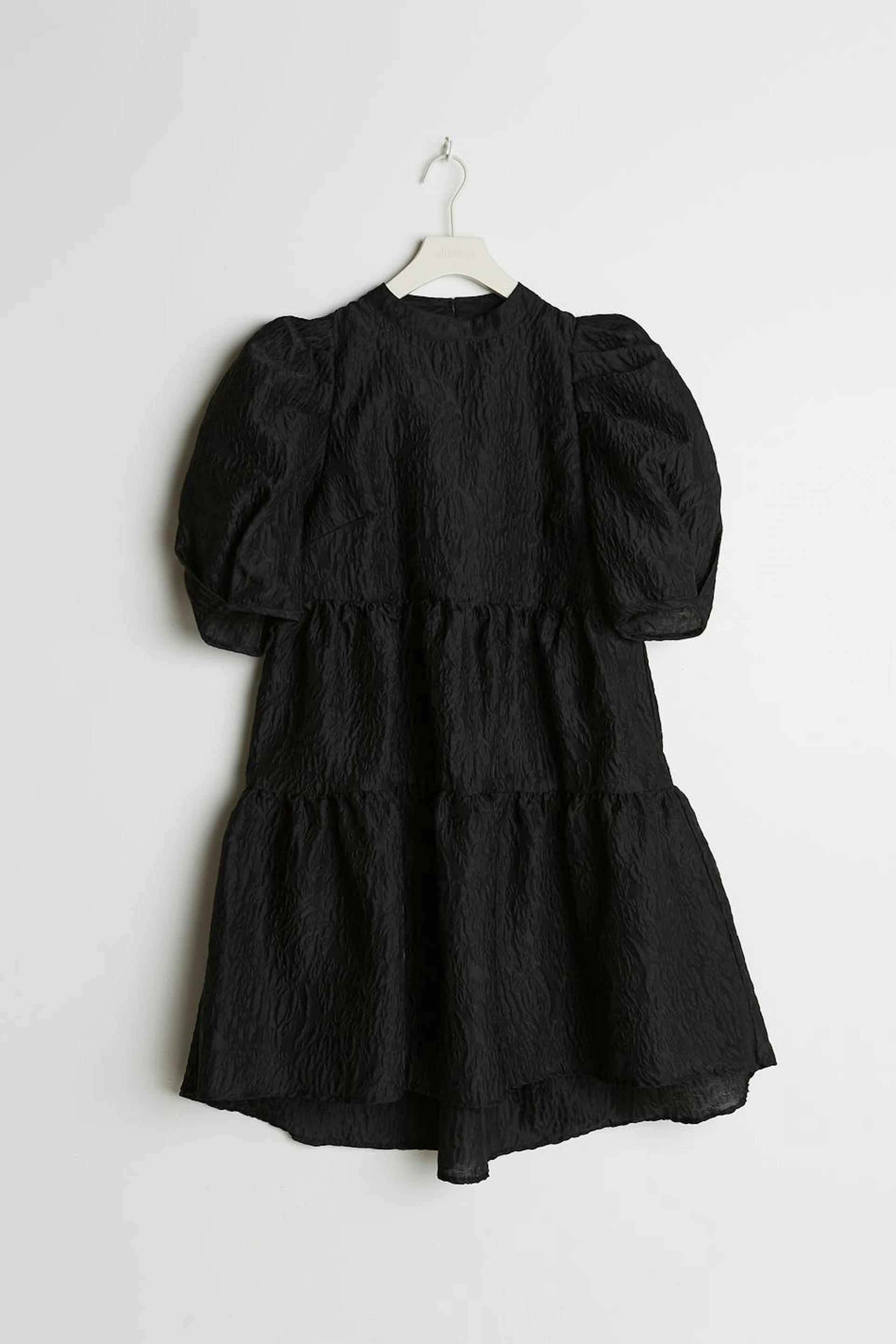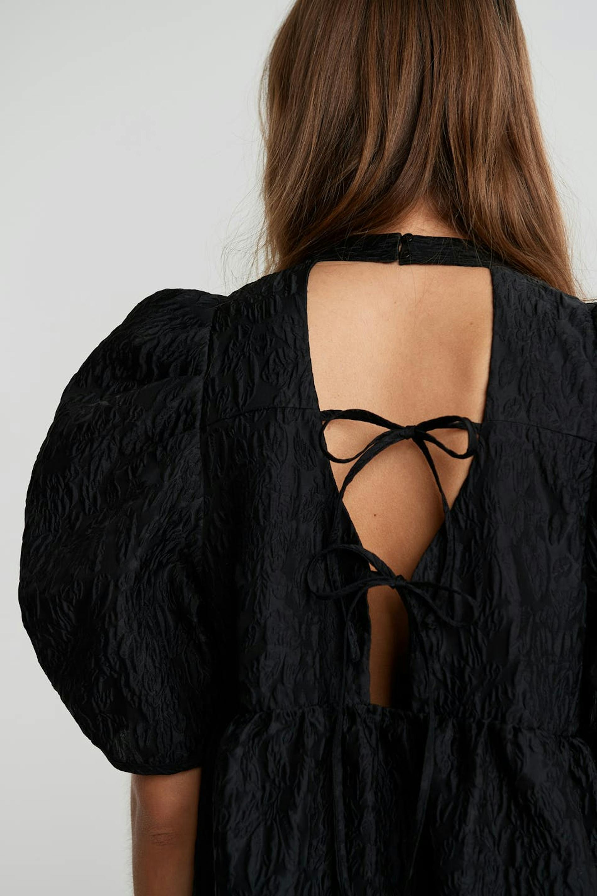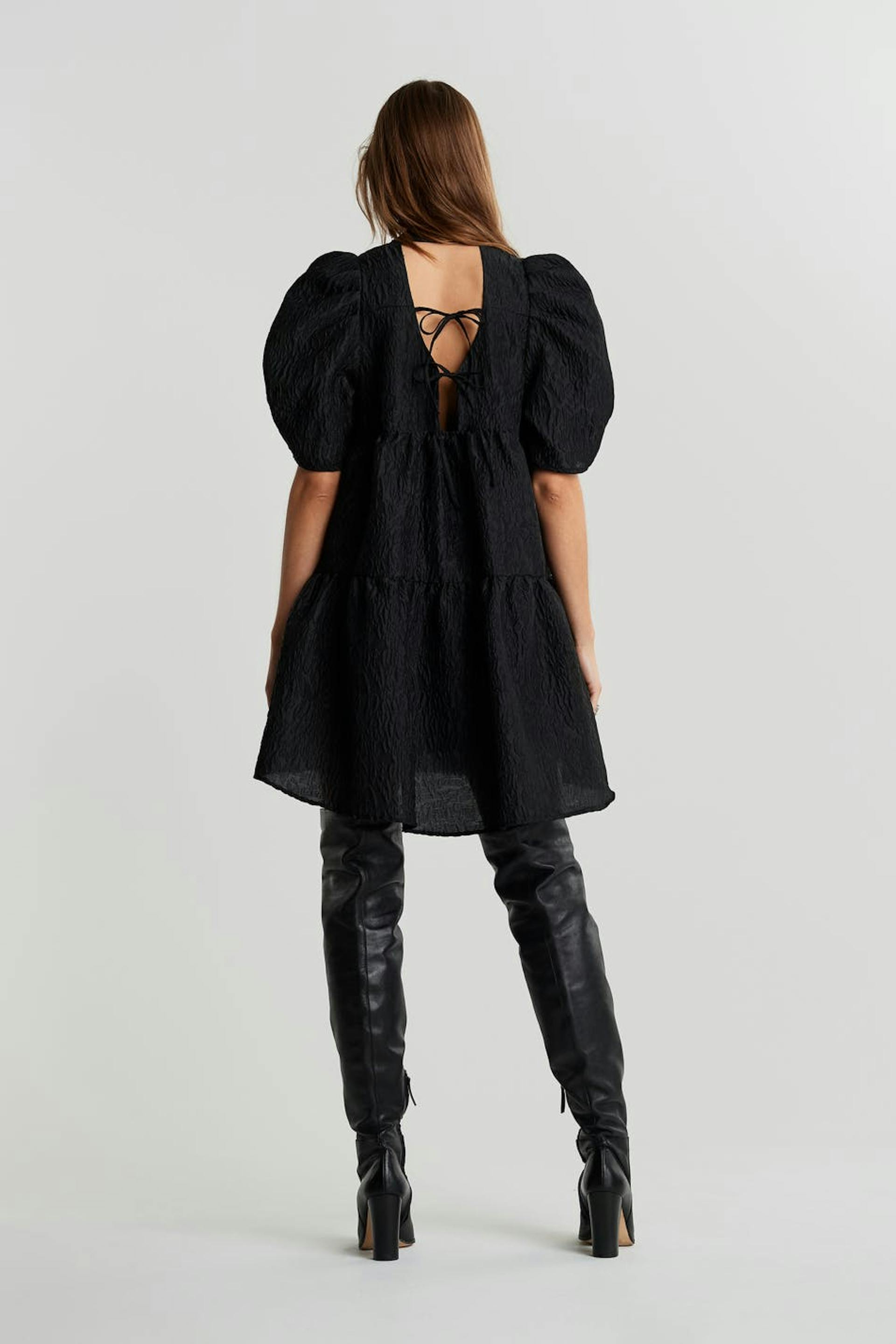 Short dress with short puff sleeves. The dress is perfect for the party, black and slightly longer at the back. It has a material with a texture, panelling on the skirt and a self-tie in the back.