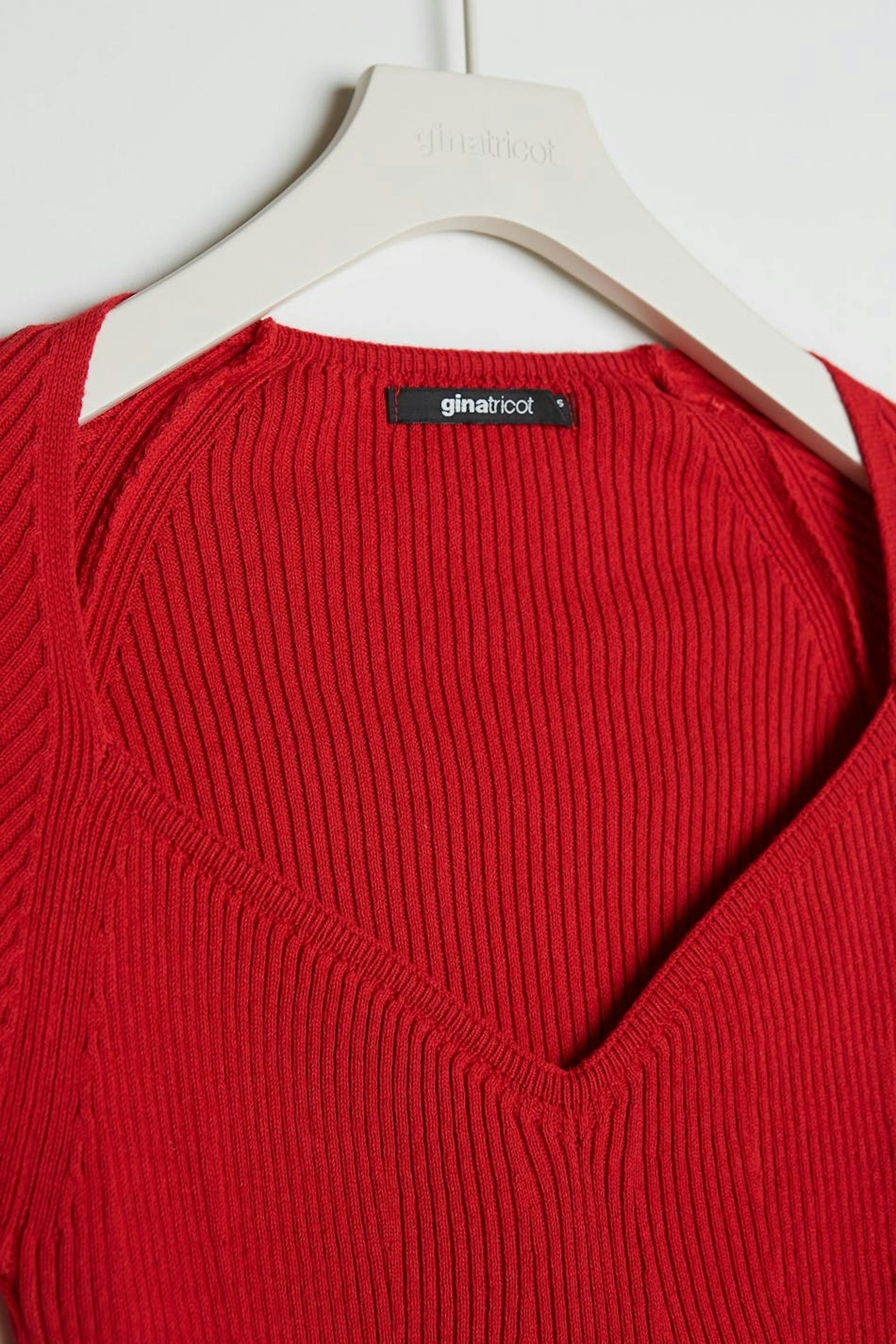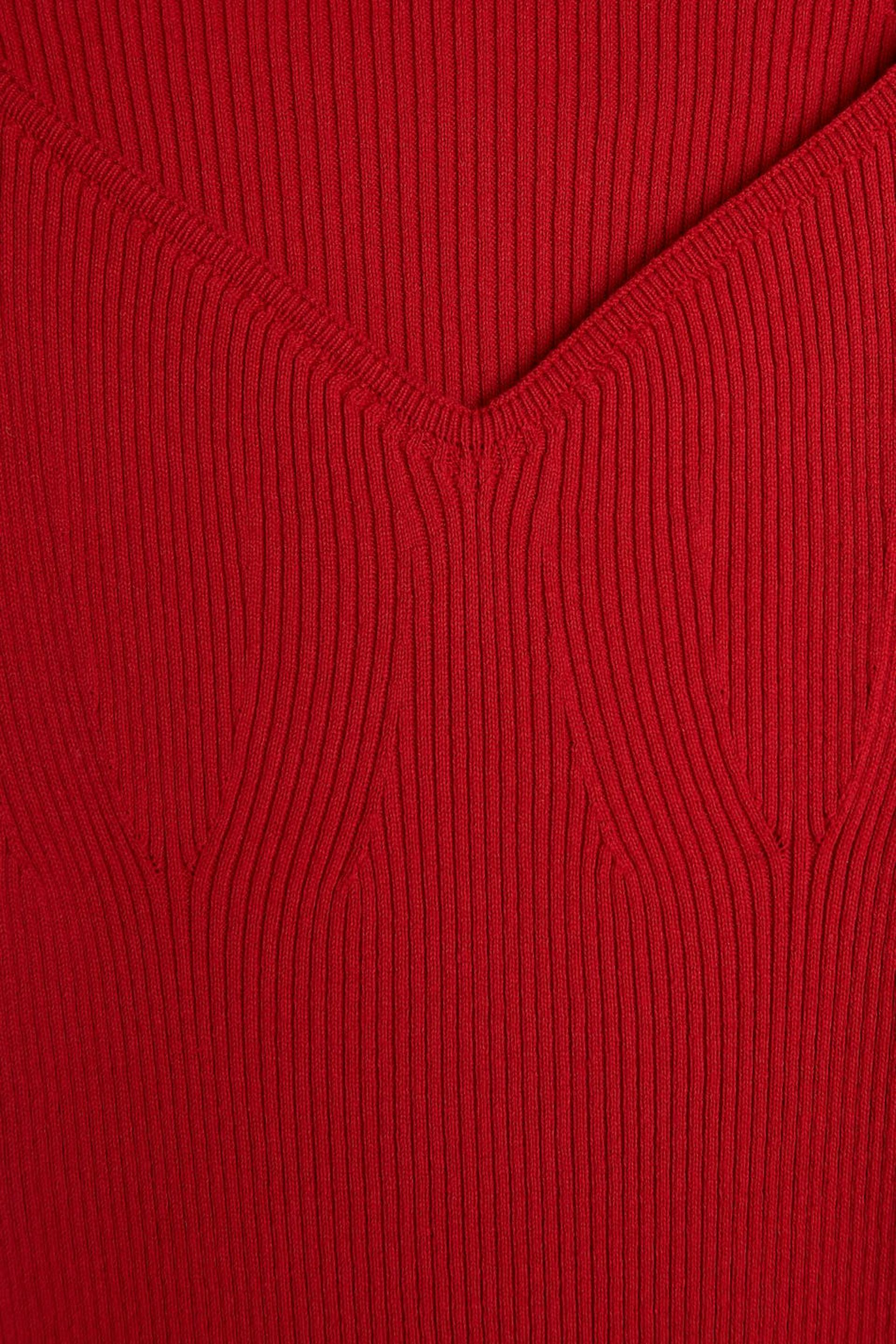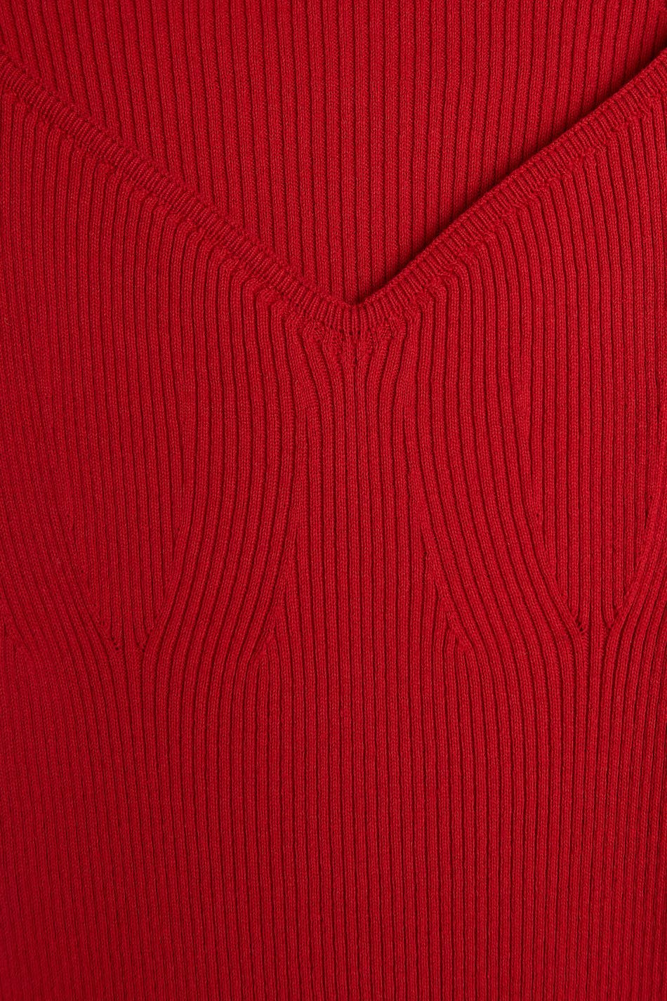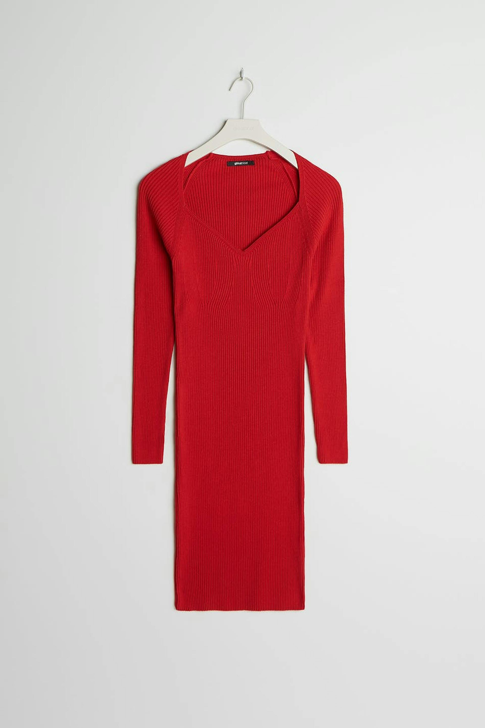 Skinny dress with a sweetheart neckline. The dress is red, long-sleeved and ribbed.