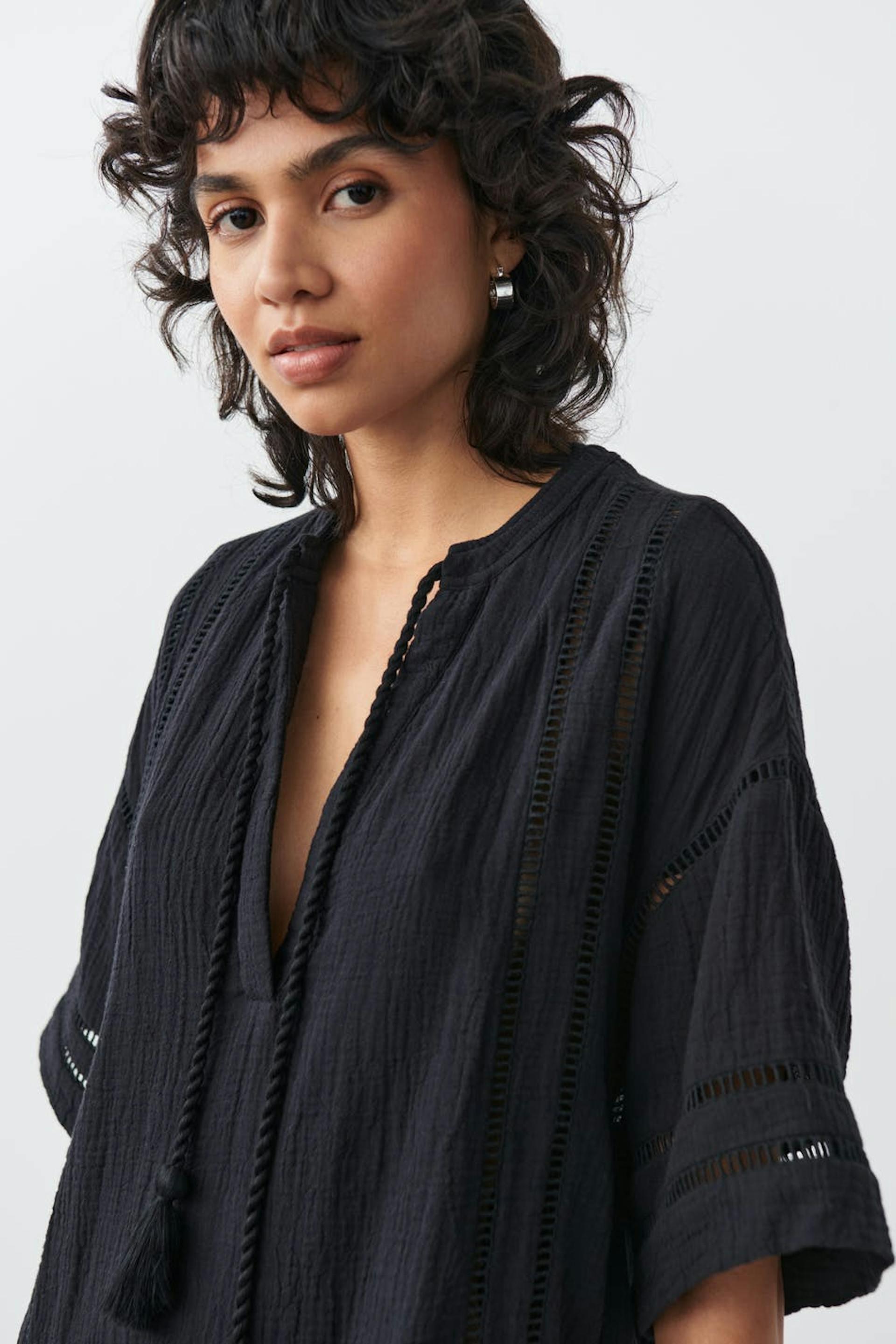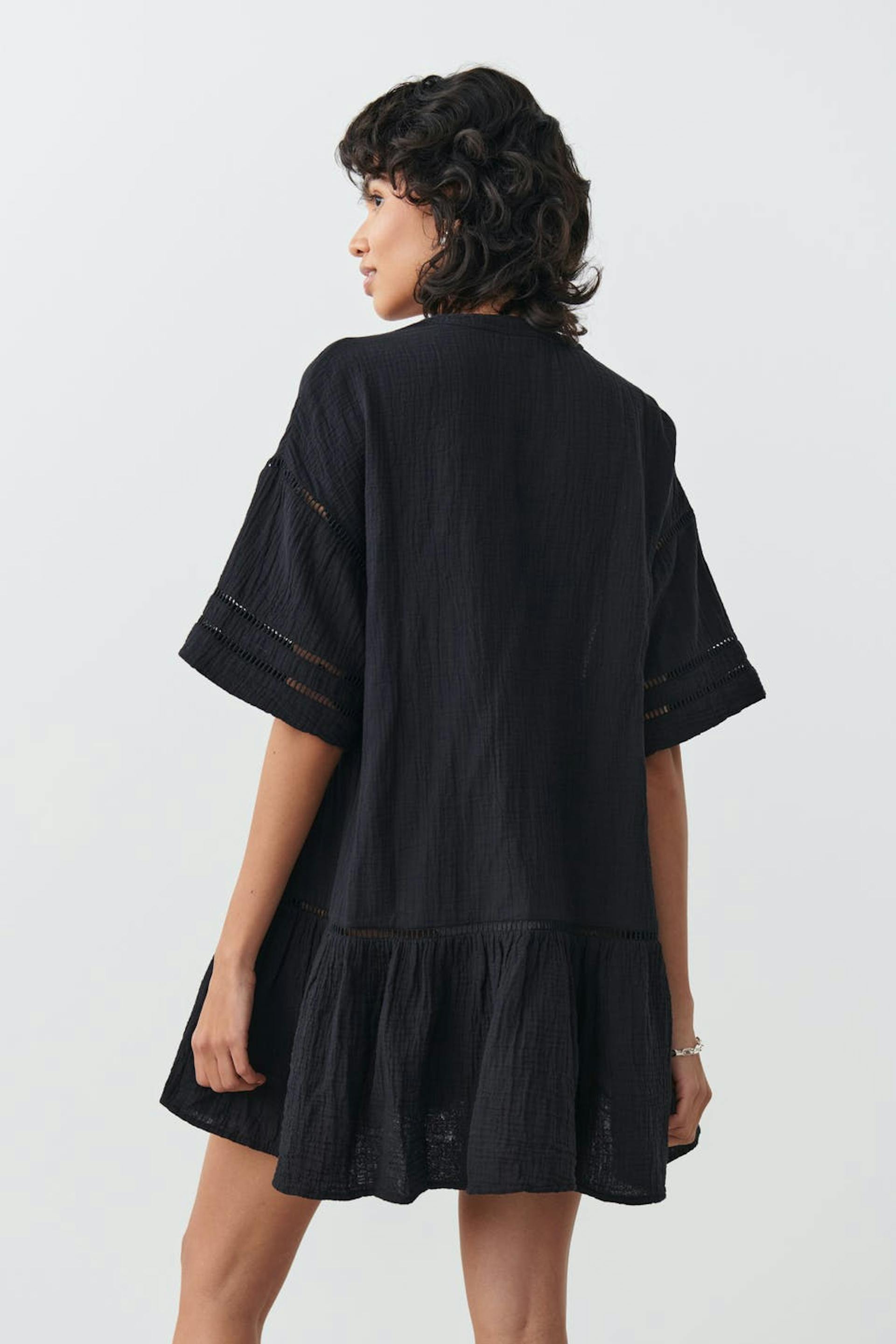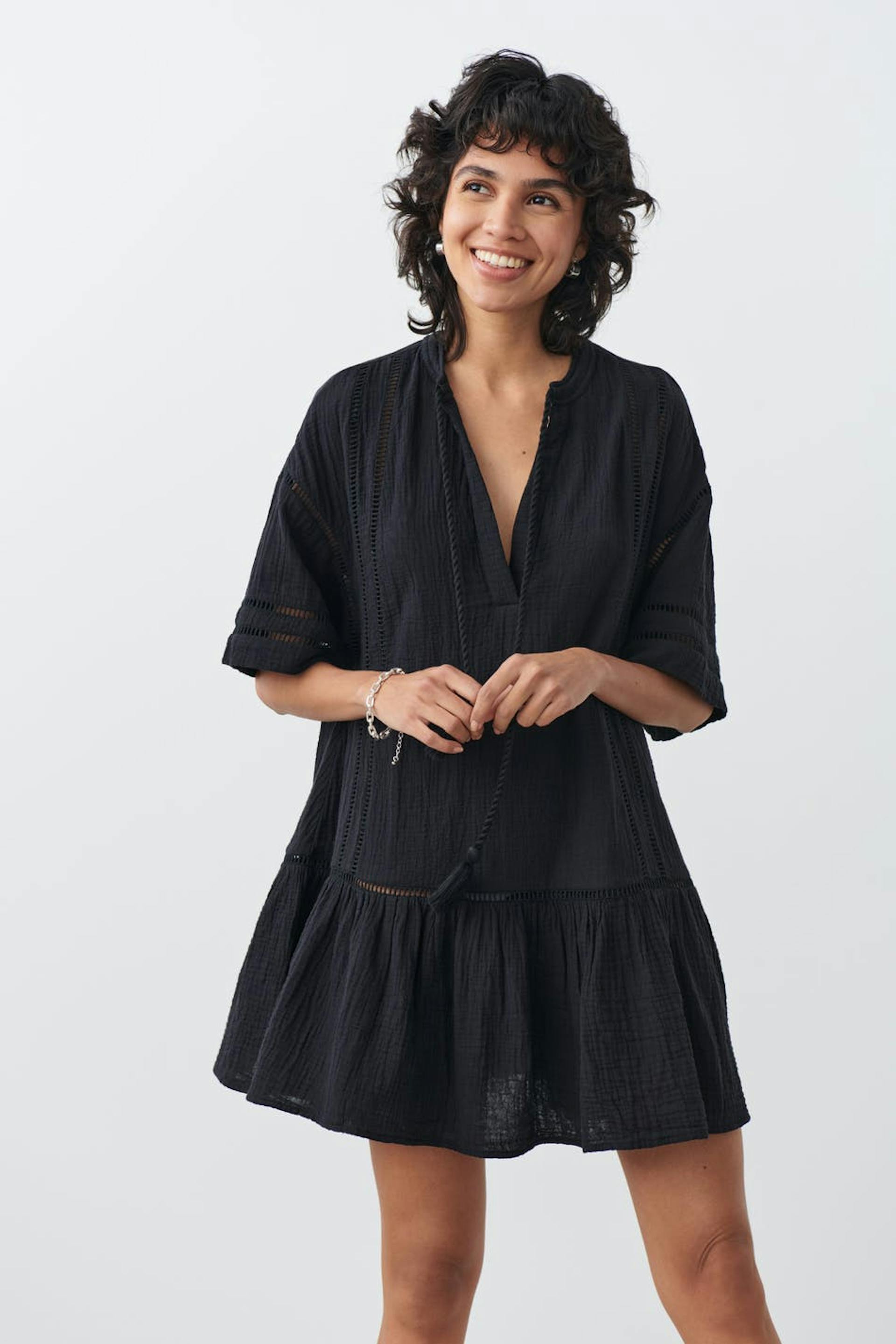 Bohemian dress in cotton with oversize fit. The dress is black and has textured quality. It has v-neck, short sleeve, flounce at the bottom and long, twisted straps at the front.