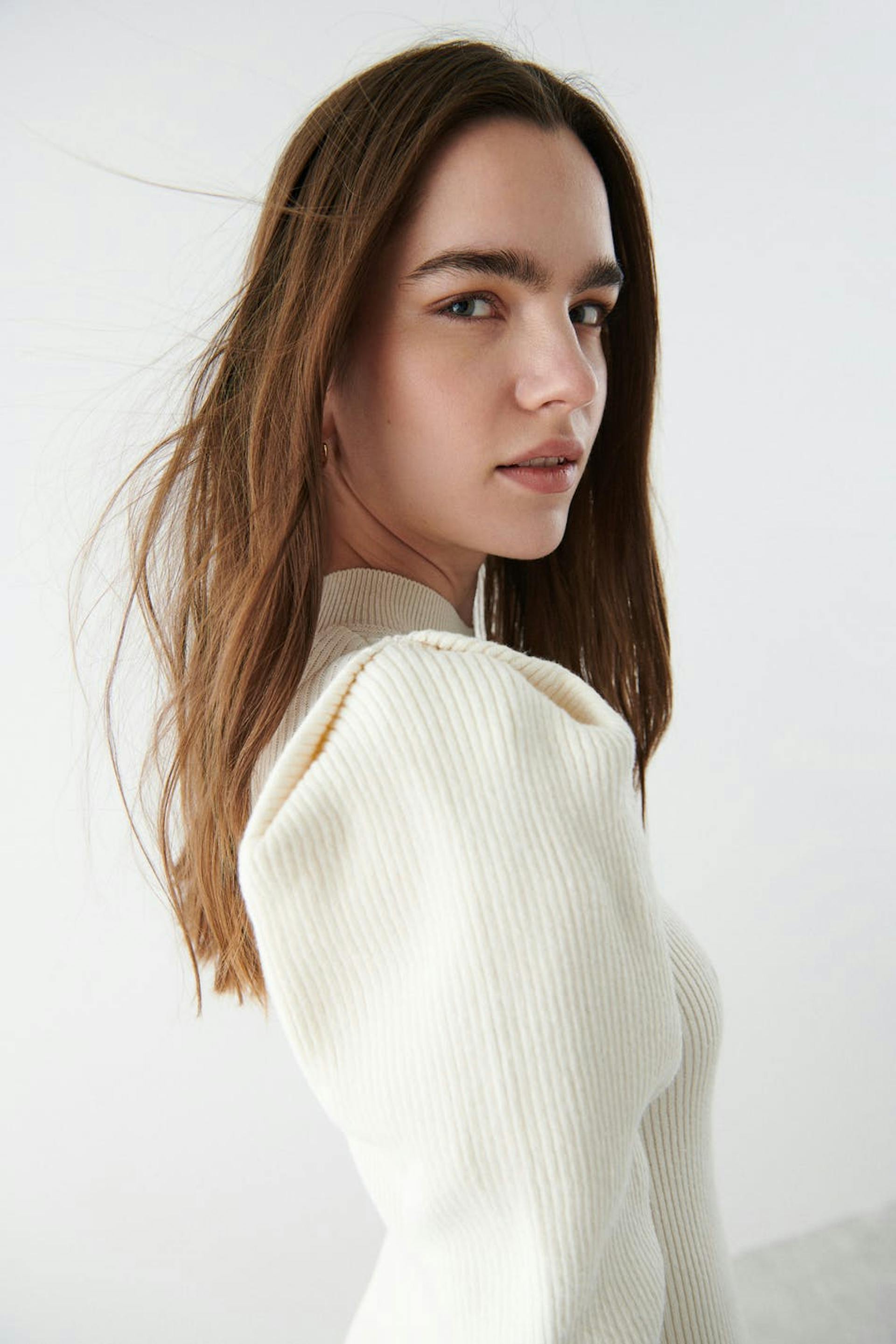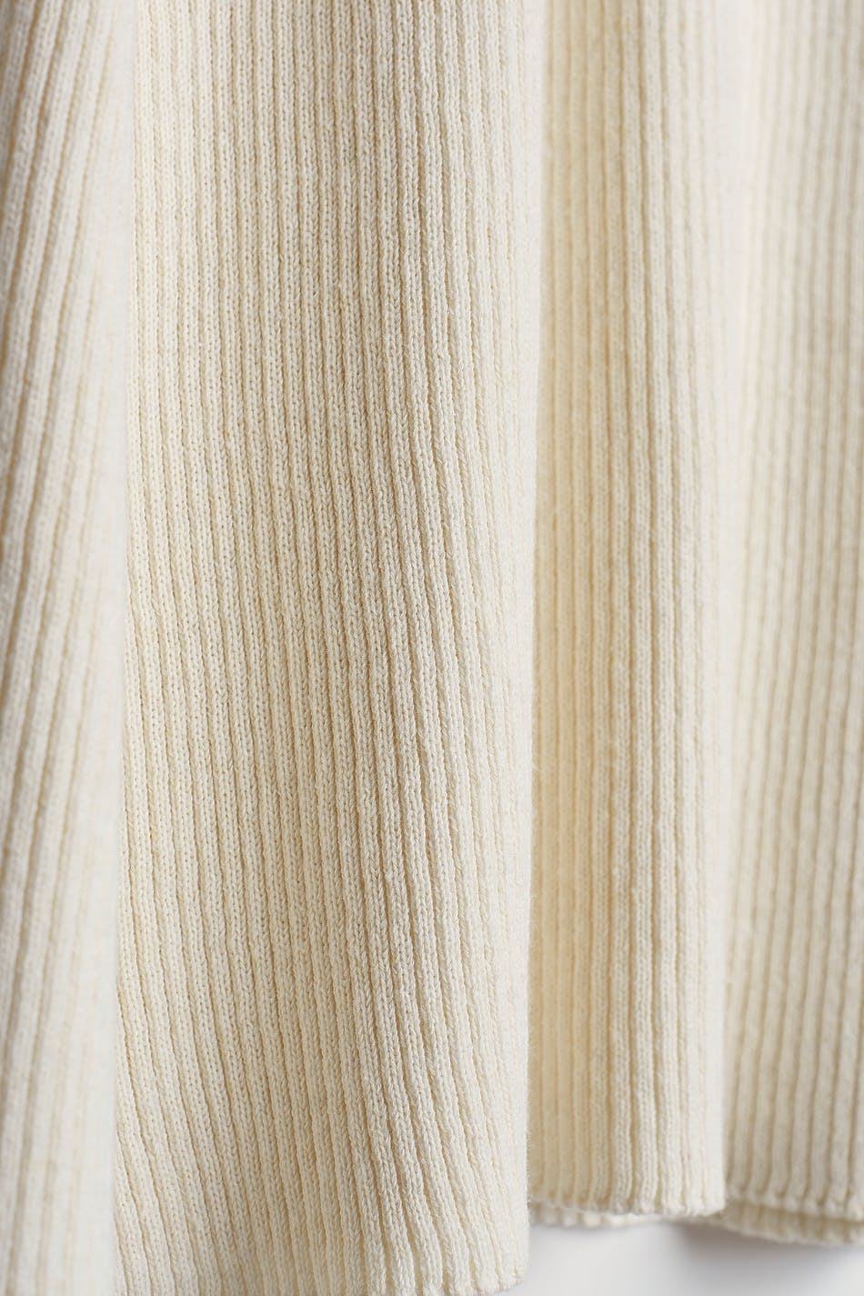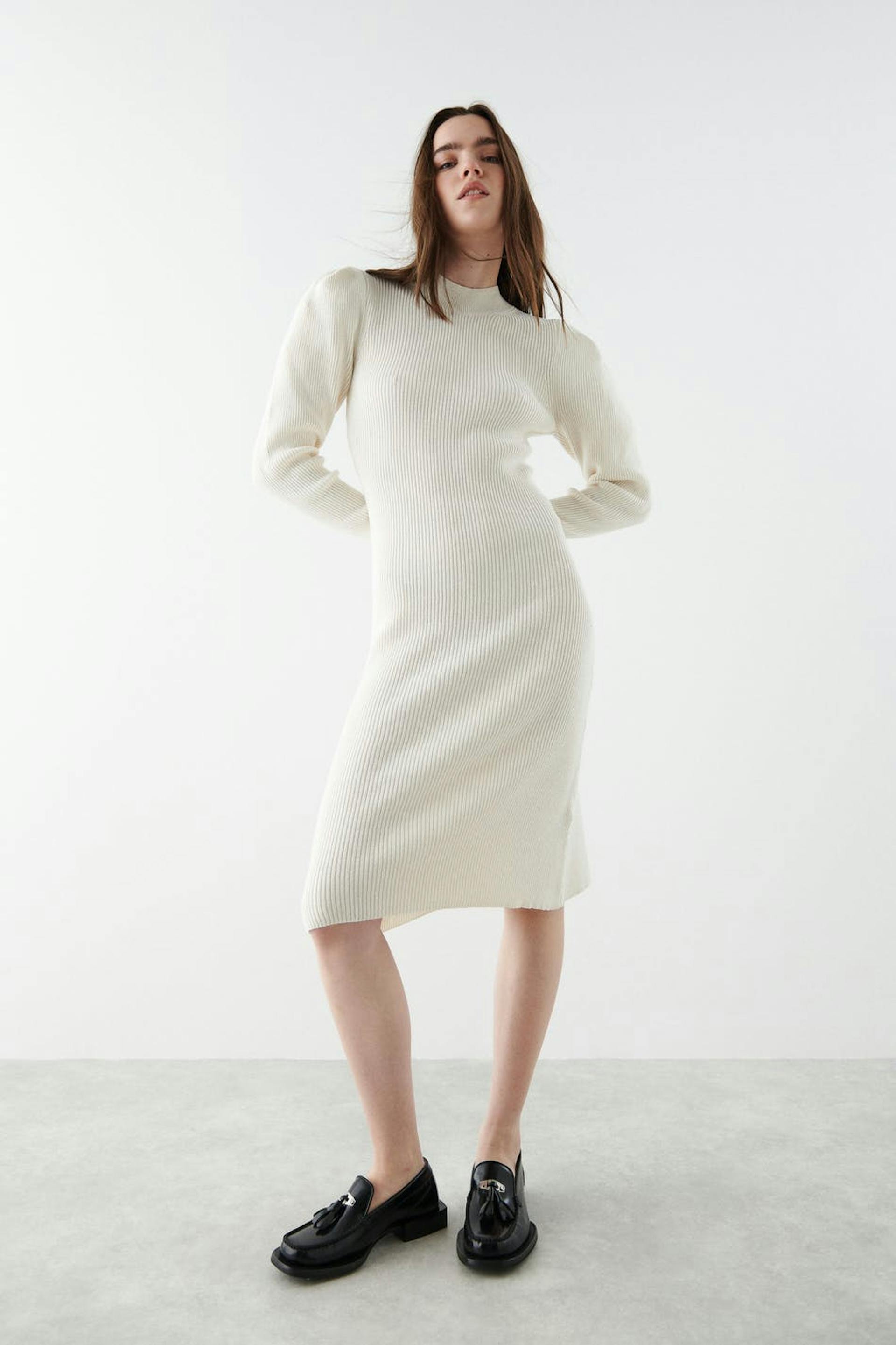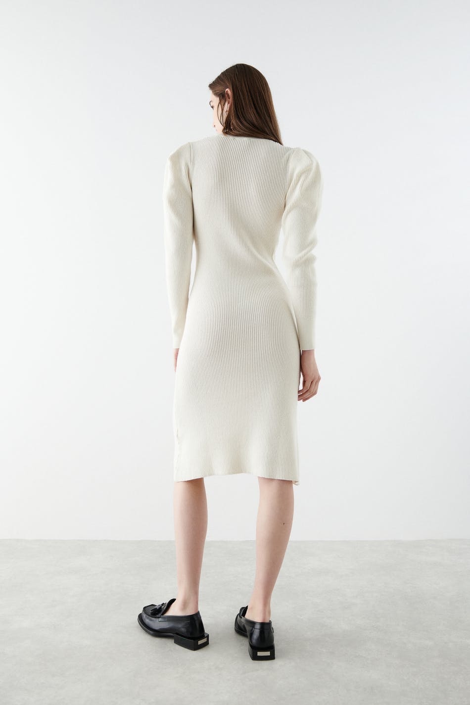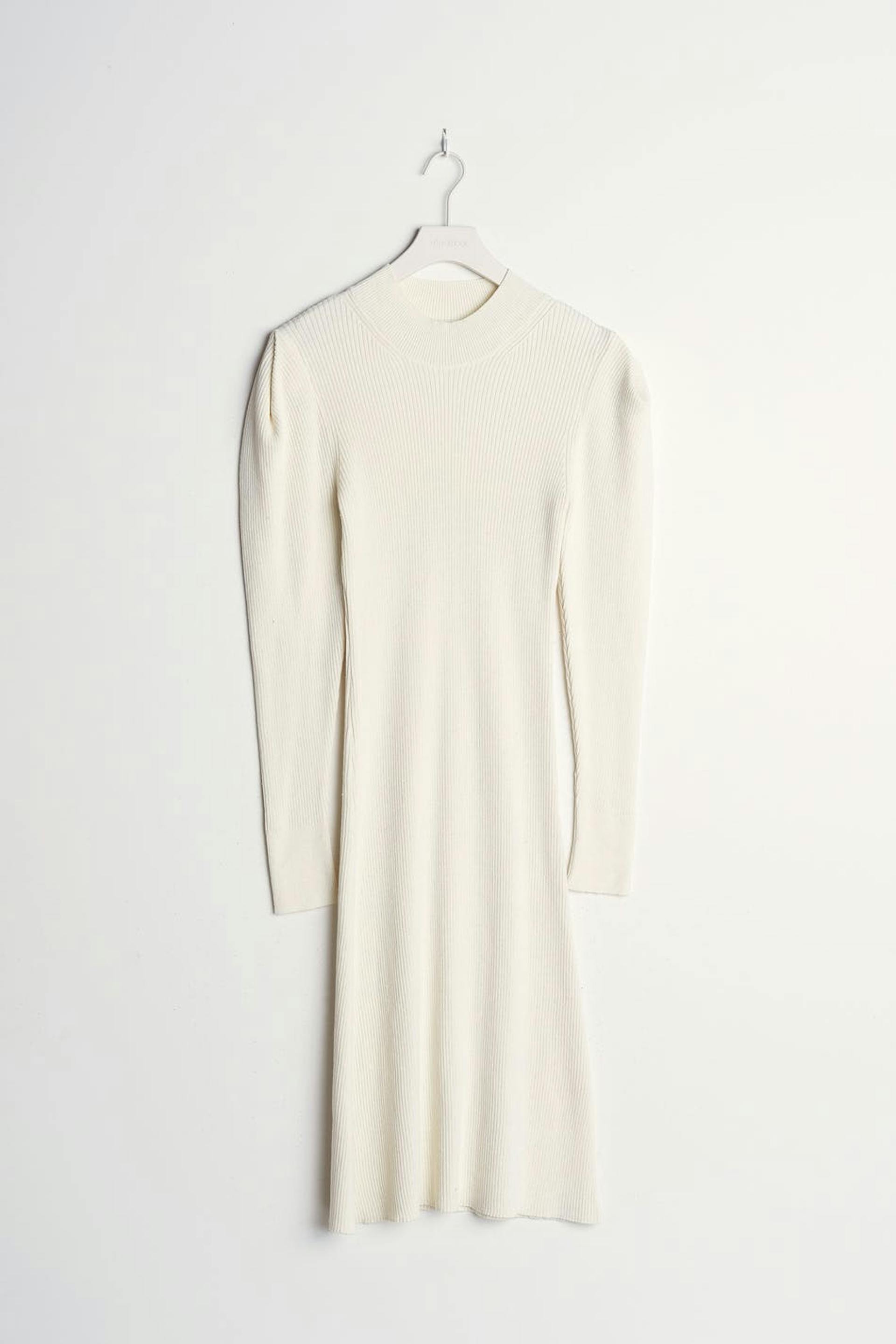 Knitted dress with a fitted fit. The dress is white and long-sleeved and has midi length. It has defined shoulders.