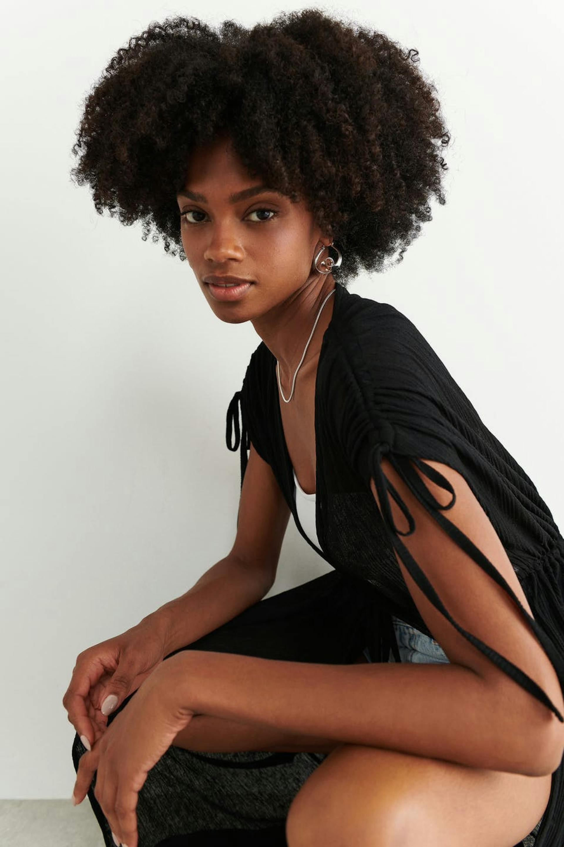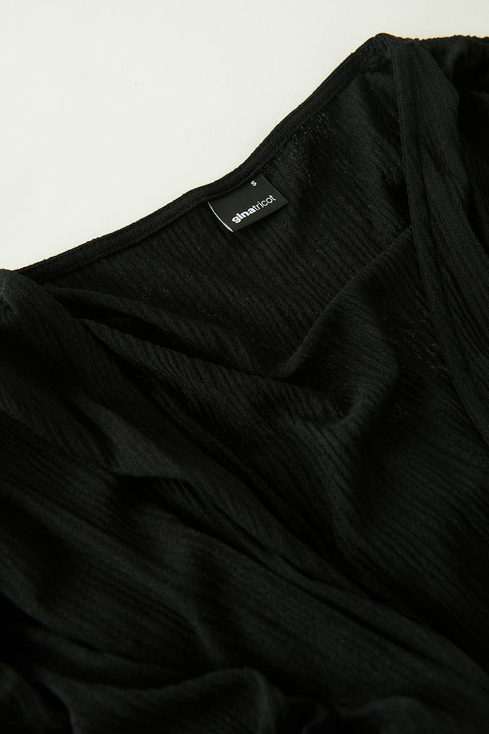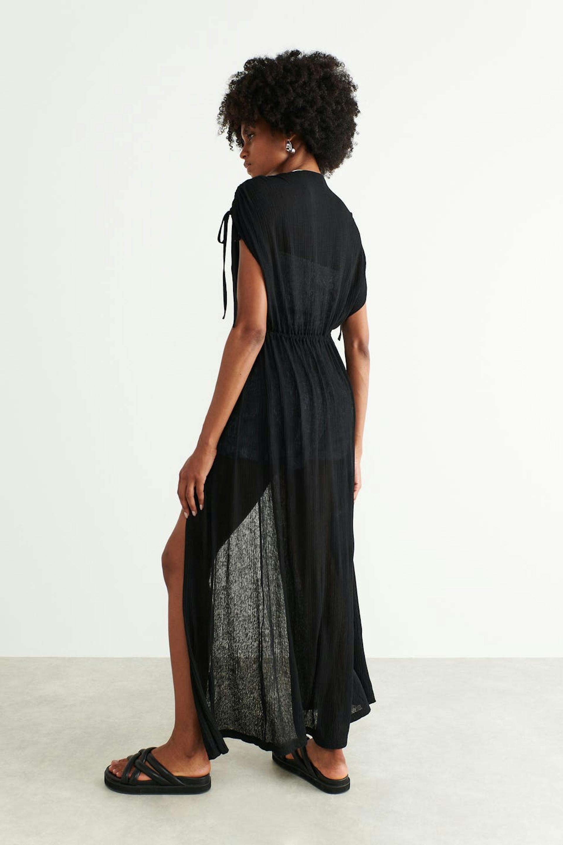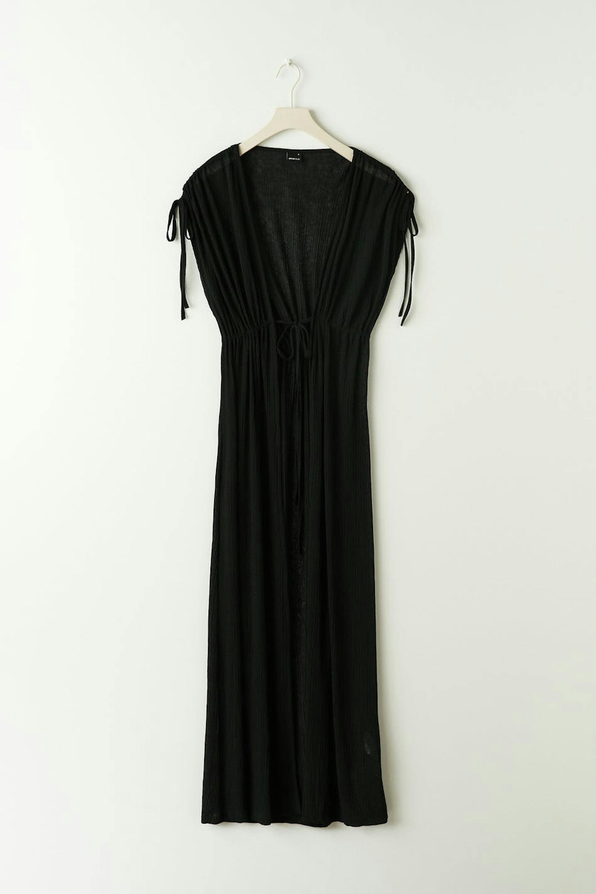 Short-sleeved caftan in jersey with self-tie at the waist. The tunic is black and has a normal fit. It has drawstrings at the shoulders and a maxi length.