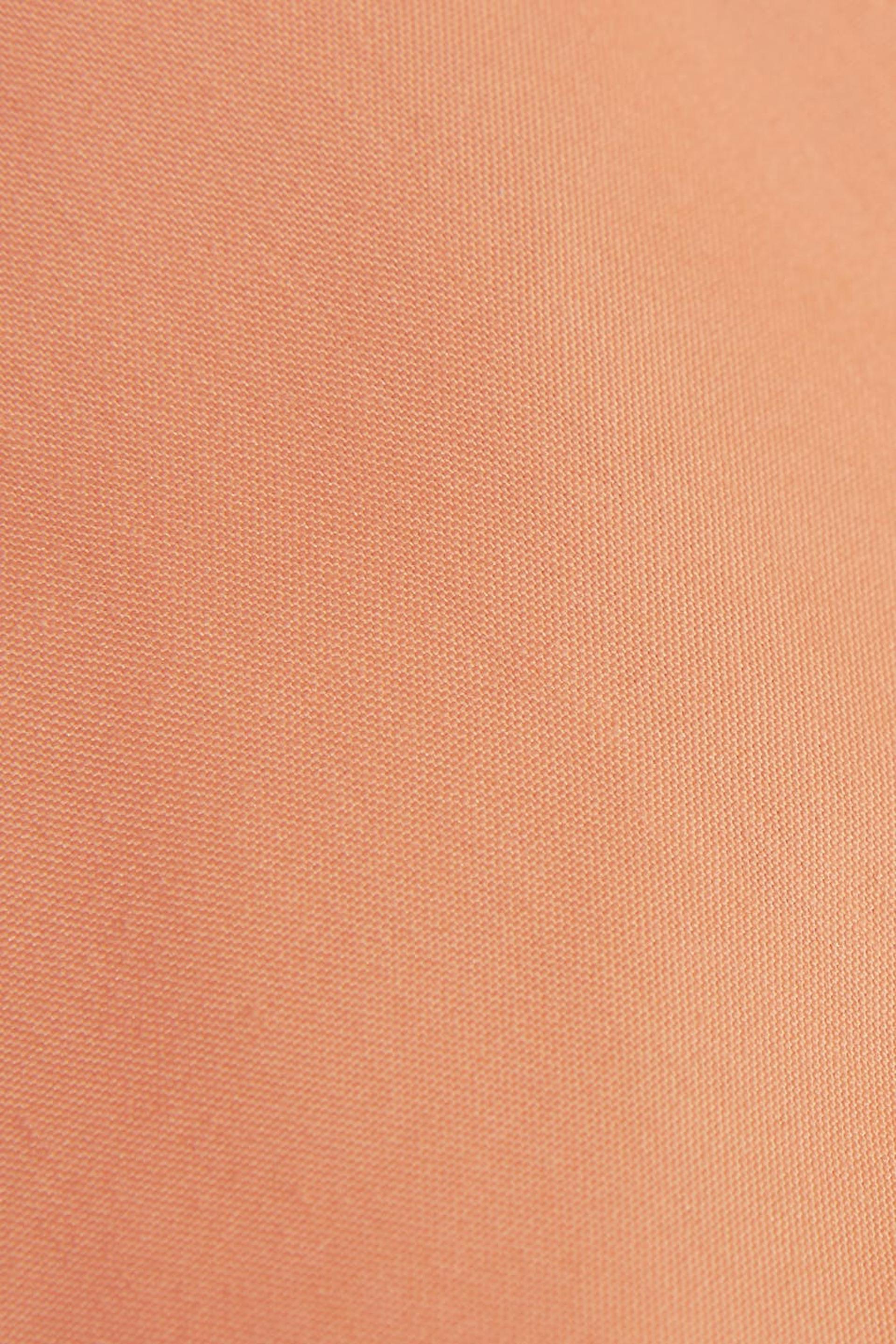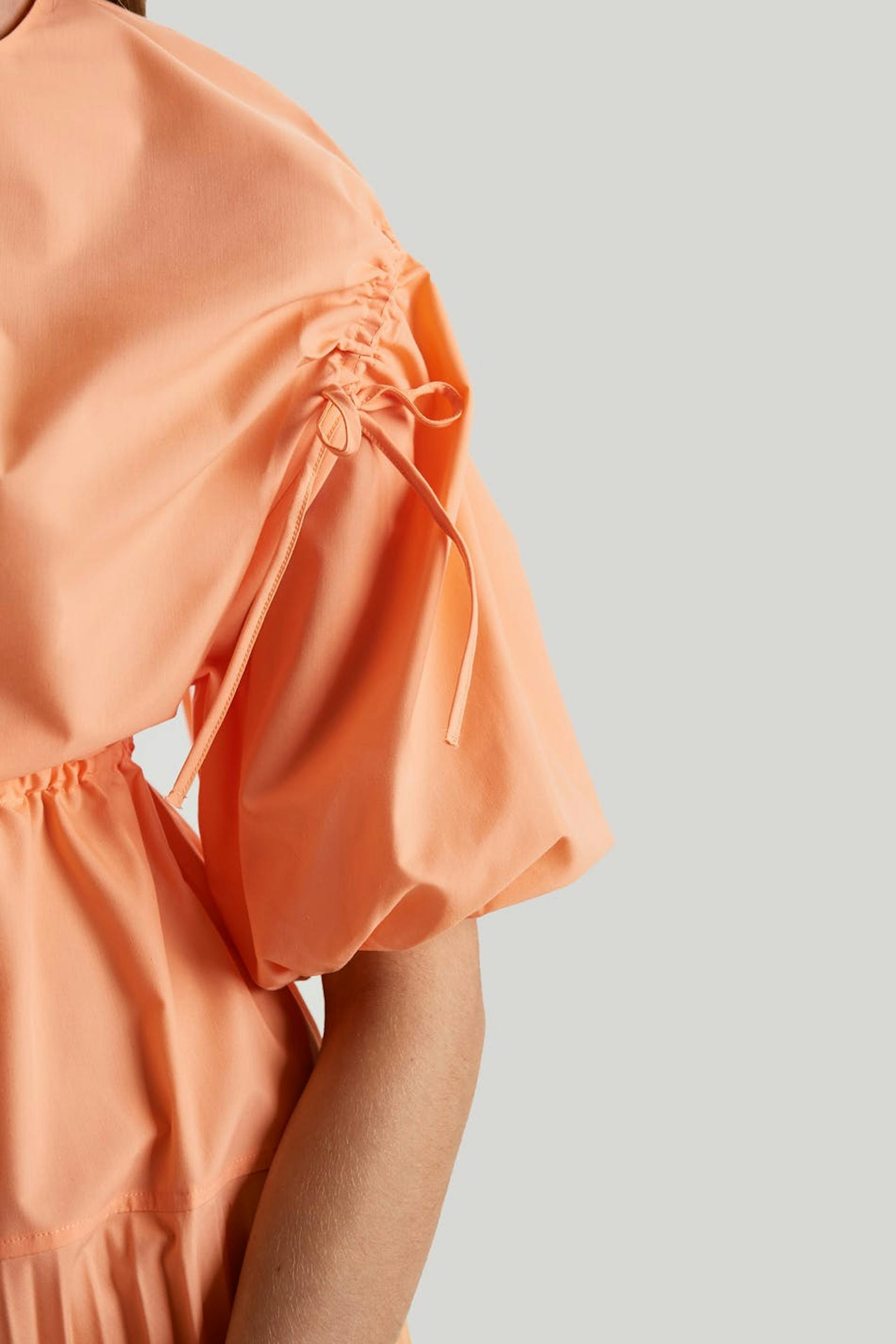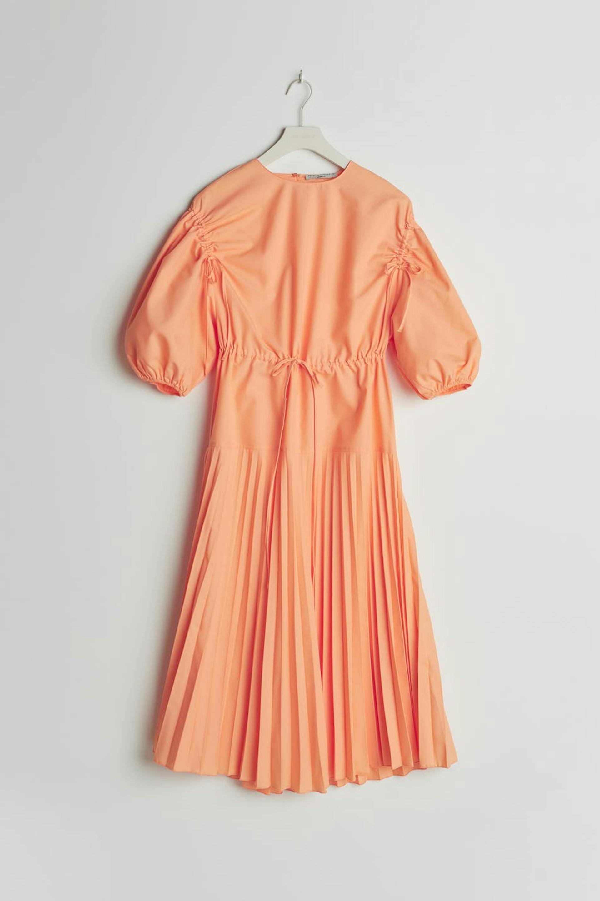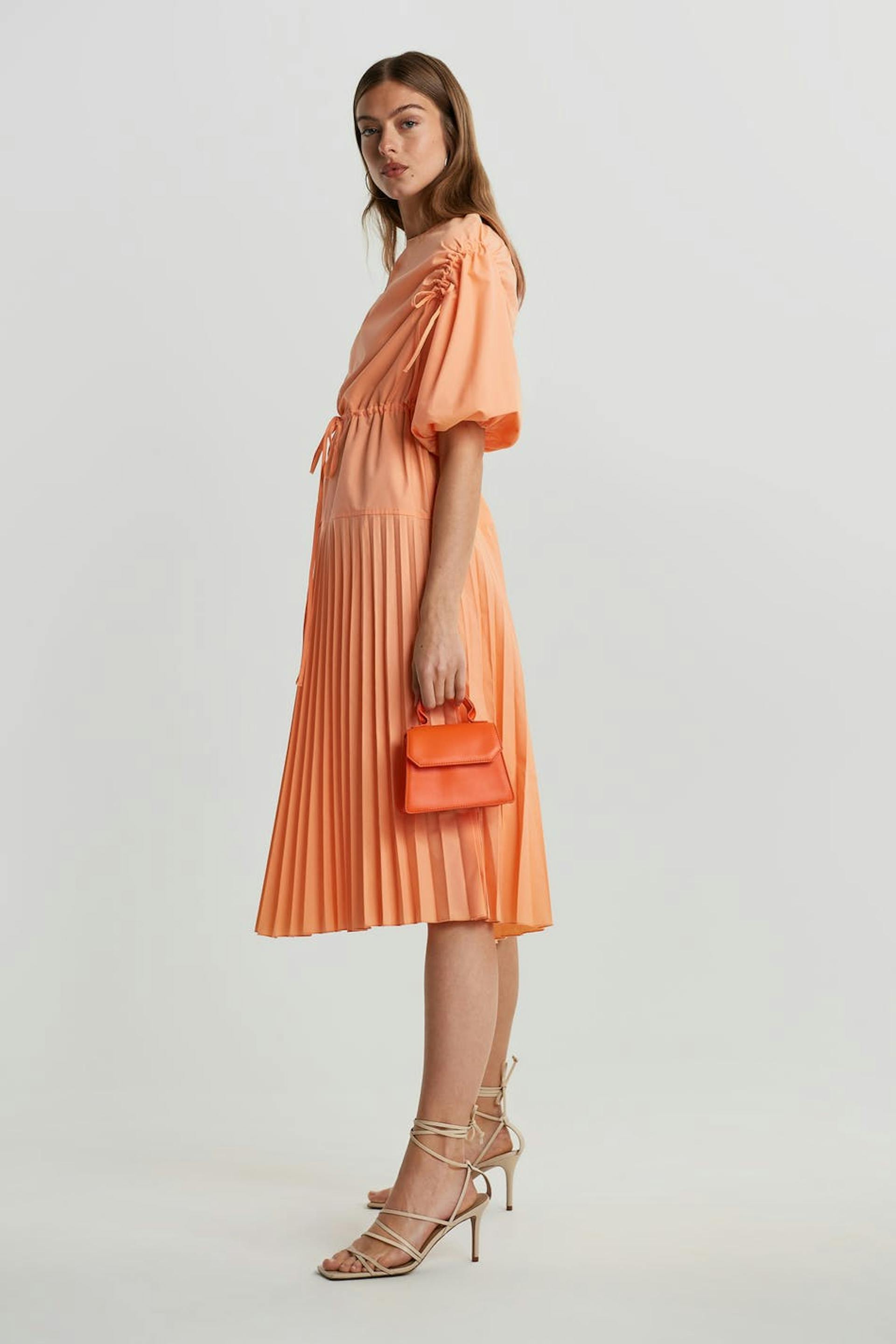 Dress with a pleated, midi skirt. The dress is orange and has a detail with a drawstring at the waist and at the shoulders.