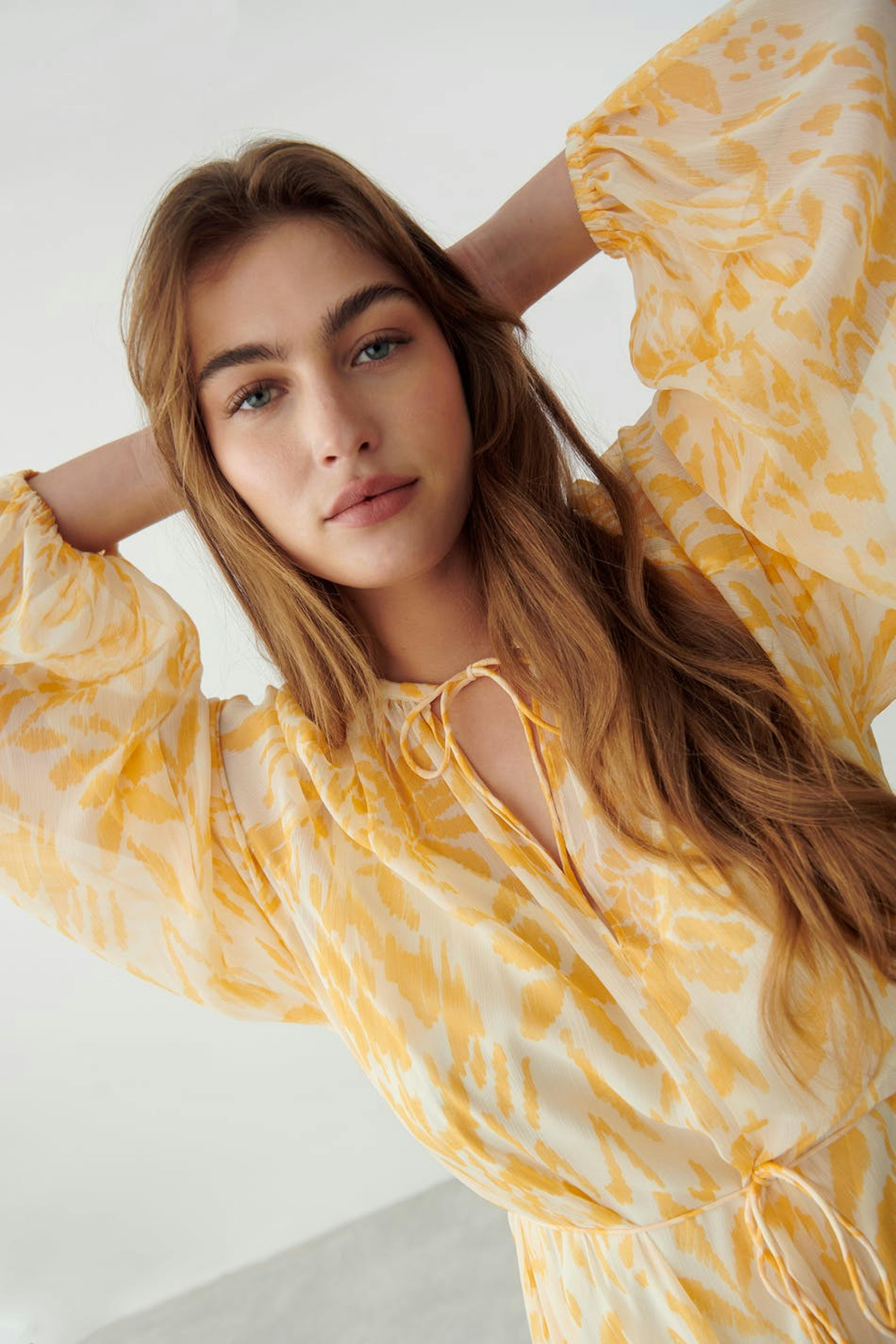 Patterned maxi dress in chiffon with v-neck. The dress is yellow and has long balloon sleeve with elasticized cuff. It has underdress, gathering on the skirt and knot detail at the waist and around the neckline.