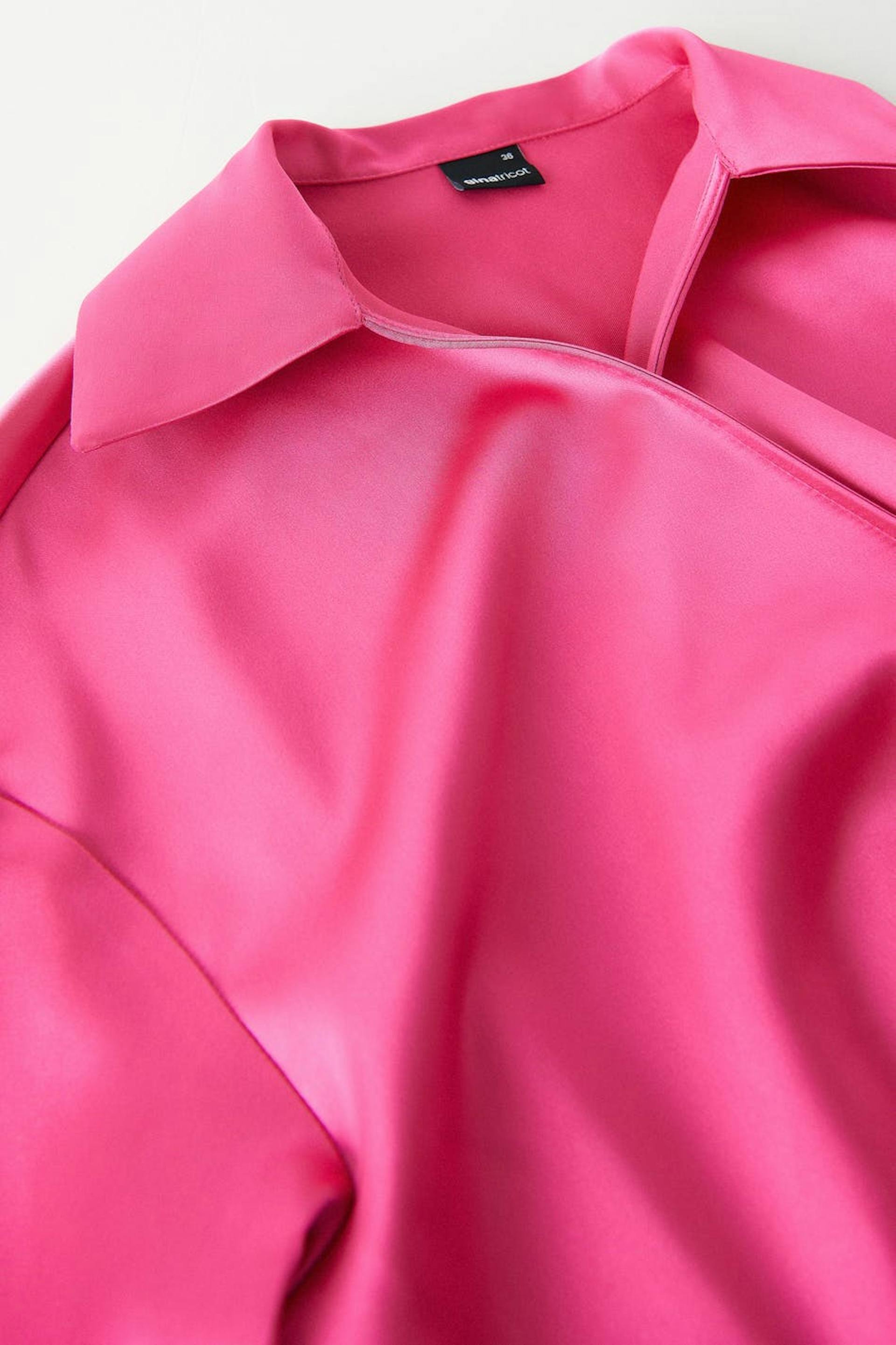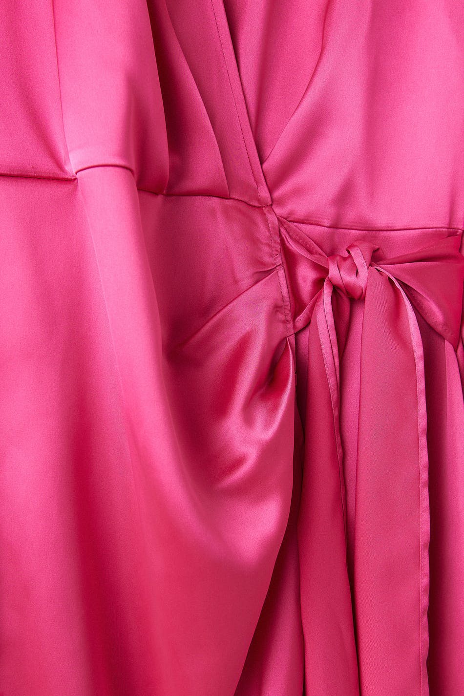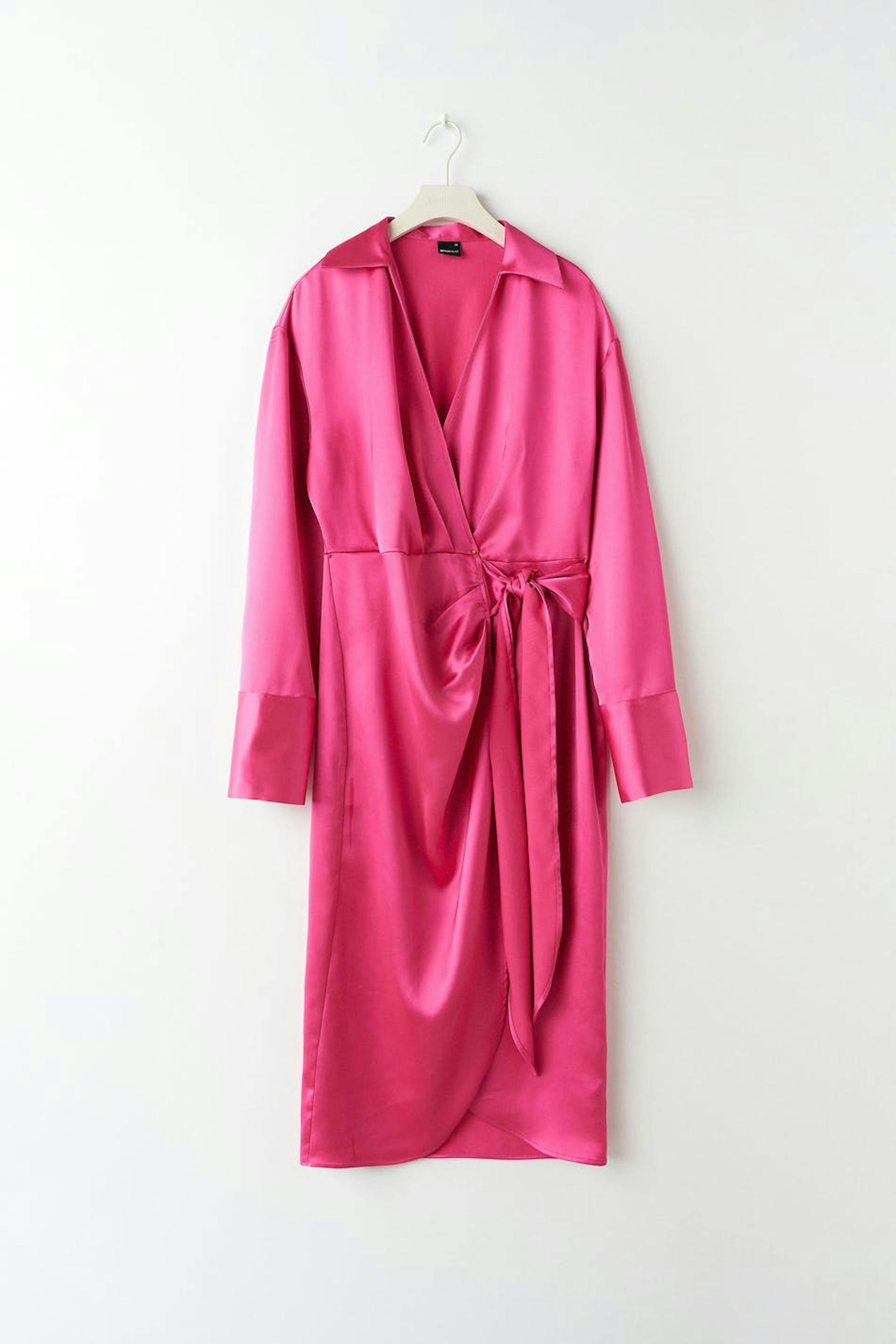 Shirt dress in satin with overlap design. The dress is perfect for the party and pink and has v-neck. It has a collar and tie strings at the waist.