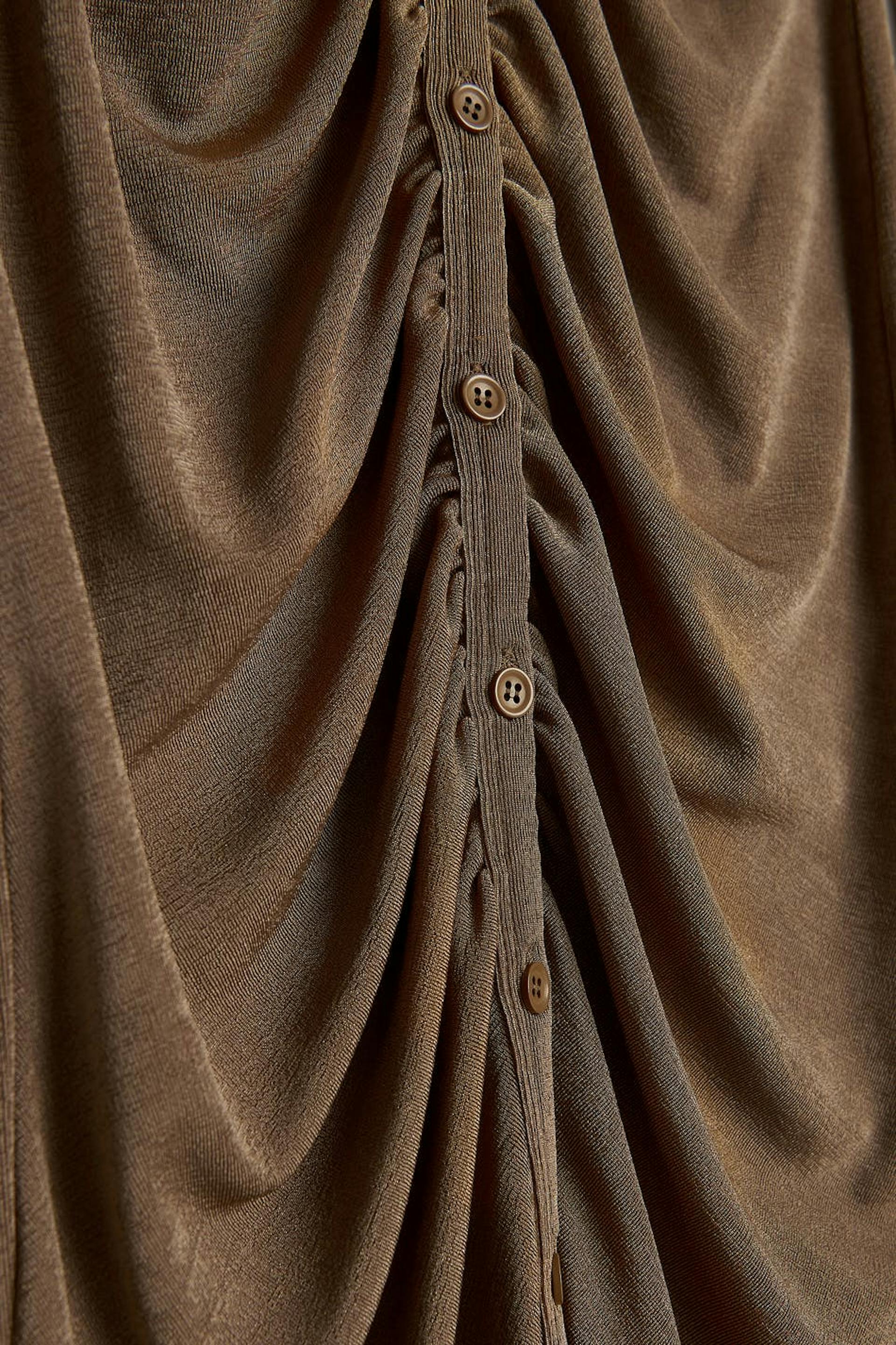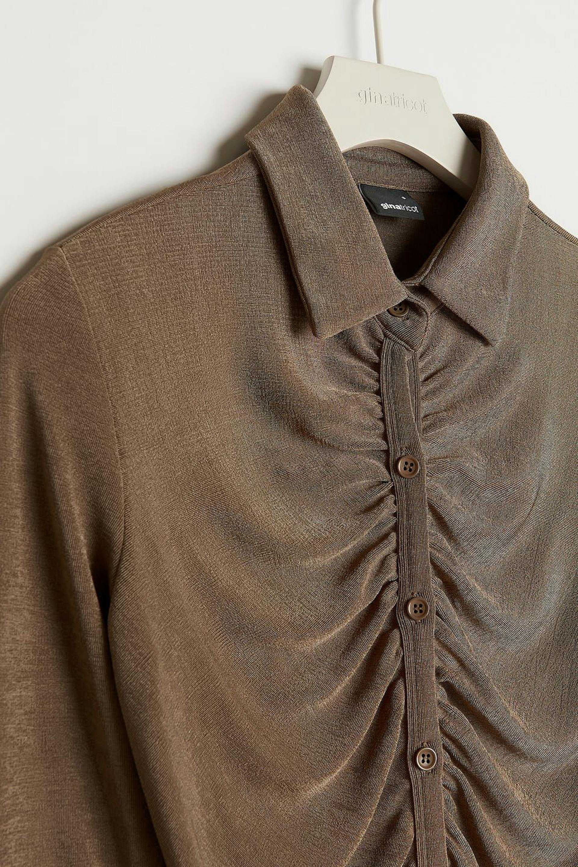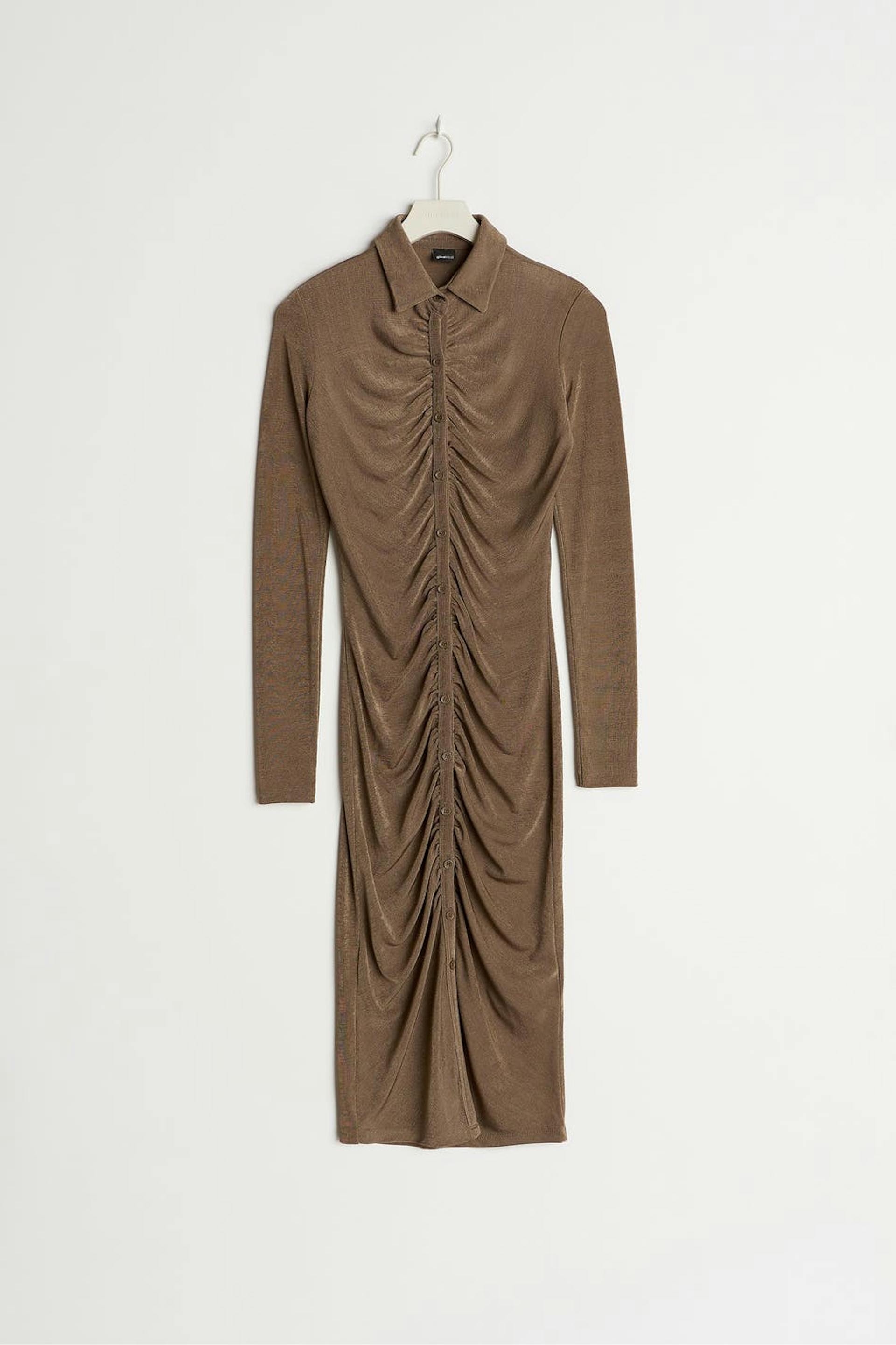 Long-sleeved shirt dress with gathering. The dress is perfect for the party and beige and has midi length. It has a fitted fit and a button closure at the front.