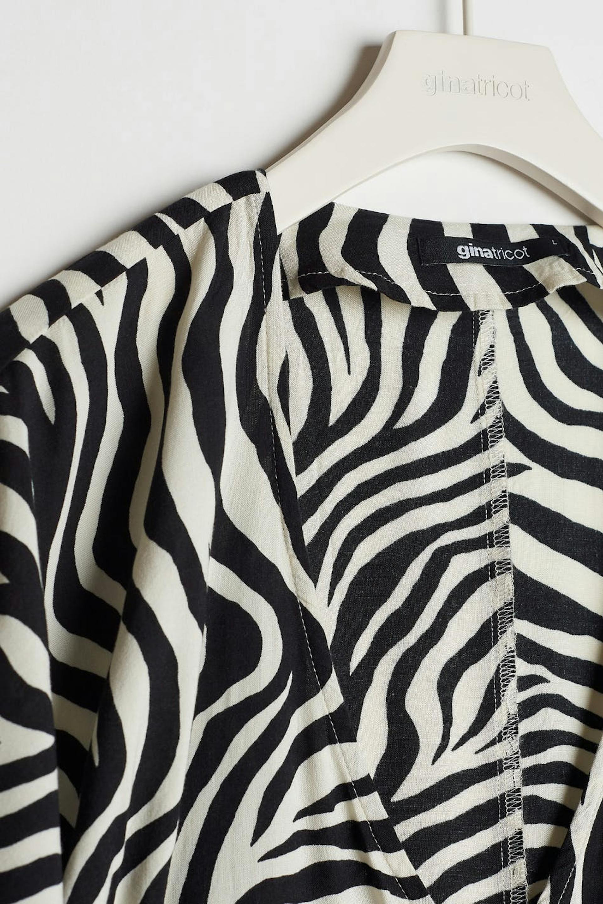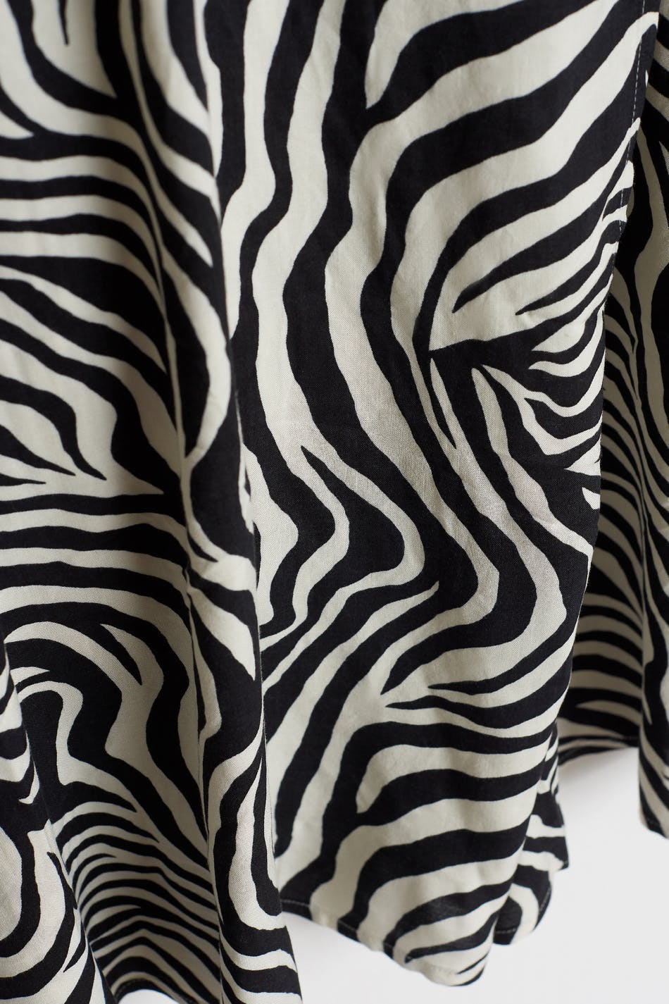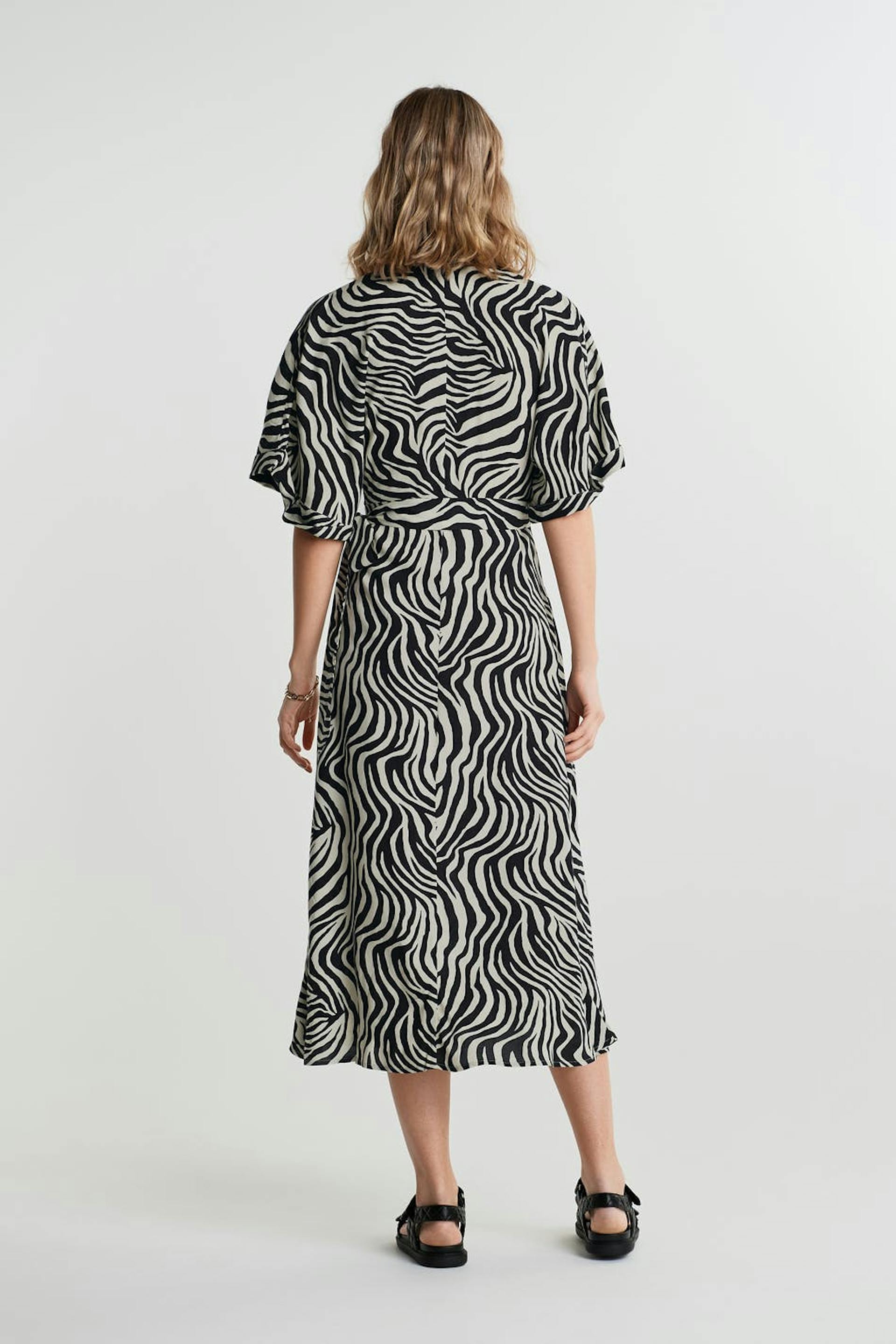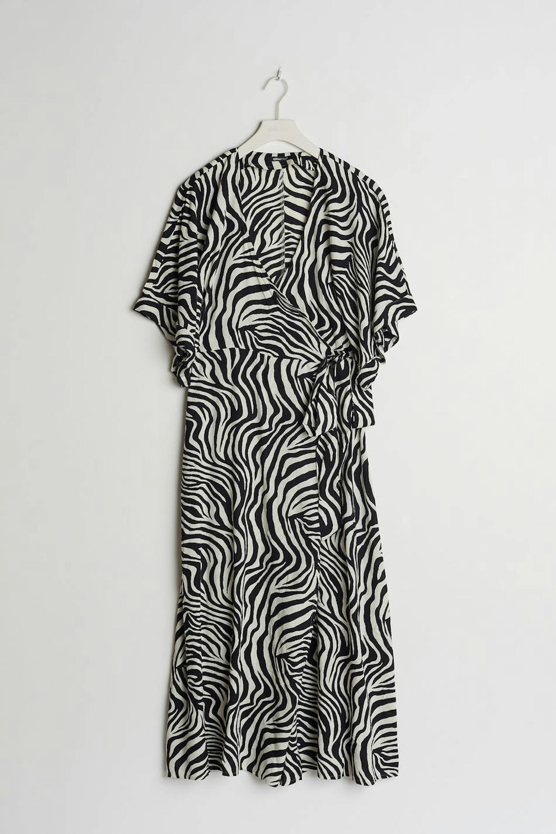 Zebra patterned dress with midi length. The dress is beige and black and has a wrap design with a self-tie at the side. It has a v-neck cut and short, wide sleeves.