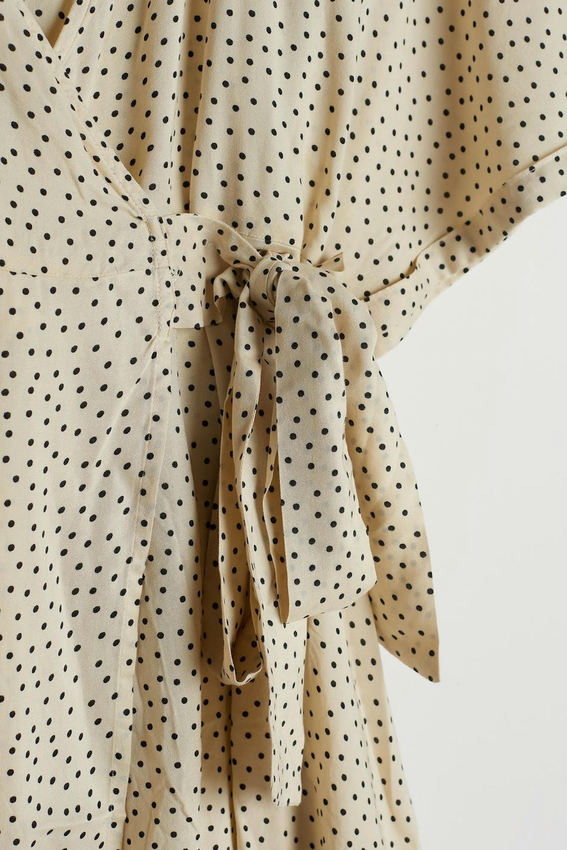 Short dress with black dots. The dress is beige and has an overlap design with a self-tie at the side. It has short, airy sleeves.