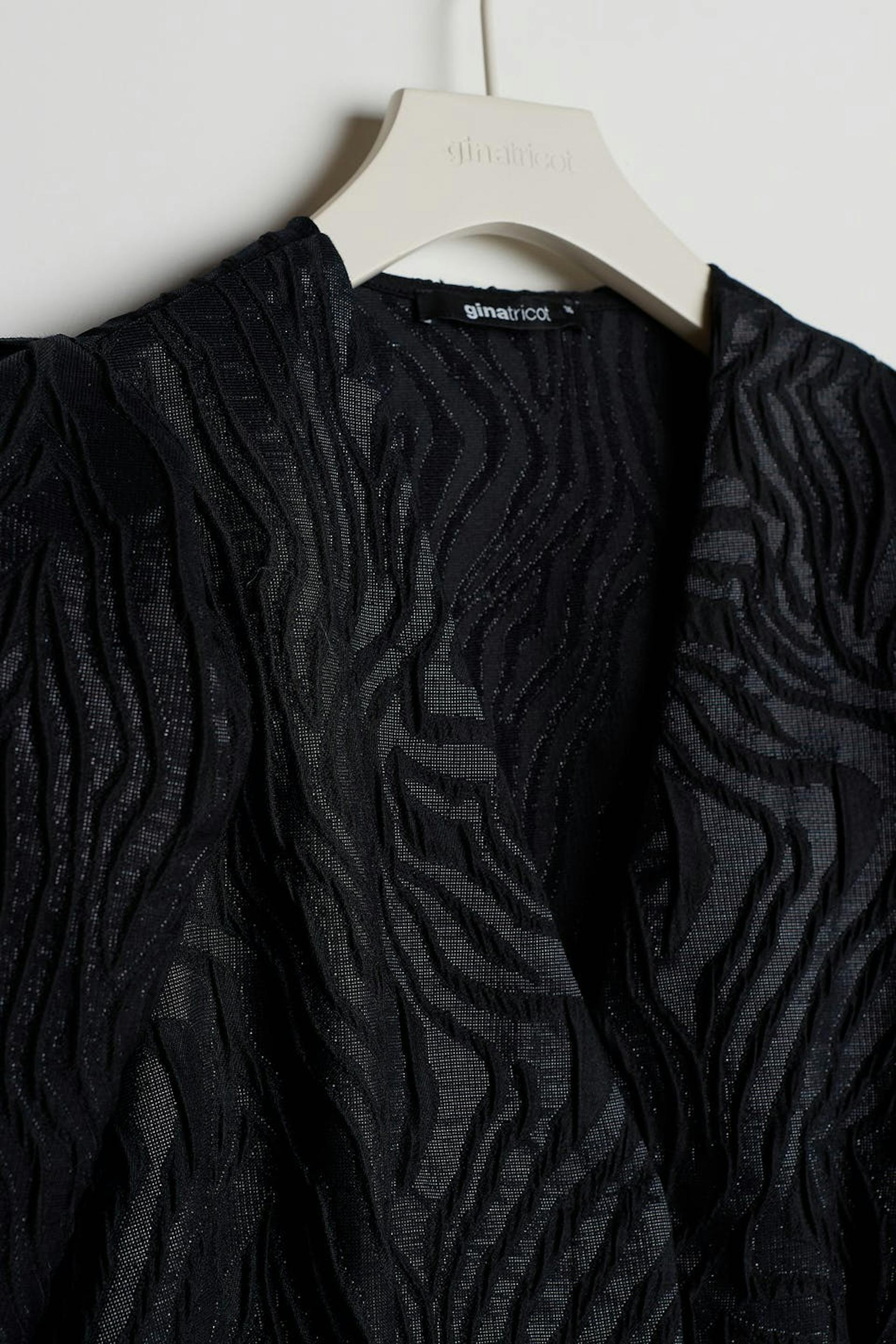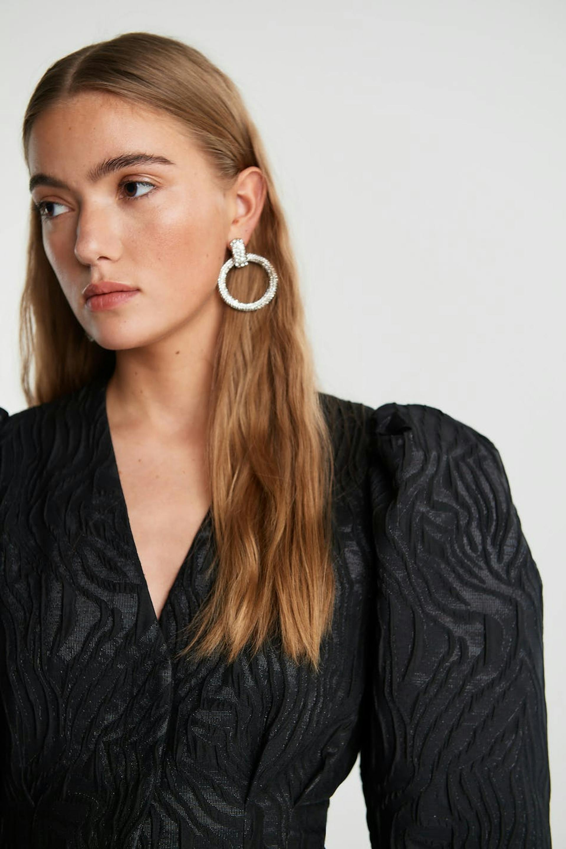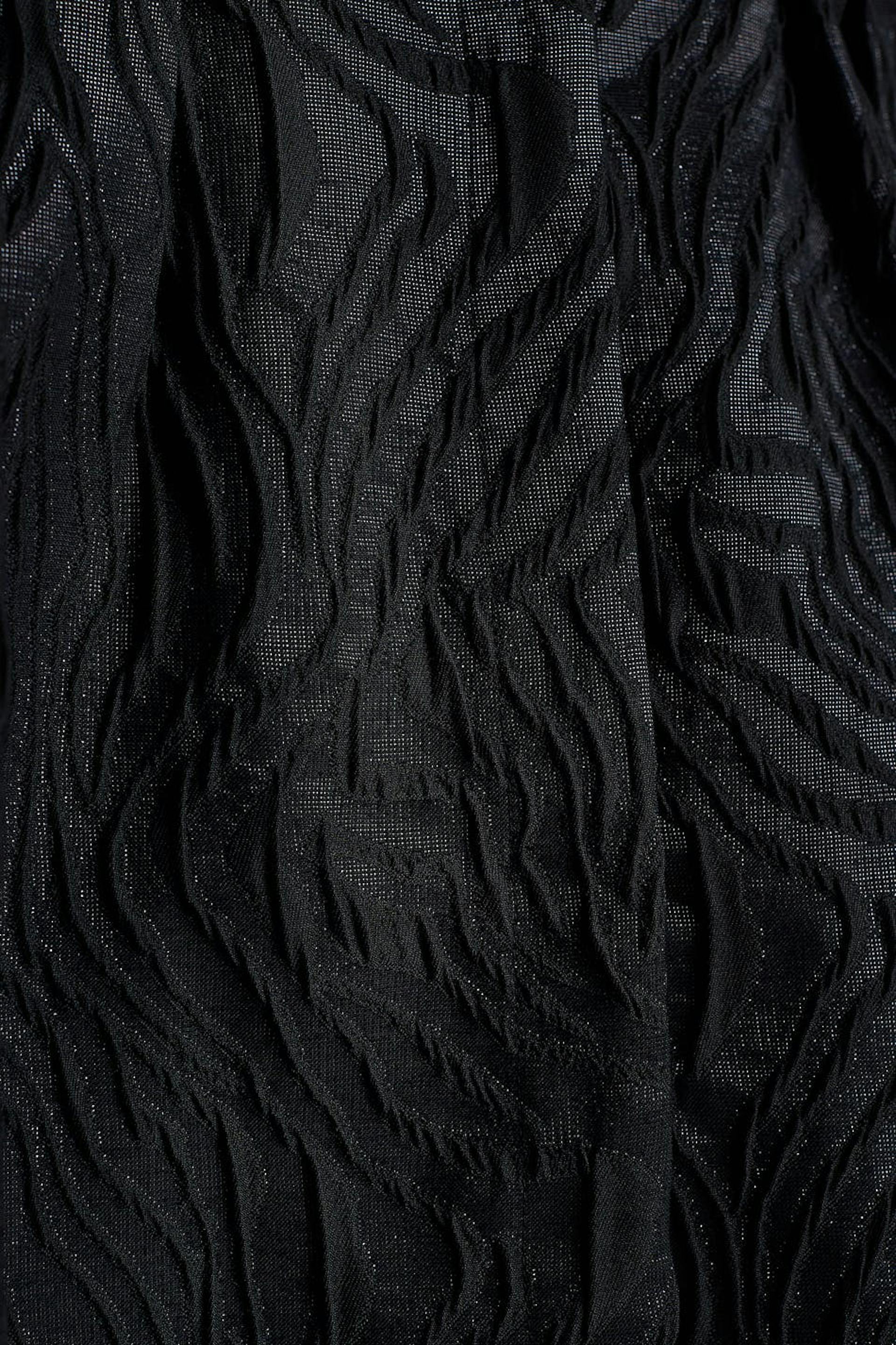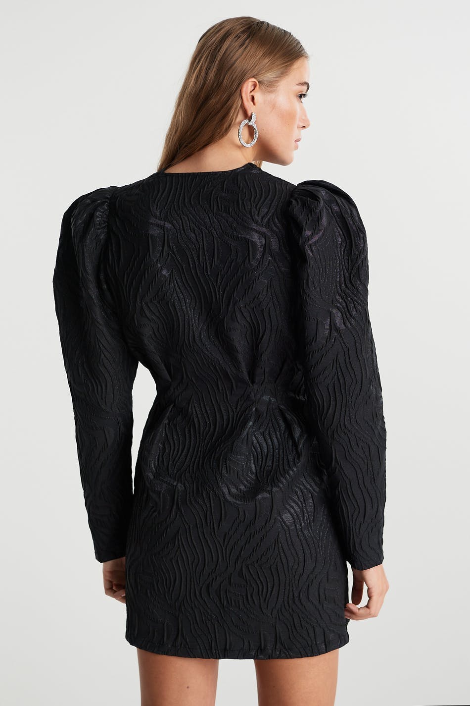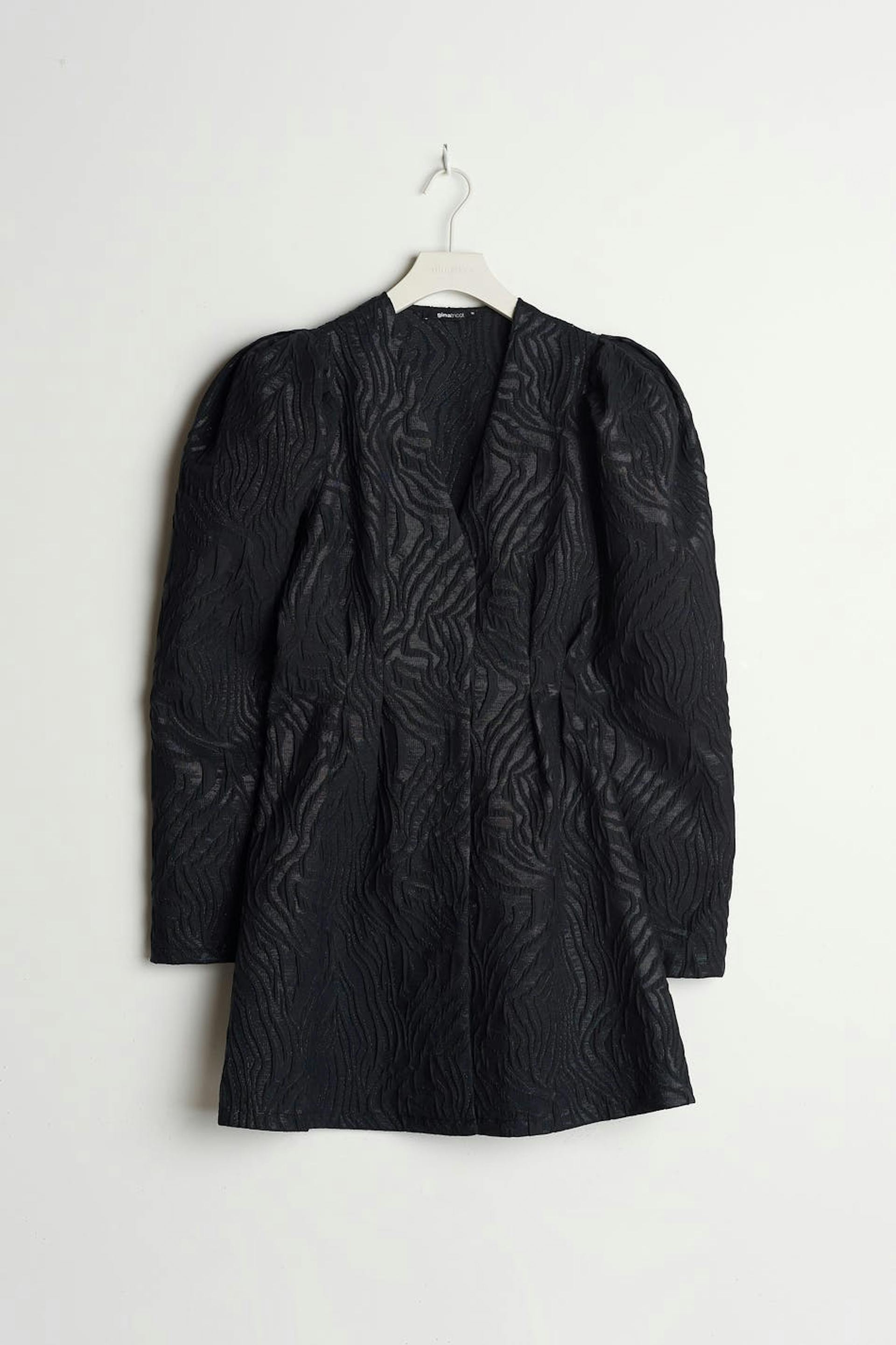 Short dress with long puff sleeves. The dress is perfect for the party and black and has a v neckline. It has sewn pleats at the waist and a treaded material.