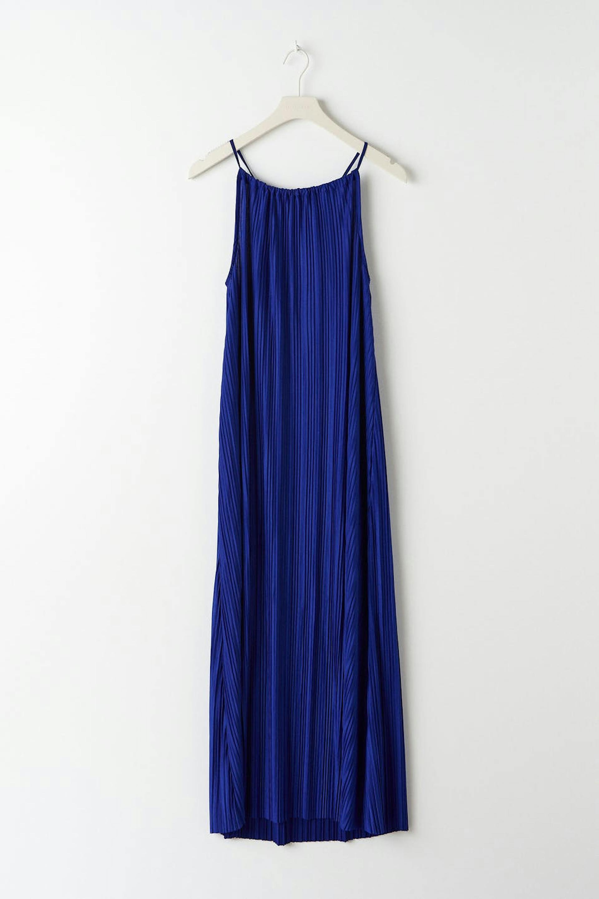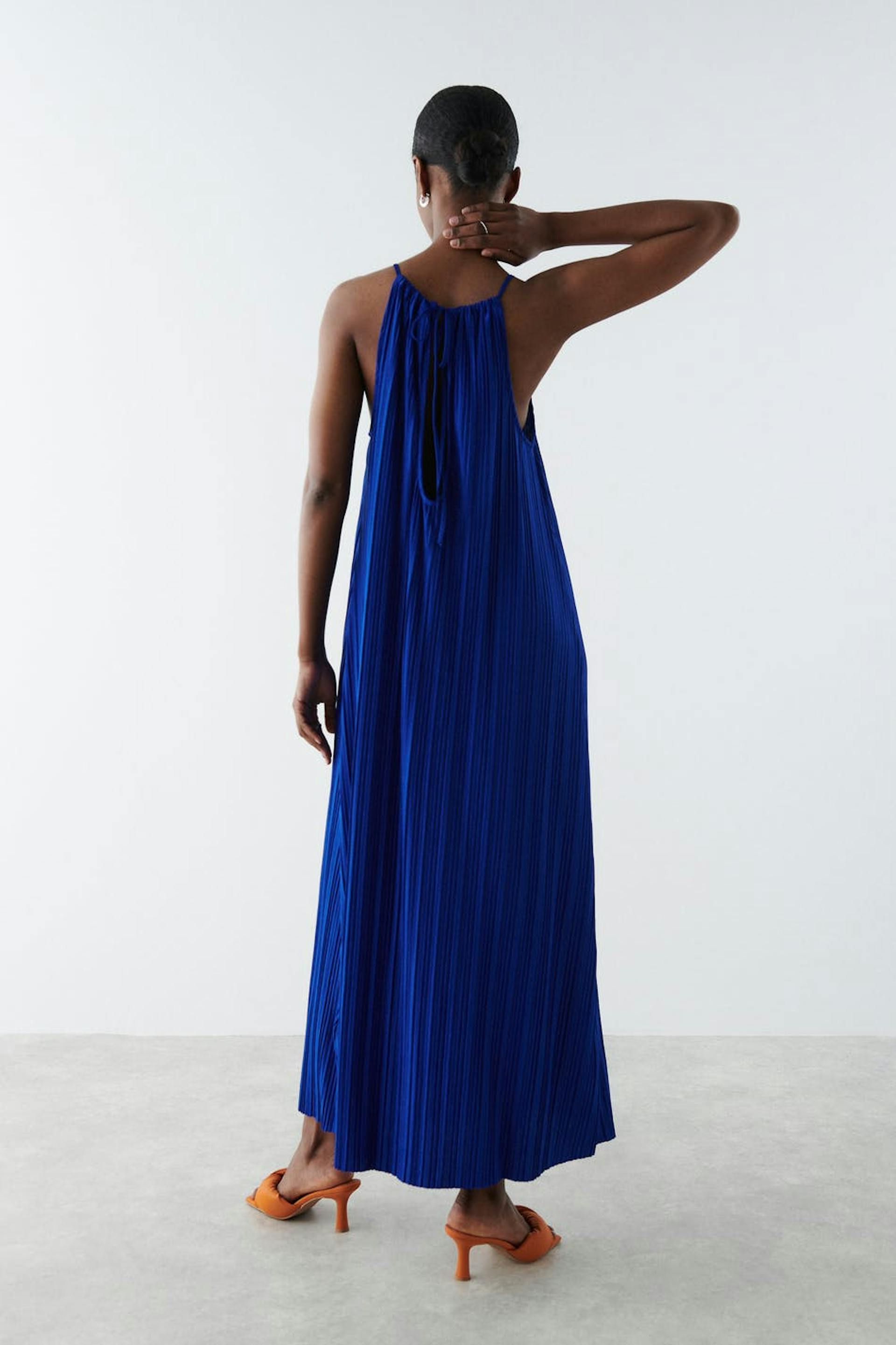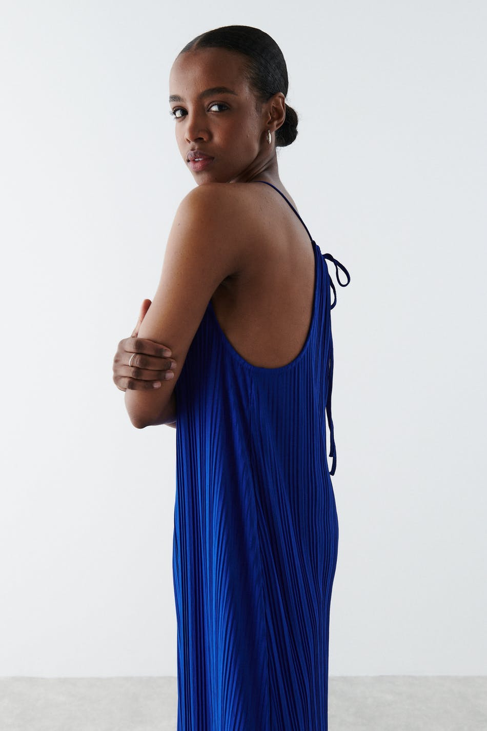 Dress in jersey with a regular fit. The dress is blue and has a pintuck. It has midi length and a halterneck self tie at the back.