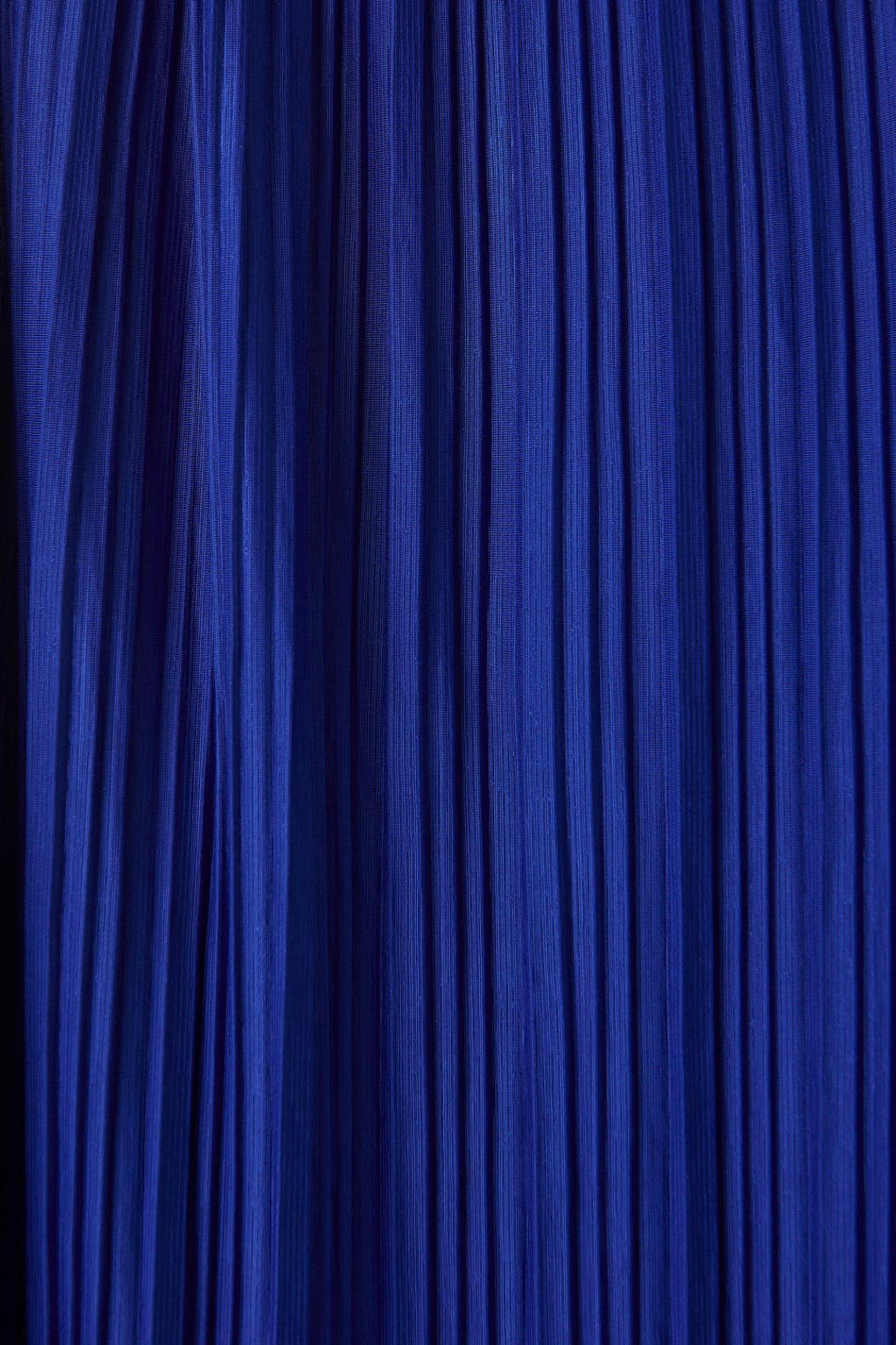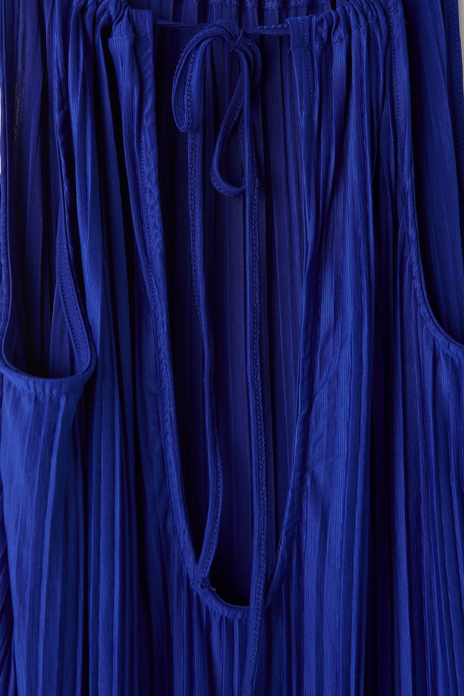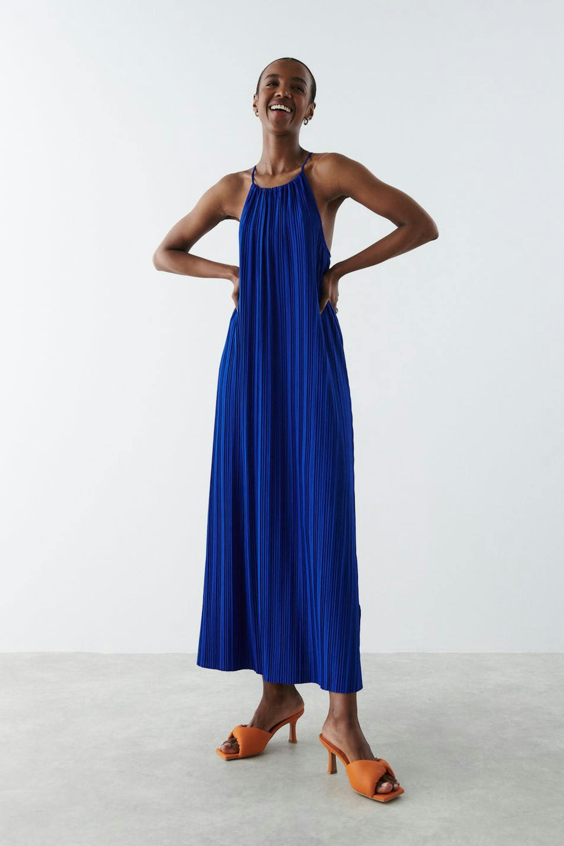 Dress in jersey with a regular fit. The dress is blue and has a pintuck. It has midi length and a halterneck self tie at the back.