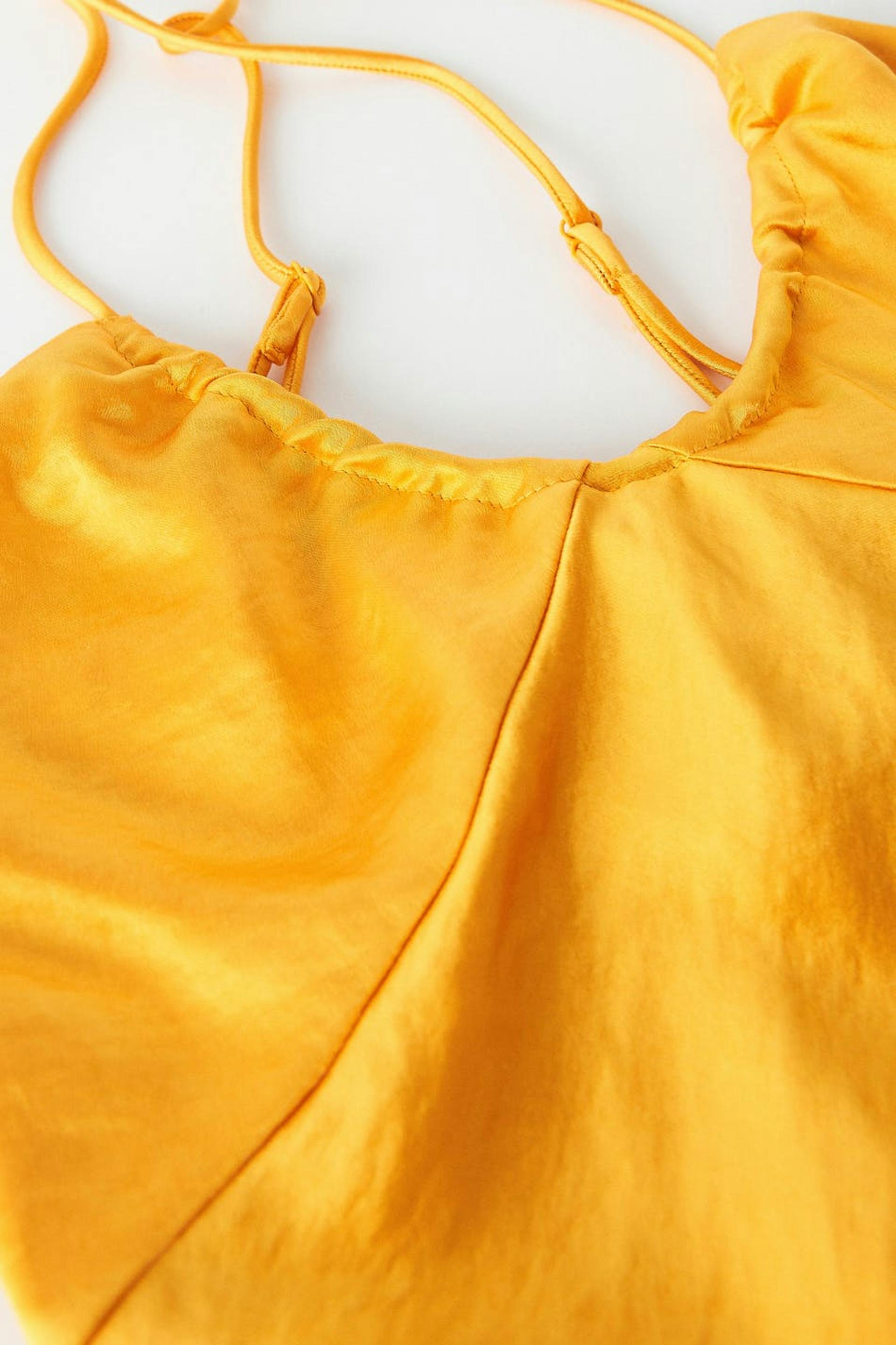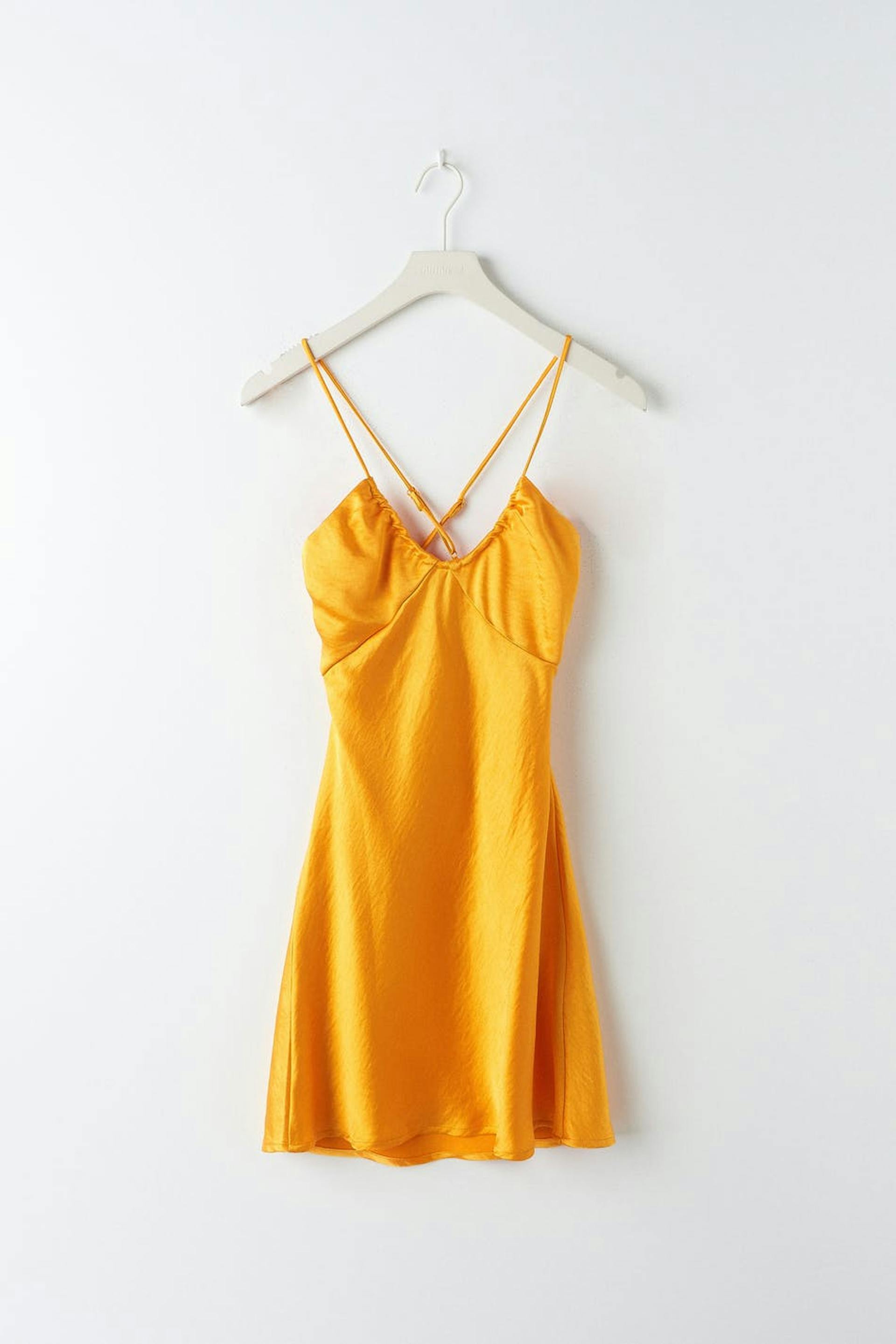 Mini dress with thin, adjustable shoulder straps crossing at the back. The dress is perfect for the party and yellow and has a seam detail below the bust. It has a deep u-neck and a cut out detail in the back with self-tie.