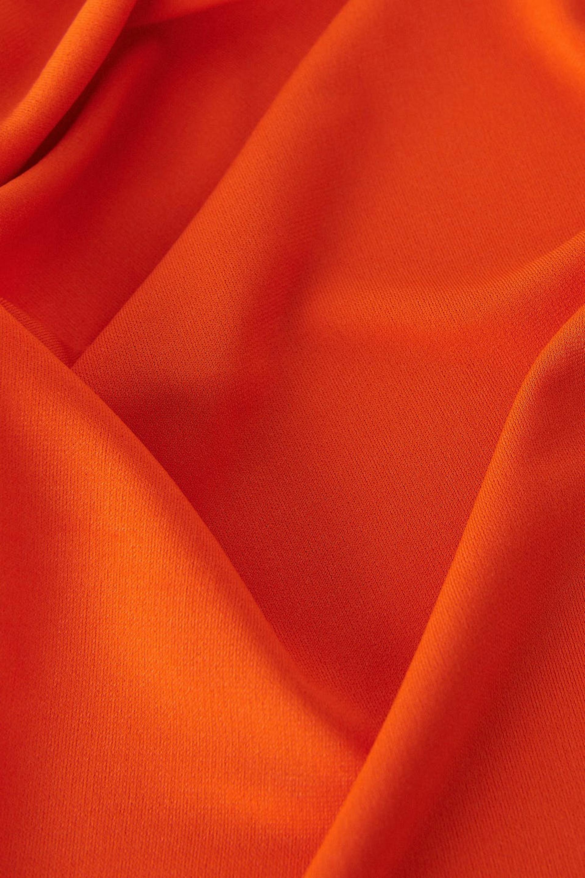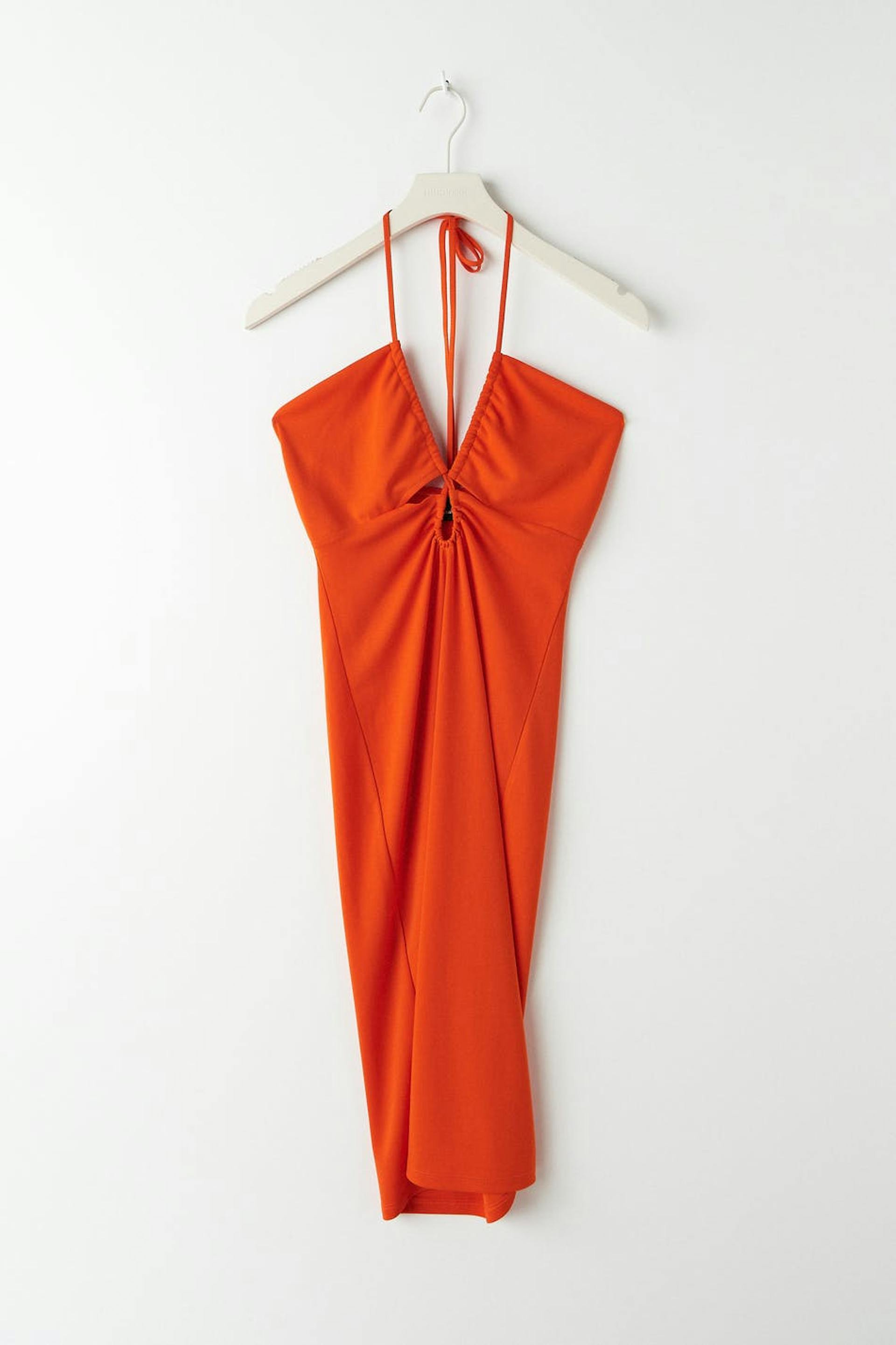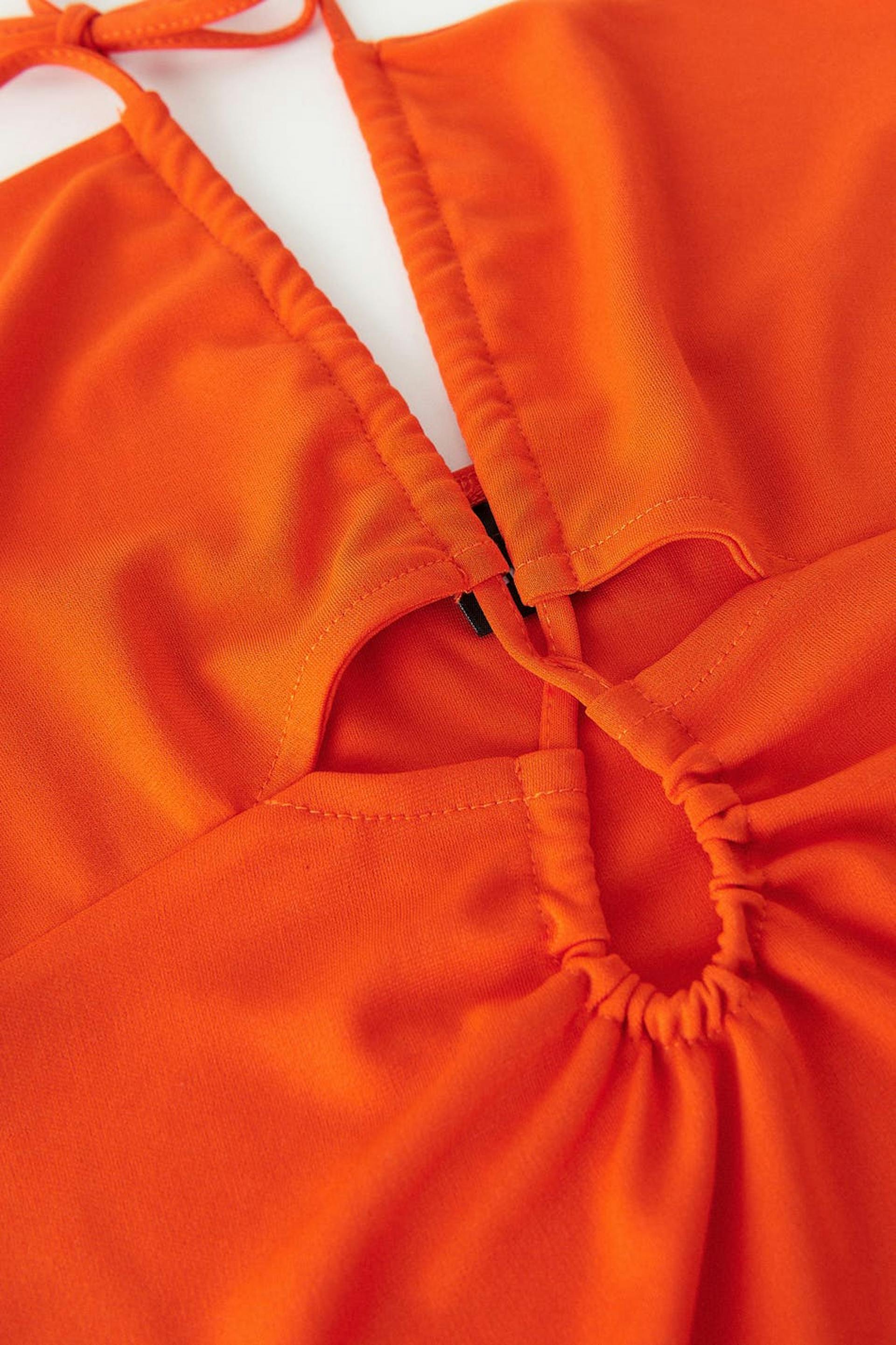 Halterneck dress with open back. The dress is orange and has a fitted fit. It has thin halterneck straps, a material in recycled polyester and a v-neck cut with gathered effect and cut-out details.