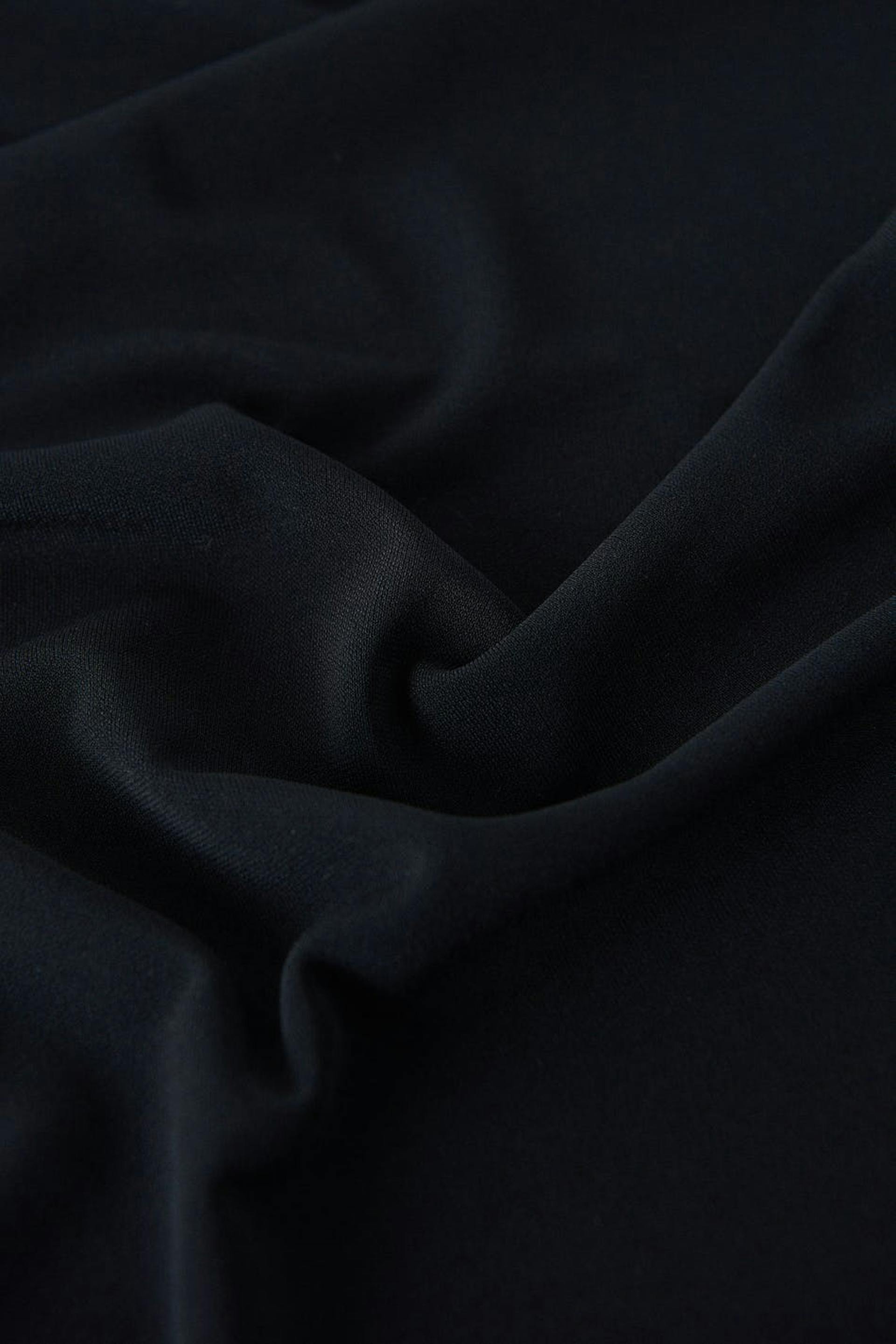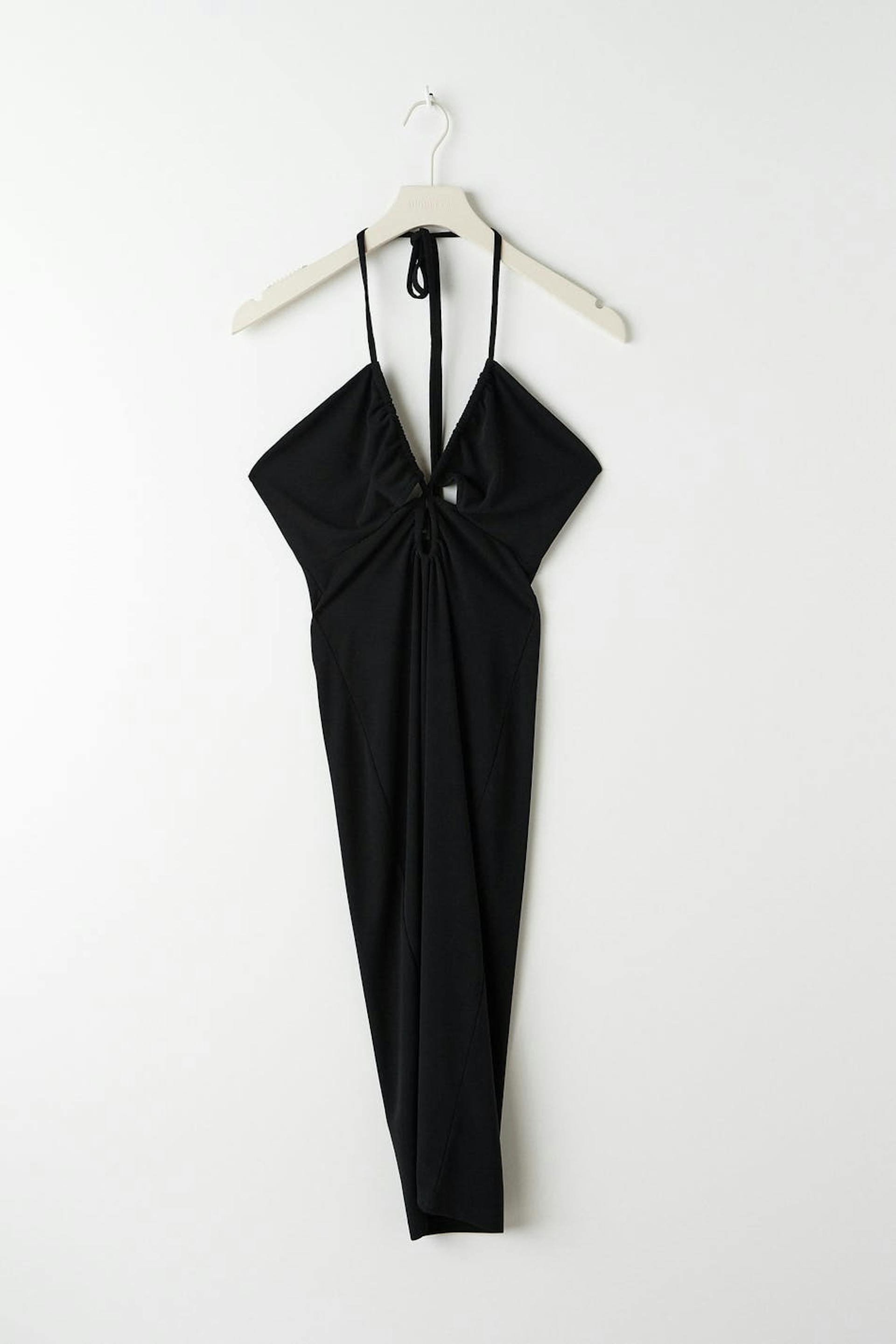 Halterneck dress with open back. The dress is black and has a fitted fit. It has thin halterneck straps, a material in recycled polyester and a v-neck cut with gathered effect and cut-out details.
