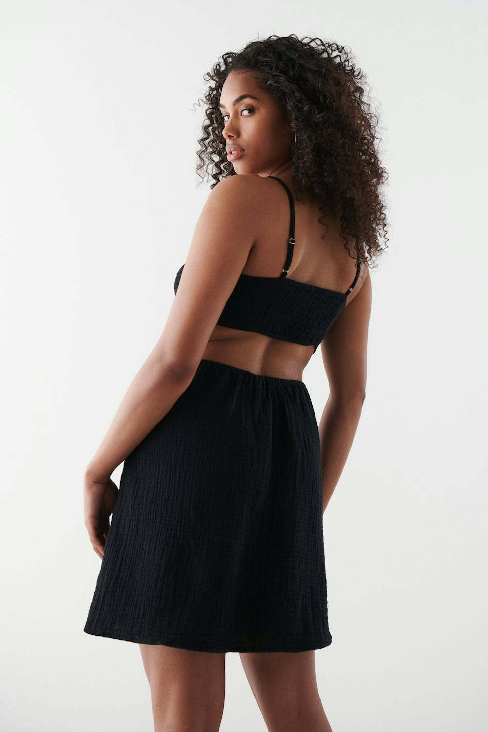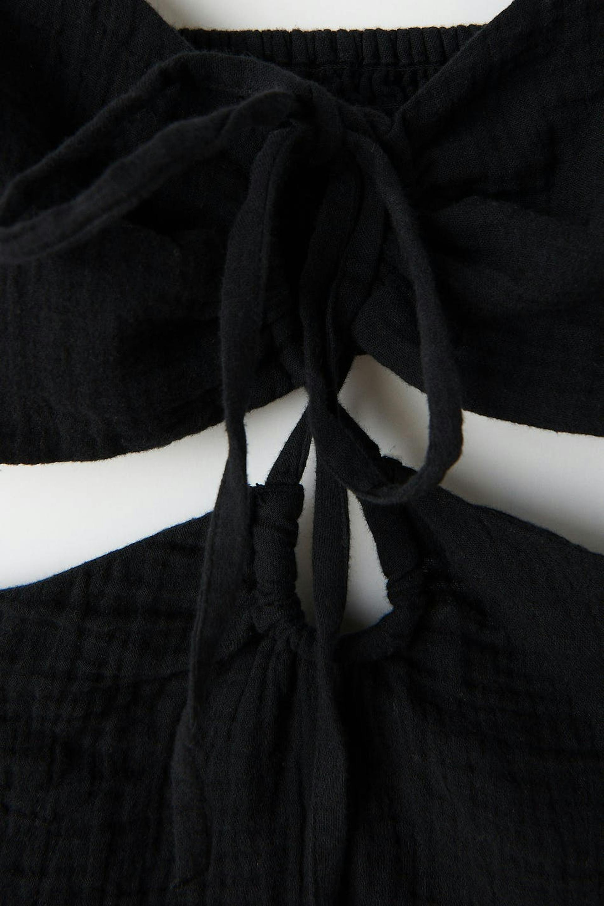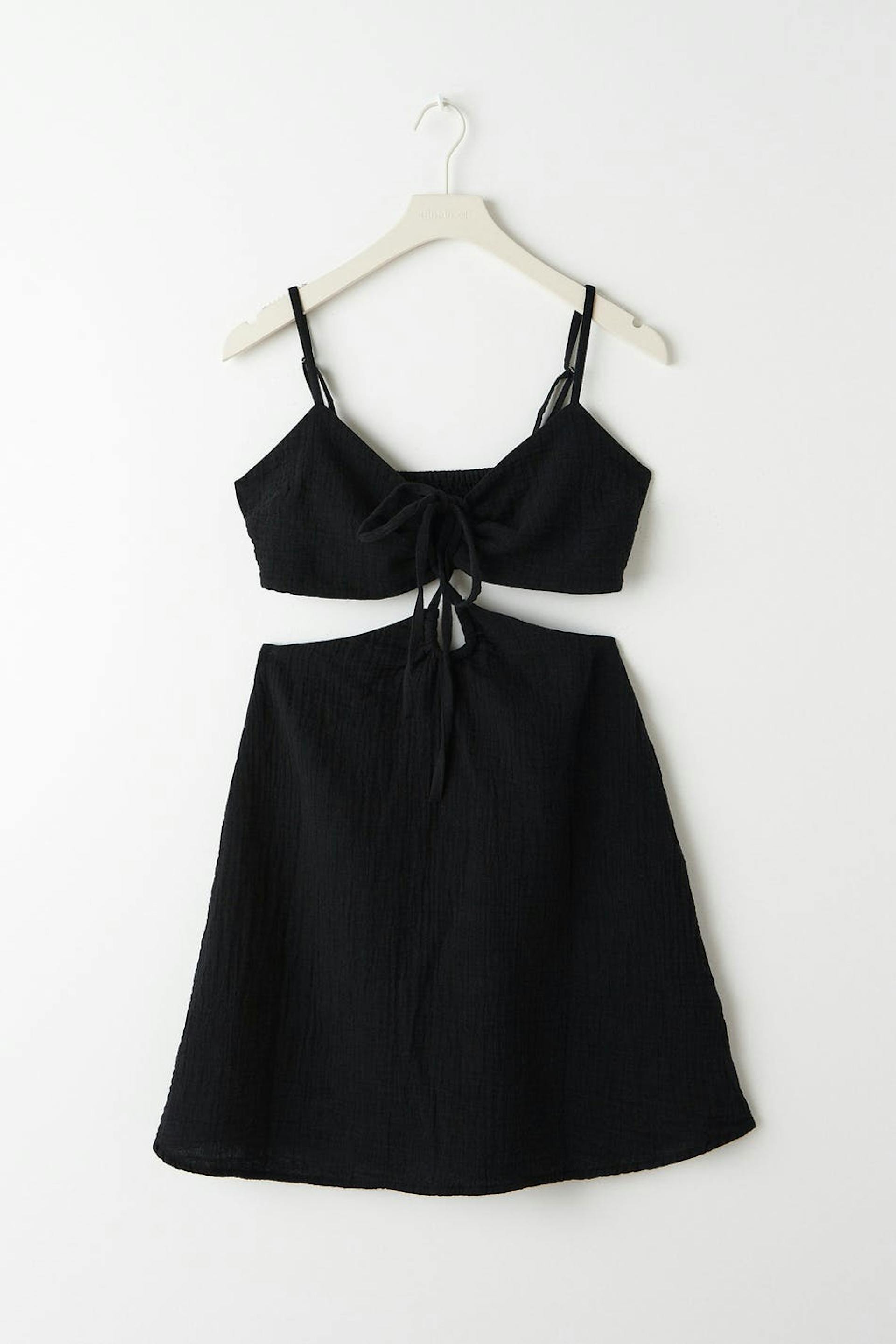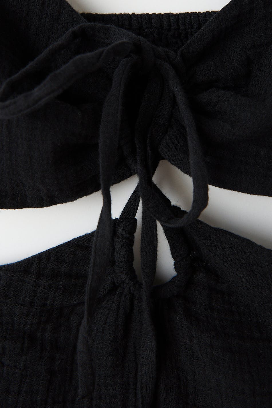 Sleeveless mini dress in soft cotton with cut-out details in the sides. The dress is black and has v-neck cut with knot detail at the front. It has a structured material, adjustable spaghetti straps and smocking in the back.