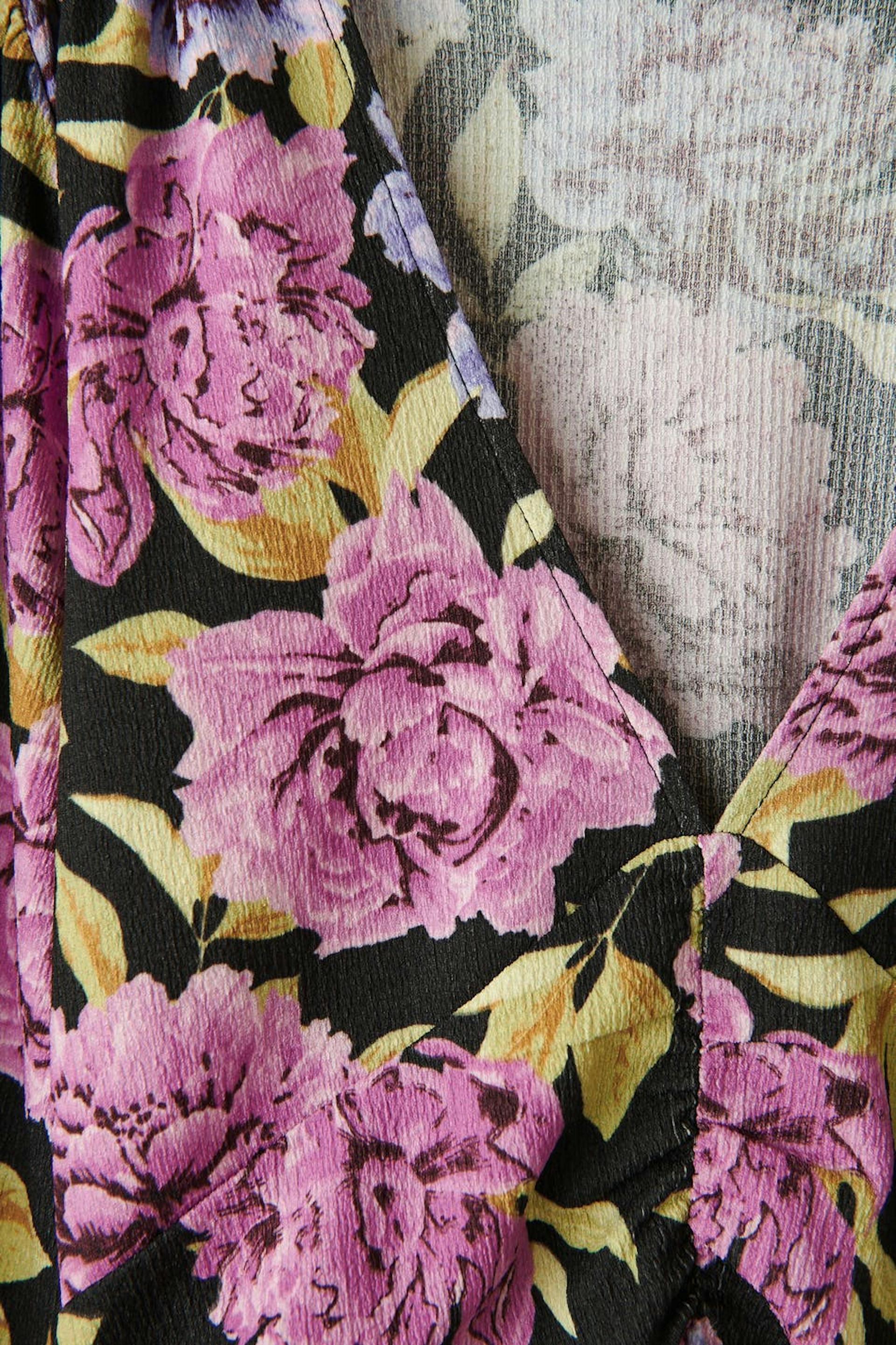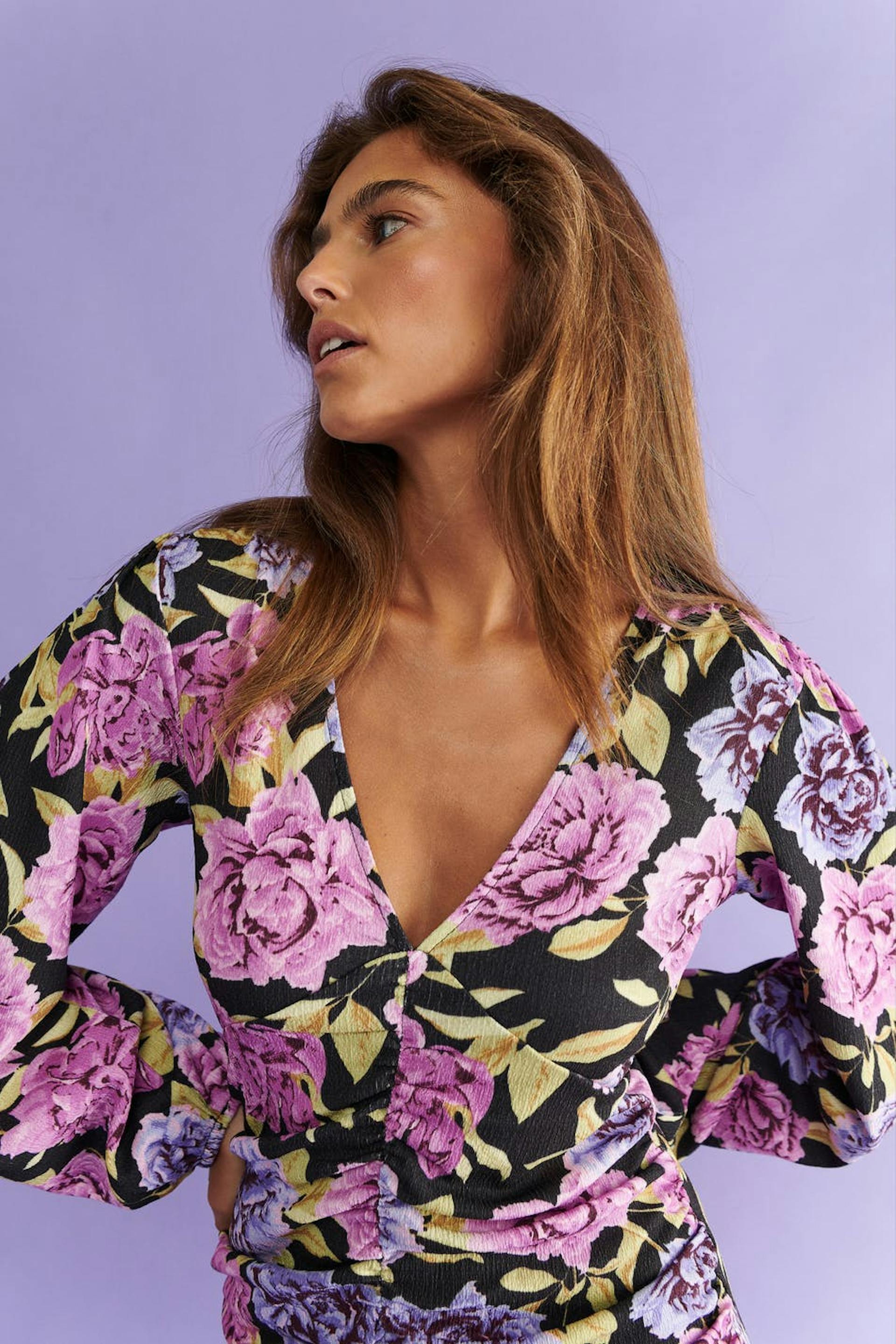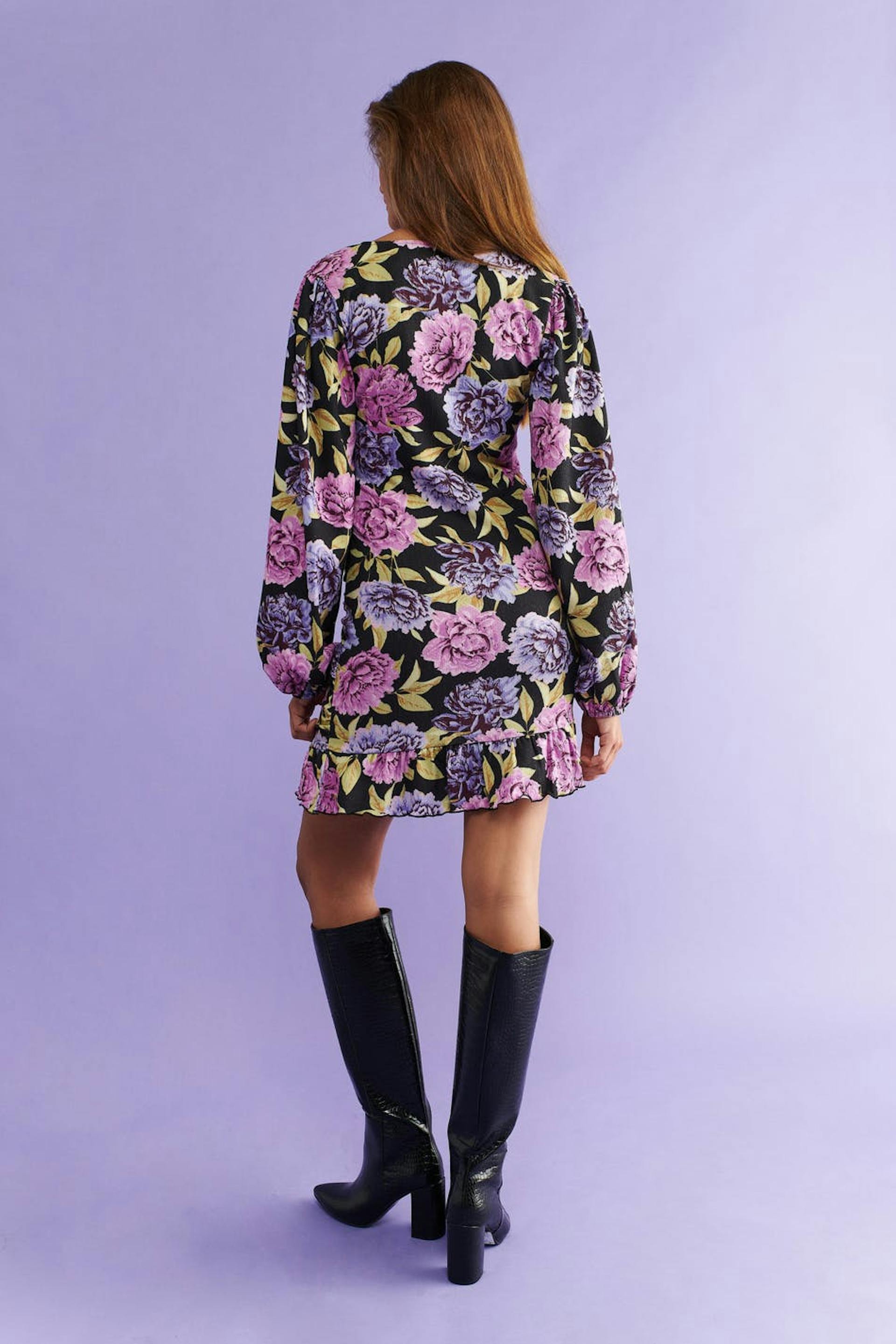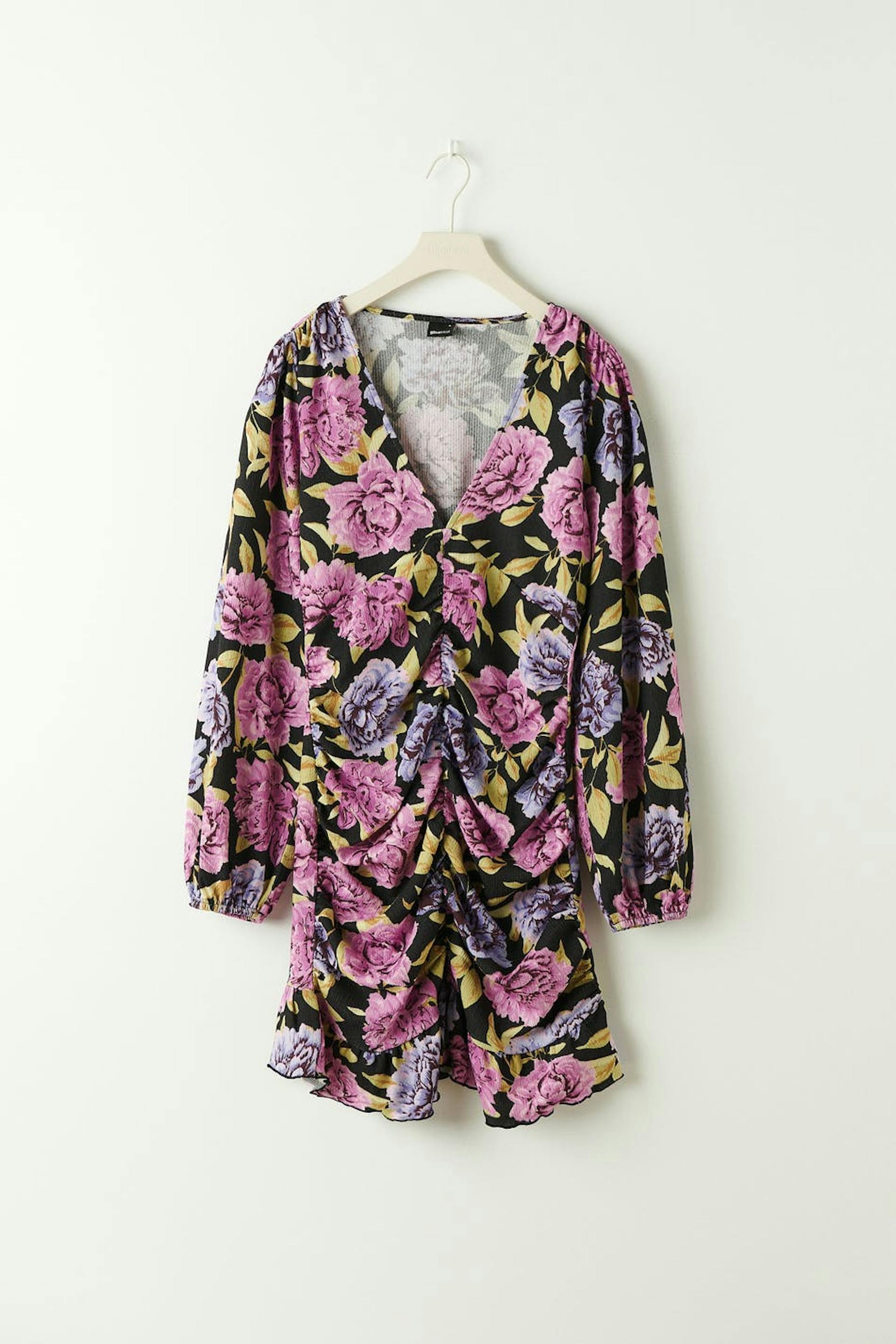 Floral mini dress in jersey with v neckline. The dress is purple, black and long-sleeved. It has puff sleeves with elasticized cuffs, fitted fit, ruching at the front and flounces at the bottom.