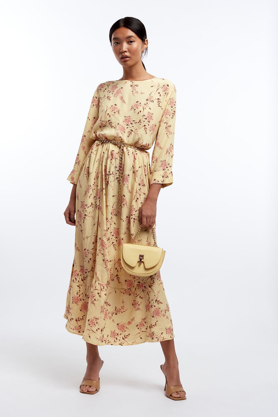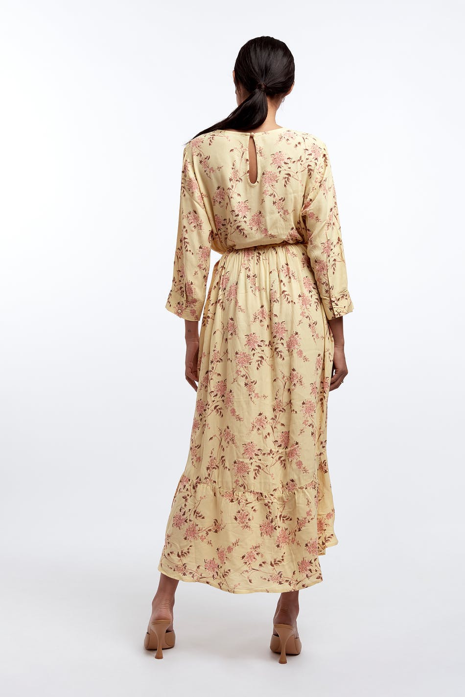 Long dress with buttons at the neck. The dress is yellow and has 3/4 length sleeves with cuff. It has a frill at the hem.