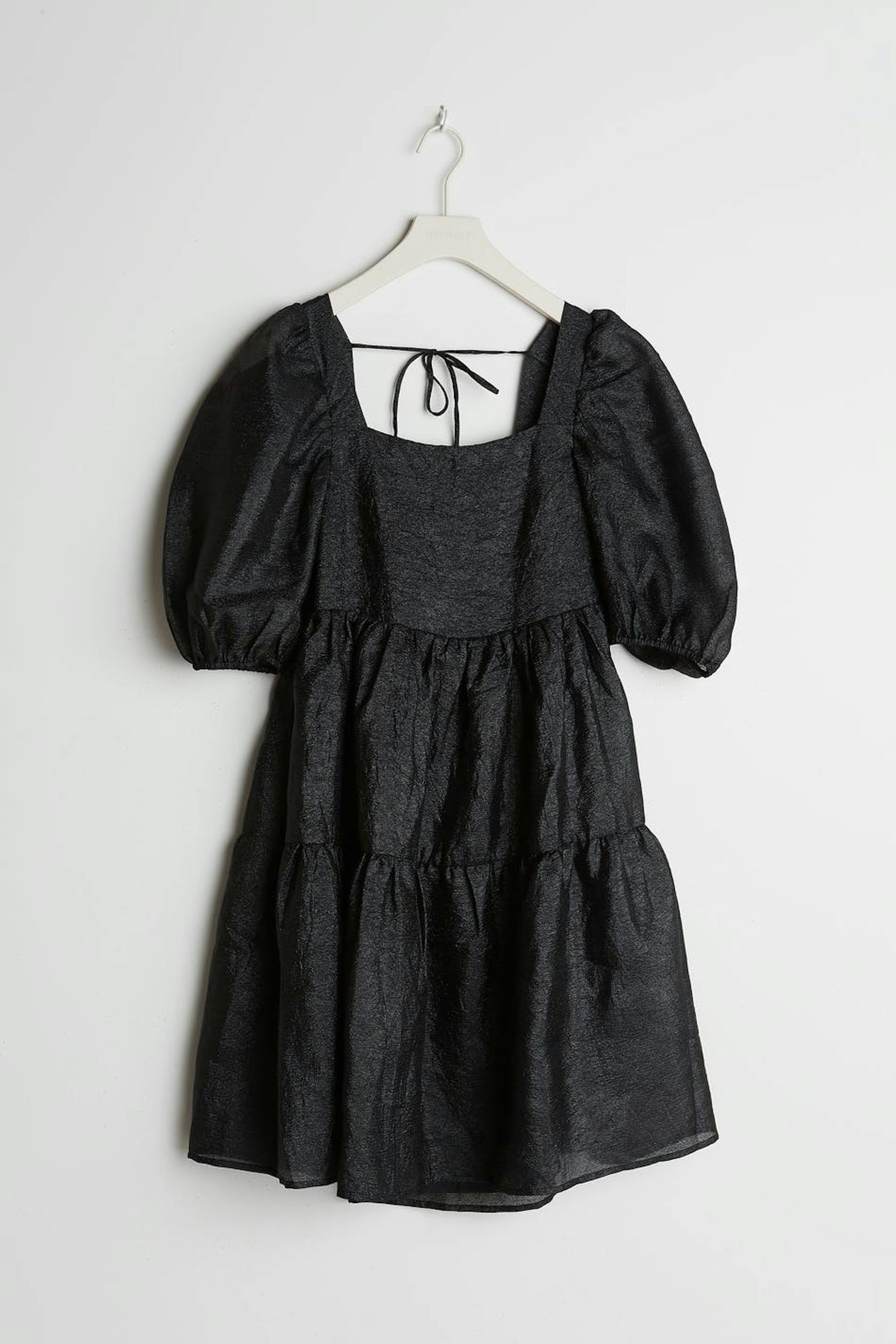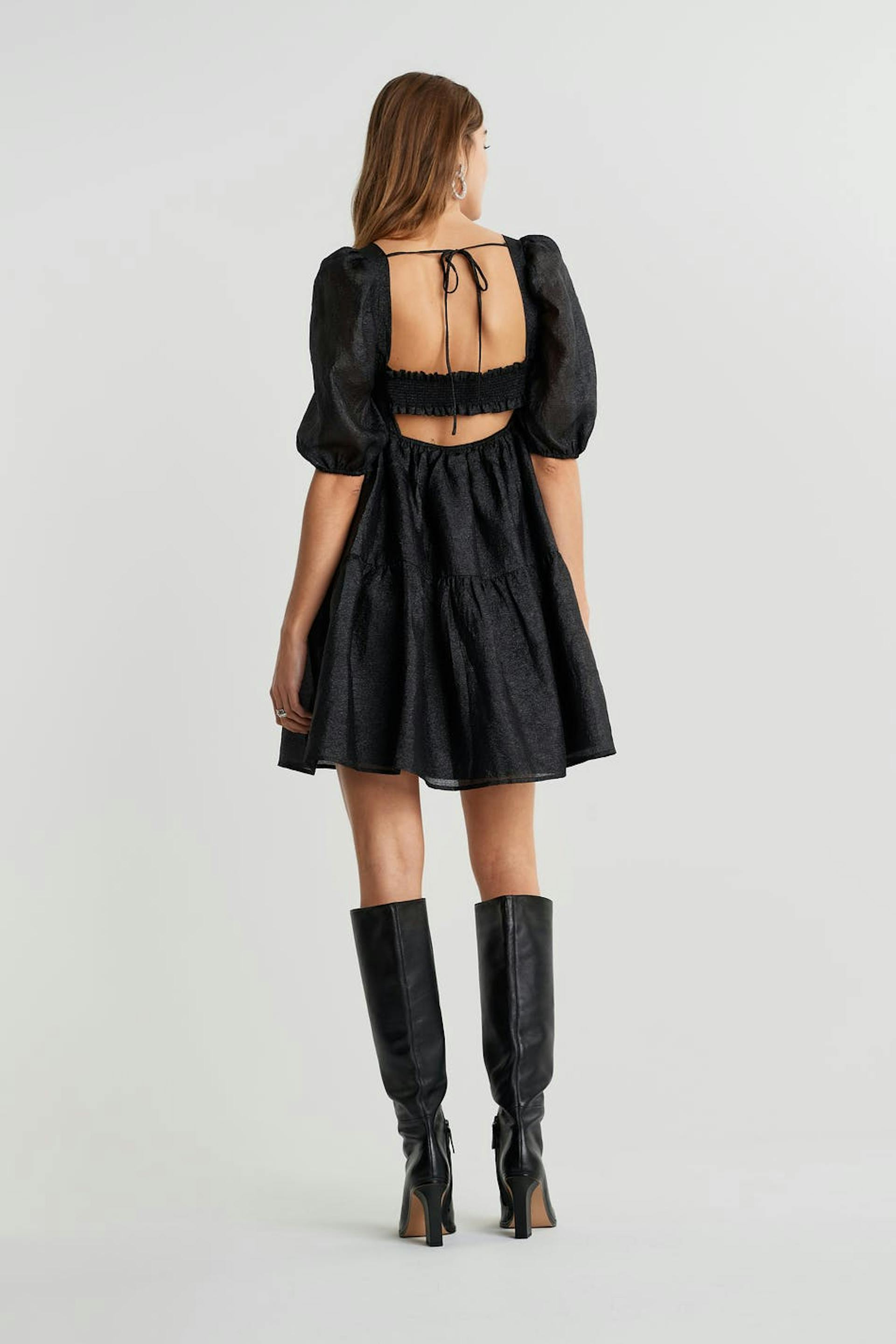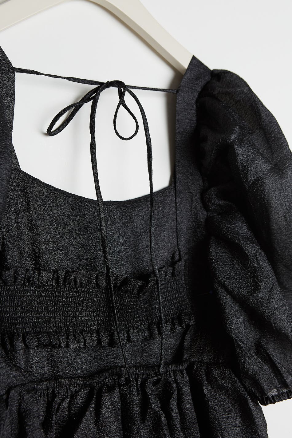 Organza dress with an oversize fit. The dress is black and has a square neckline. It has puff sleeves and an open back design with a tie strap and a smocked detail.