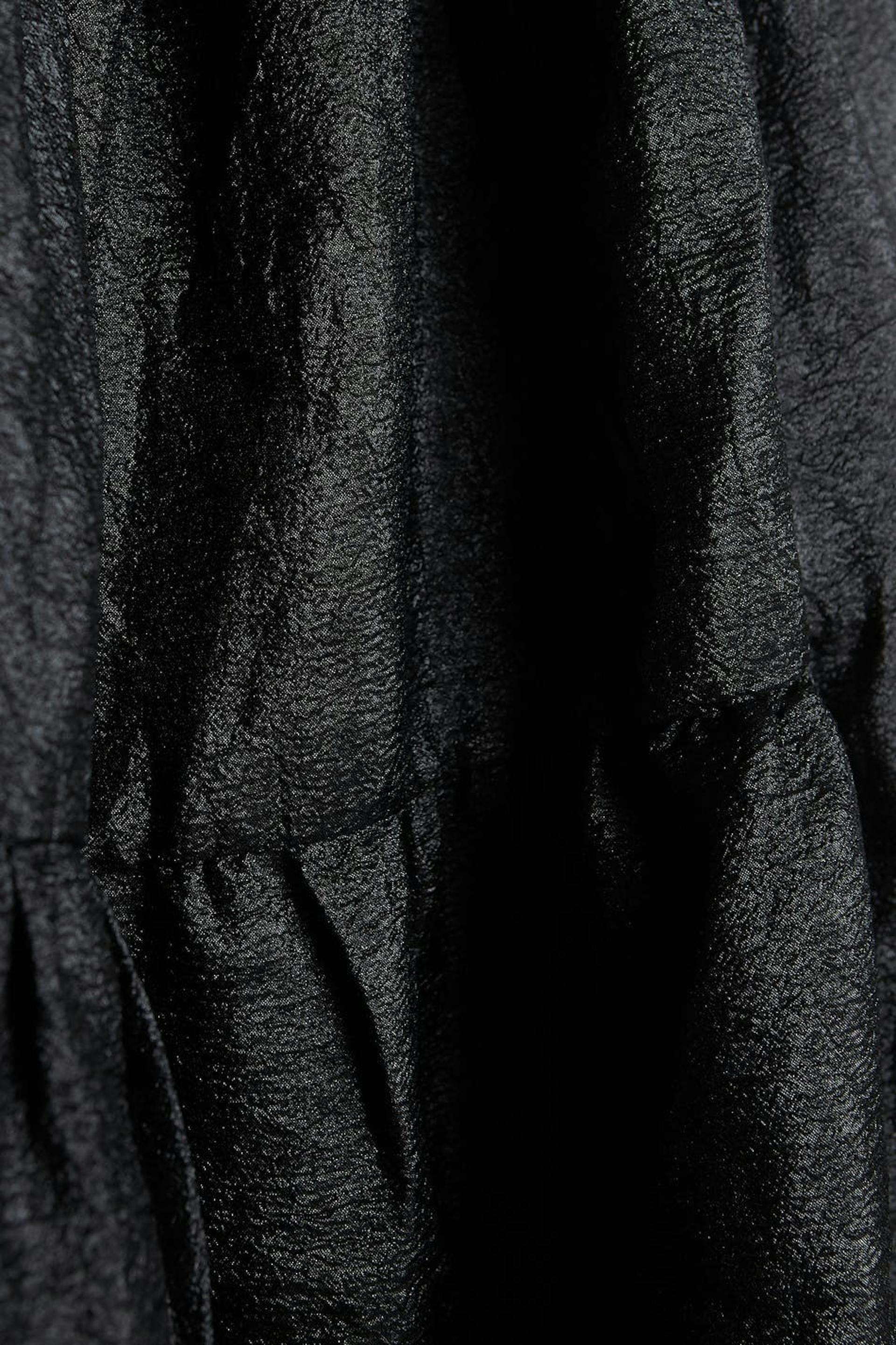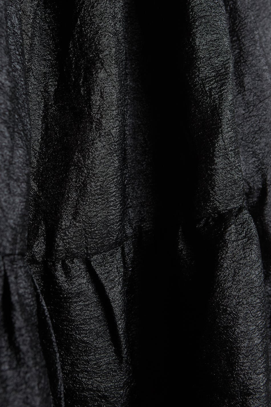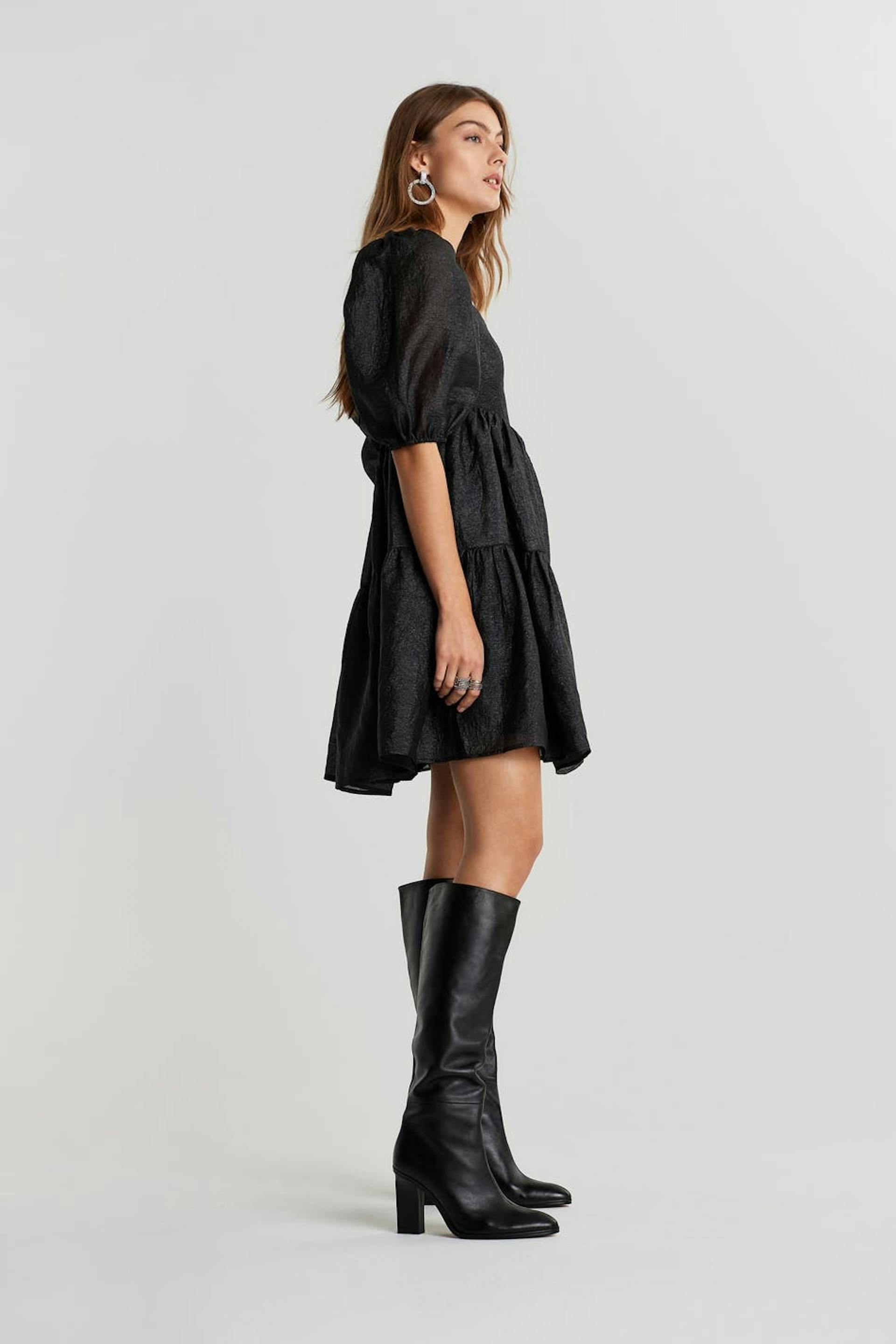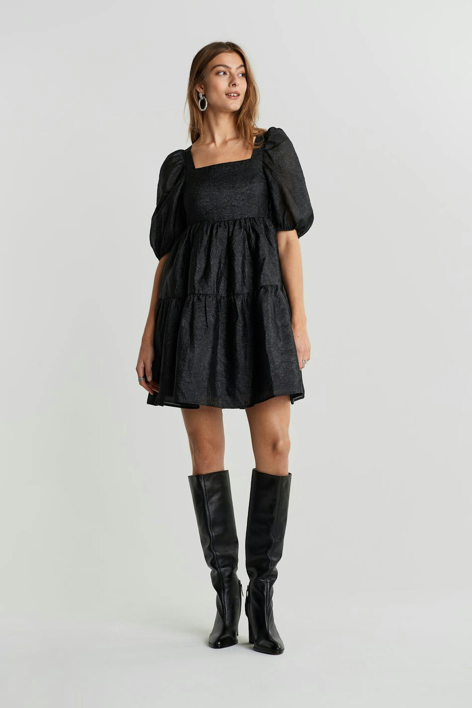 Organza dress with an oversize fit. The dress is black and has a square neckline. It has puff sleeves and an open back design with a tie strap and a smocked detail.