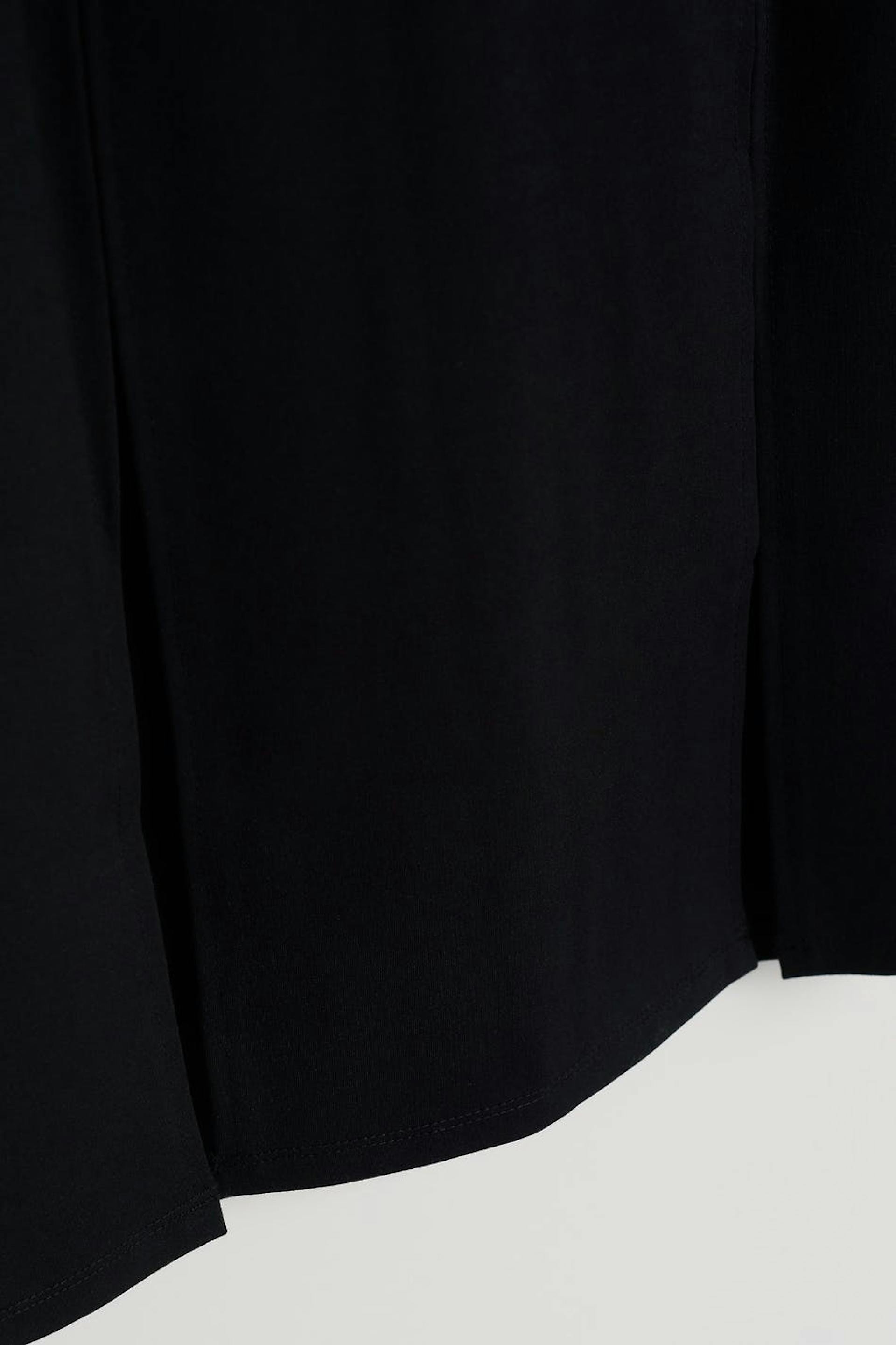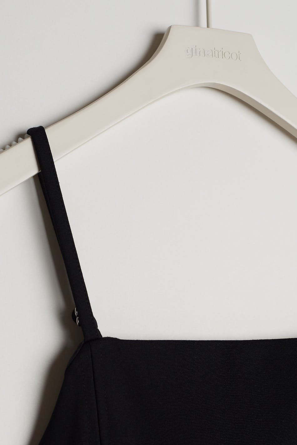 Dress with slits at the front. The dress is black and has a square neckline. It has thin, adjustable shoulder straps, stretch, a fitted fit and an open back design with a clasp.