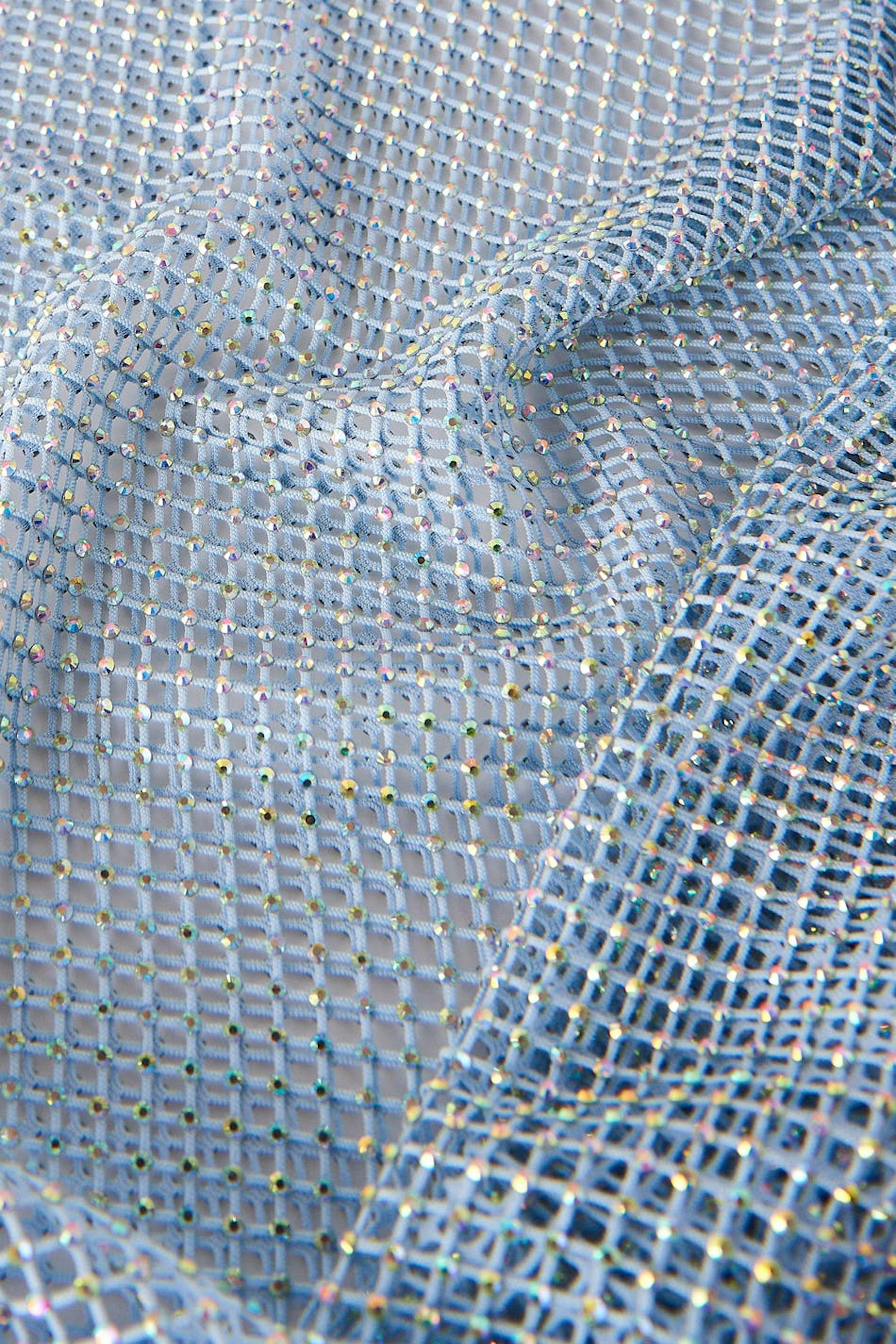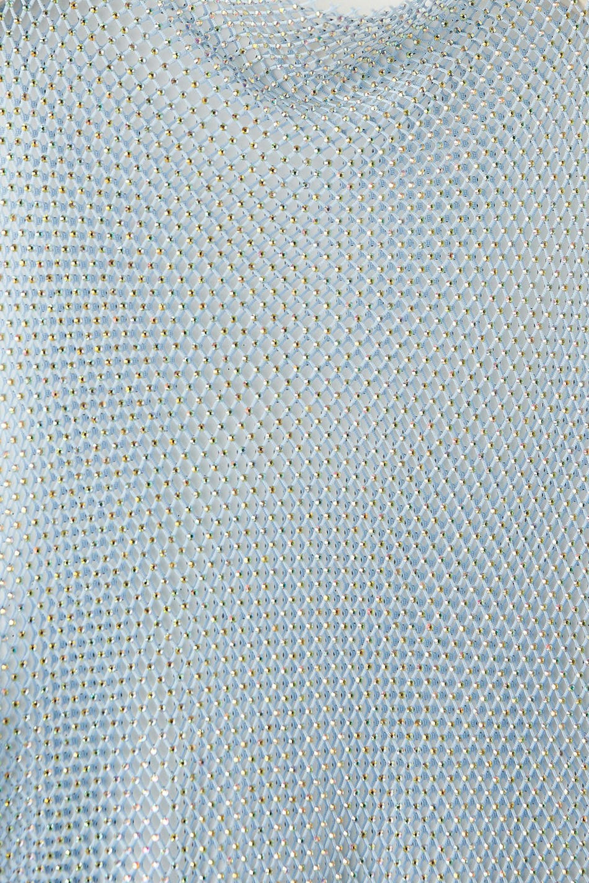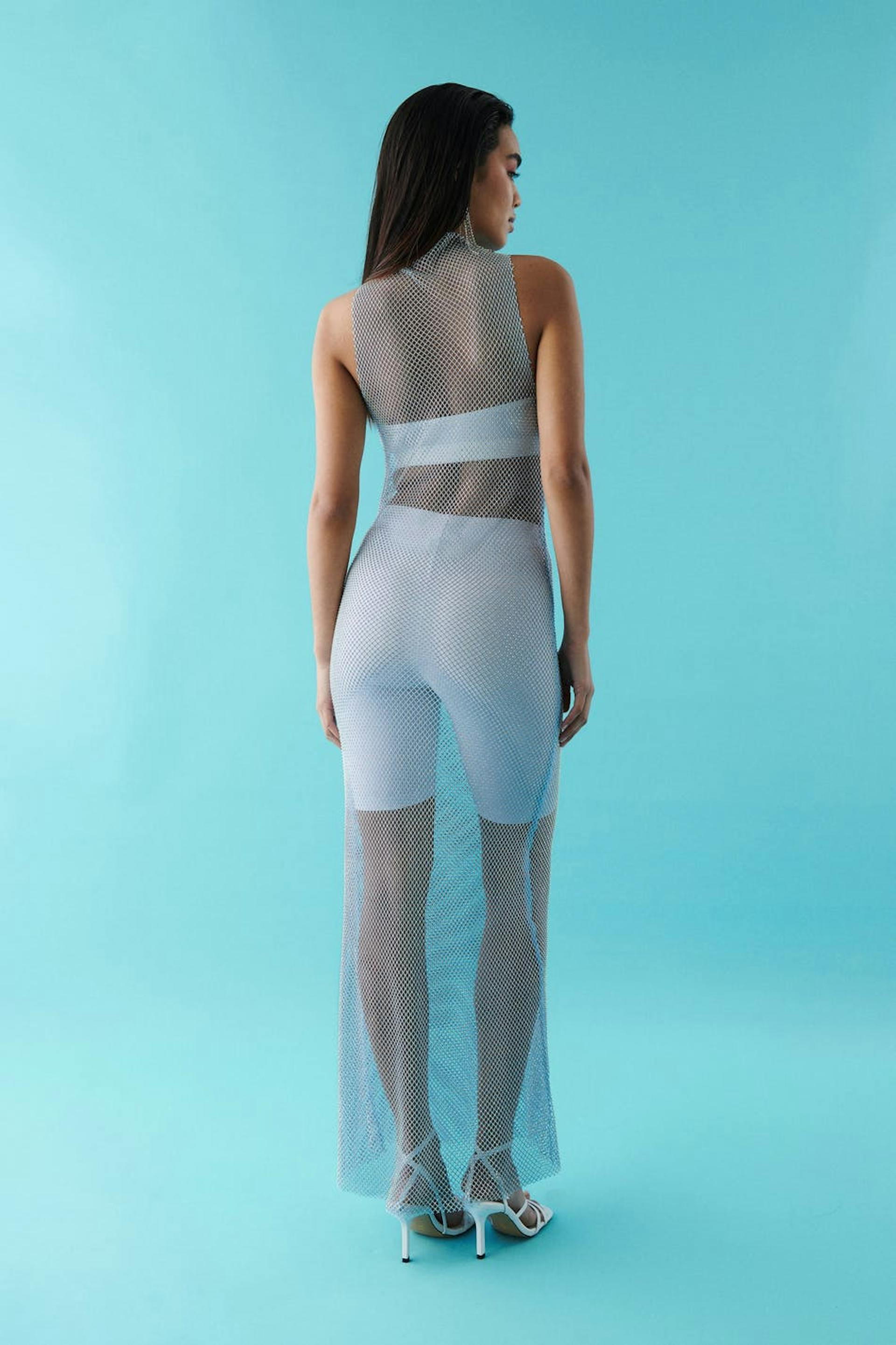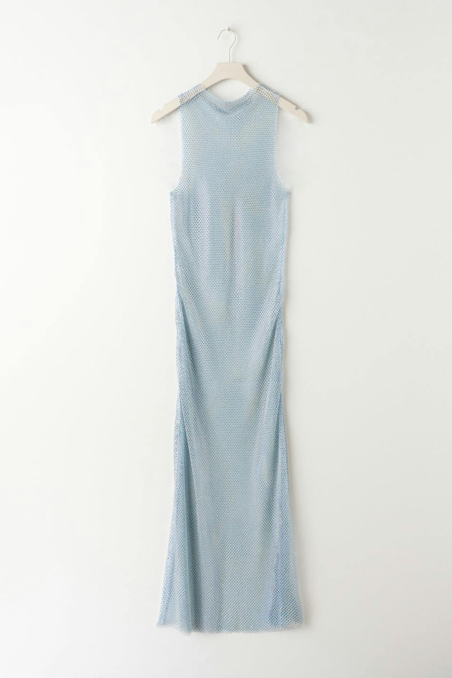 Exclusive maxi dress with rhinestone embellishment. The dress is blue, seethrough and sleeveless. It has high neckline.