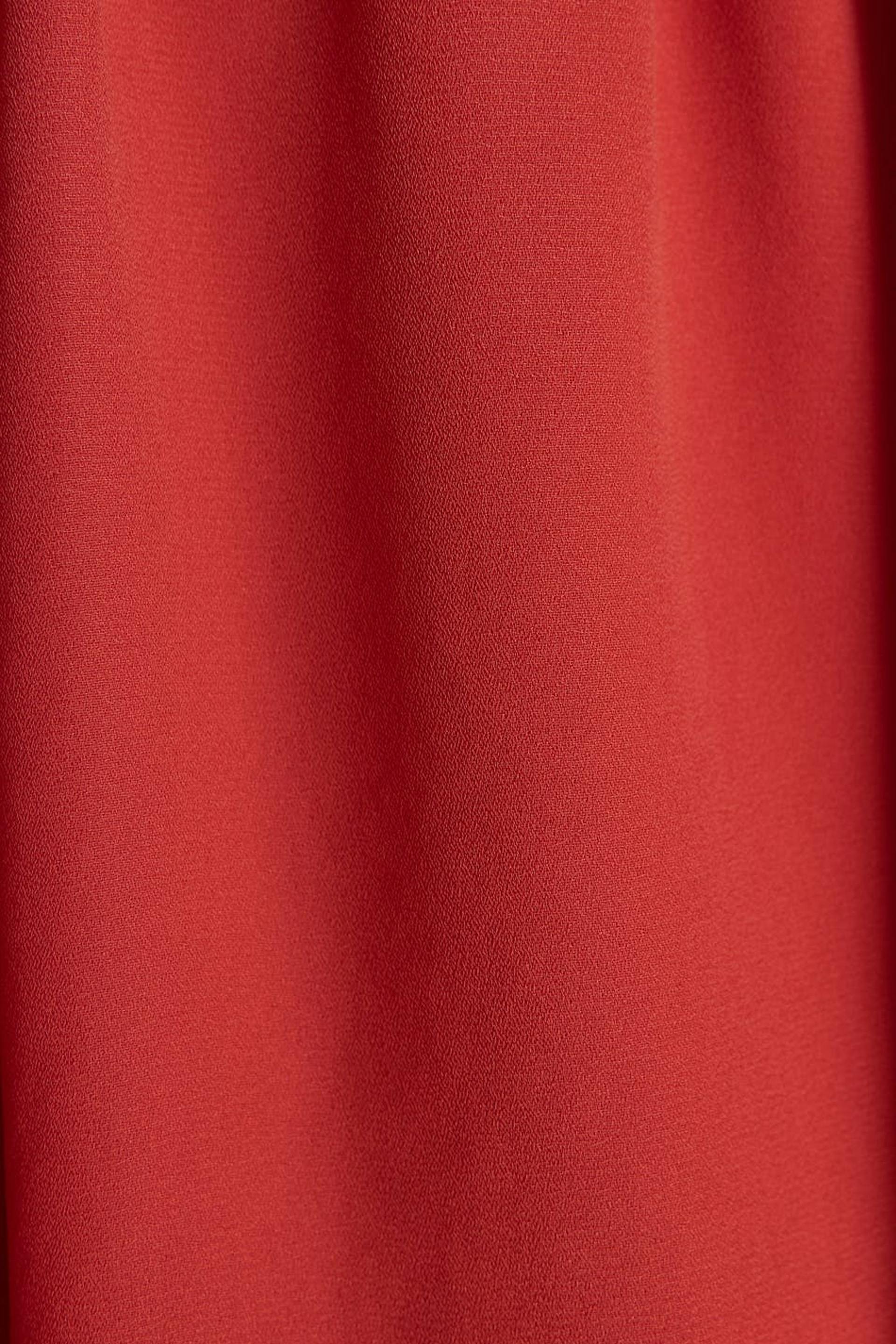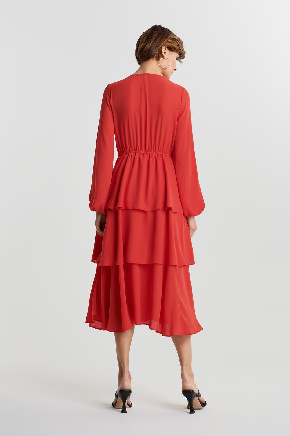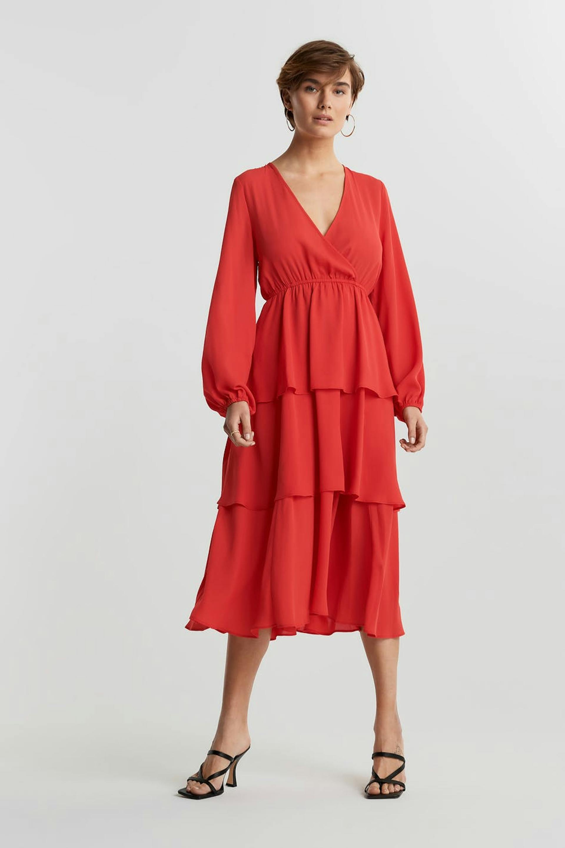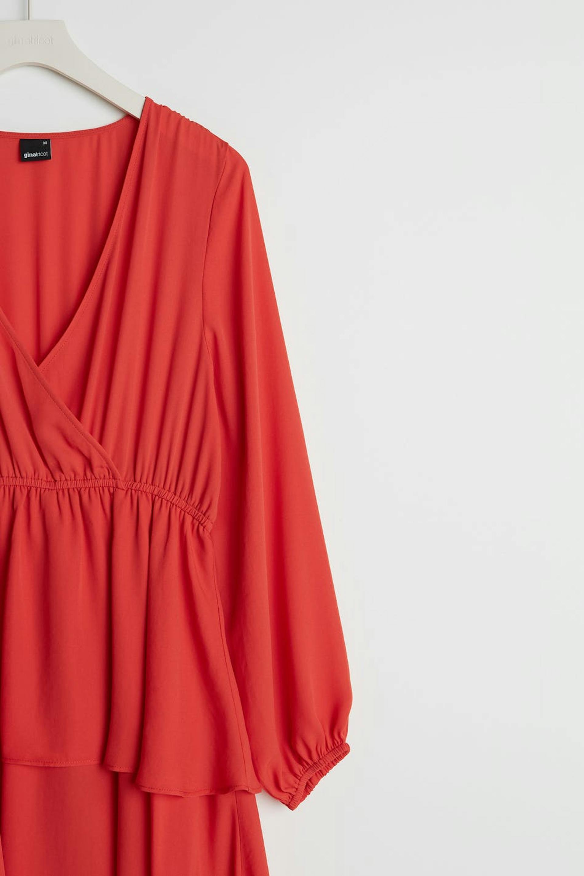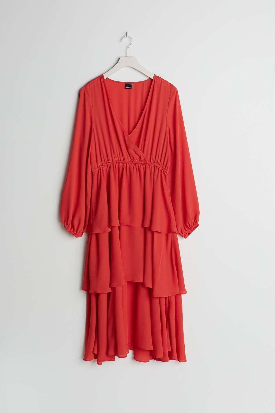 Dress with frills on the skirt. The dress is red and has midi length. It has an overlap design, long, spacious sleeves and an elastic band at the waist and on the sleeve ends.
