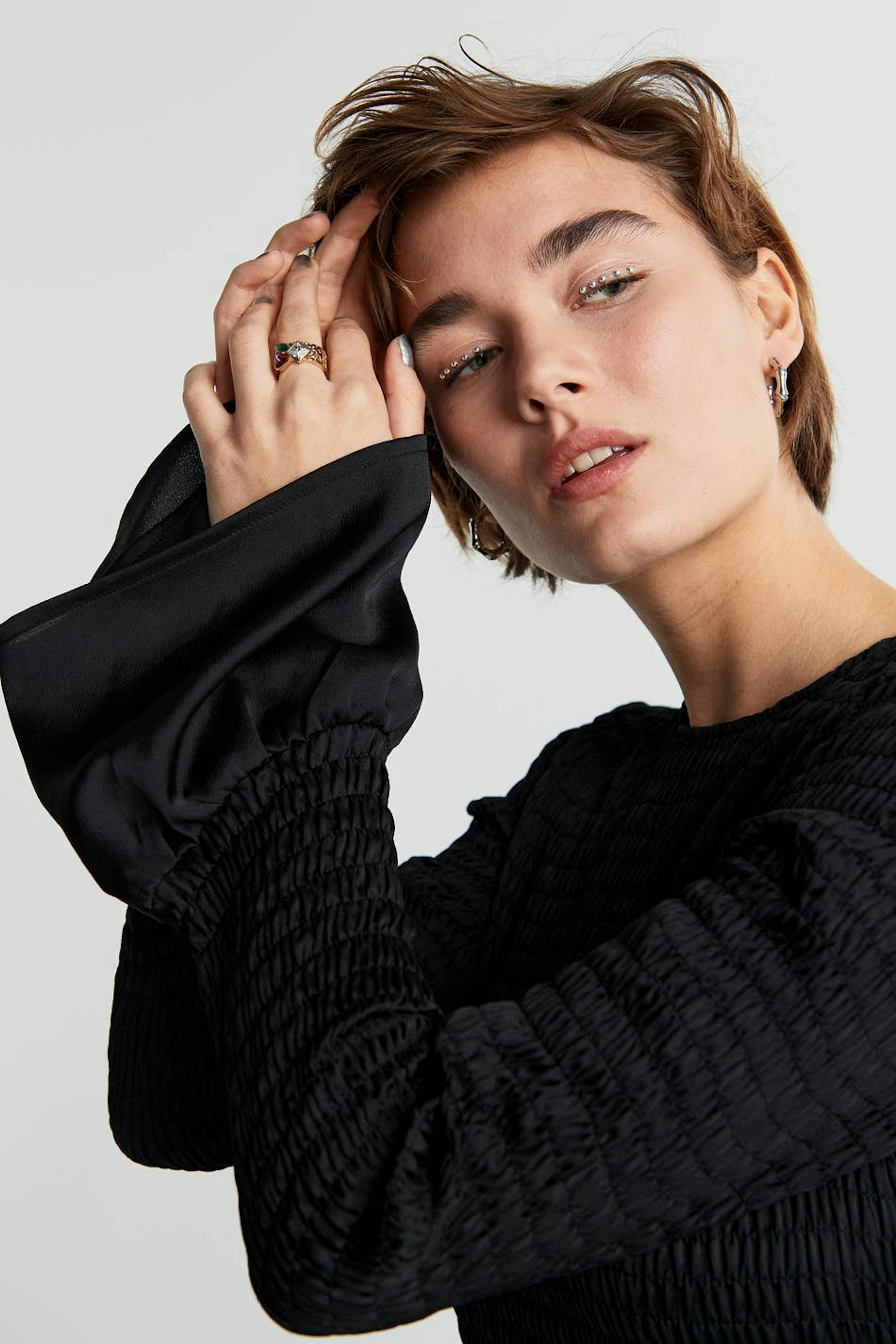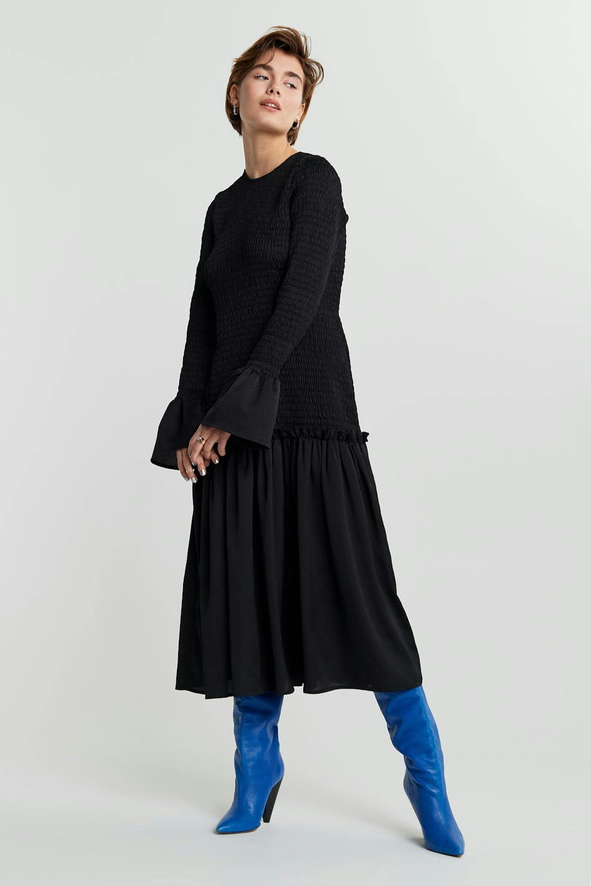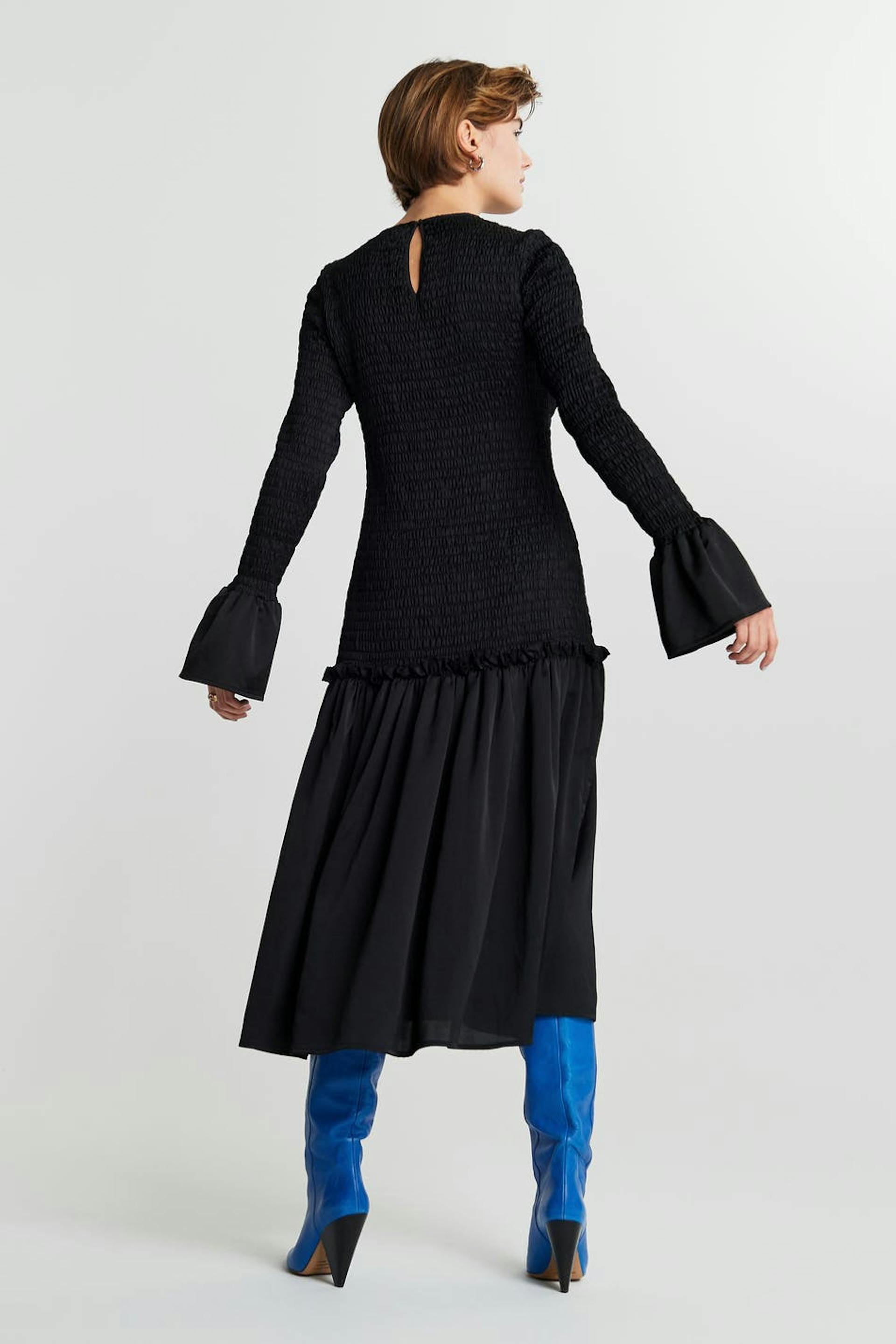 Dress with a fitted fit. The dress is perfect for the party and black and has a frill on the skirt and on the sleeve ends. It has a smocking.
