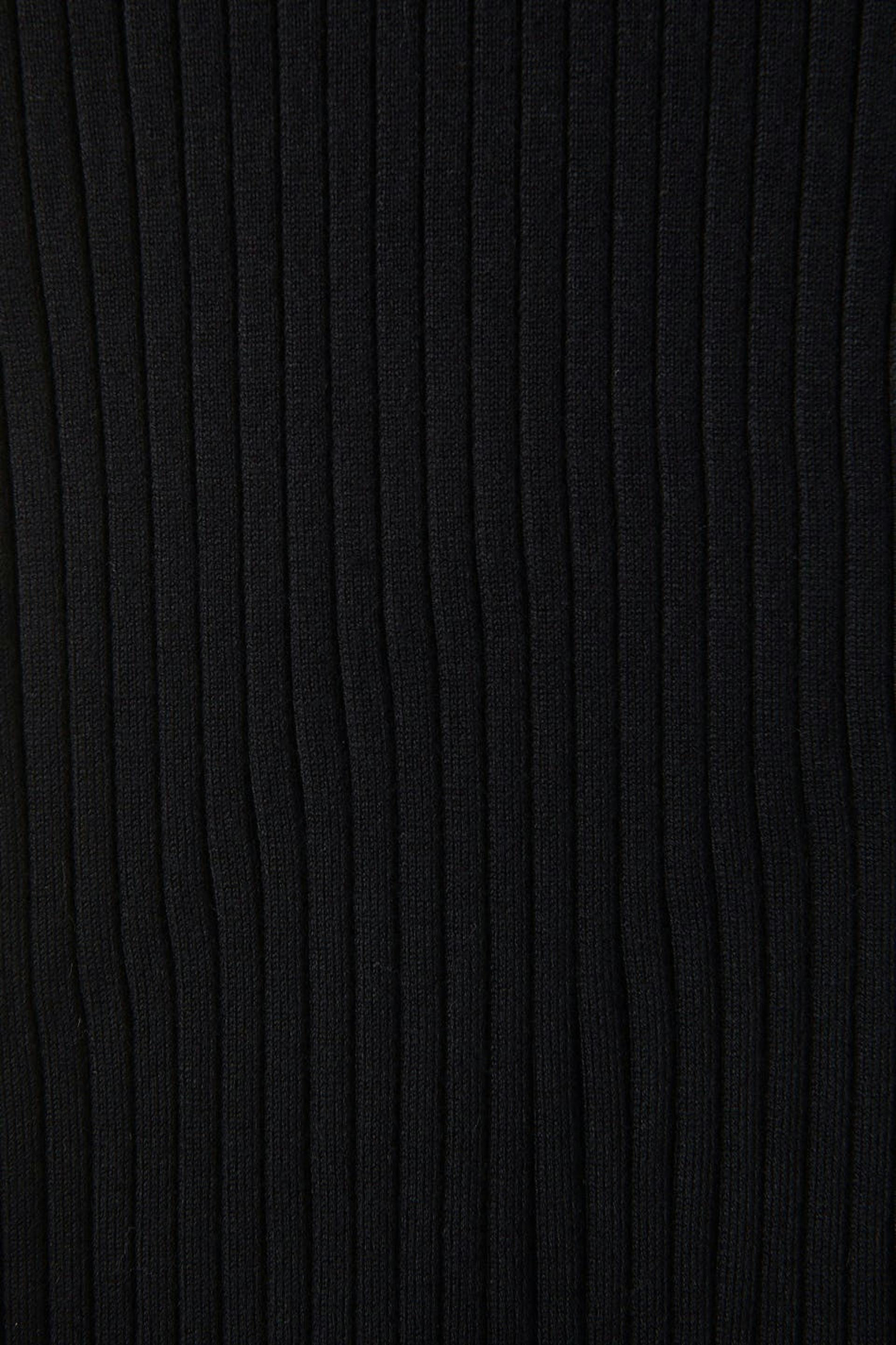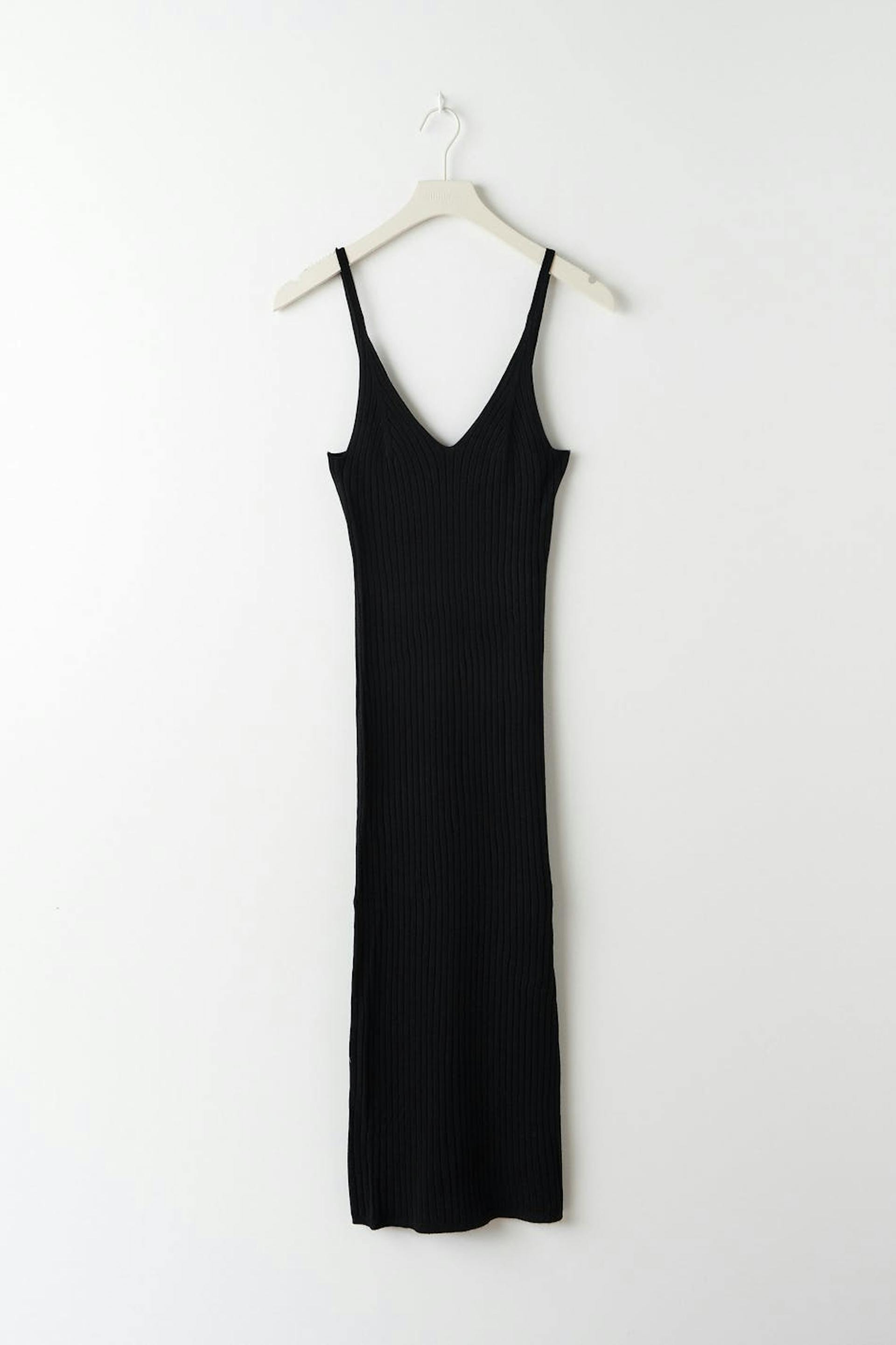 Fine-knitted midi dress with ribbed effect. The dress is black and has a fitted fit. It has v-neck, thin shoulder straps and slit at the side.