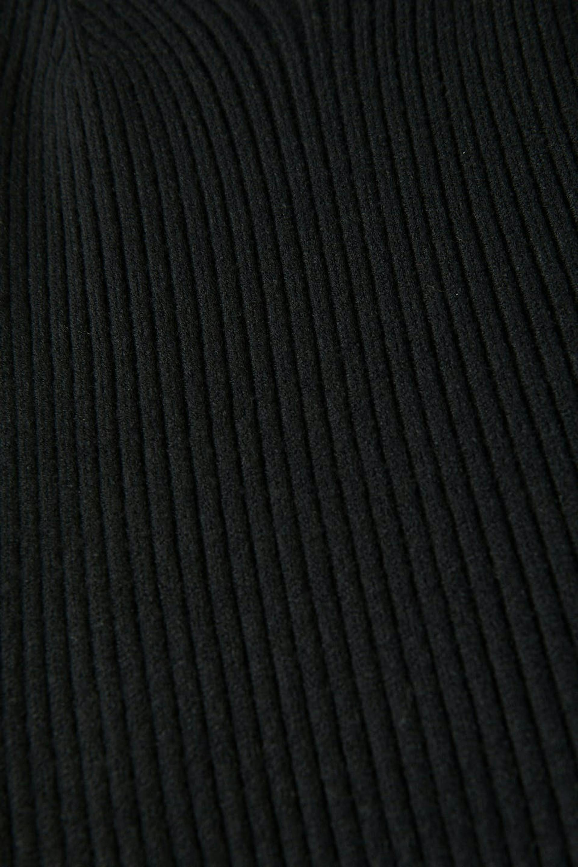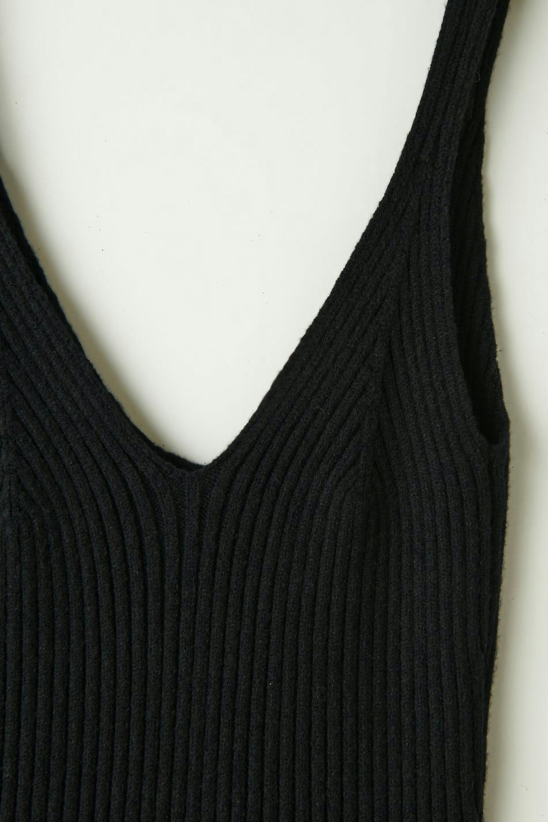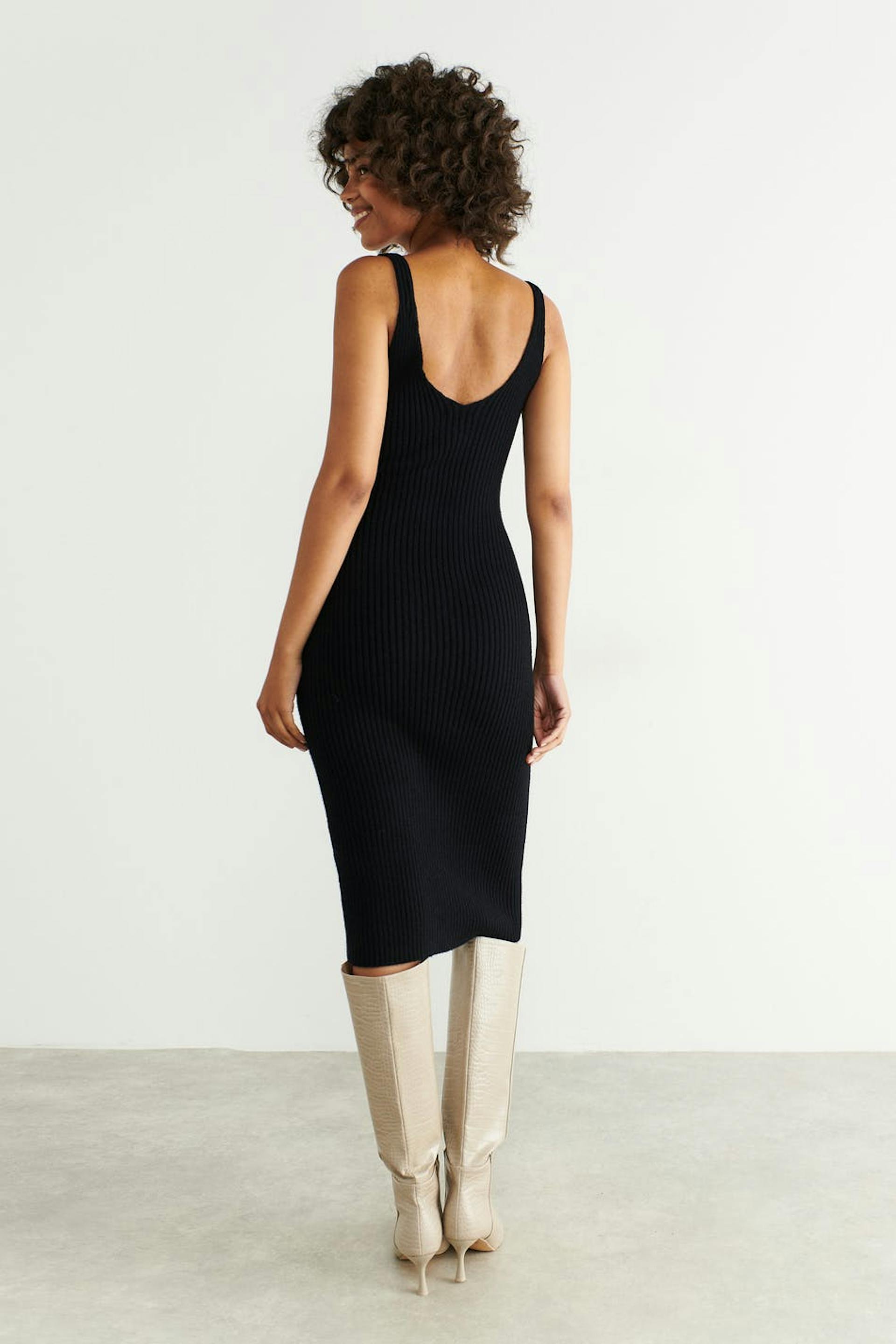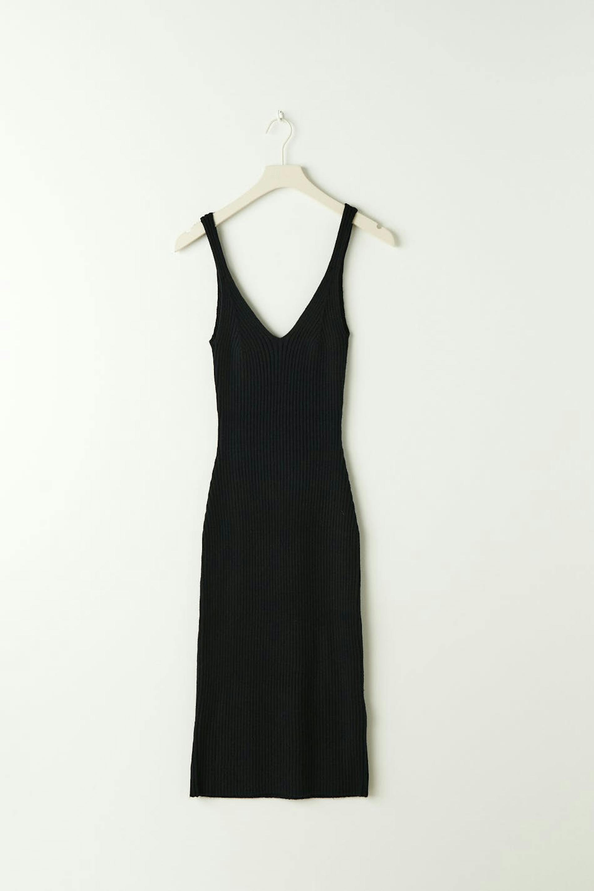 Sleeveless knit dress with v-neck cut. The dress is black and has fitted fit. It has thin shoulder straps, fully-fashioned sections at the front and midi length.