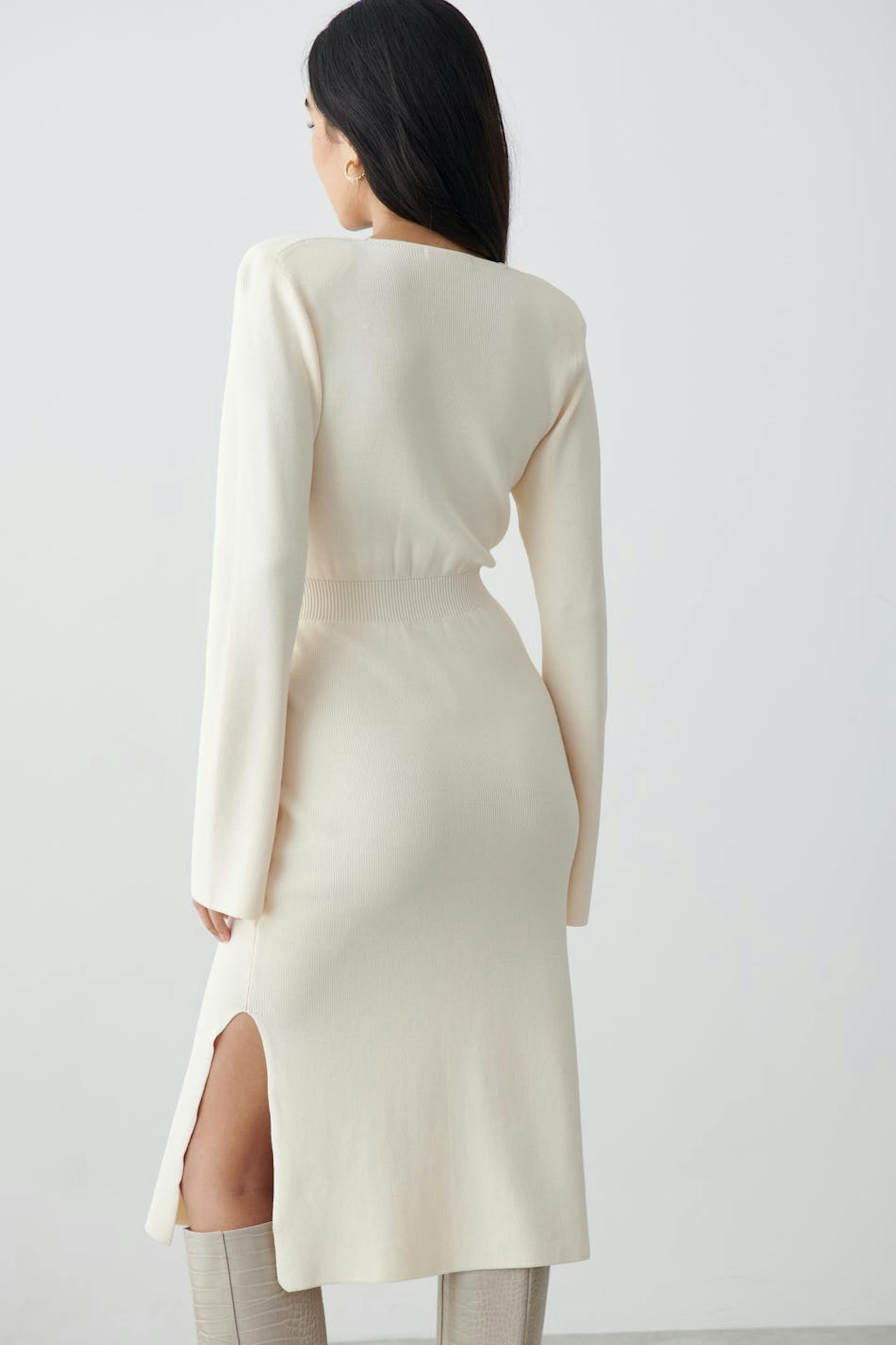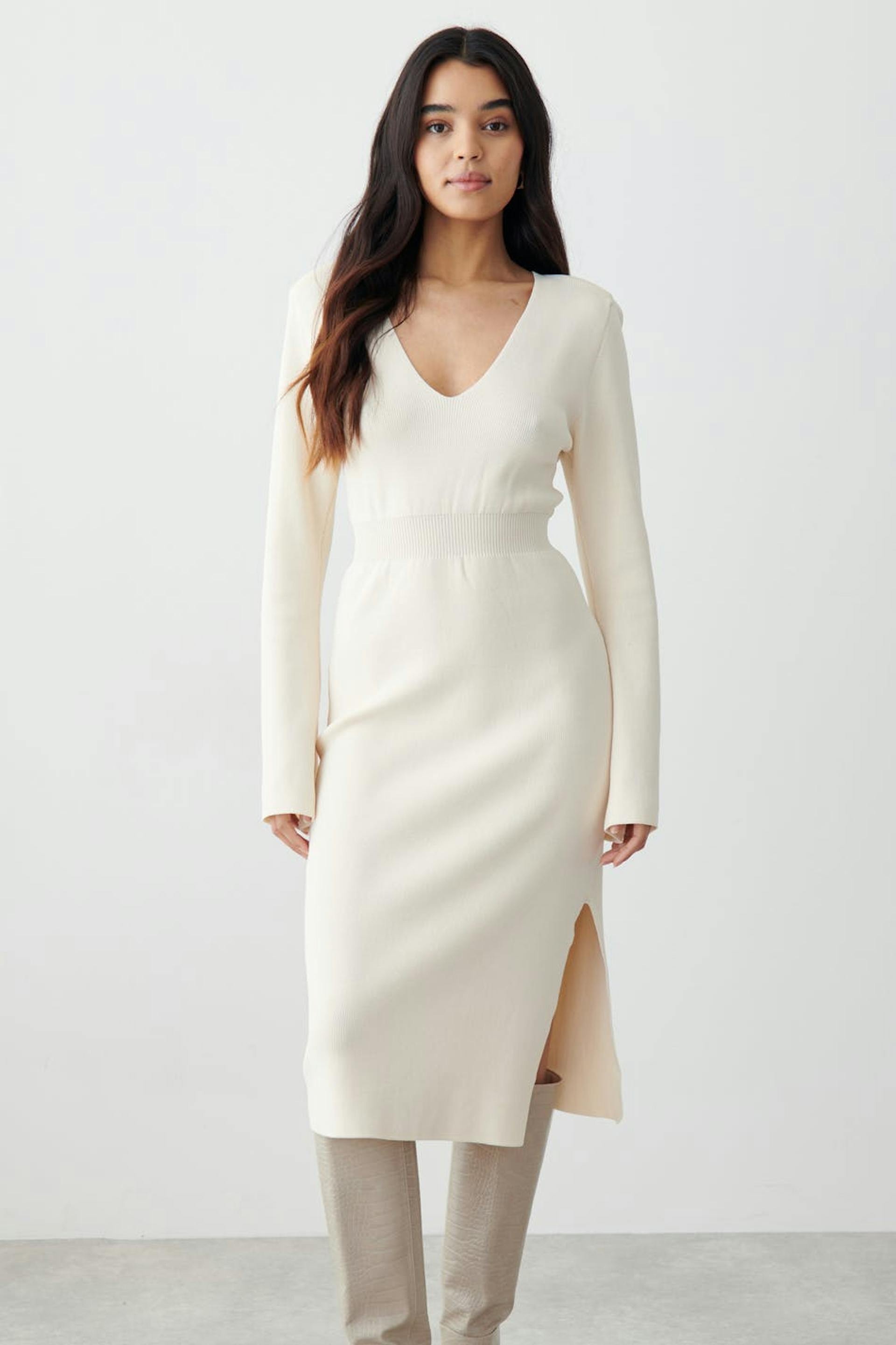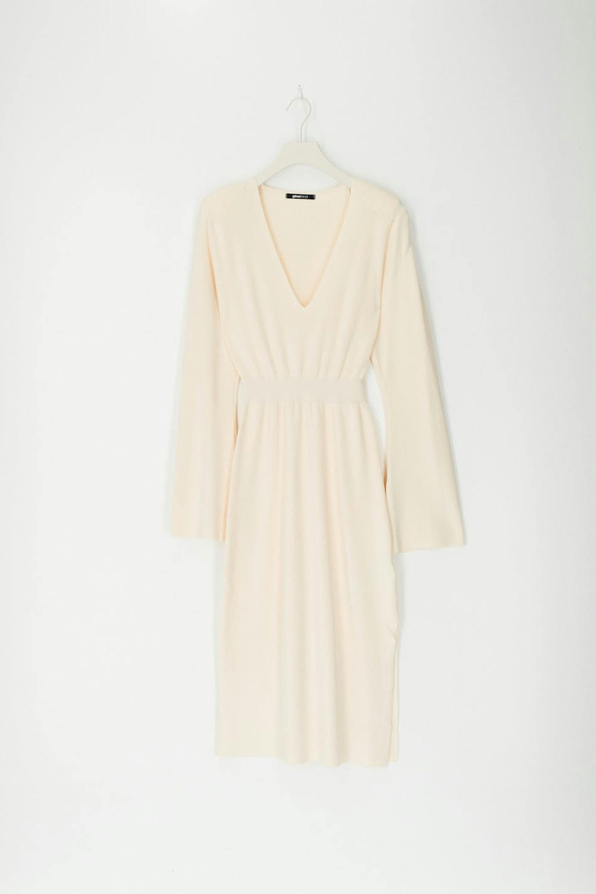 Knit dress with v neckline. The dress is white and has fitted waist. It has long sleeves, shoulder pads and slit at the side.