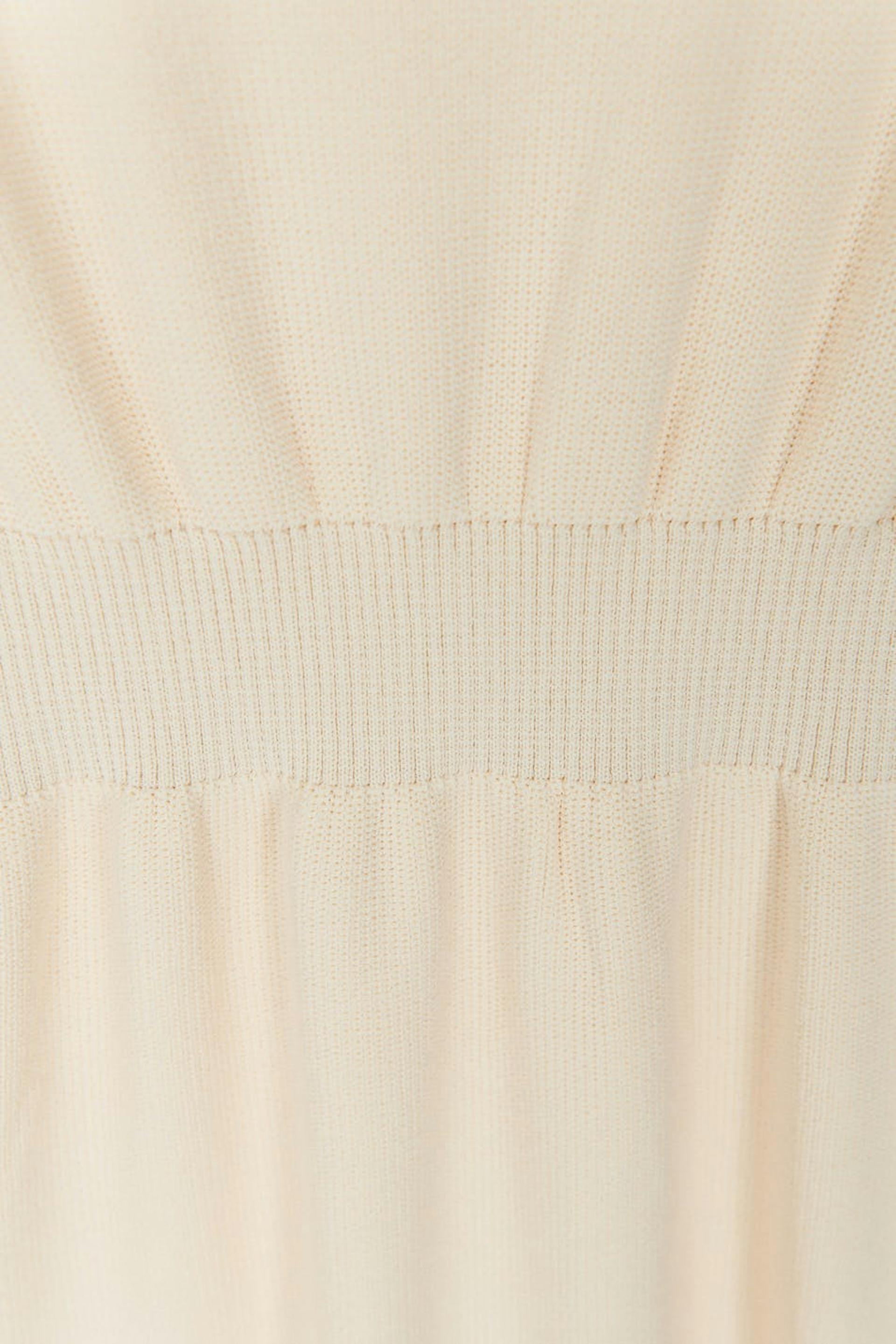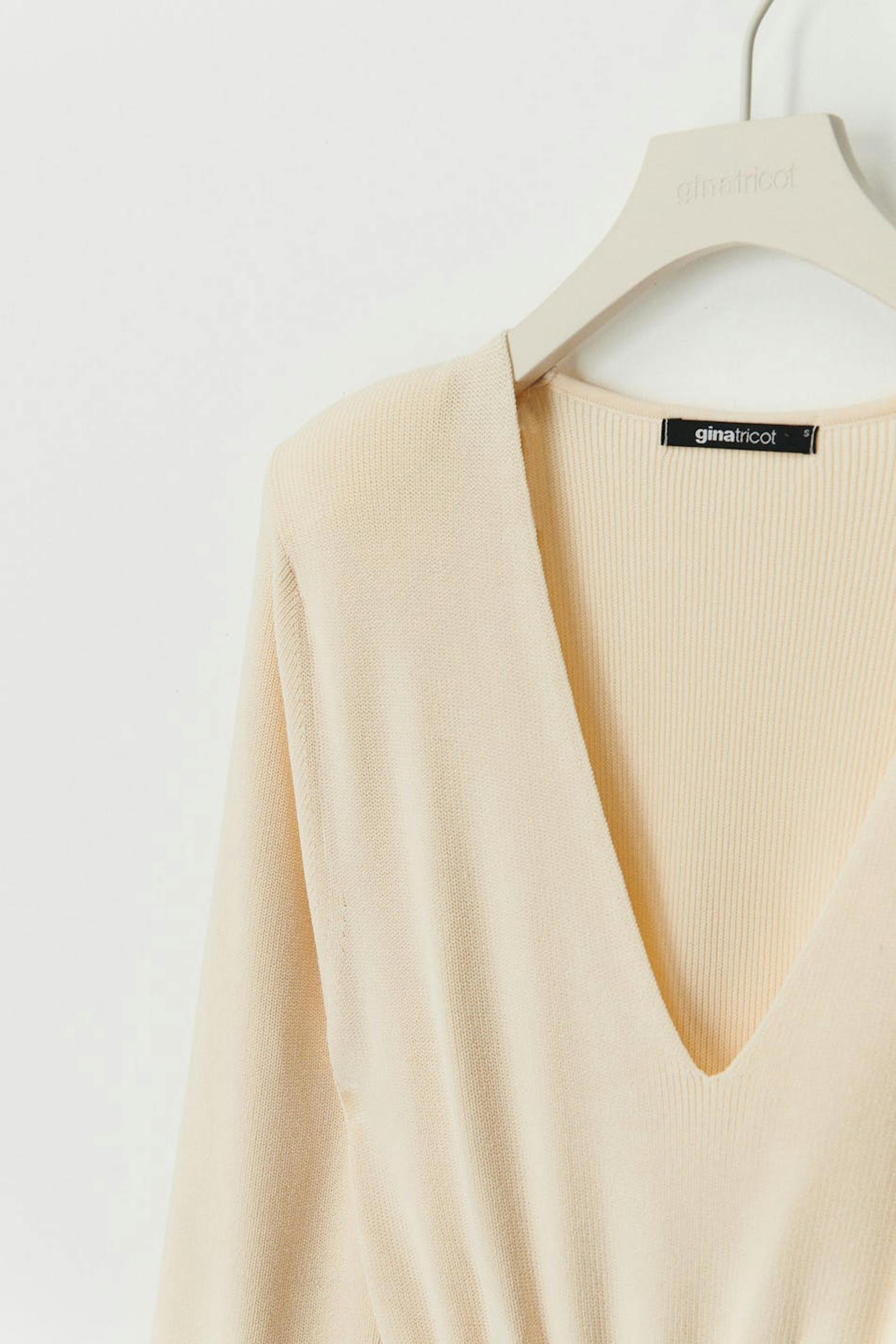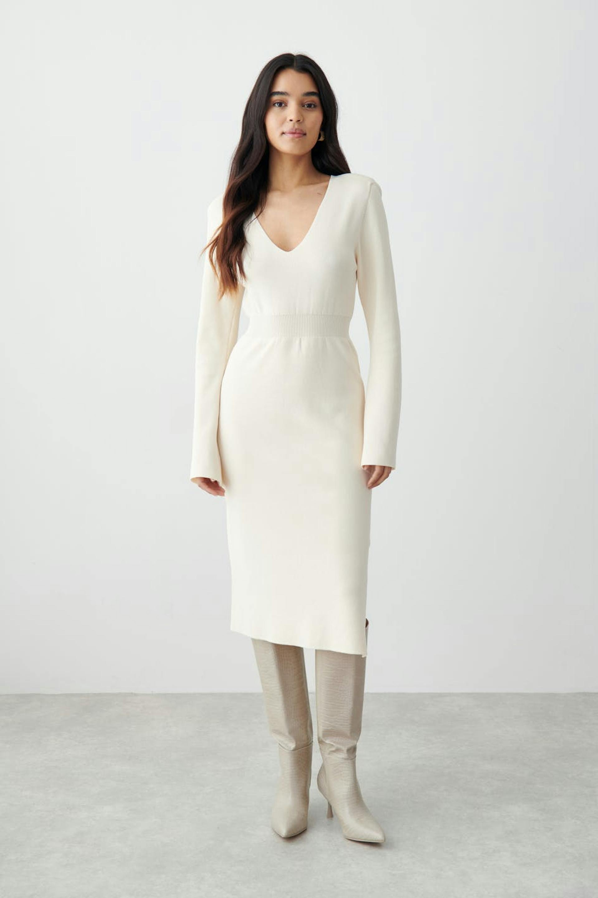 Knit dress with v neckline. The dress is white and has fitted waist. It has long sleeves, shoulder pads and slit at the side.