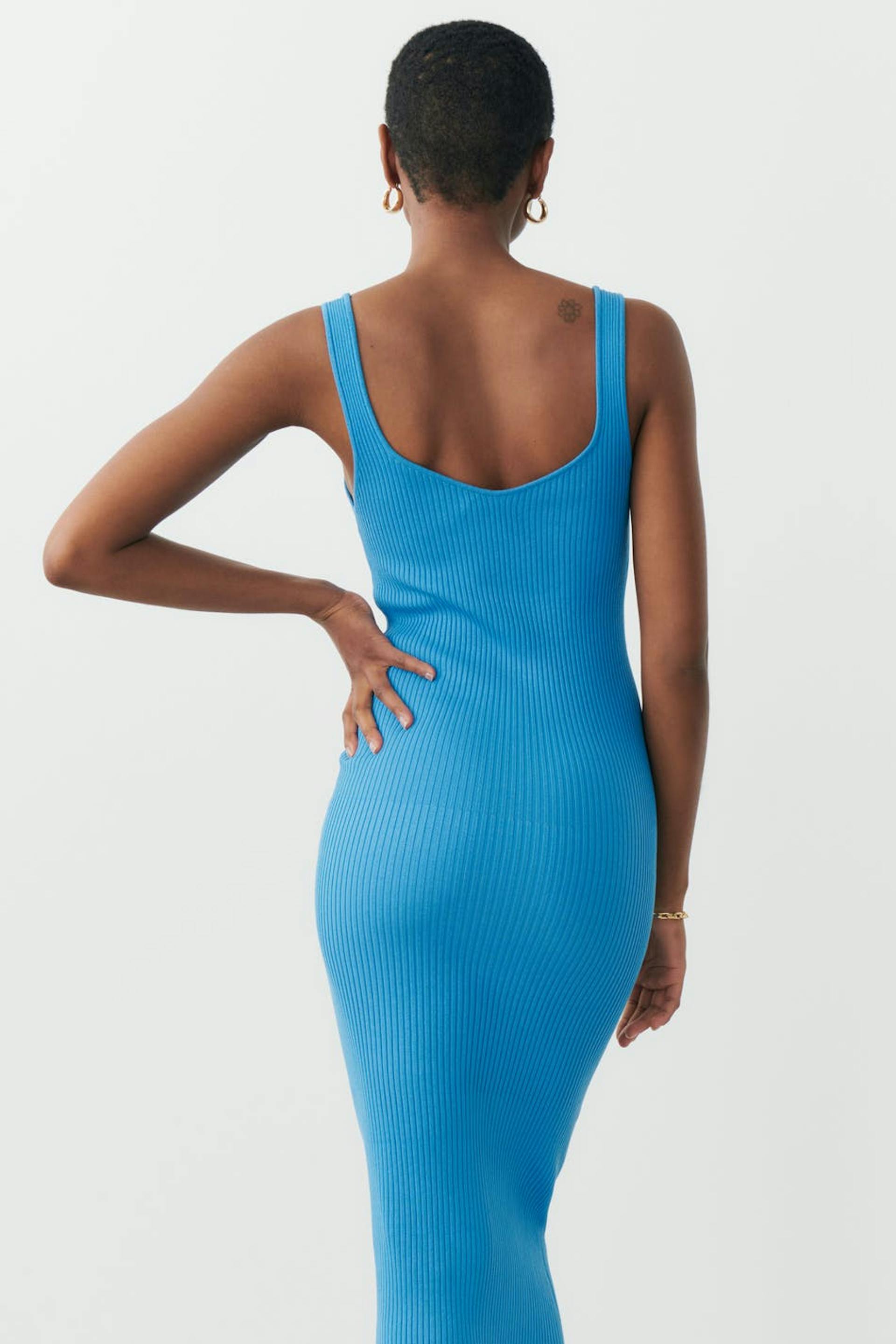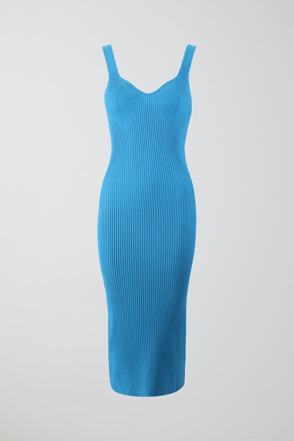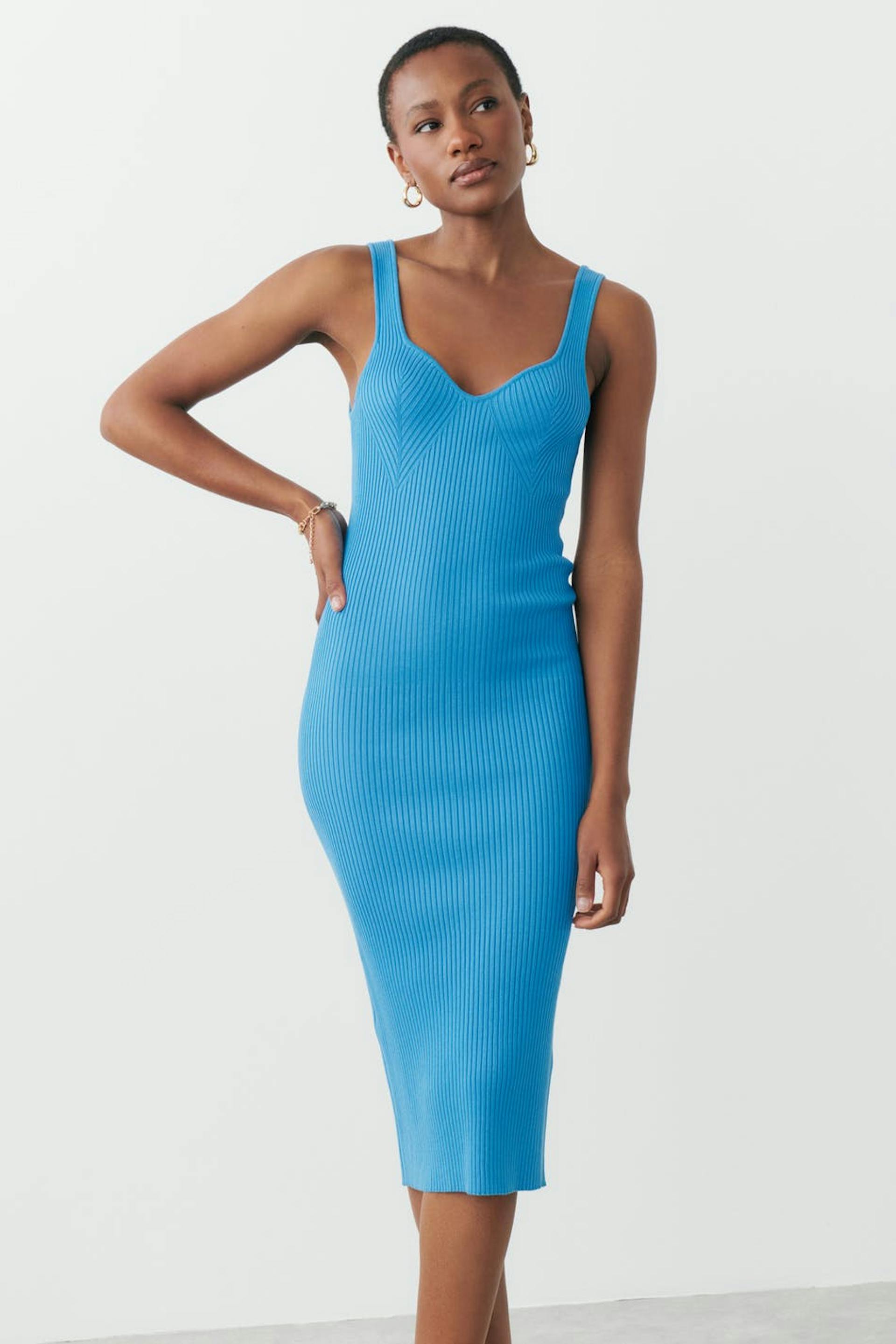 Knitted dress with sweetheart neckline. The dress is blue, sleeveless and ribbed. It has figure-hugging fit, low back, shoulder straps and fully-fashioned sections at the bust.