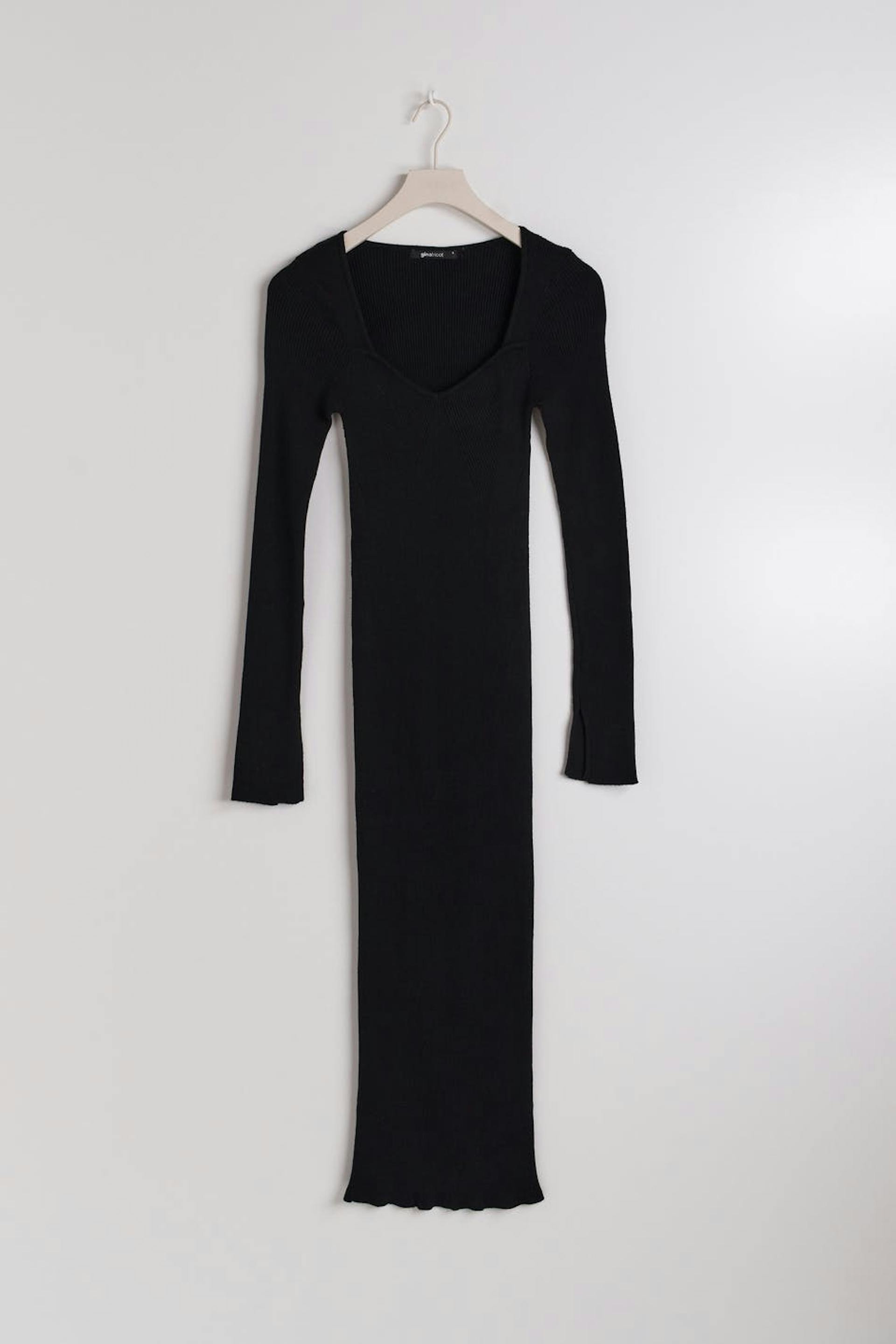 Knitted midi dress with sweetheart neckline. The dress is black, long-sleeved and ribbed. It has figure-hugging fit, fully-fashioned sections at the bust and slit on the sleeve ends.