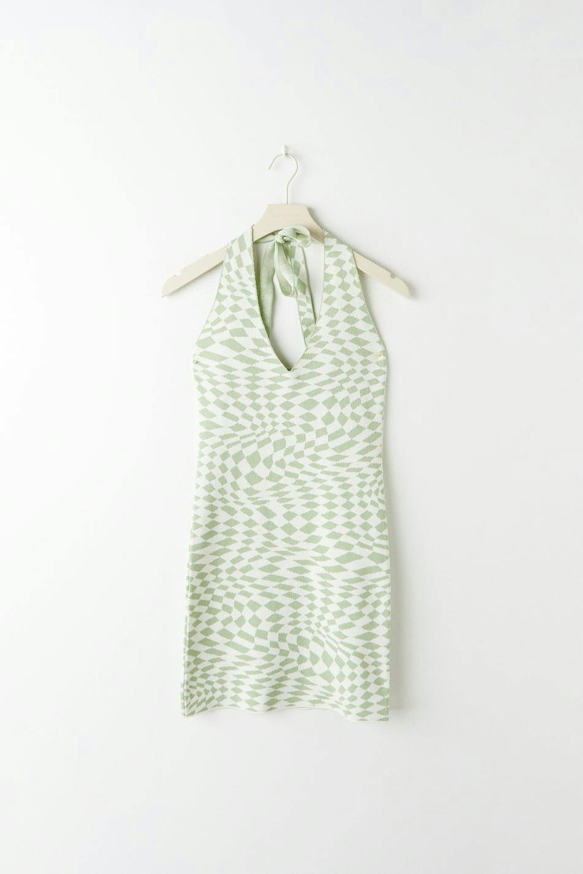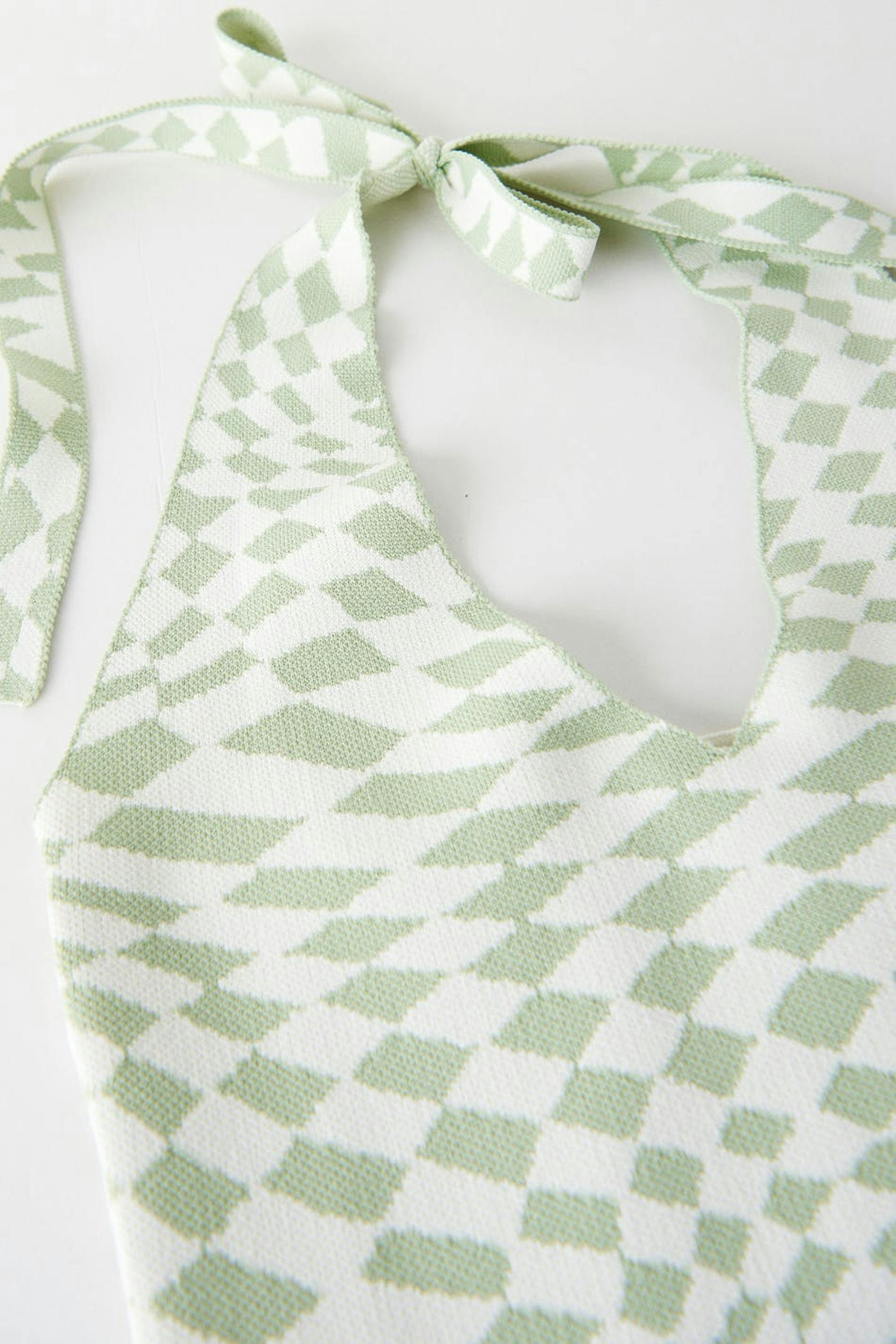 Checked dress with a fitted fit. Green, white, short and knitted. It has a fitted fit perfect for the party and an adjustable, tied halter at the back.