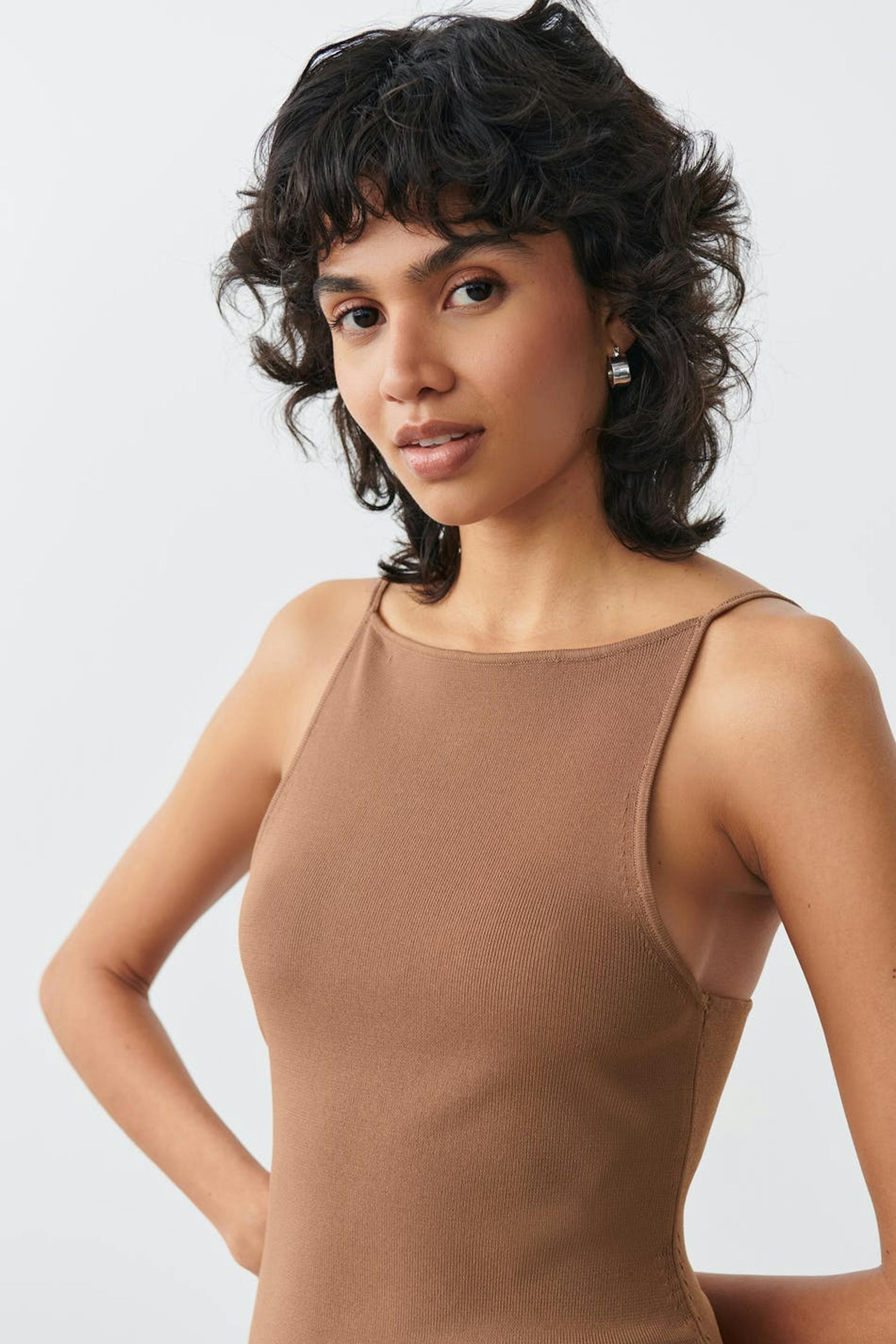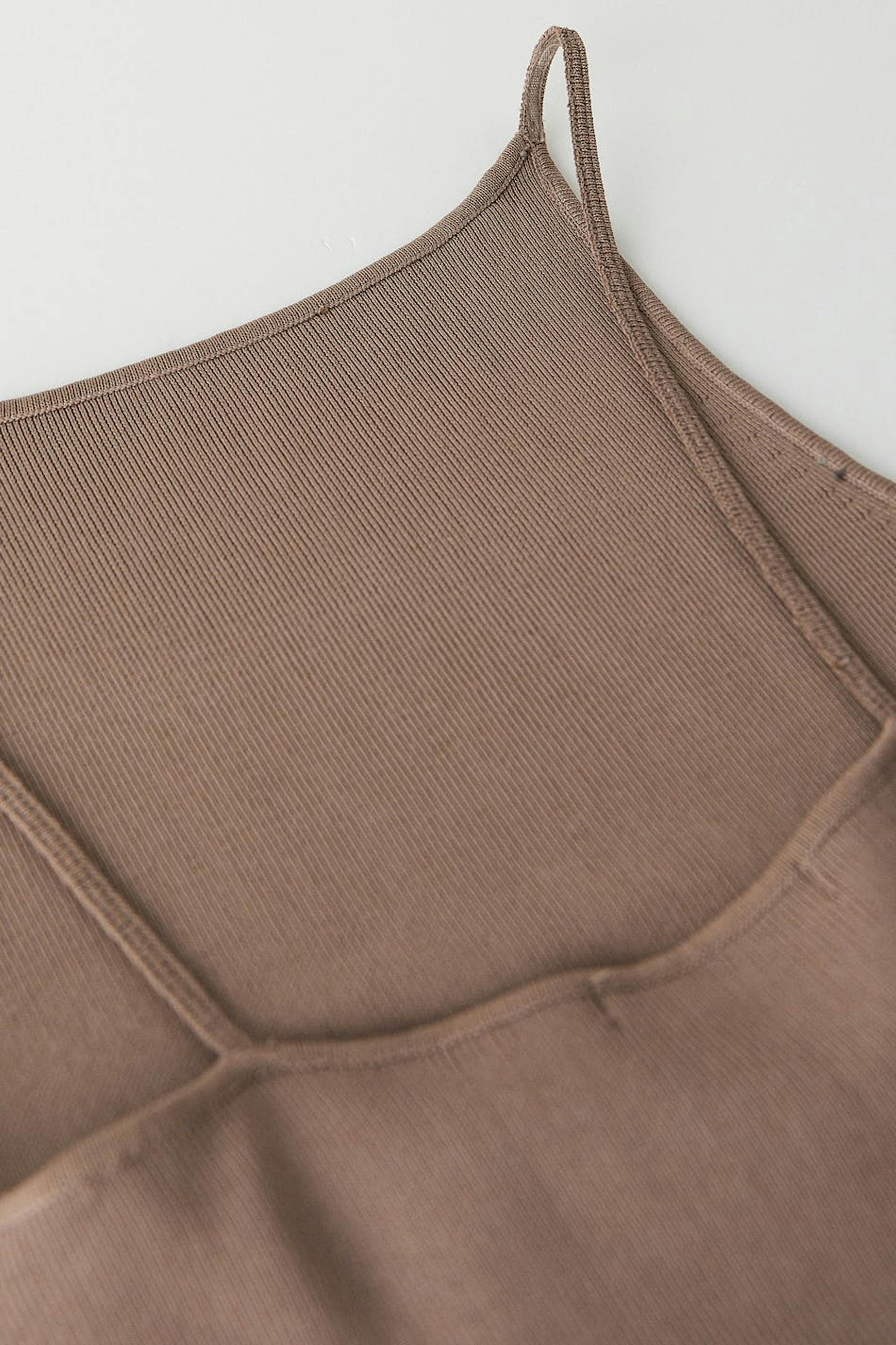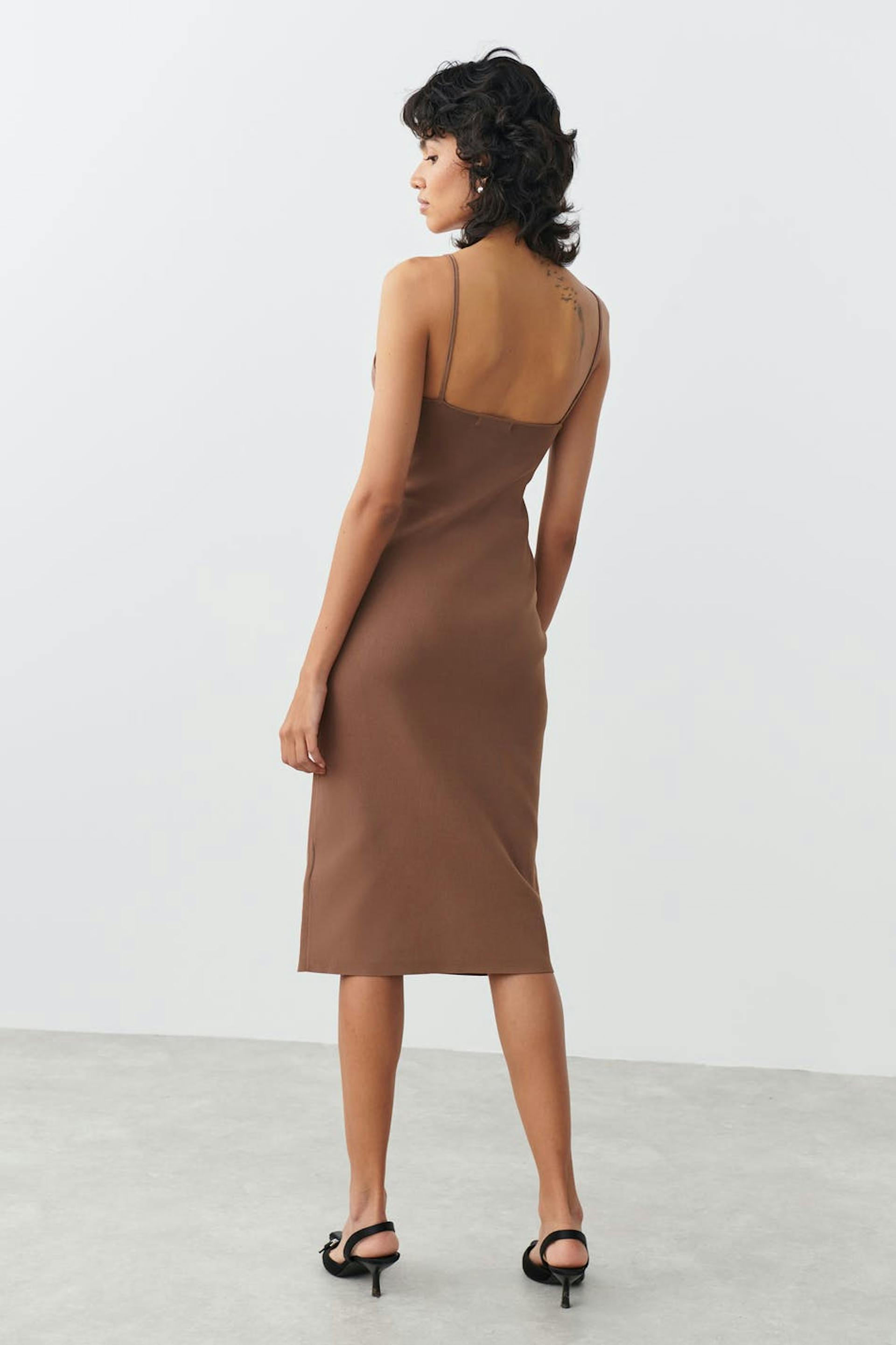 Sleeveless midi dress with a fitted fit. The dress is brown and has a square neckline. It has low backline and spaghetti straps.