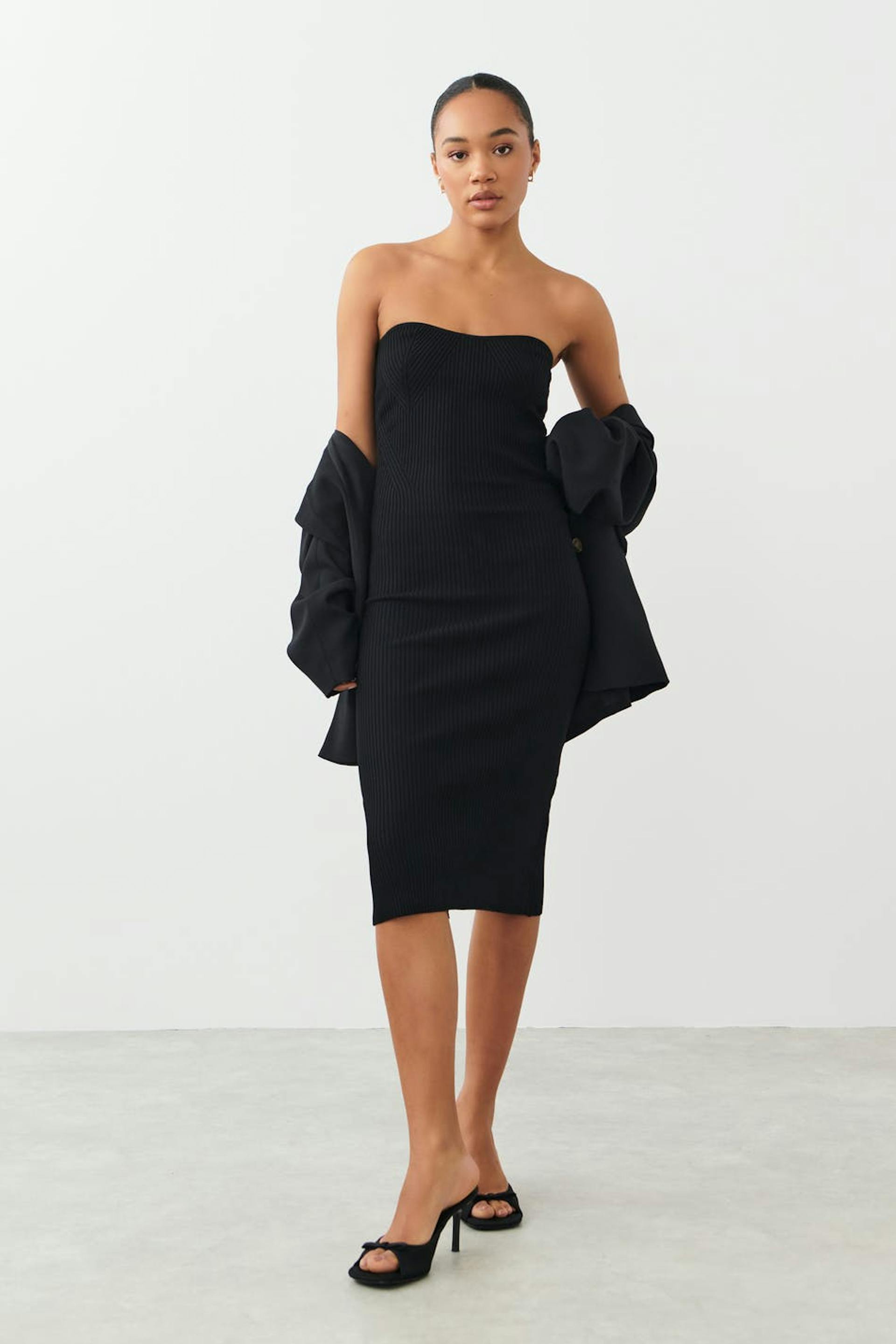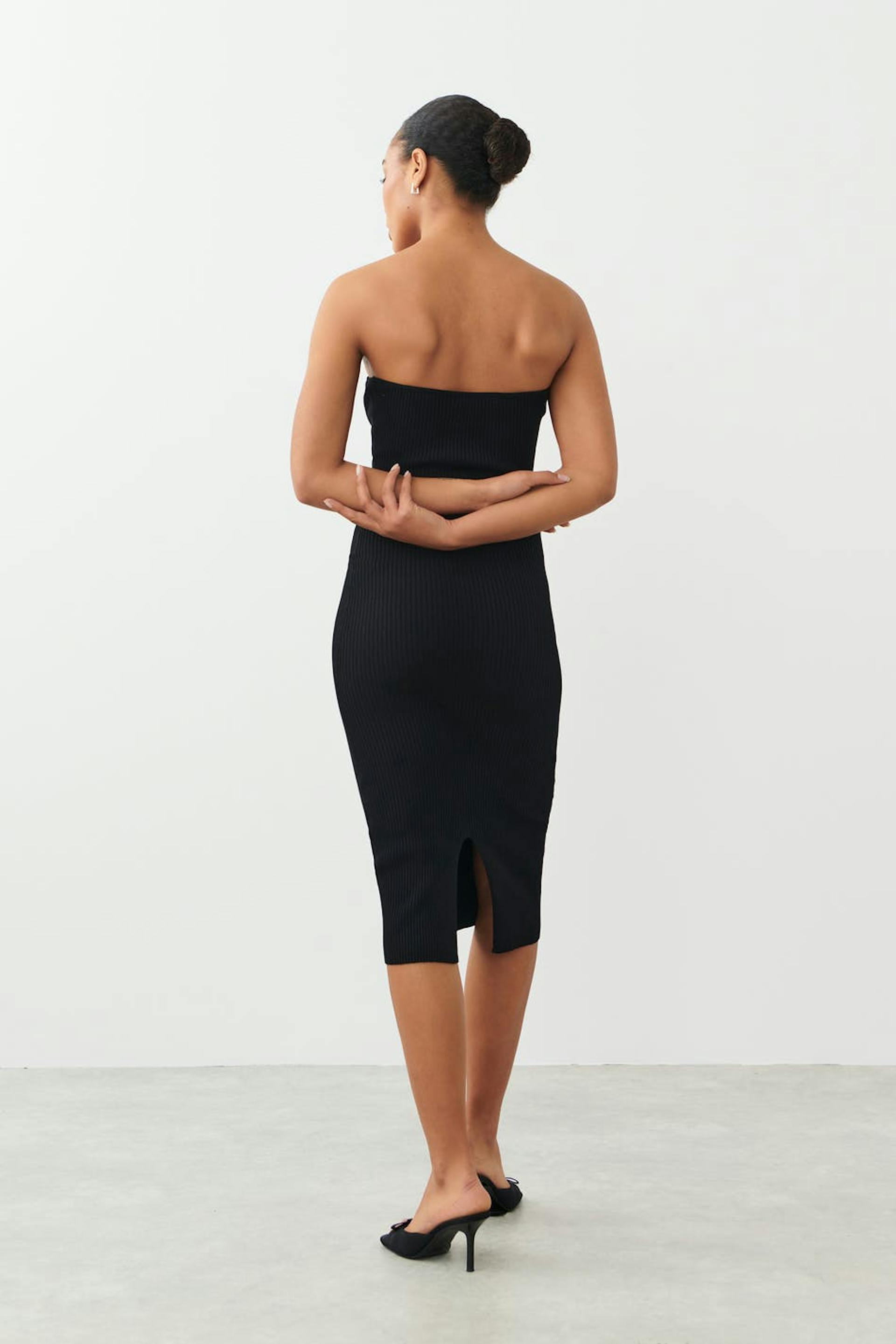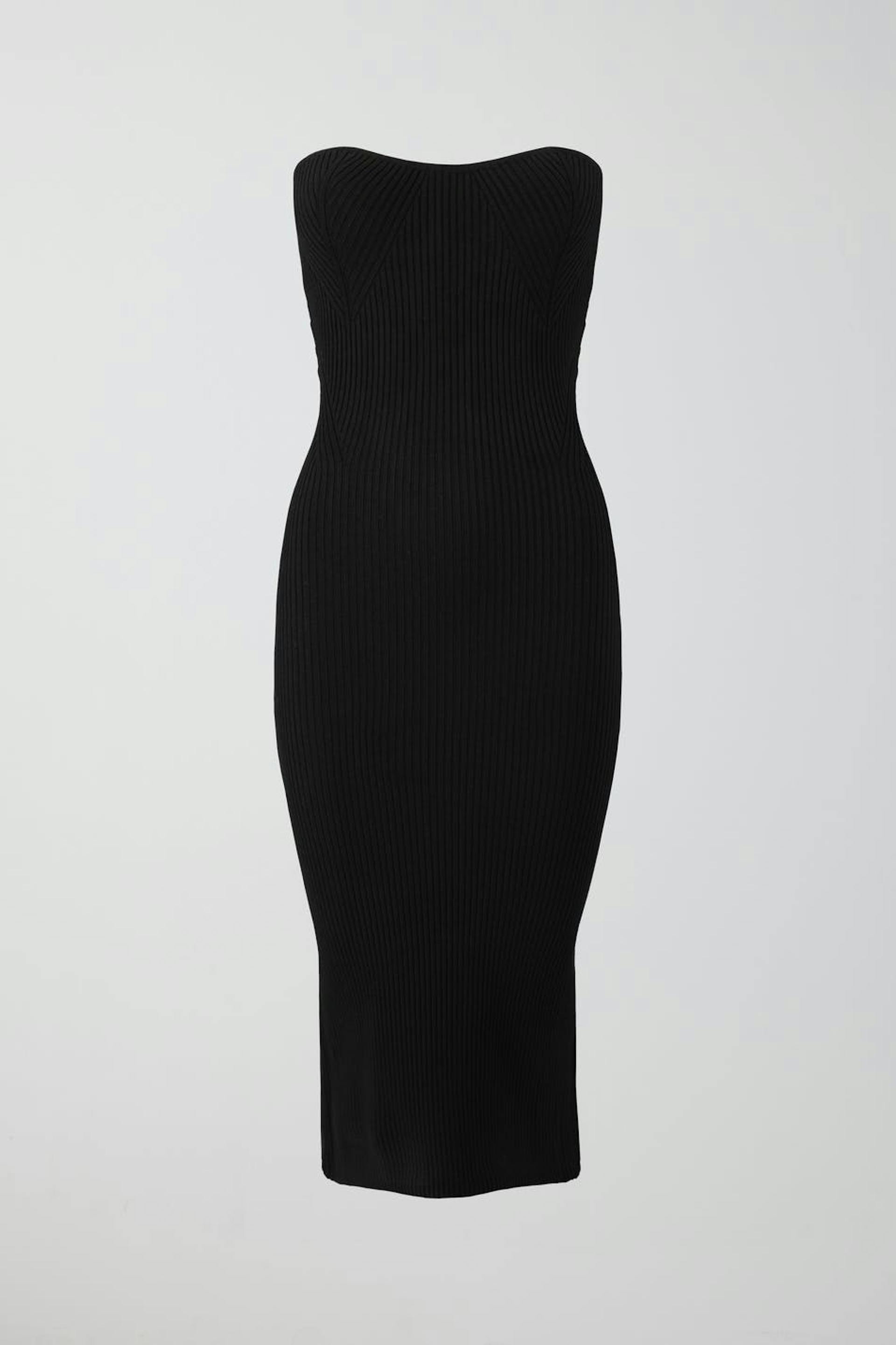 Knitted tube dress with slit at the back. The dress is black and has figure-hugging fit. It has sweetheart neckline, fully-fashioned sections at the front and midi length.