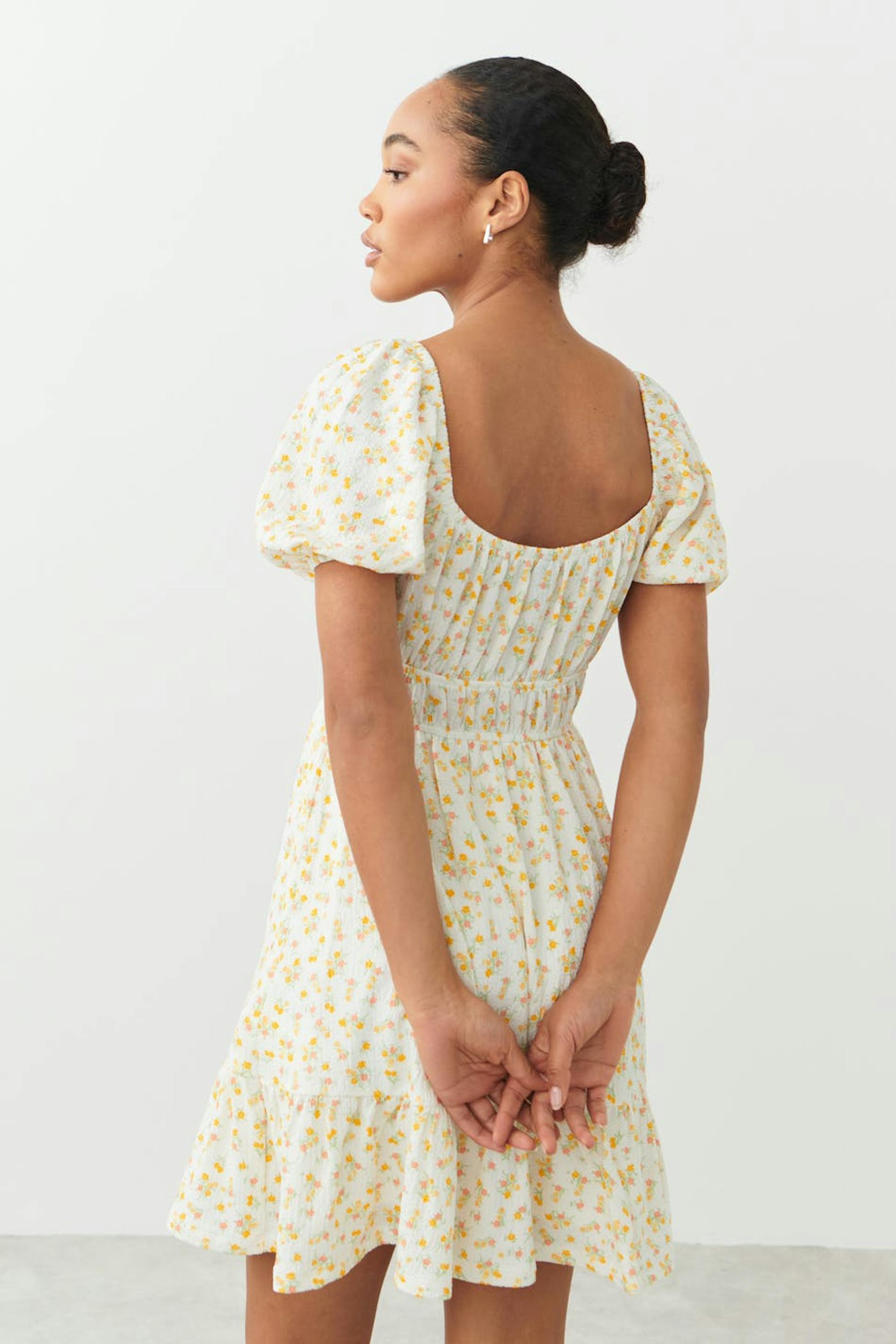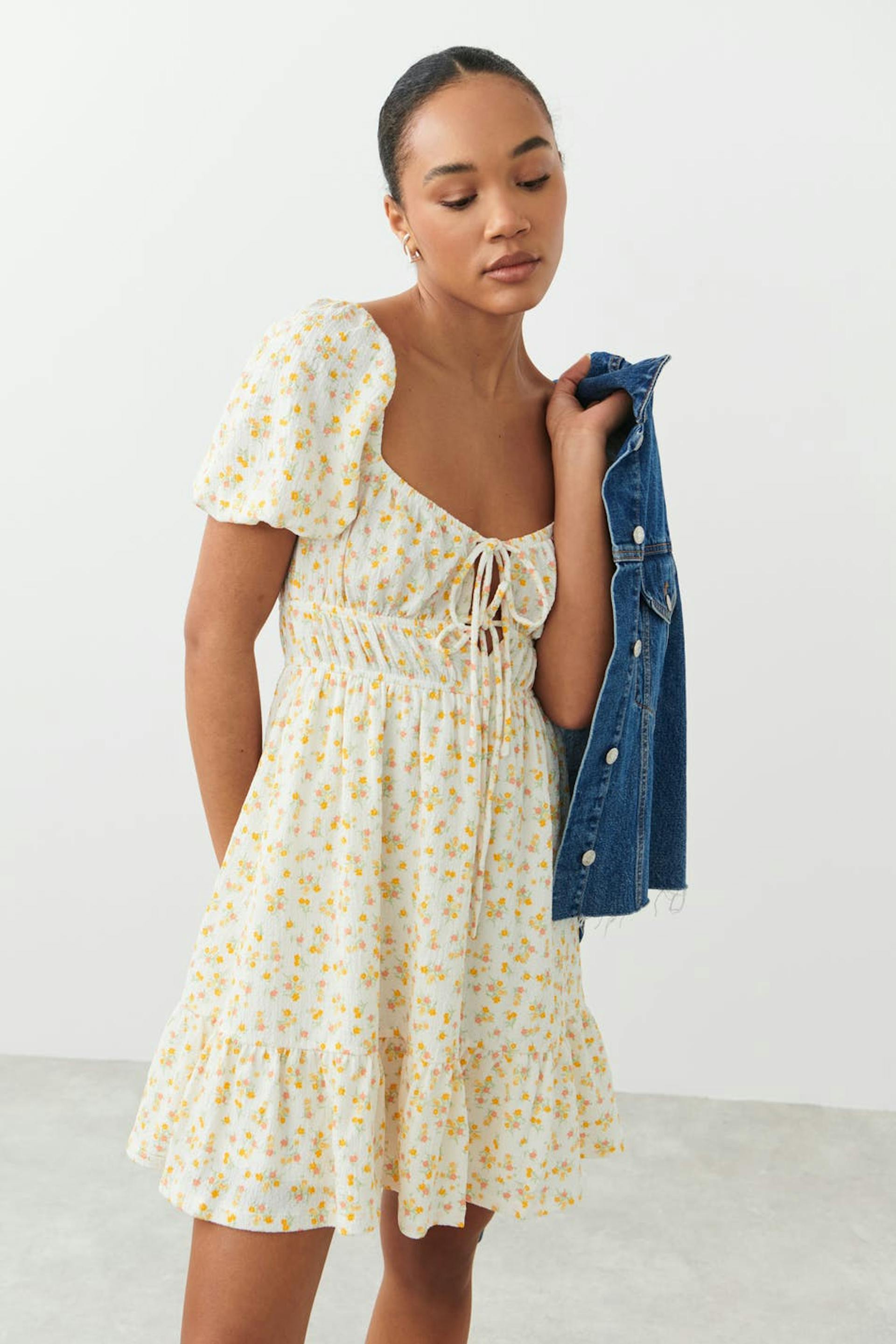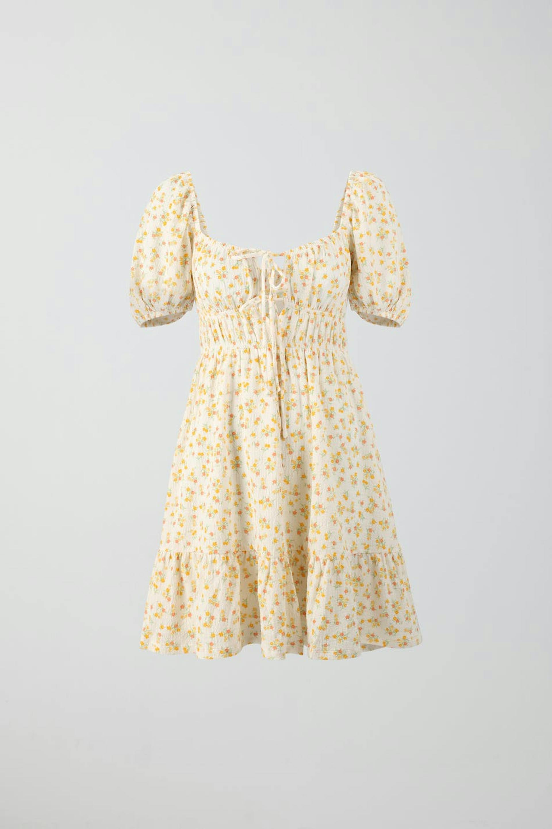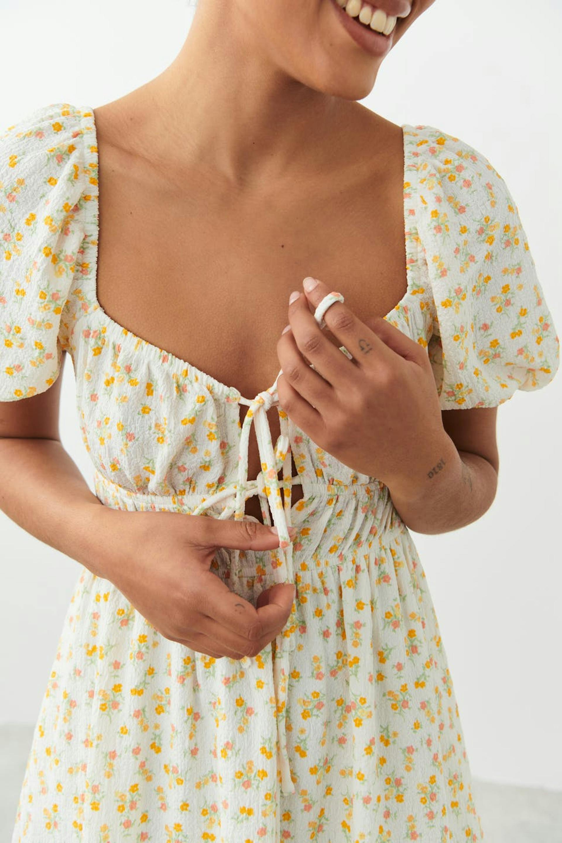 Short dress with tie detail at the front. The dress is yellow and has fluffy short sleeves. It has a square neckline and a wide skirt with decorative gathering at the bottom.