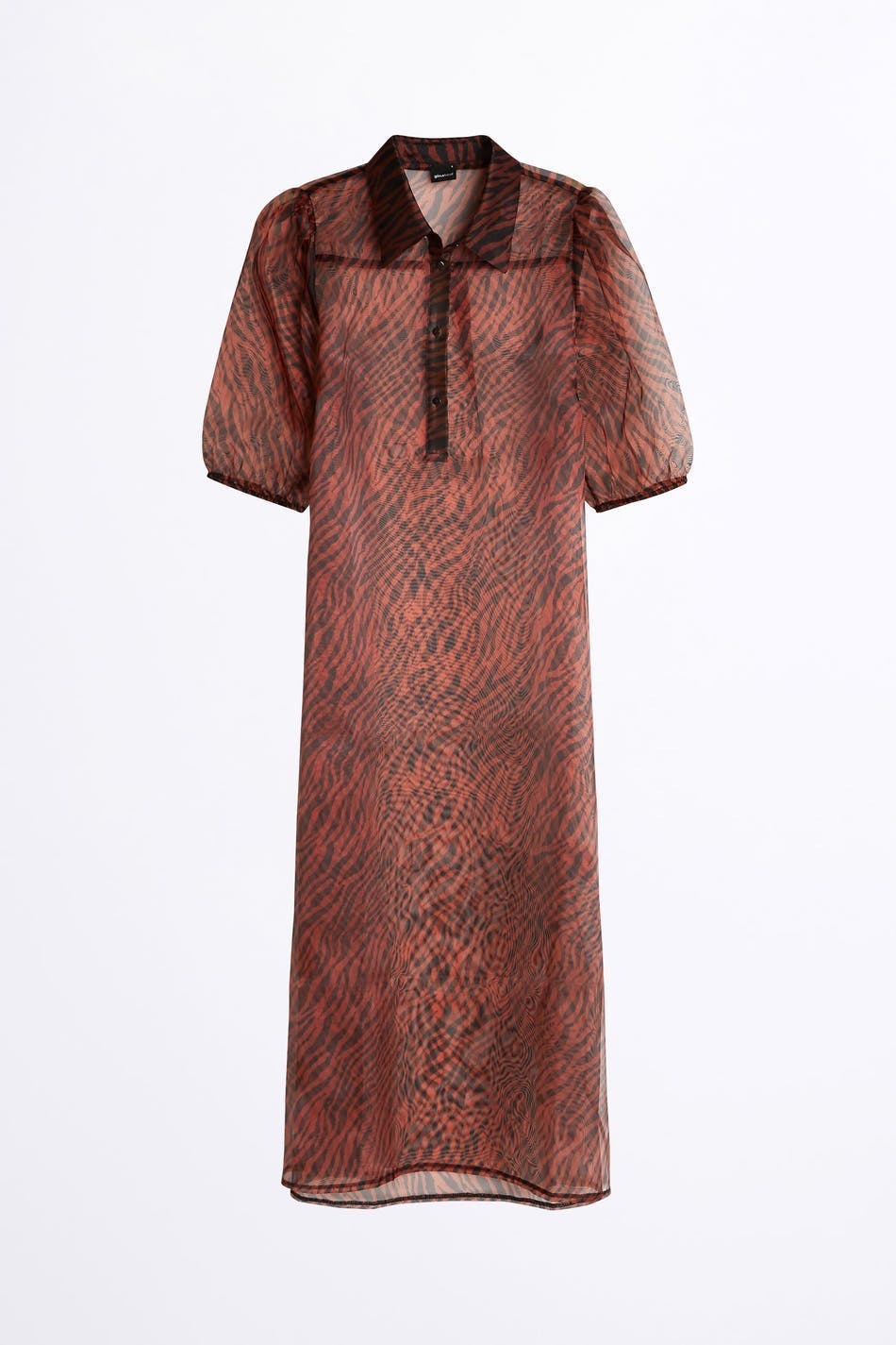 Organza dress with a slit on the sides. The dress is black, red and seethrough. It has short puff sleeves.