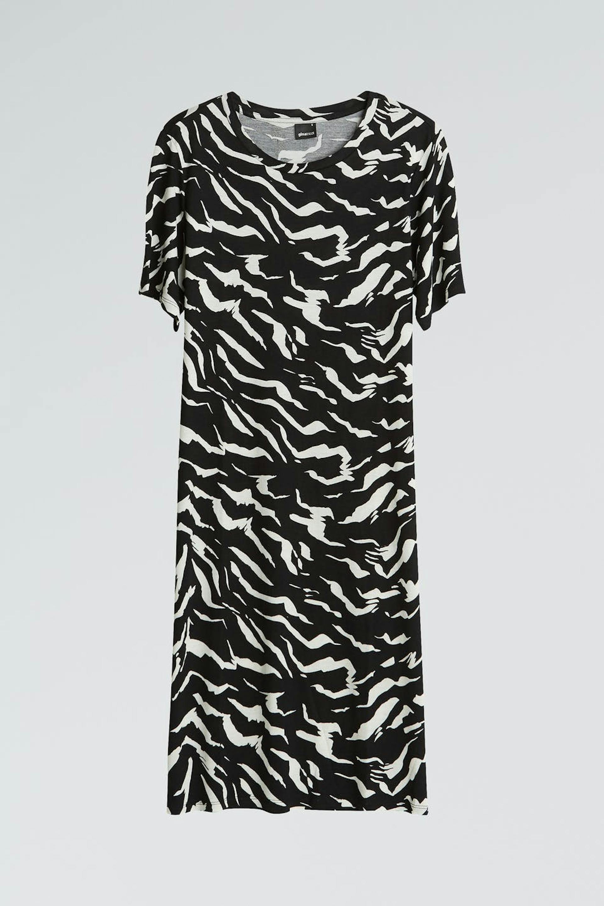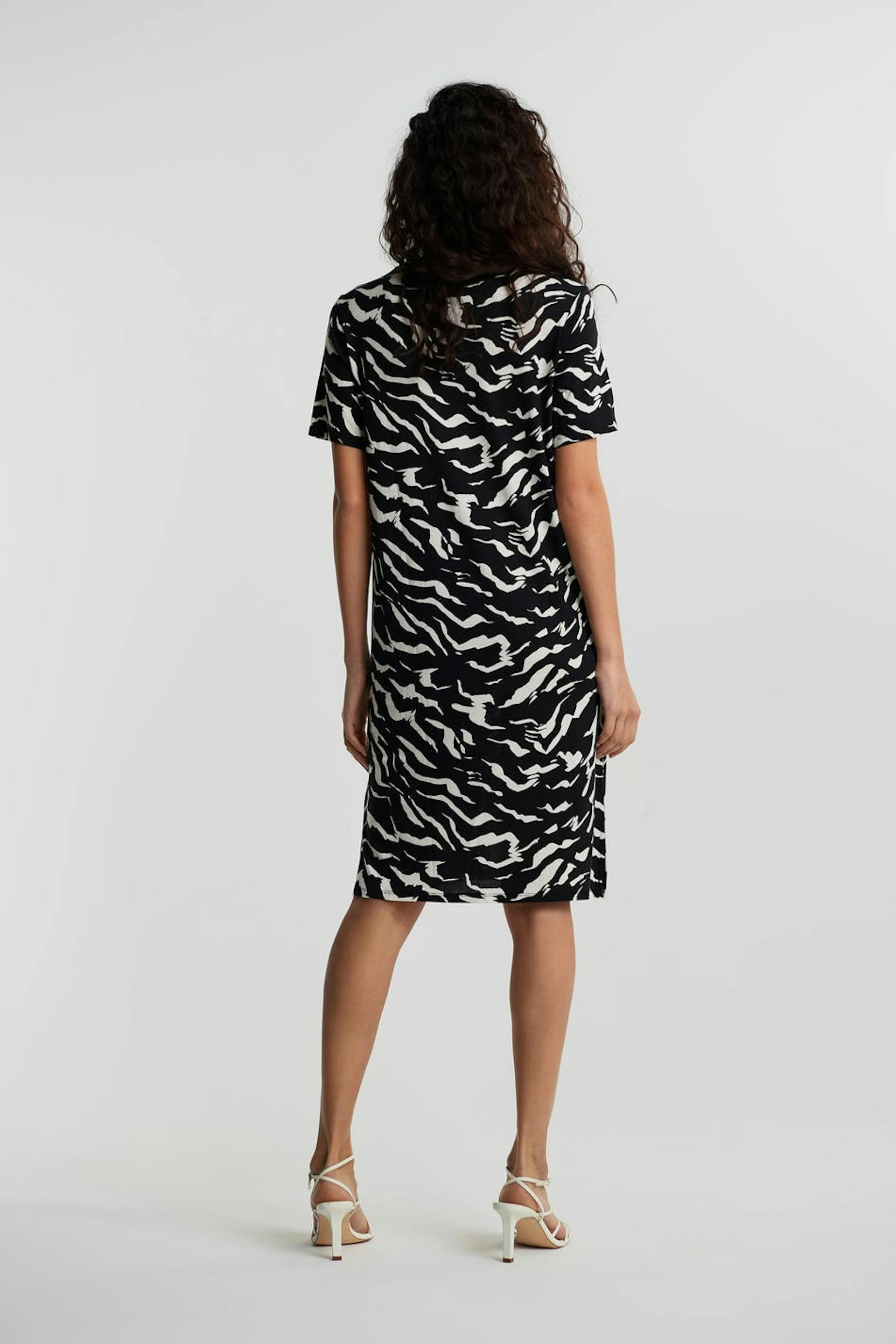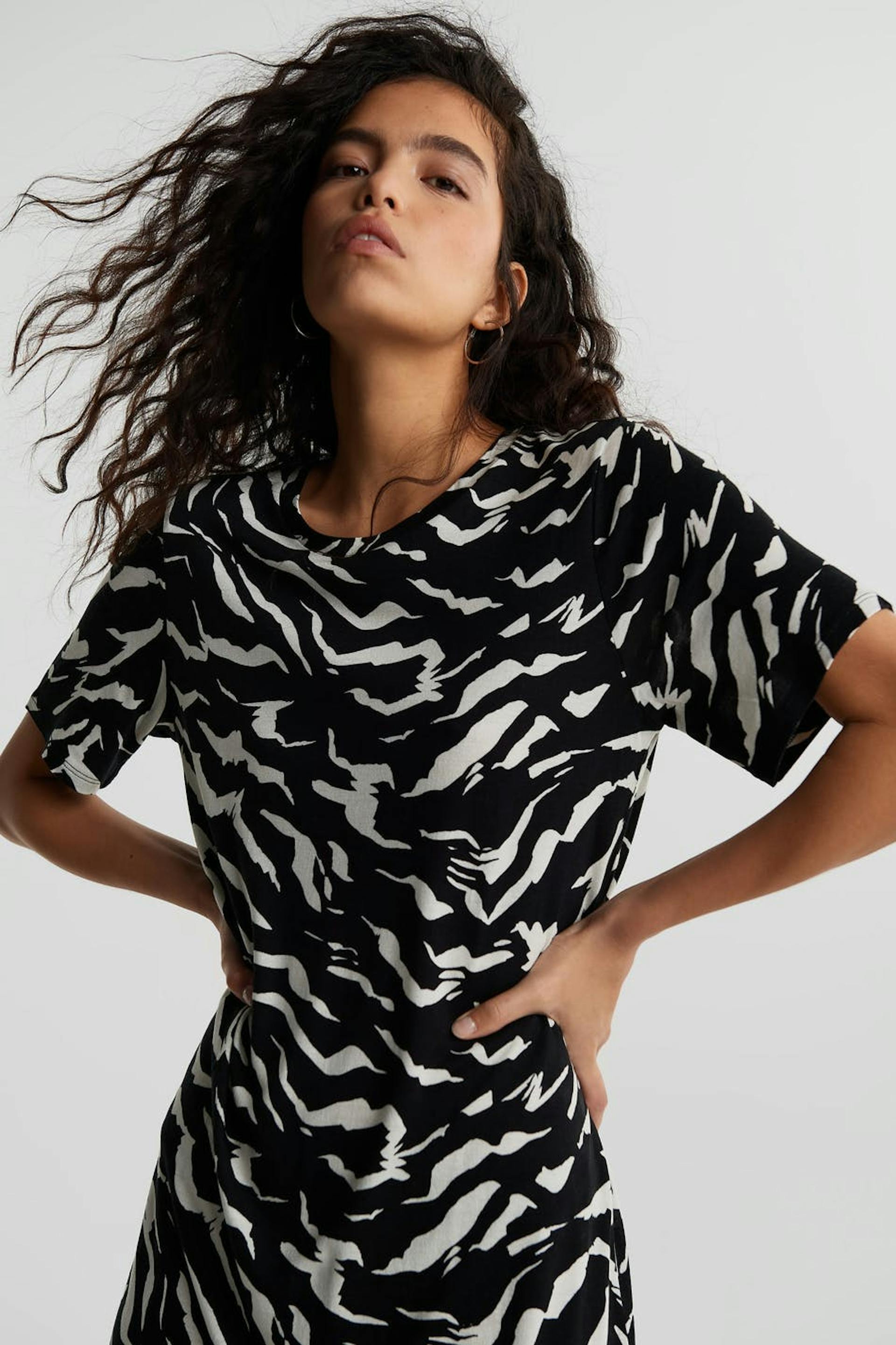 T-shirt dress with an oversize fit. The dress is black and white and has a slit on the sides. It is made of jersey and has midi length.