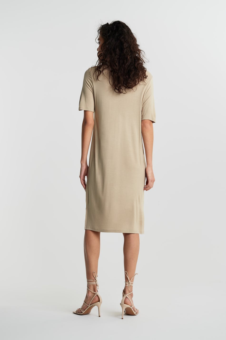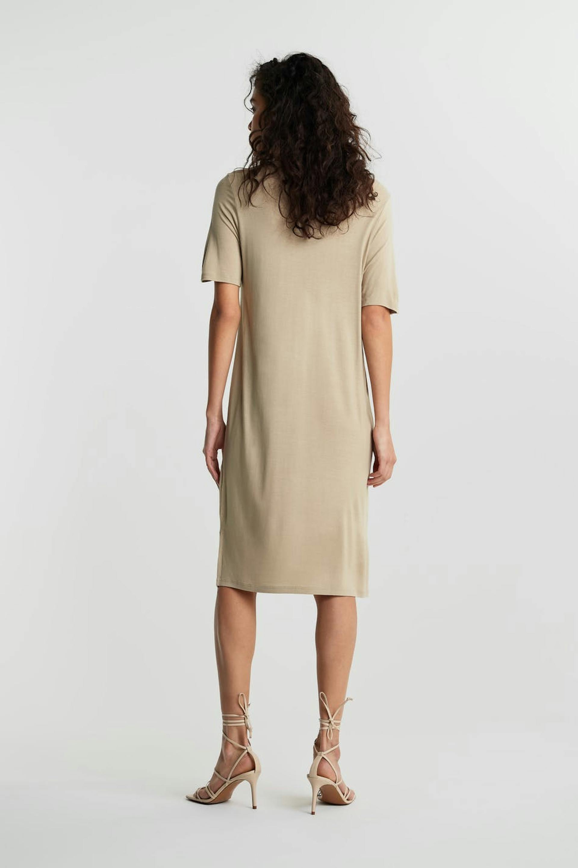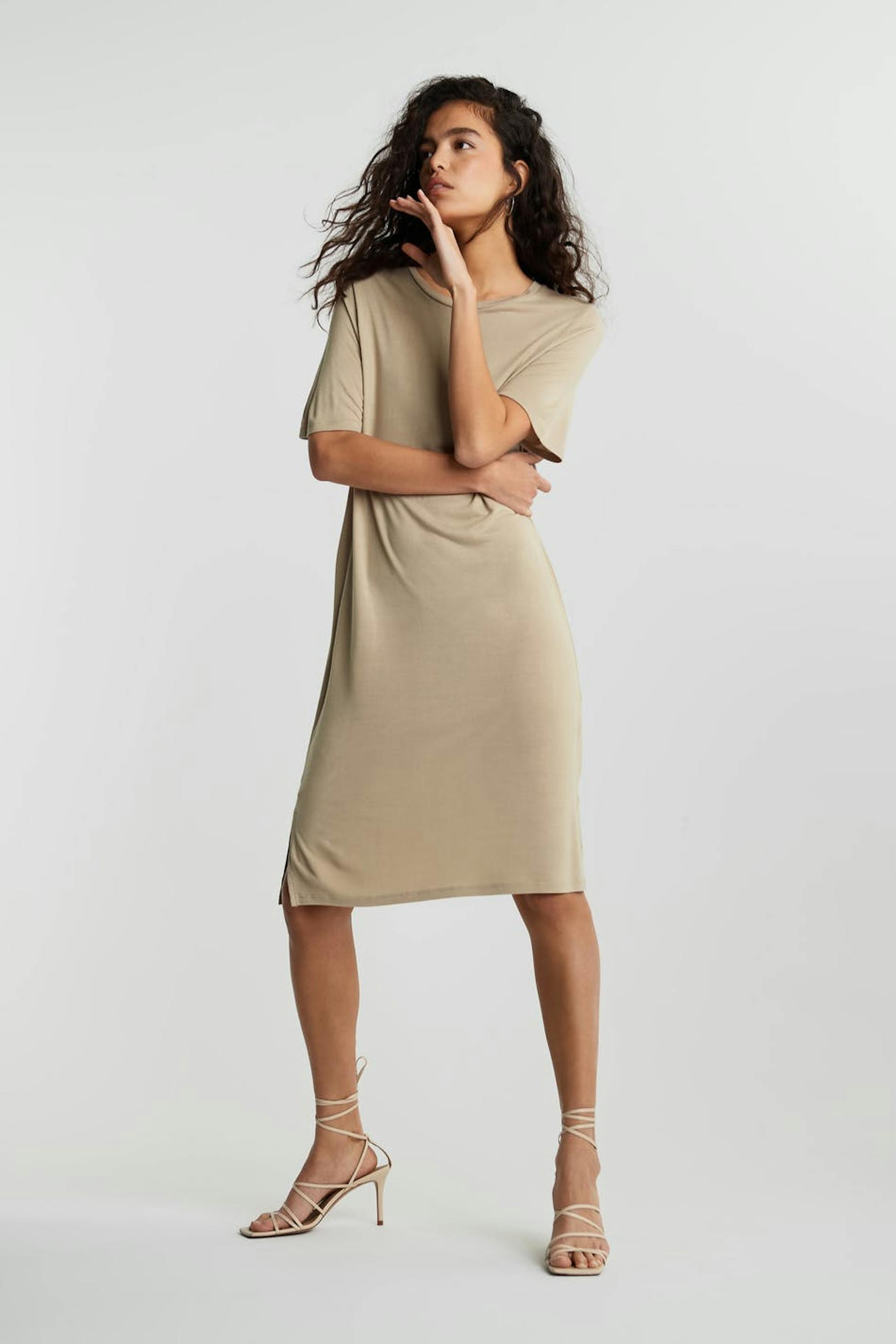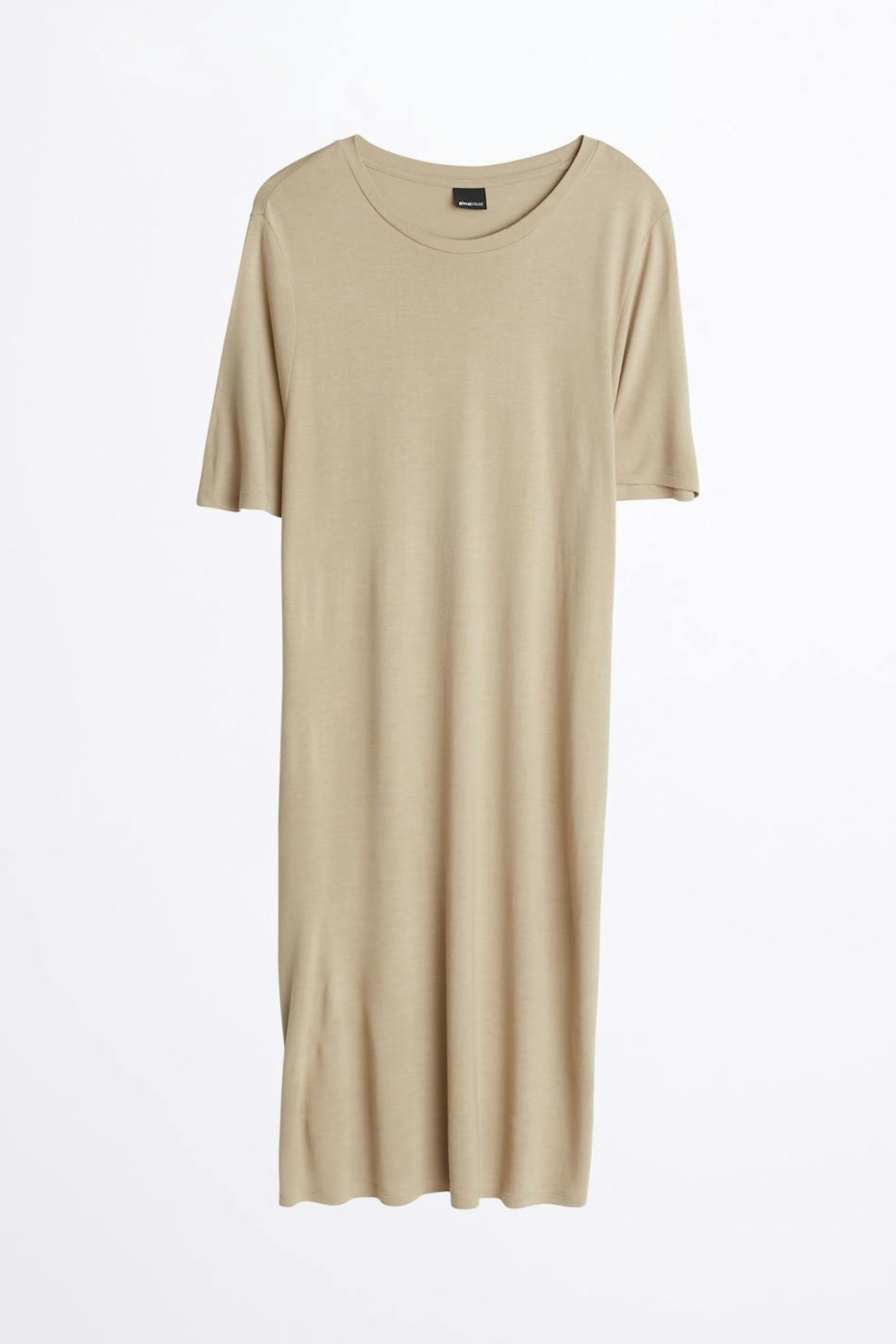 T-shirt dress with an oversize fit. The dress is beige and has a slit on the sides. It is made of jersey and has midi length.