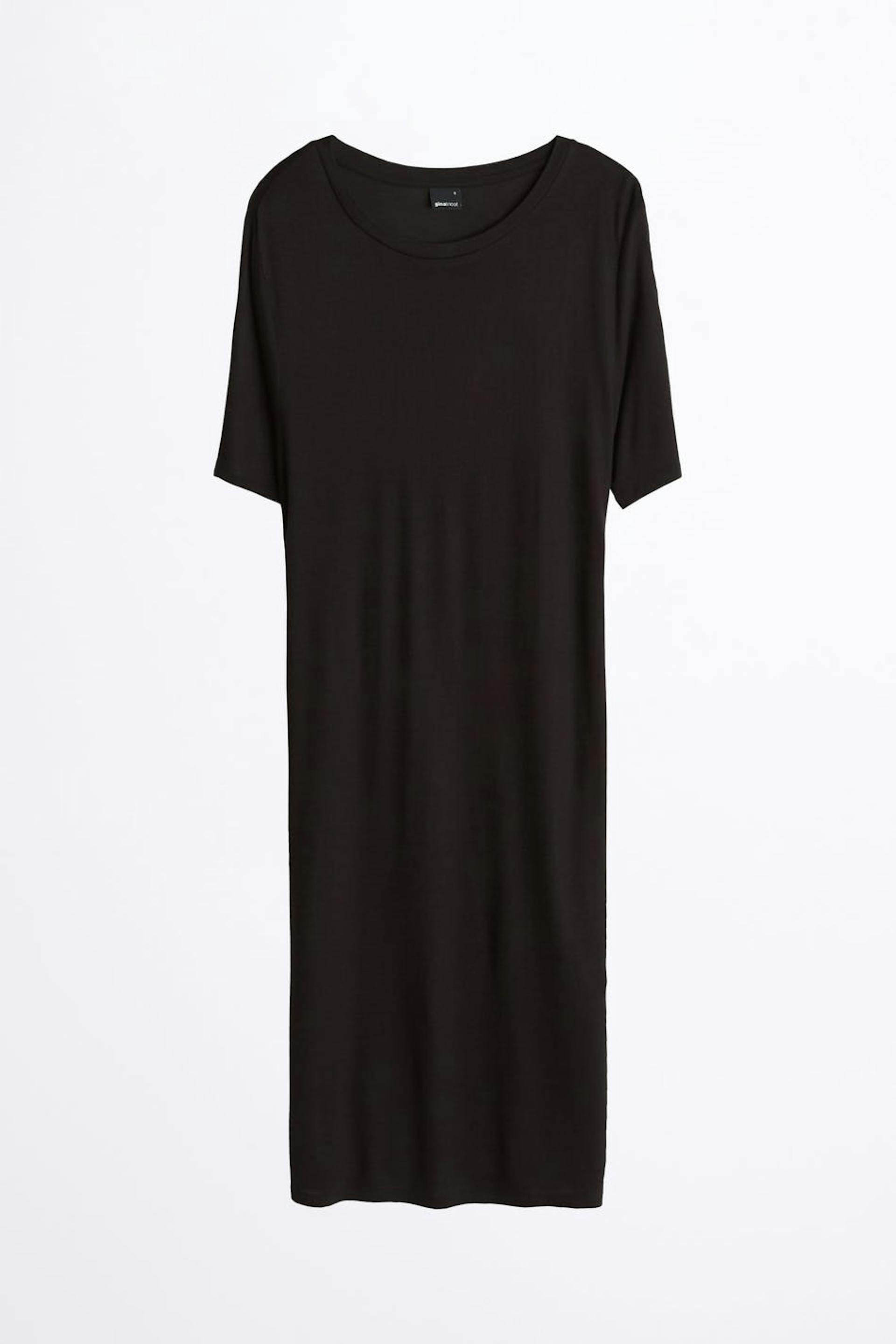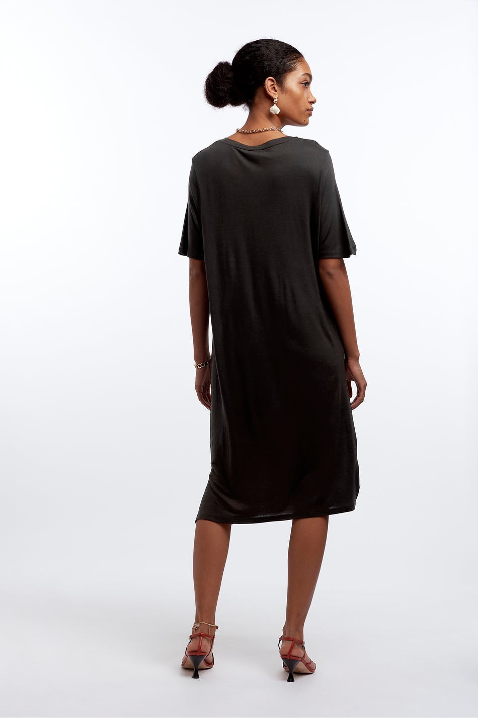 T-shirt dress with an oversize fit. The dress is black and has a slit on the sides. It is made of jersey and has midi length.