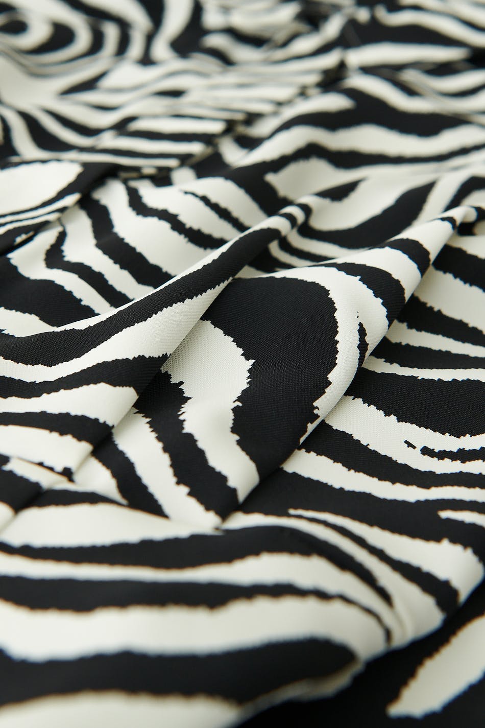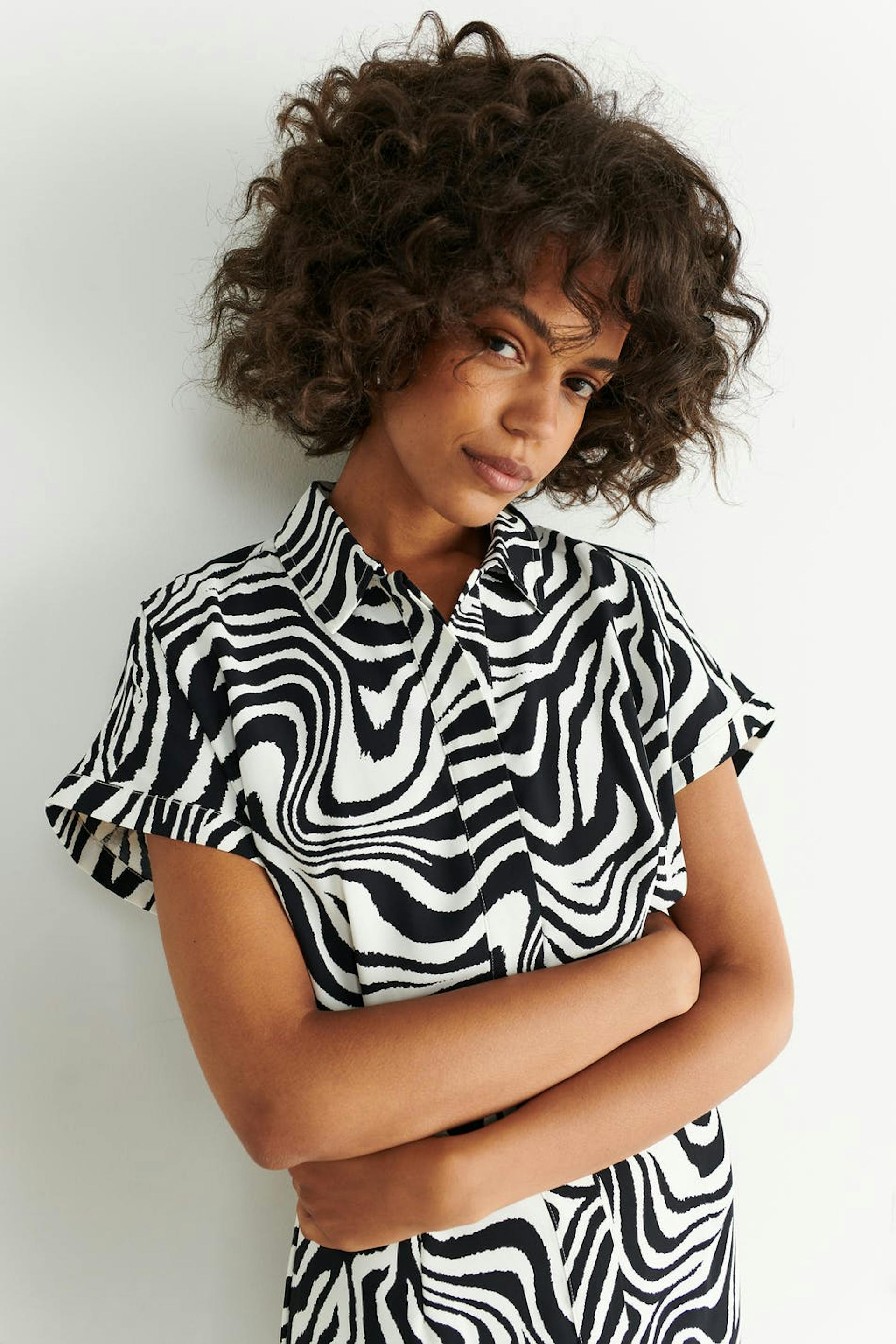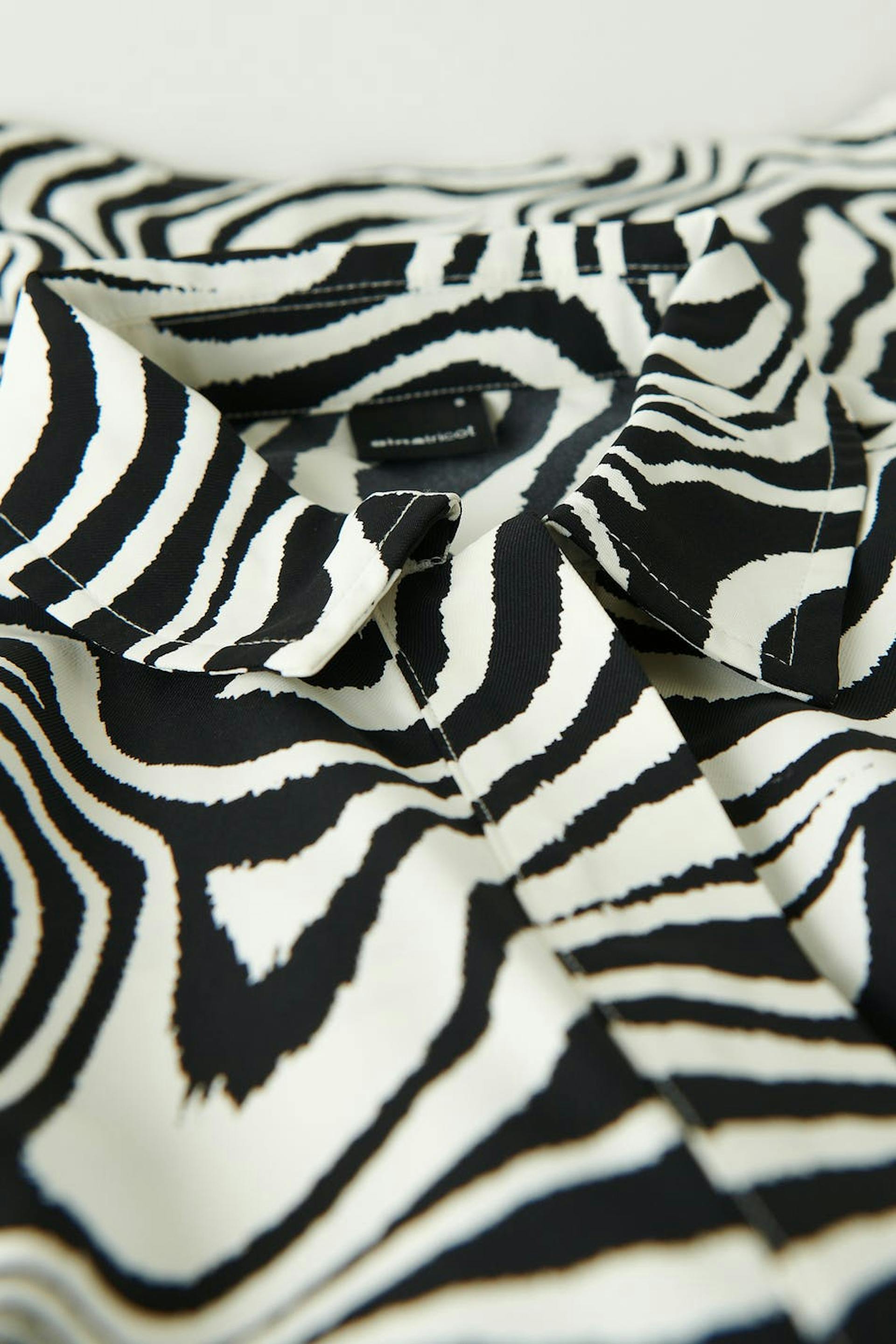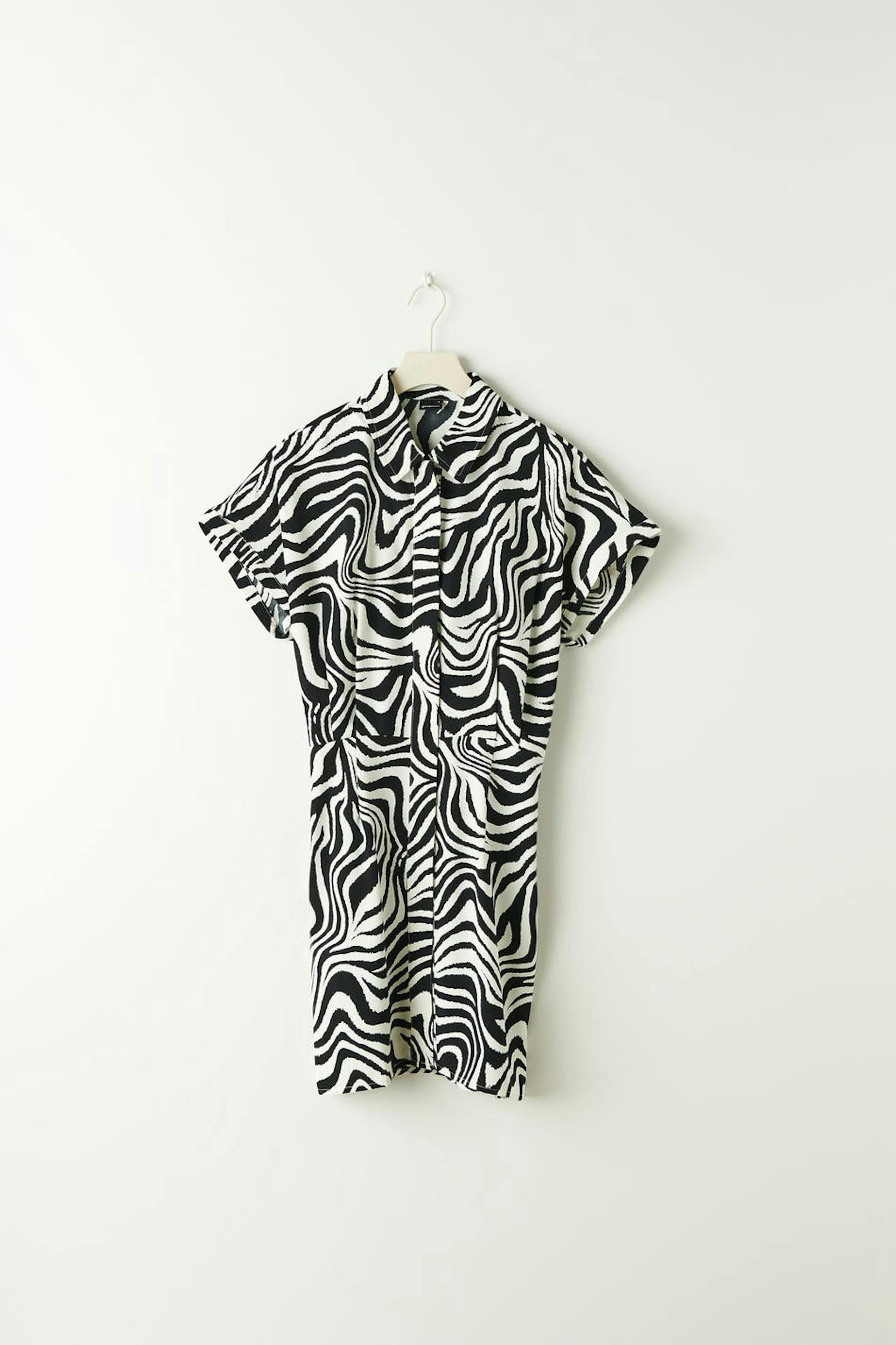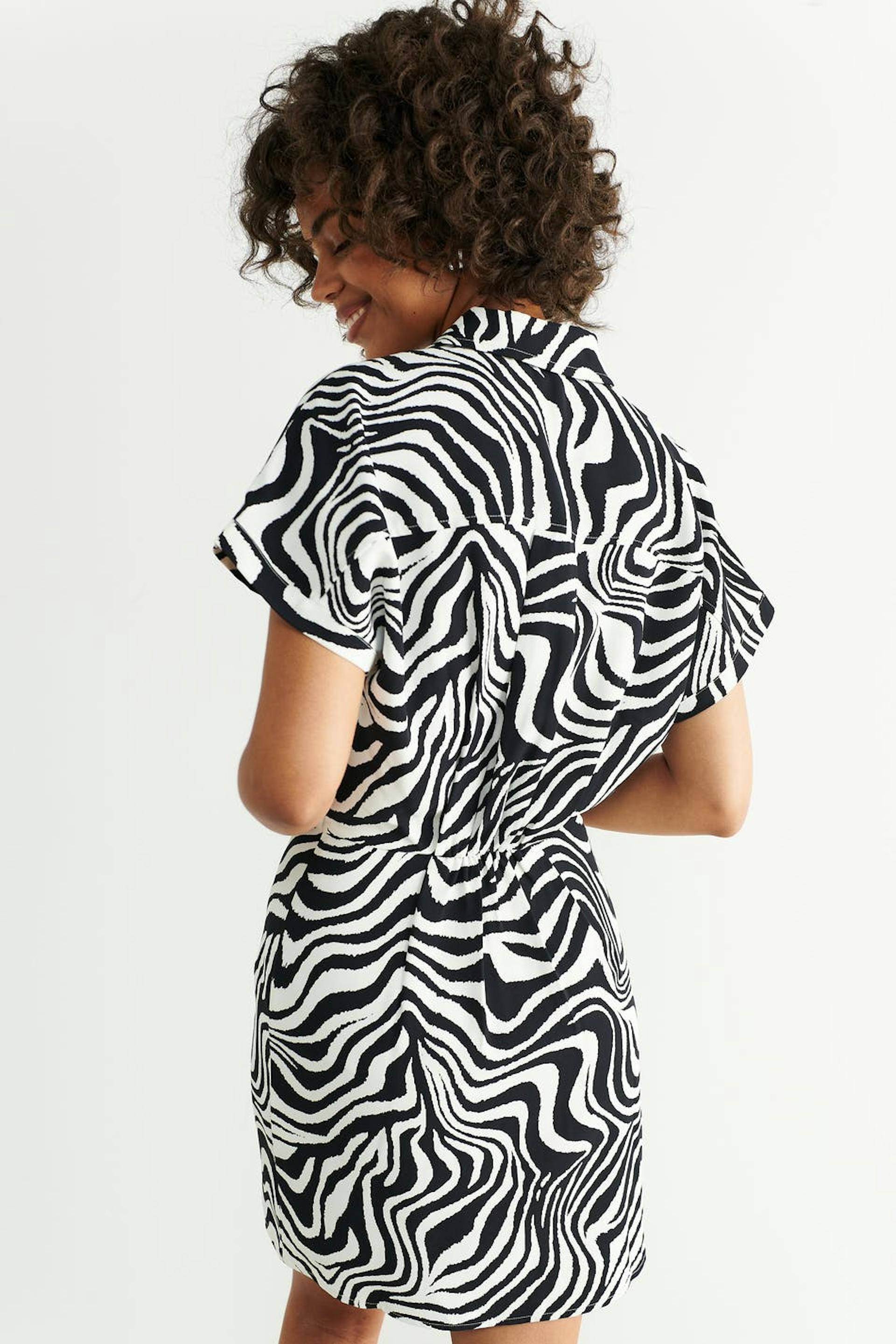 Zebra patterned mini dress with collar. The dress is black, white and short-sleeved. It has hidden button closure at the front, a fitted waist and cocoon-shaped sleeves with defined shoulders.