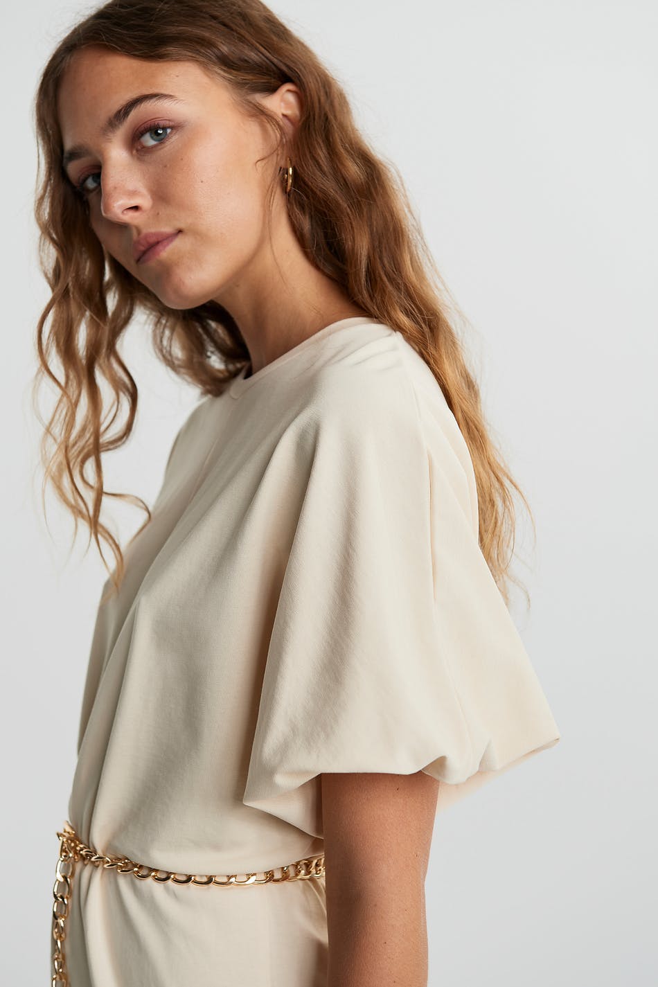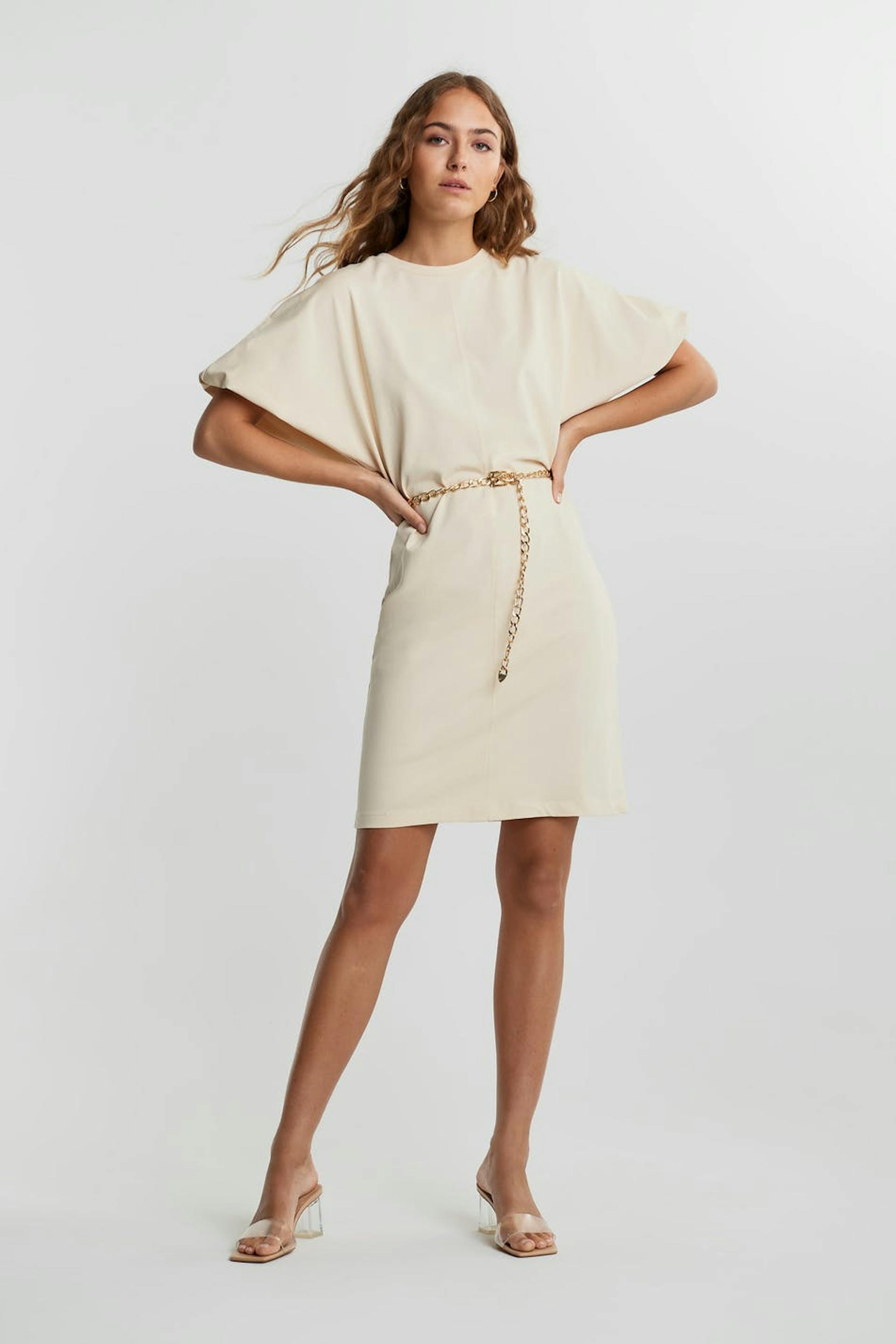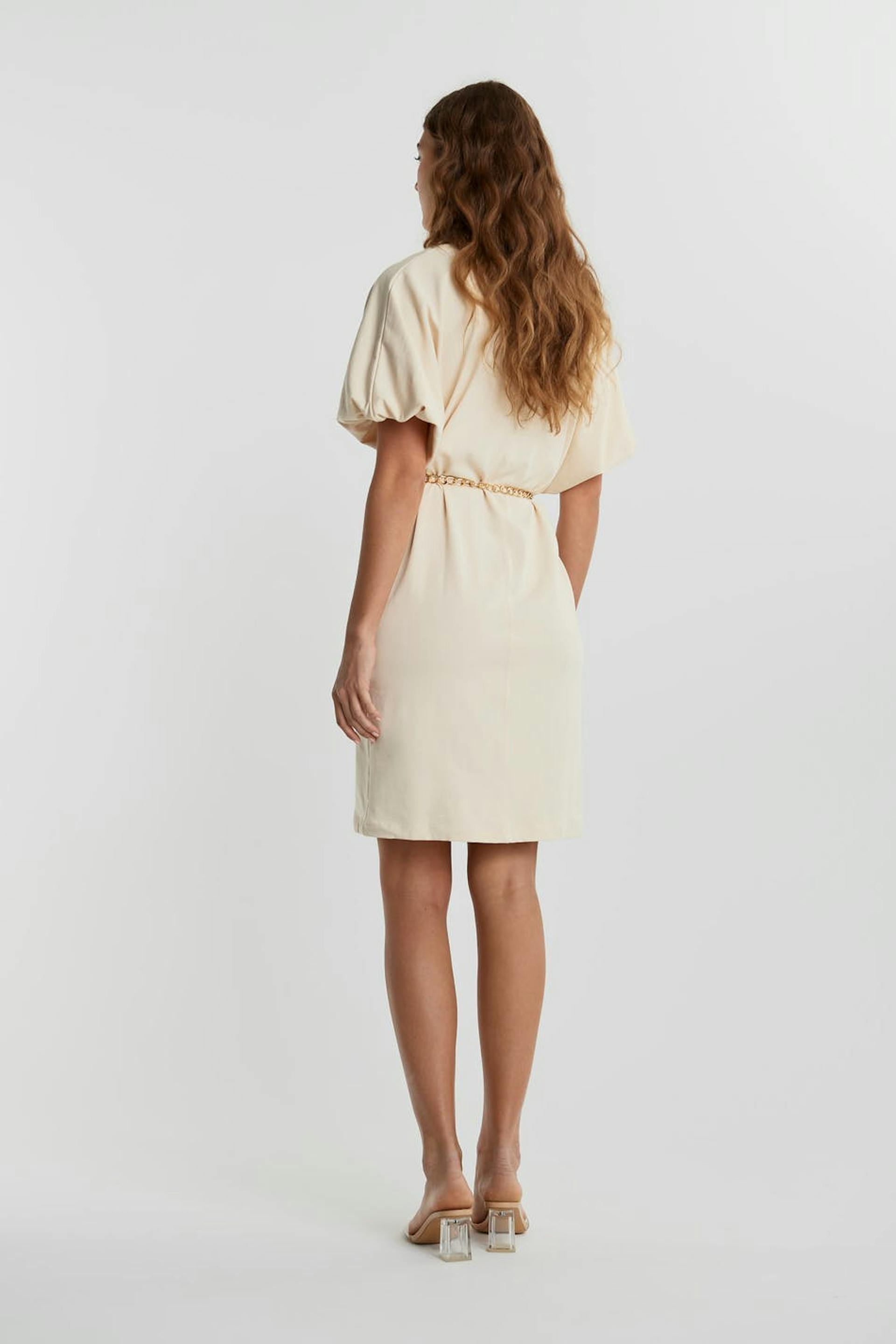 Dress with an oversize fit. The dress is beige. It is made of jersey.