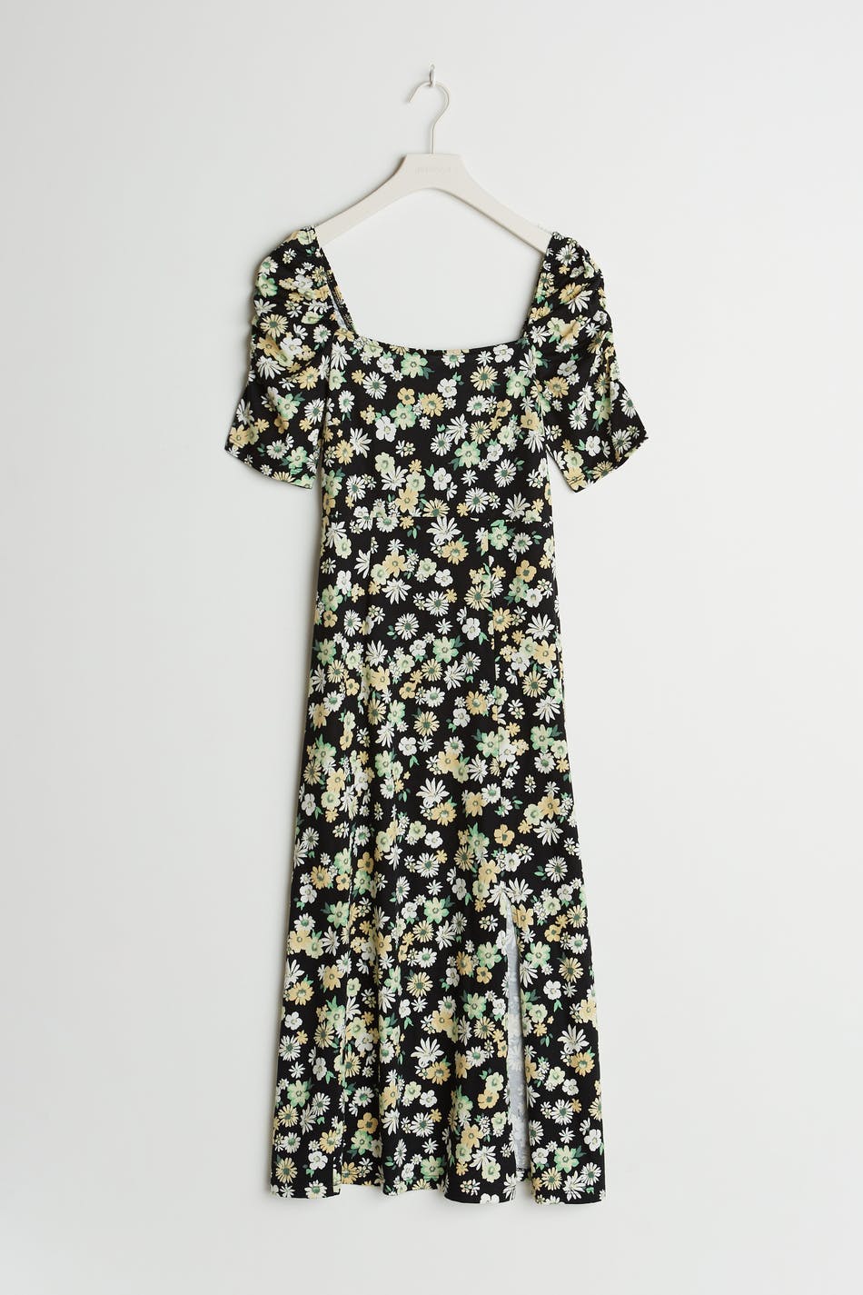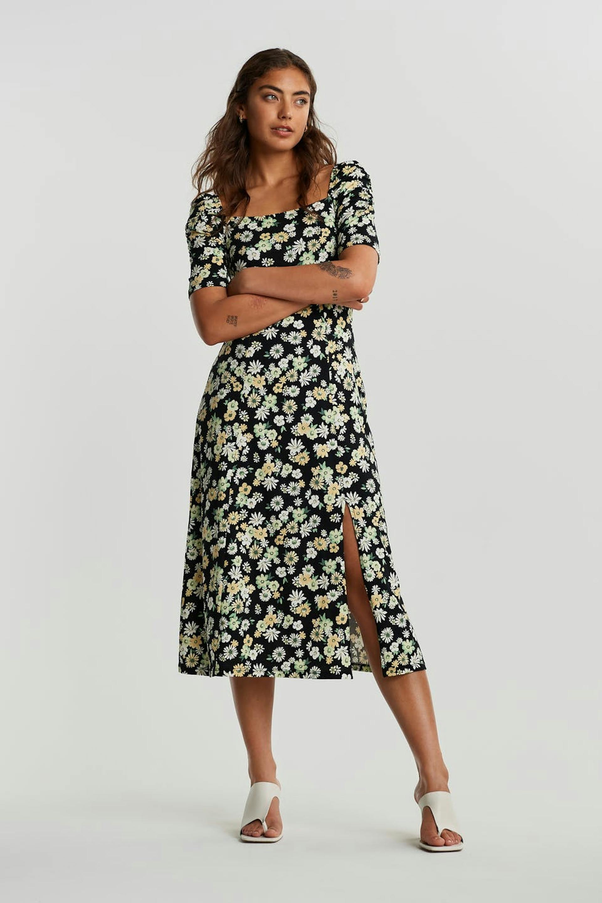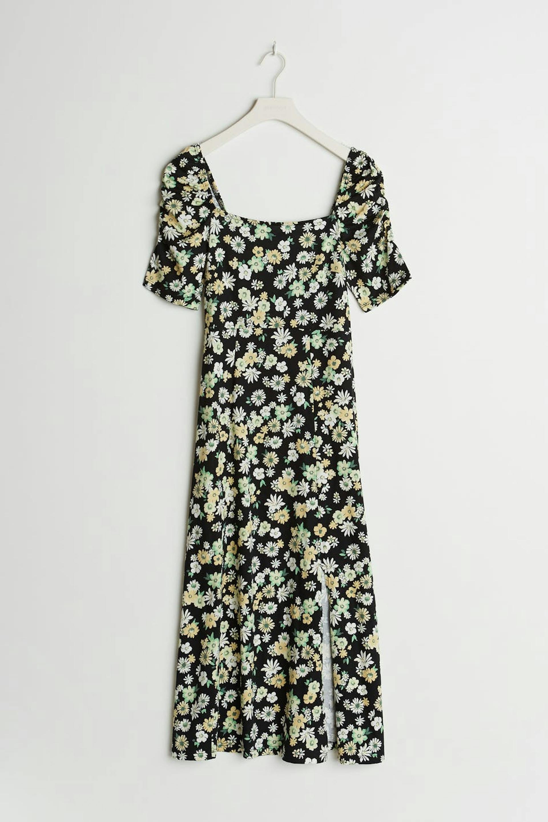 Floral dress with a regular fit. Black, green, yellow and calf-length. It has a short puff sleeve, a slit at the side and a square neckline.
