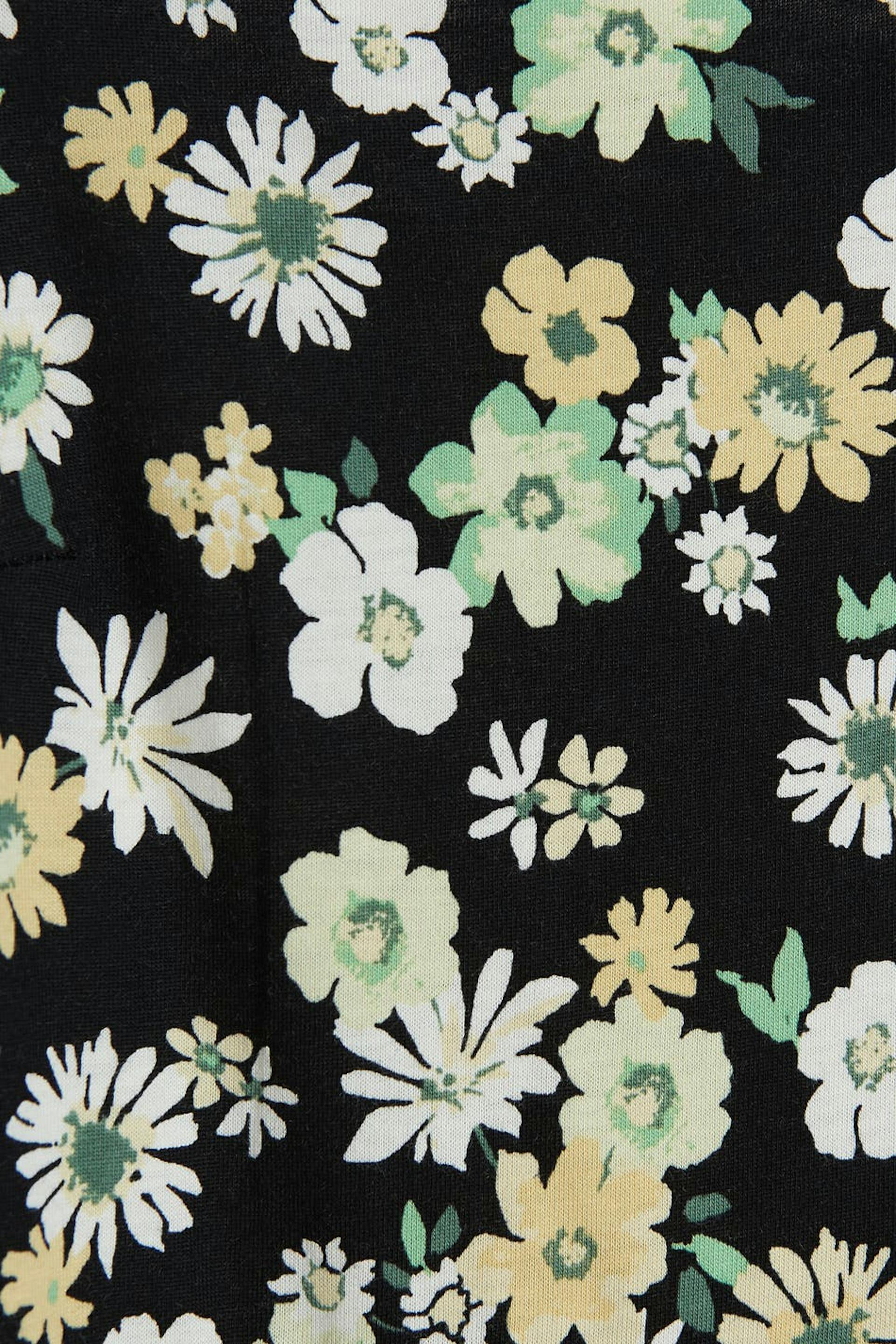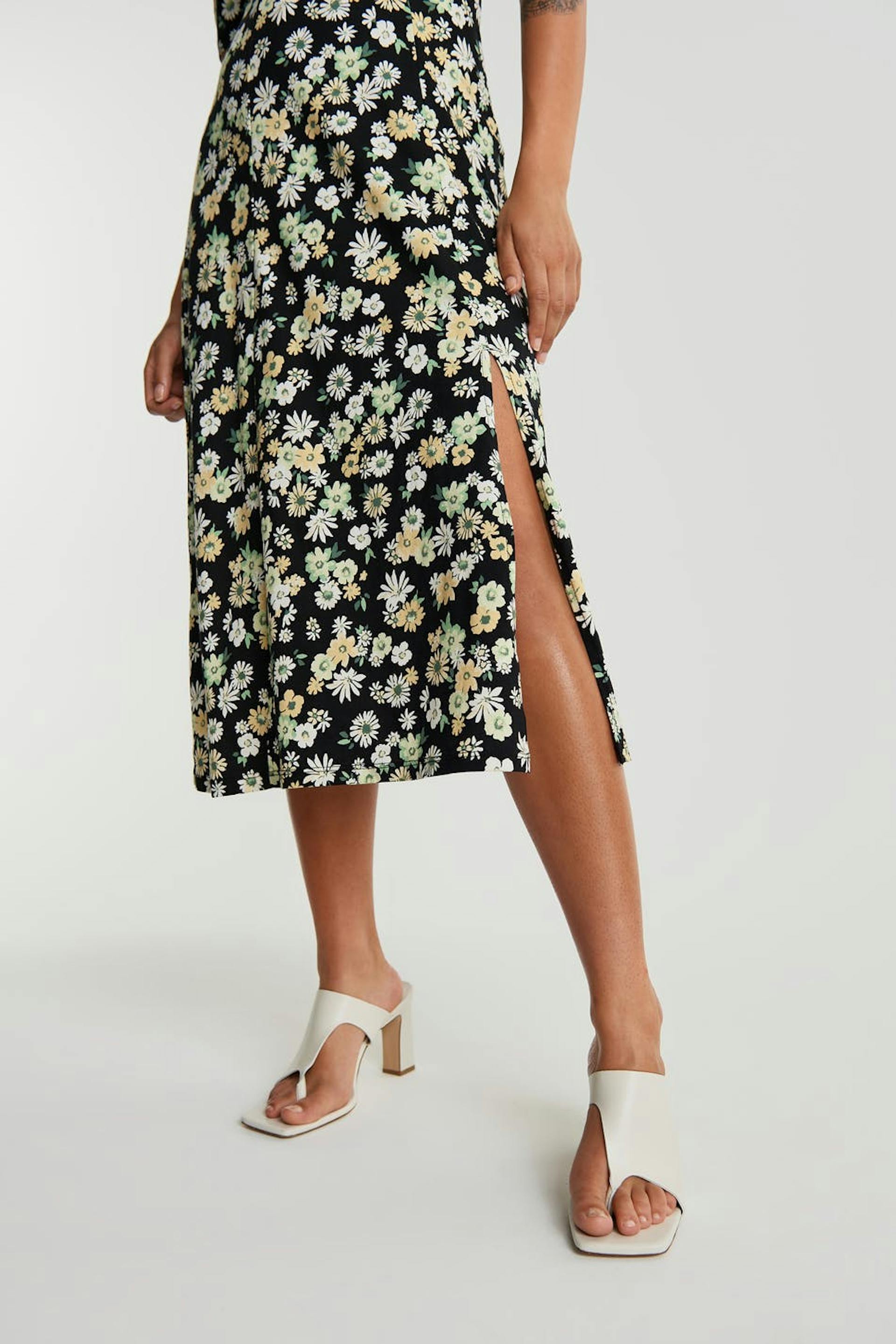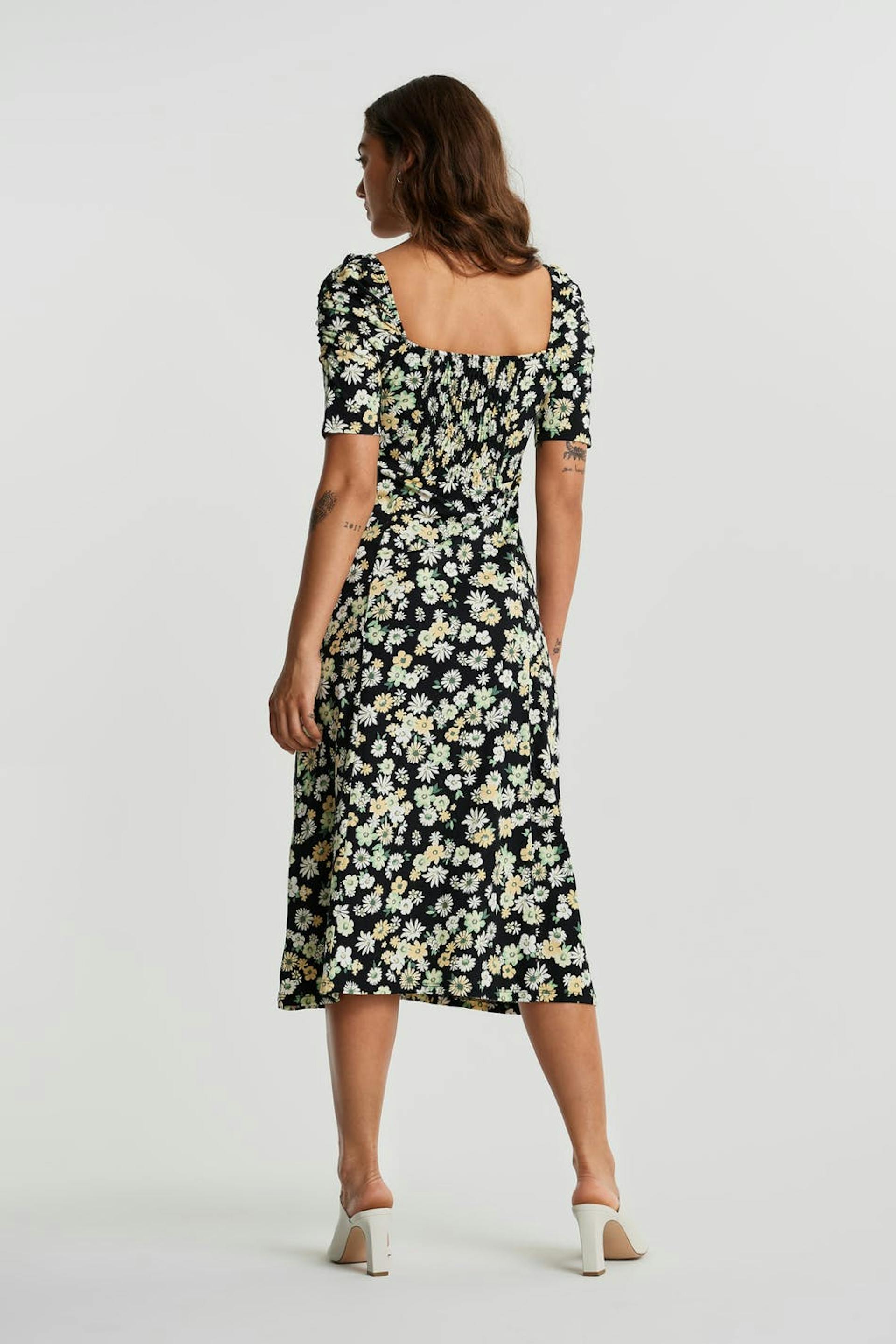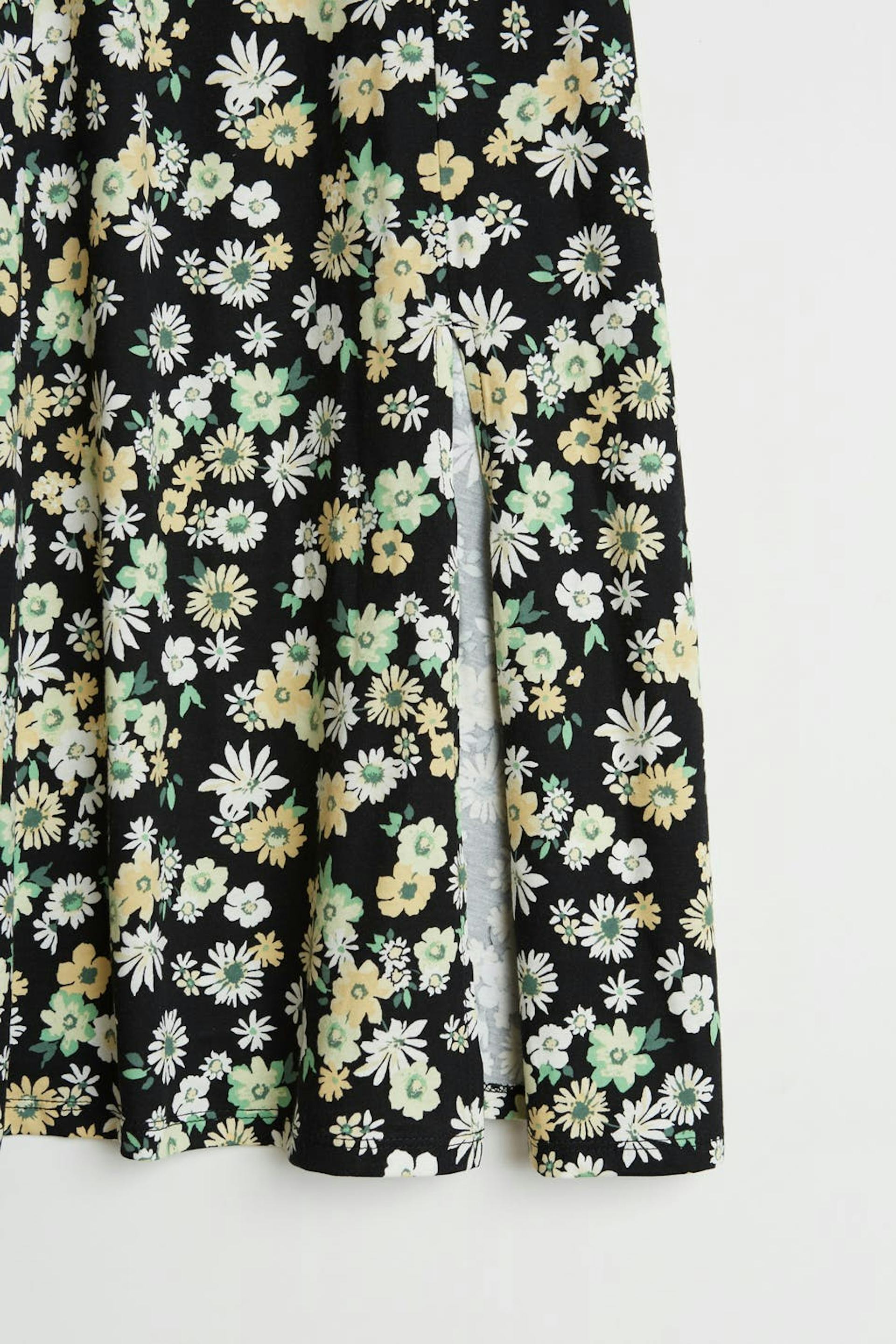 Floral dress with a regular fit. Black, green, yellow and calf-length. It has a short puff sleeve, a slit at the side and a square neckline.