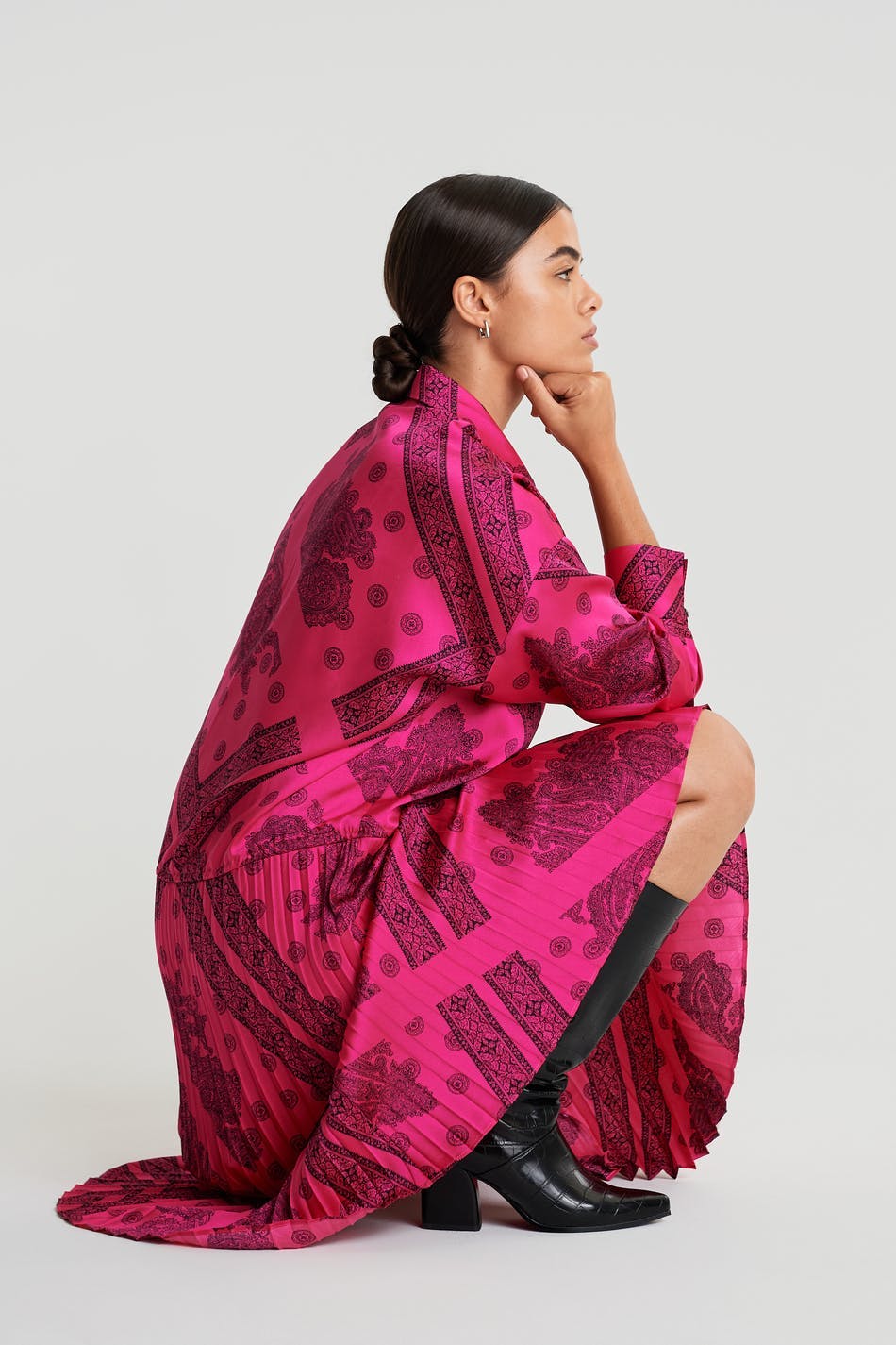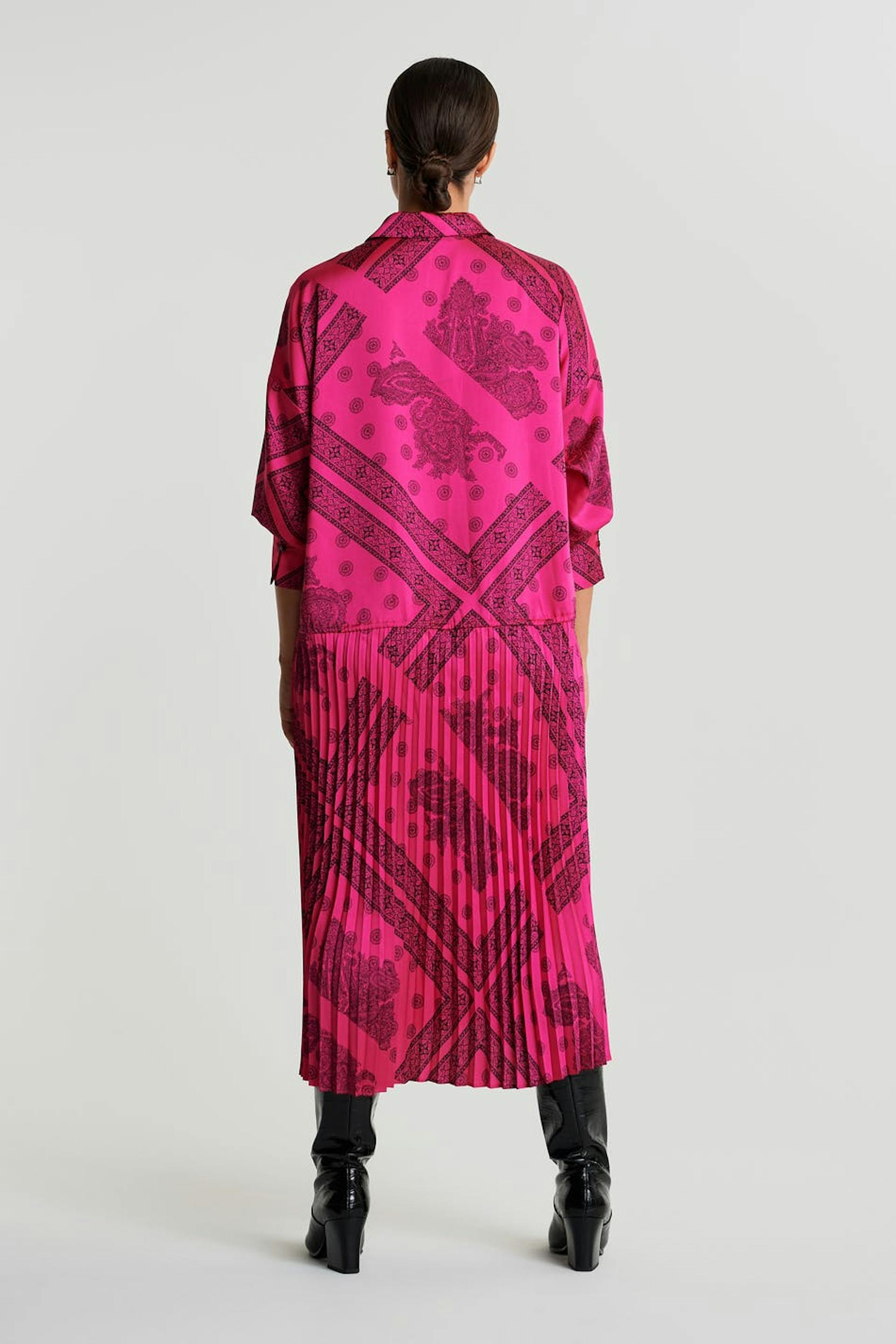 Long-sleeved dress with a black pattern. The dress is pink and has a maxi length. It has a shirt-style button placket at the front, a pleated skirt and a drawstring at the waist.