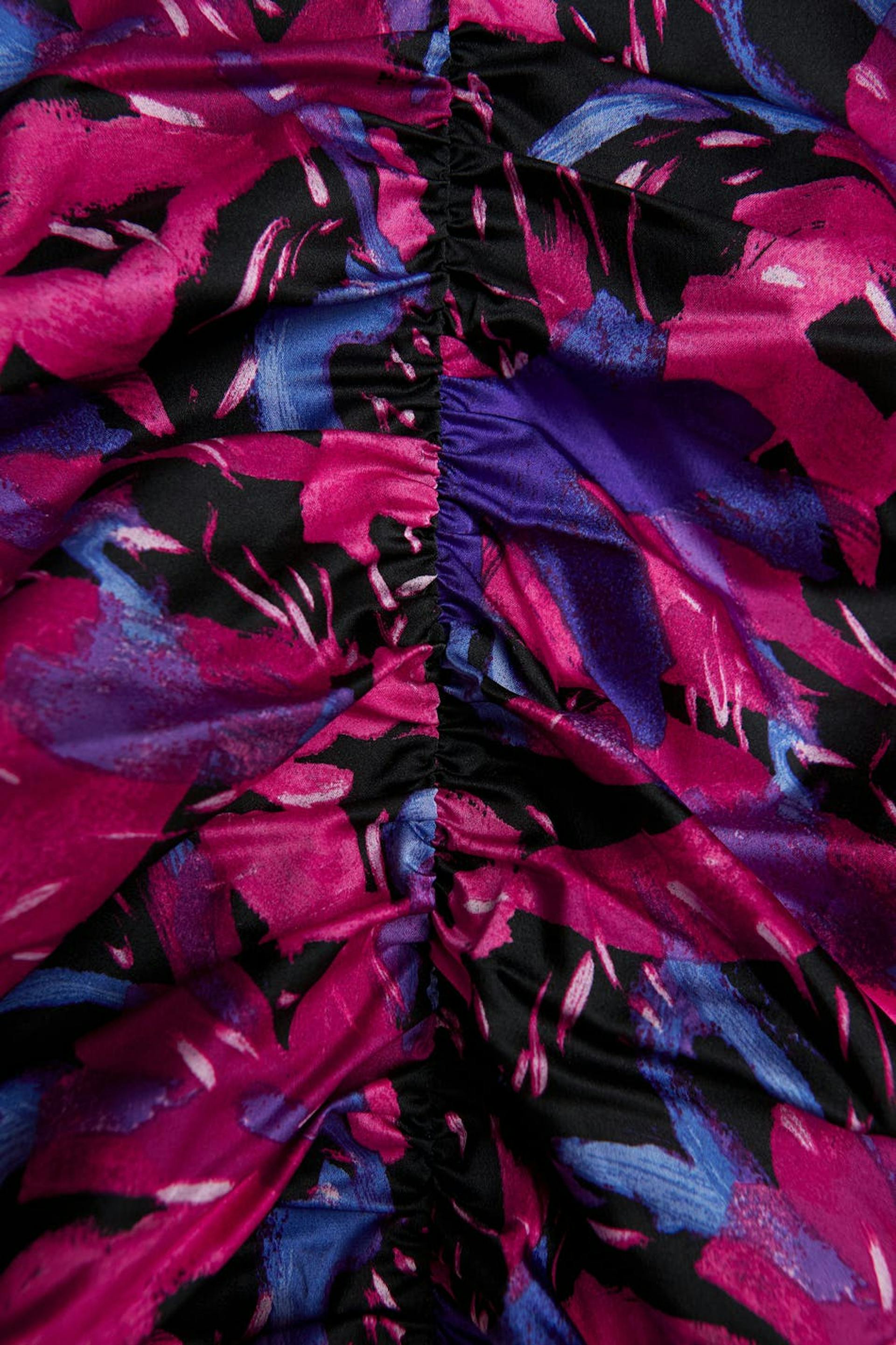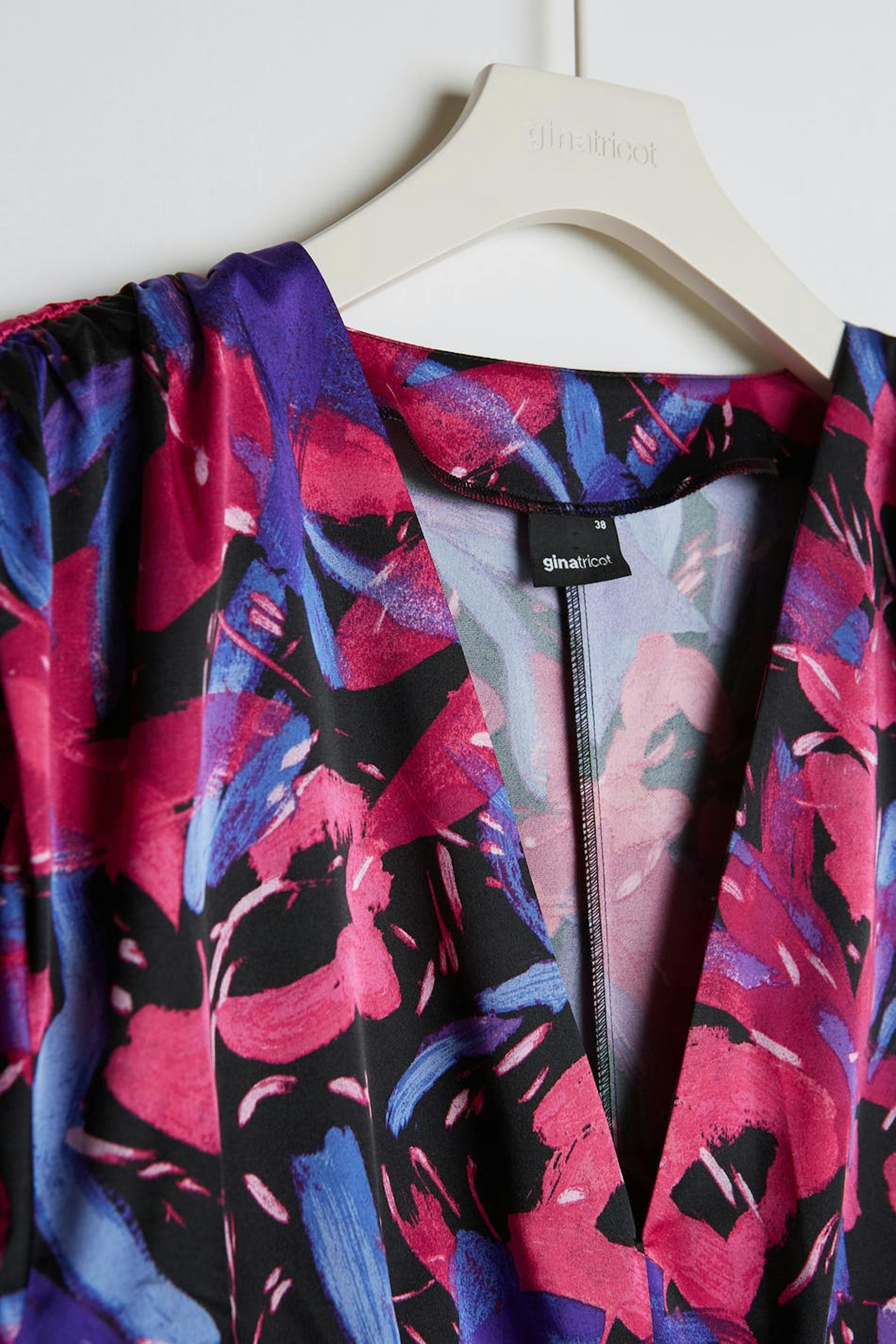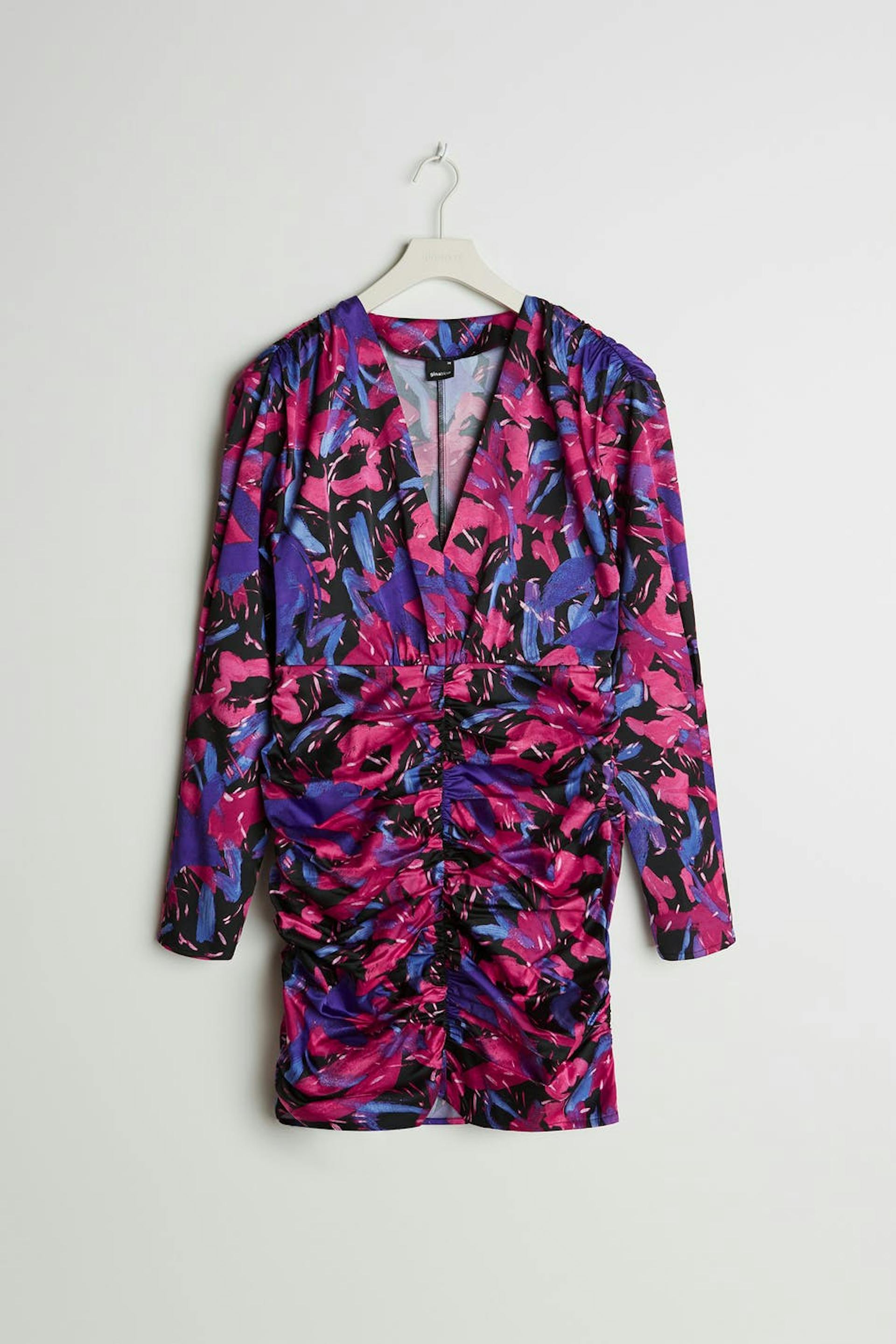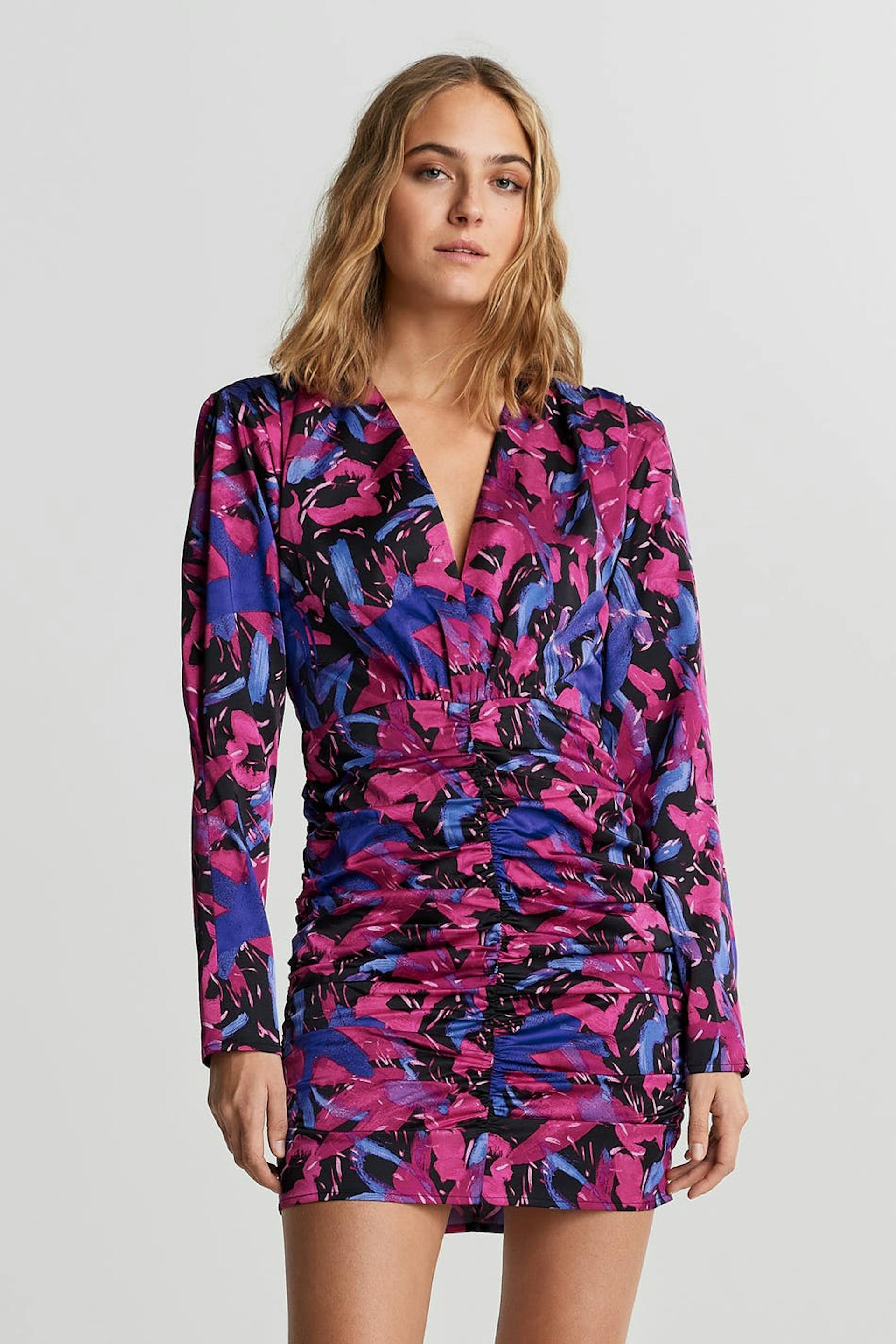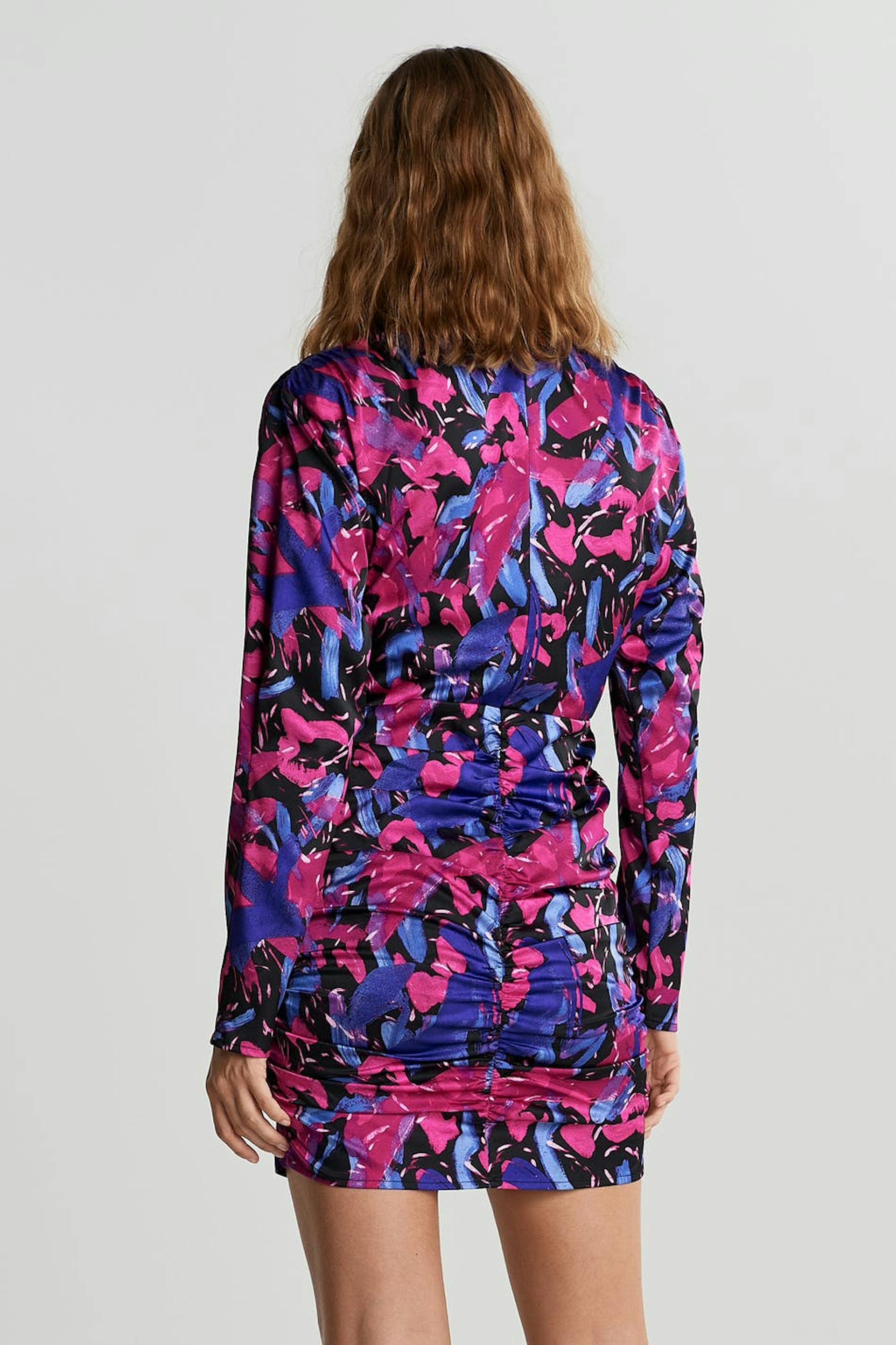 Long-sleeved dress with a pink, purple pattern. The dress is perfect for the party and short and has a V-neck. It has ruching on the skirt and defined shoulders.
