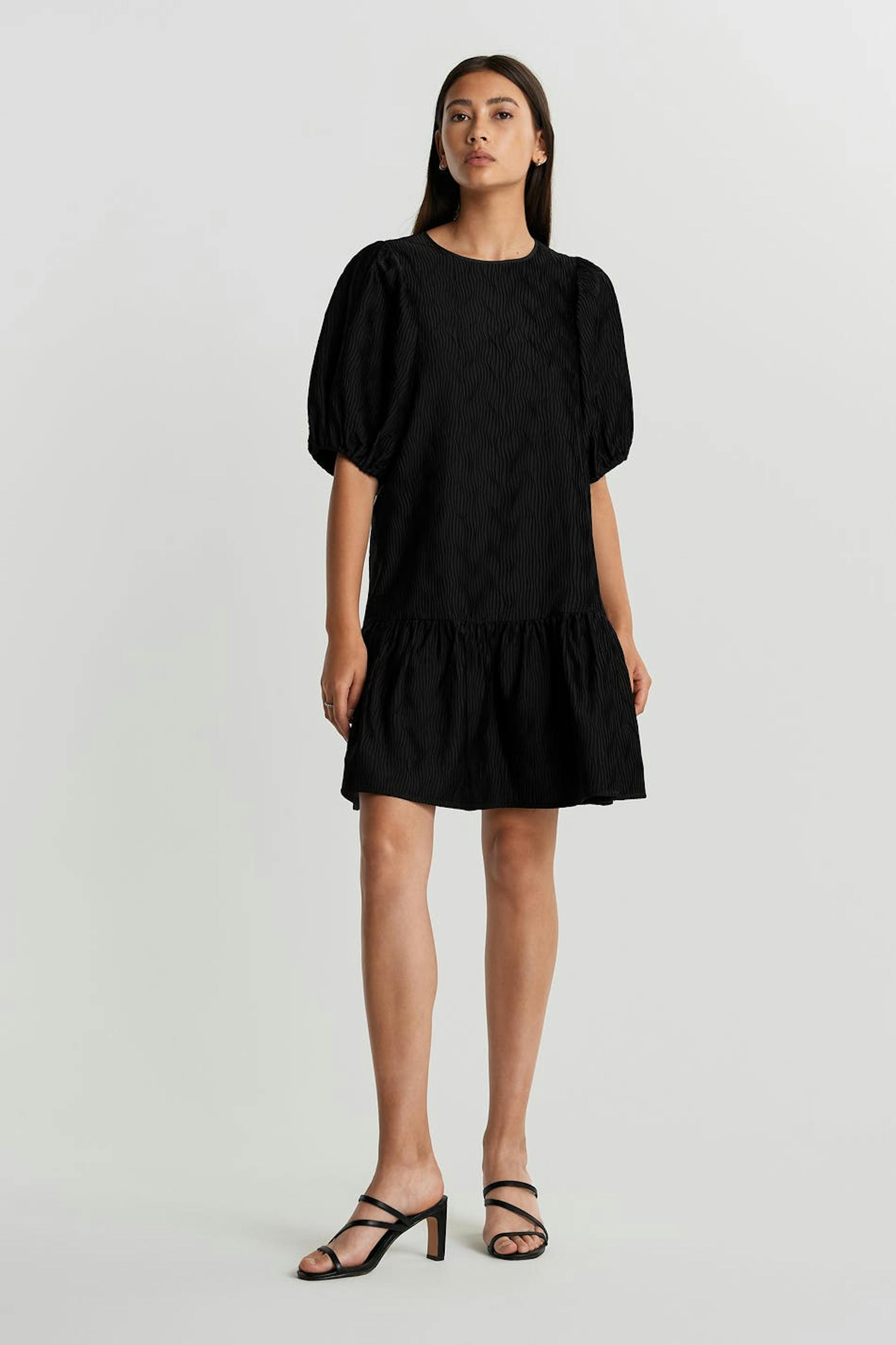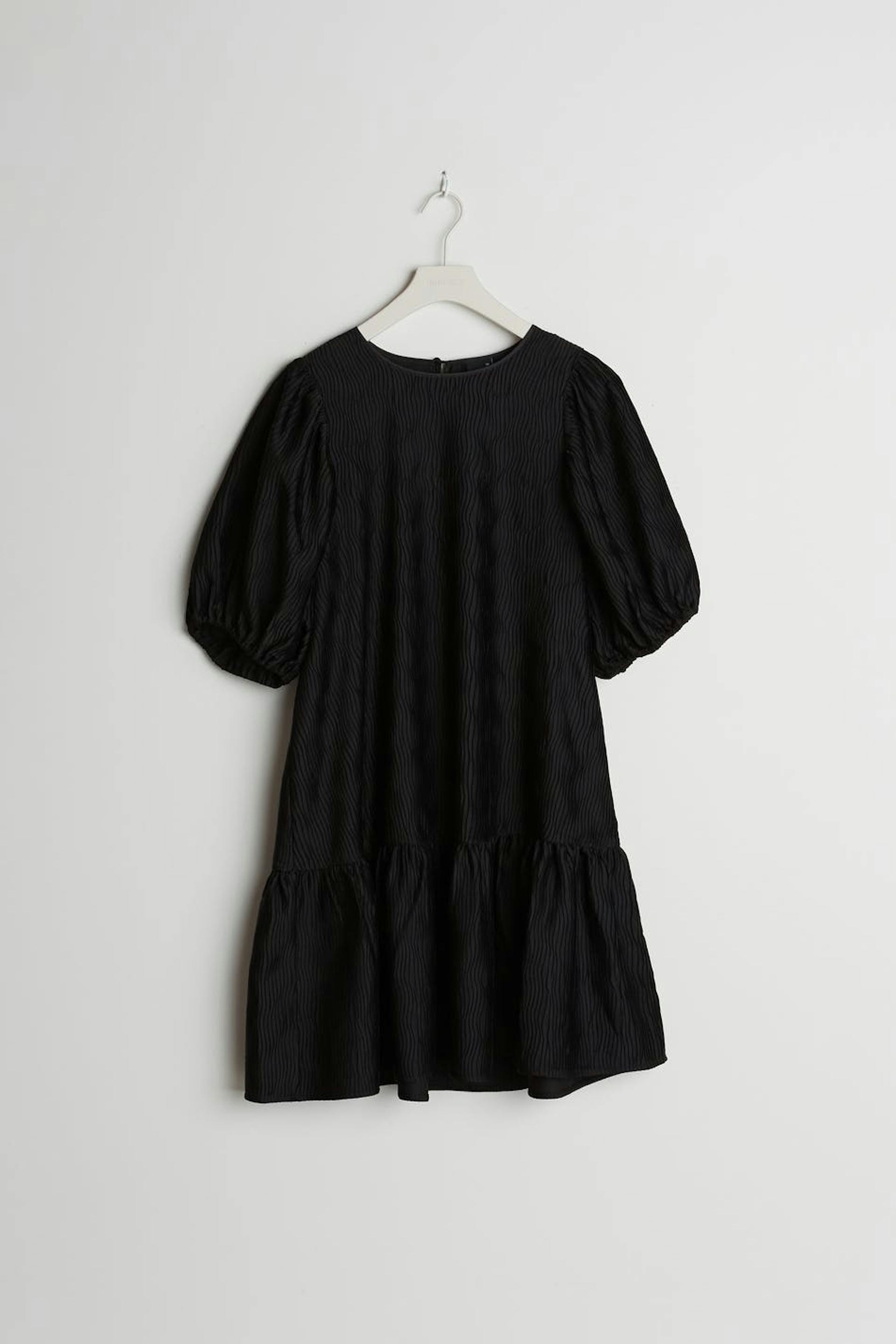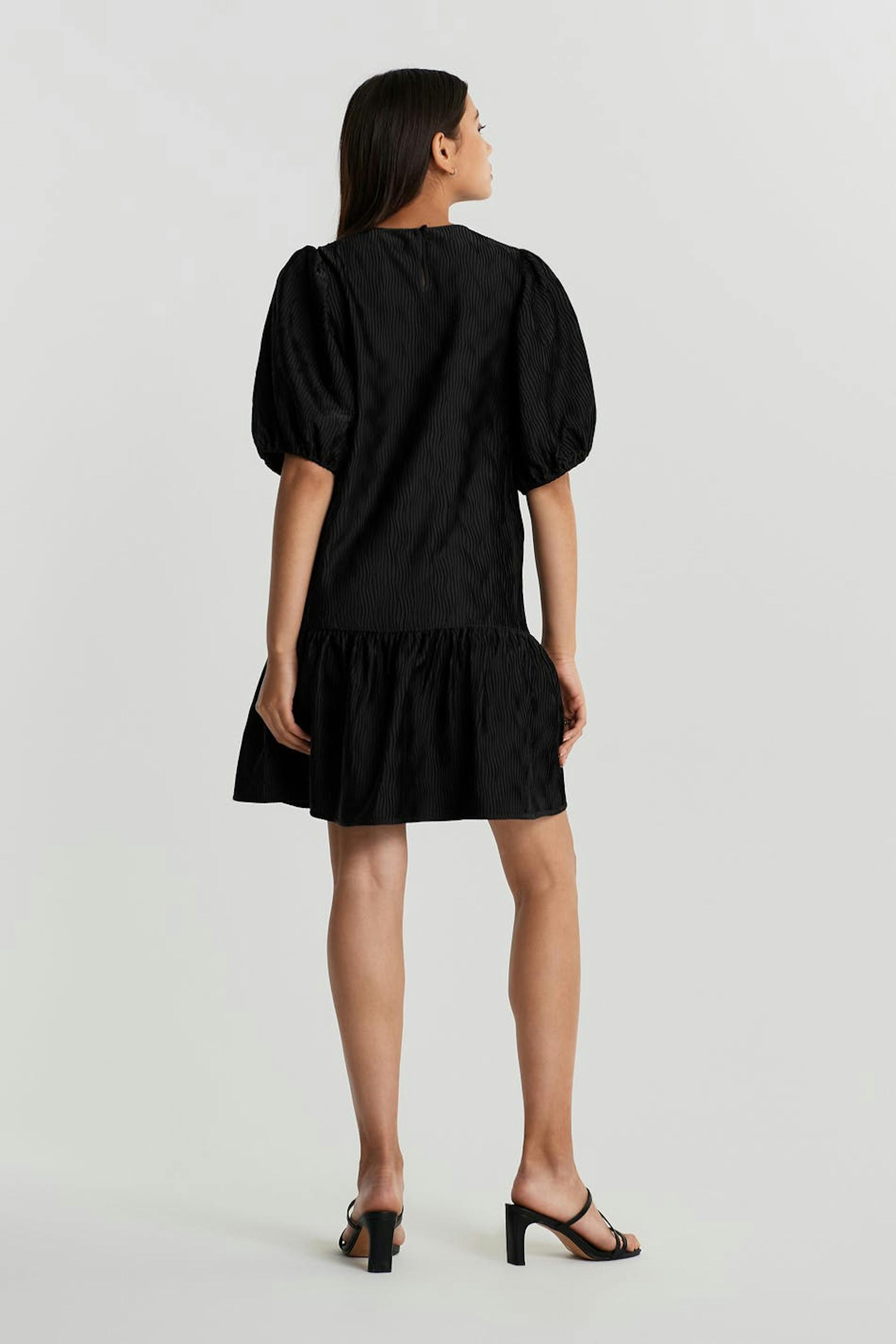 Treaded dress with a regular fit. The dress is black and has short puff sleeves. It has a frill skirt.