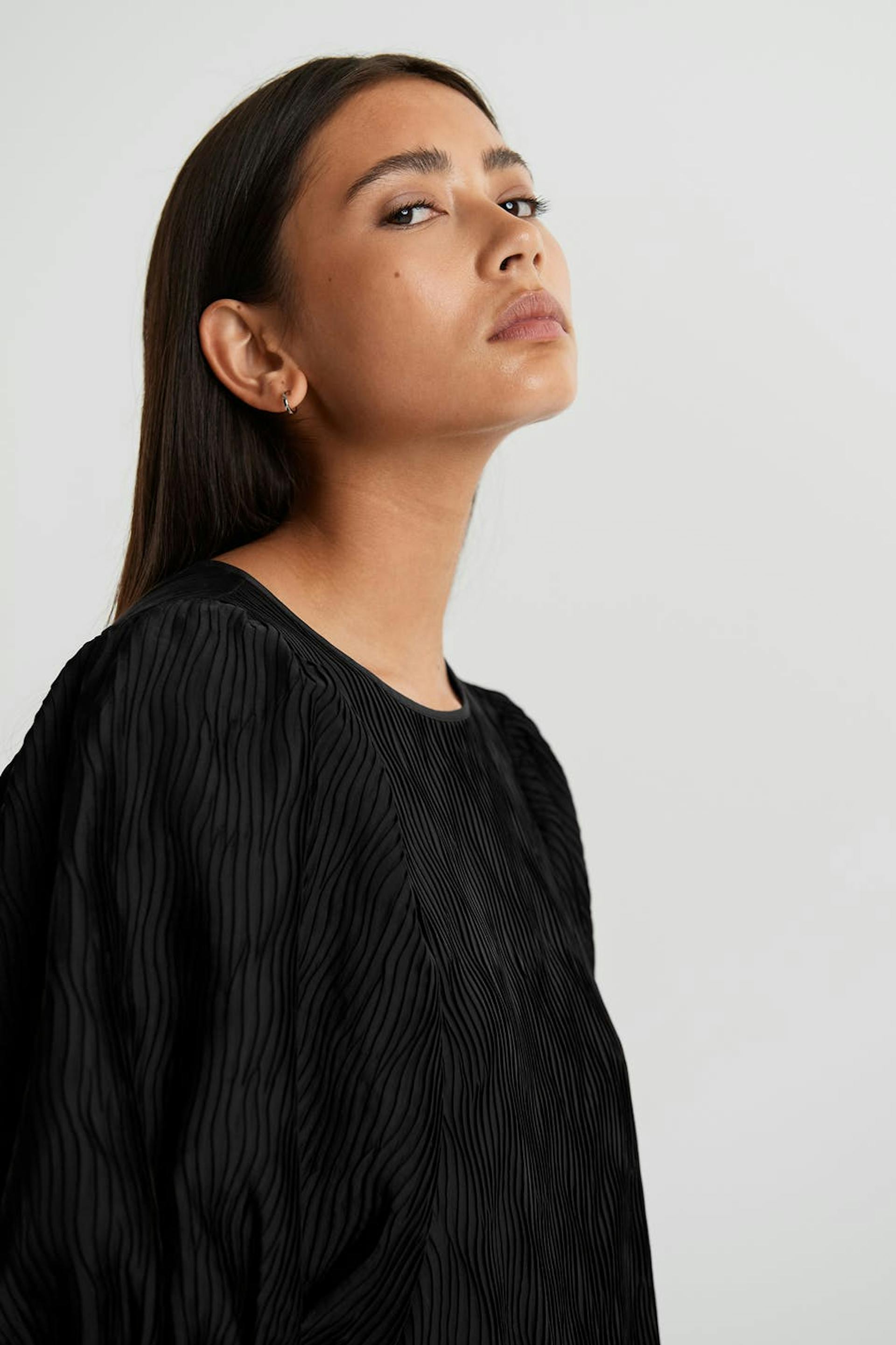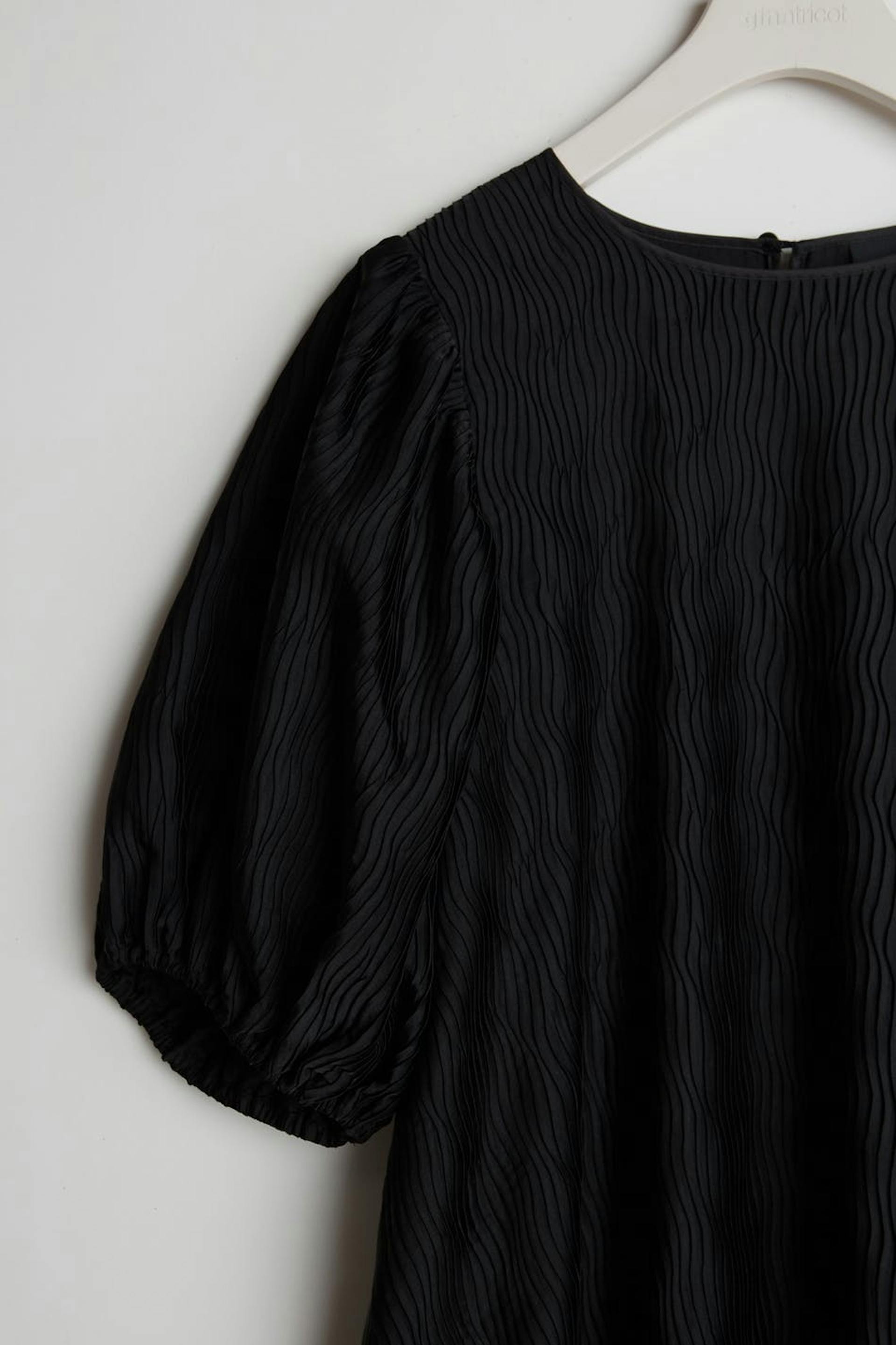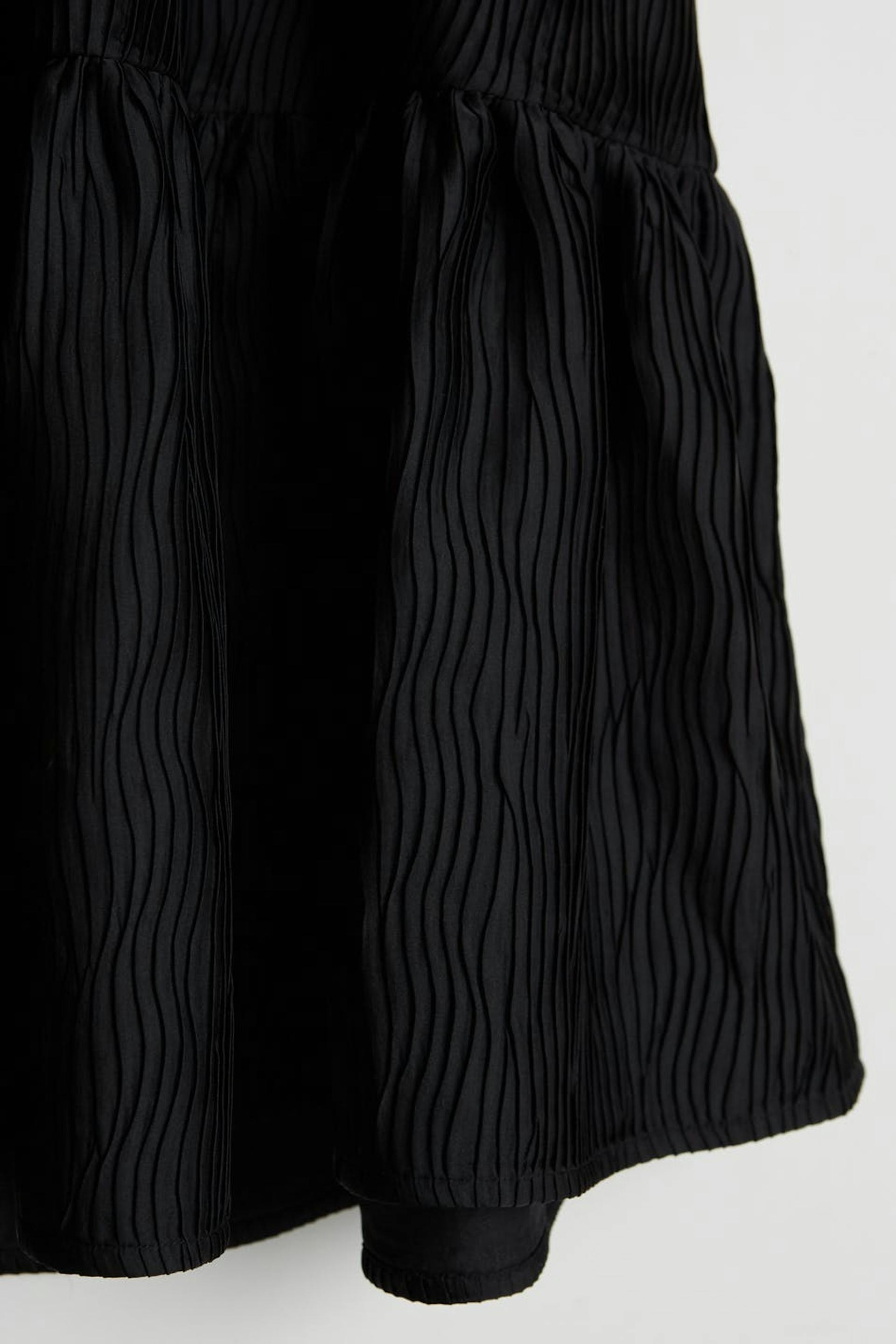 Treaded dress with a regular fit. The dress is black and has short puff sleeves. It has a frill skirt.